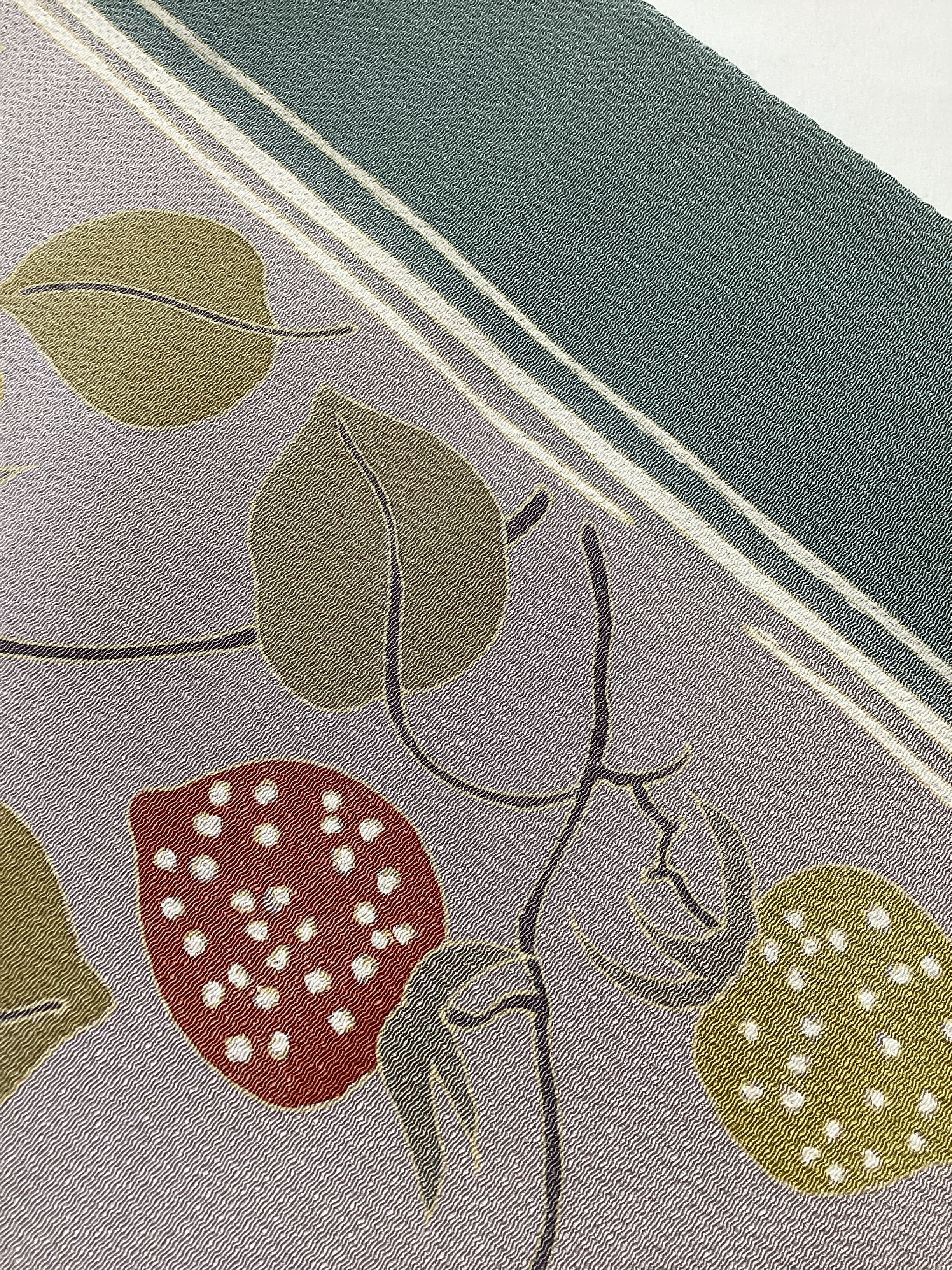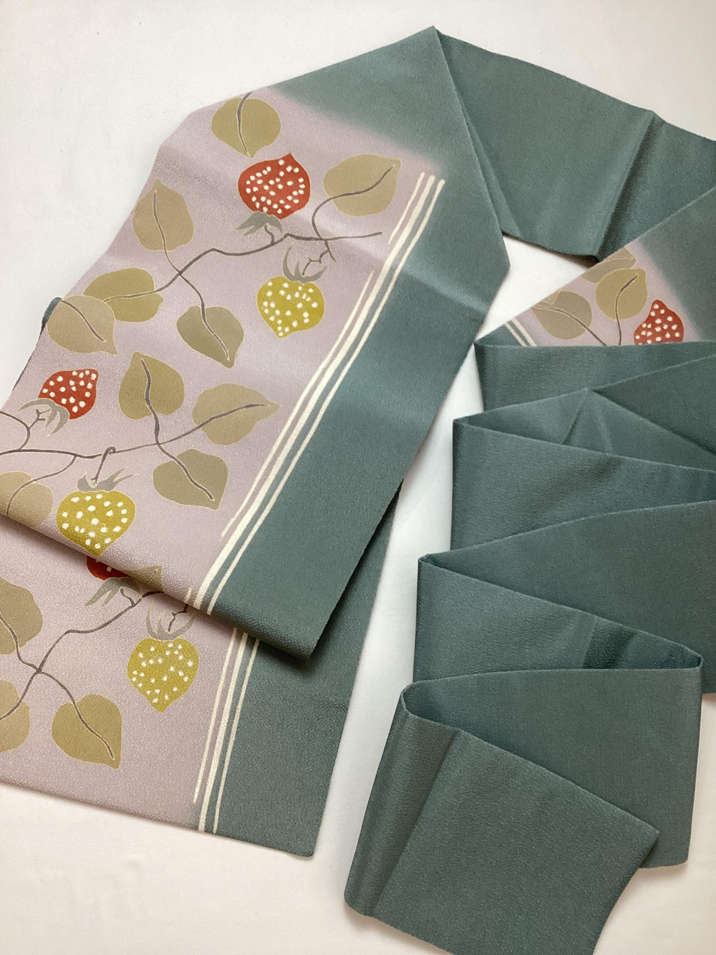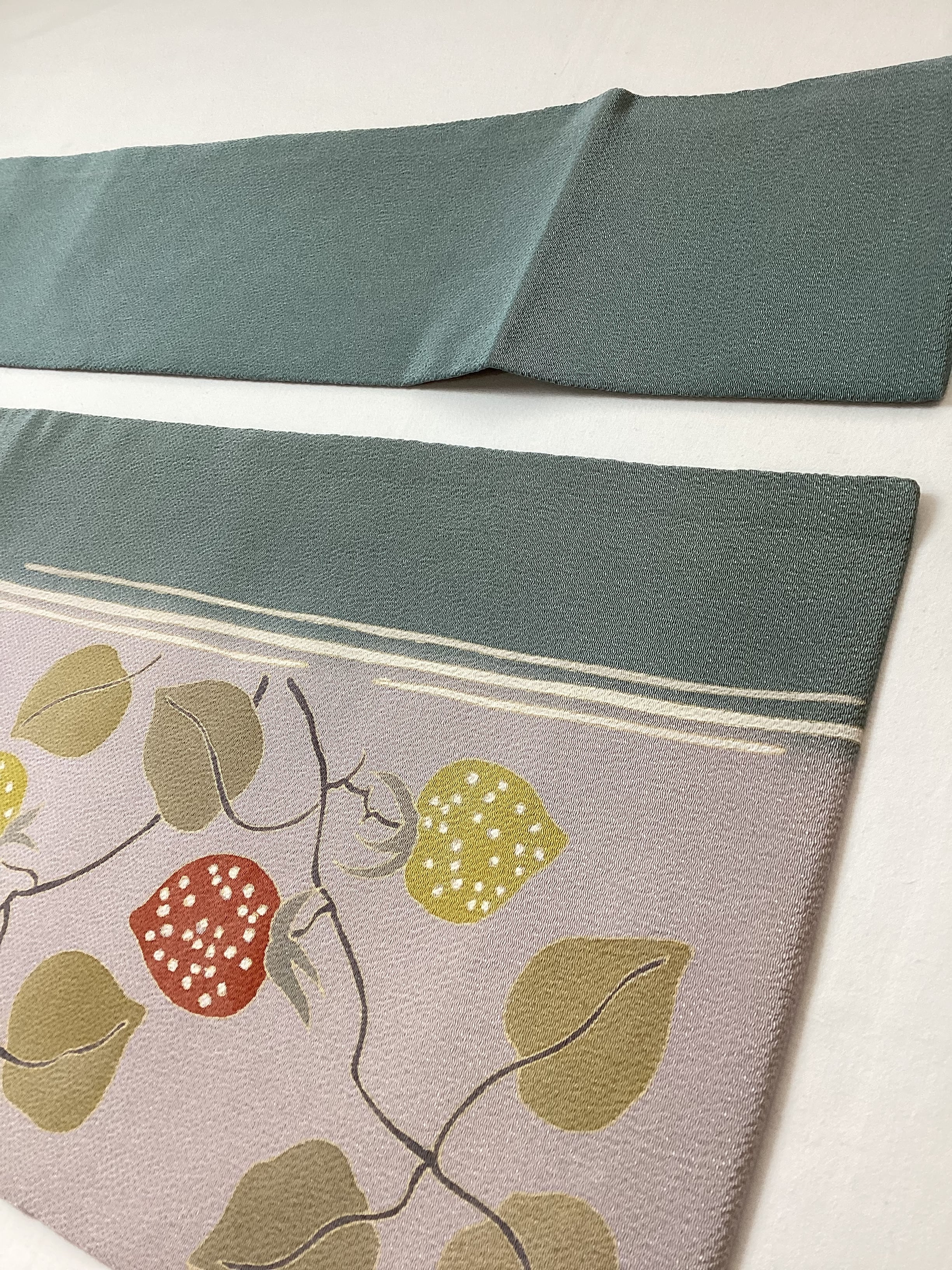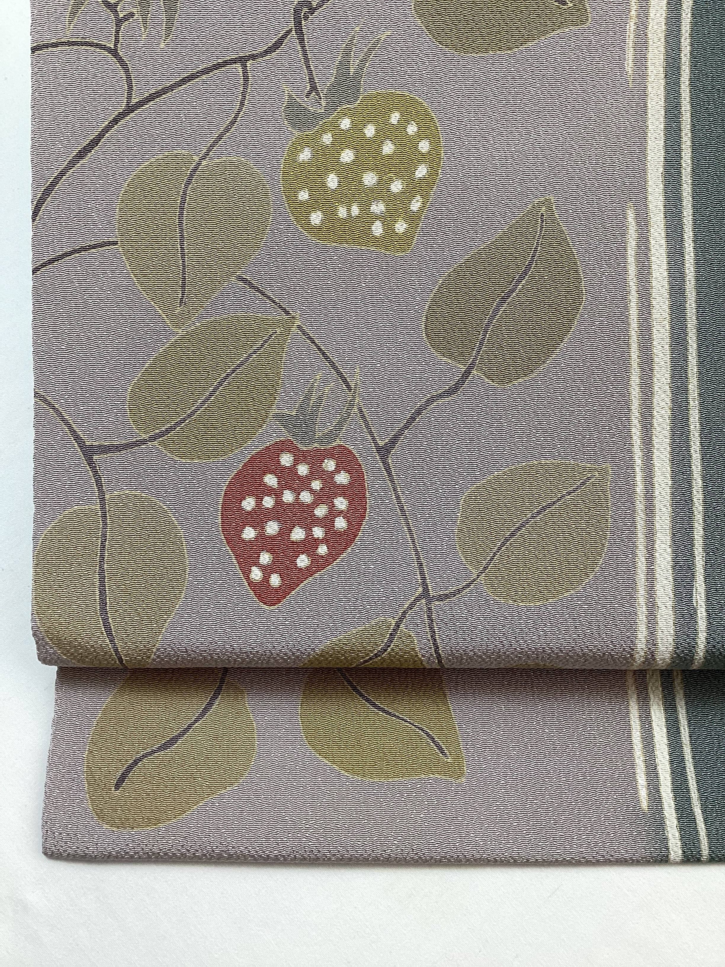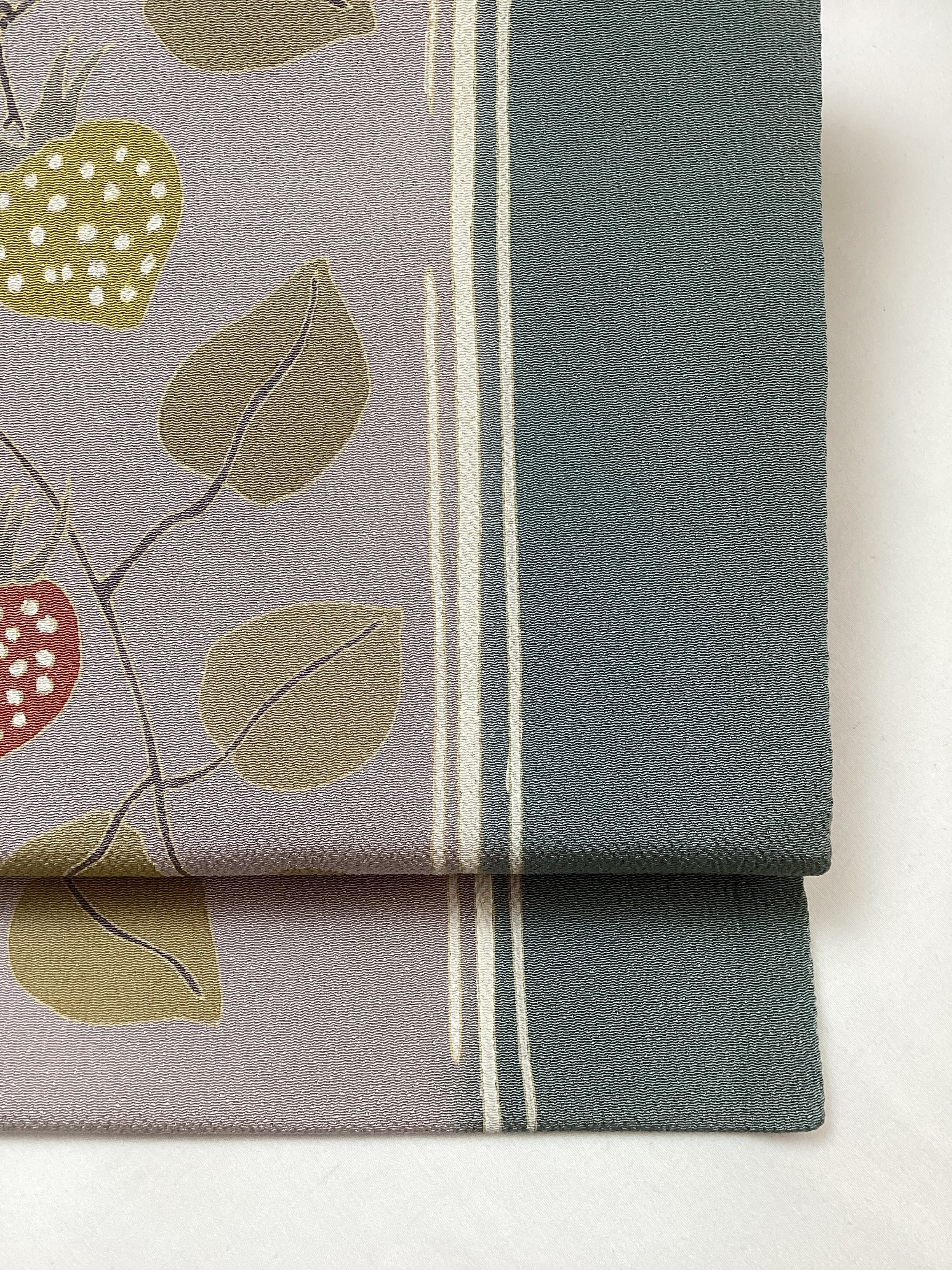 なんとも可愛いらしい表情のある染め帯のご紹介です。控えめにトーンを落とした配色でなので、年齢層の幅広くご着用いただけます。2色の苺の表情も楽しくて、大人可愛い着姿を演出してくれるなごや帯です。素材にはしっかりとシボが立ったふっくらとした浜ちりめんが使用されており、上質な逸品です。関東巻き(反時計回り)で巻くと黄色い苺、関西巻き(時計回り)で巻くと赤い苺が前柄に現れます。コーディネートに合わせてお楽しみ下さい。
