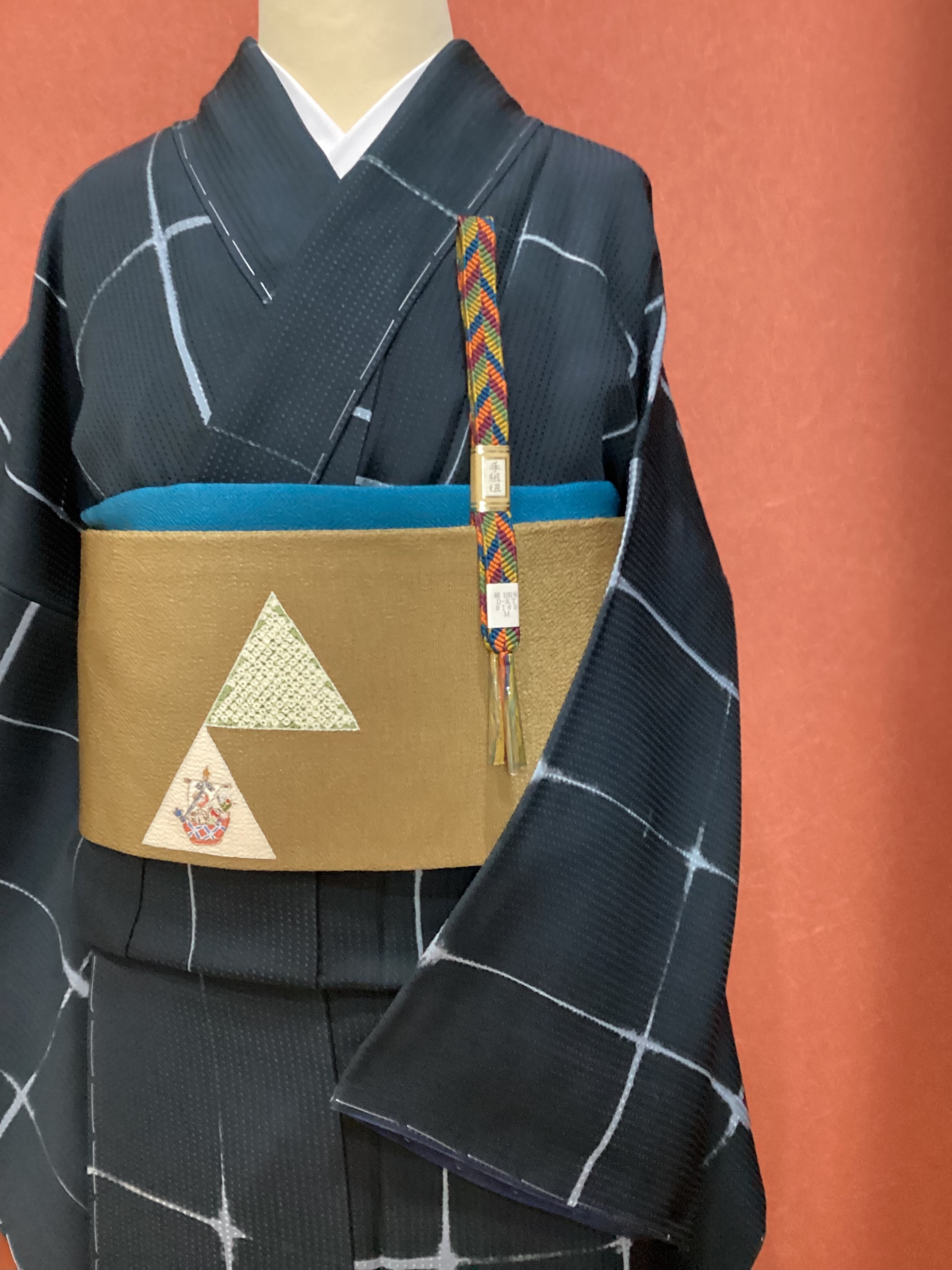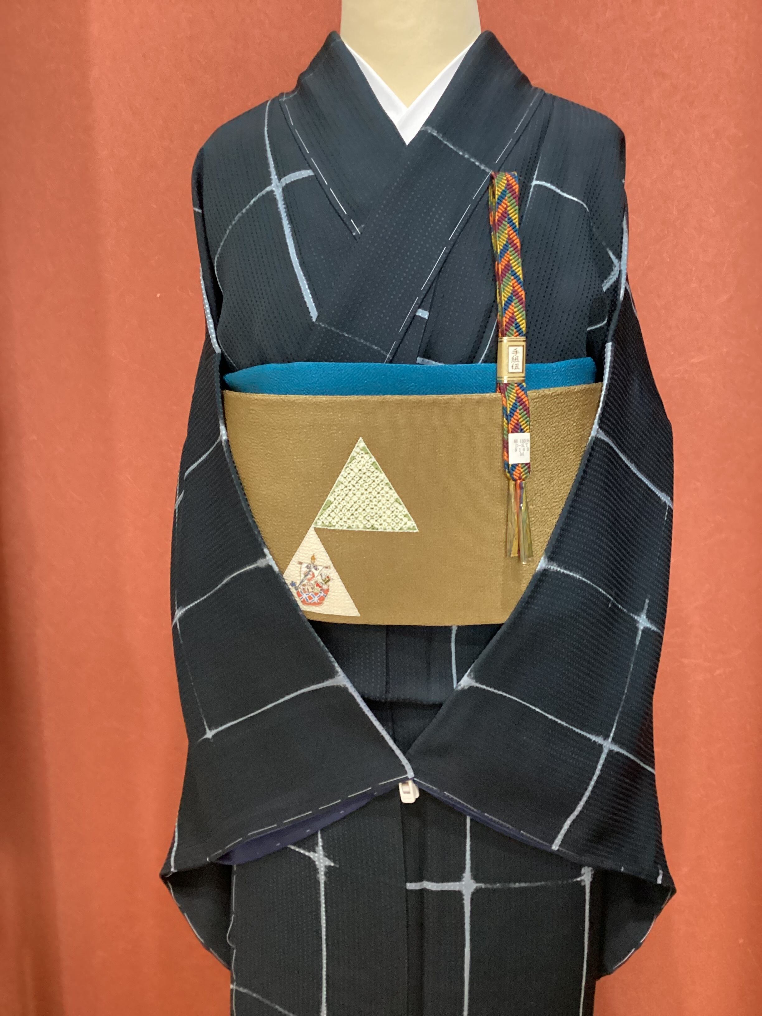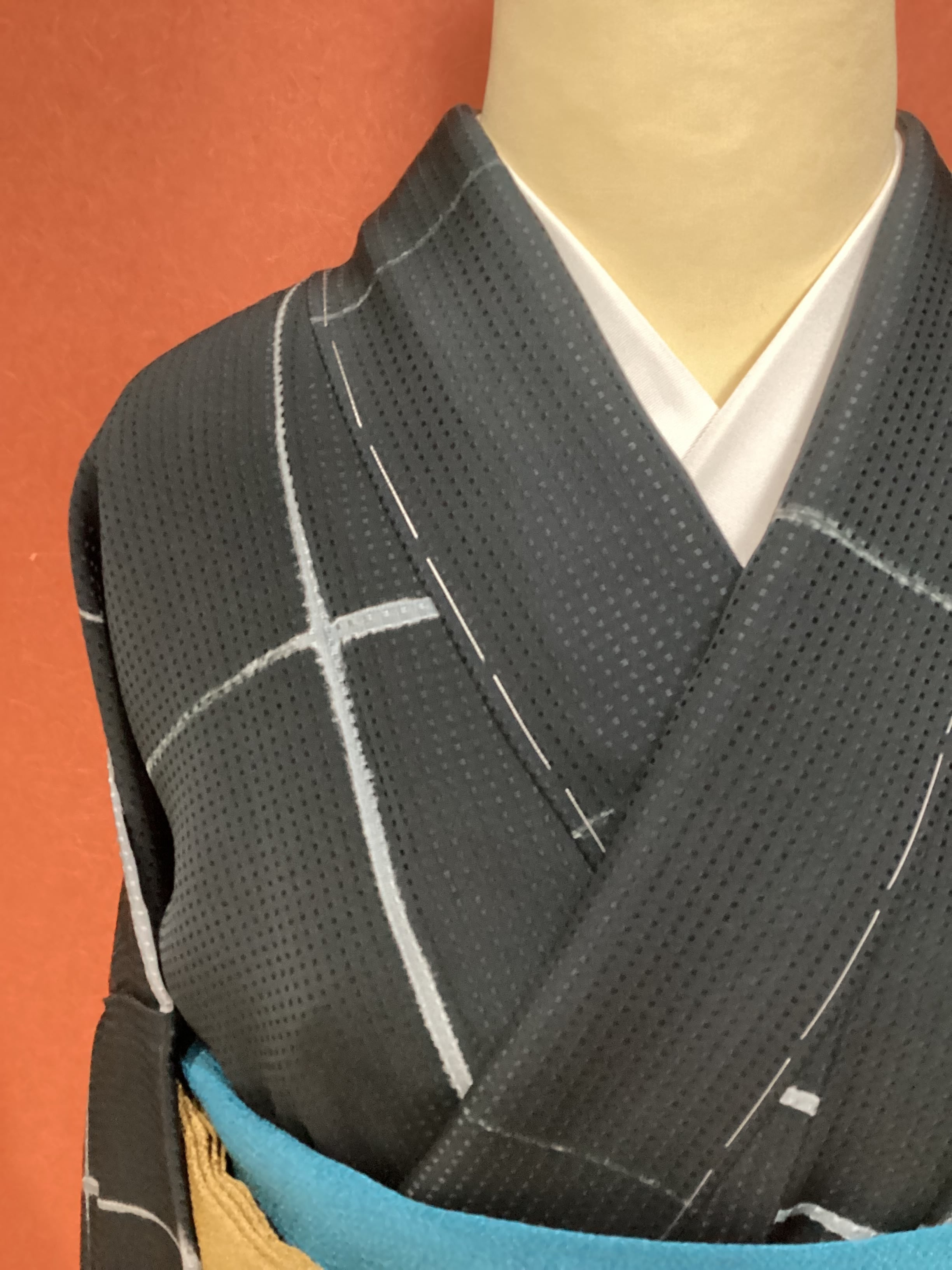 トロンとした落ち感の良いモノトーンでスタイリッシュな小紋きもののご紹介です。地紋にワッフルのような四角いぽこぽことした文様が織られているので、生地が動くと立体的に艶々と光り上質な雰囲気です。板締め絞りで染められたかすれたようなラインの格子文様にも味わいがございます。また、八掛の紺色がキリリと粋な雰囲気を醸し出しています。身丈、裄丈、身巾ともに十分ございますので、大きめサイズをお探しの方はいかがでしょうか。