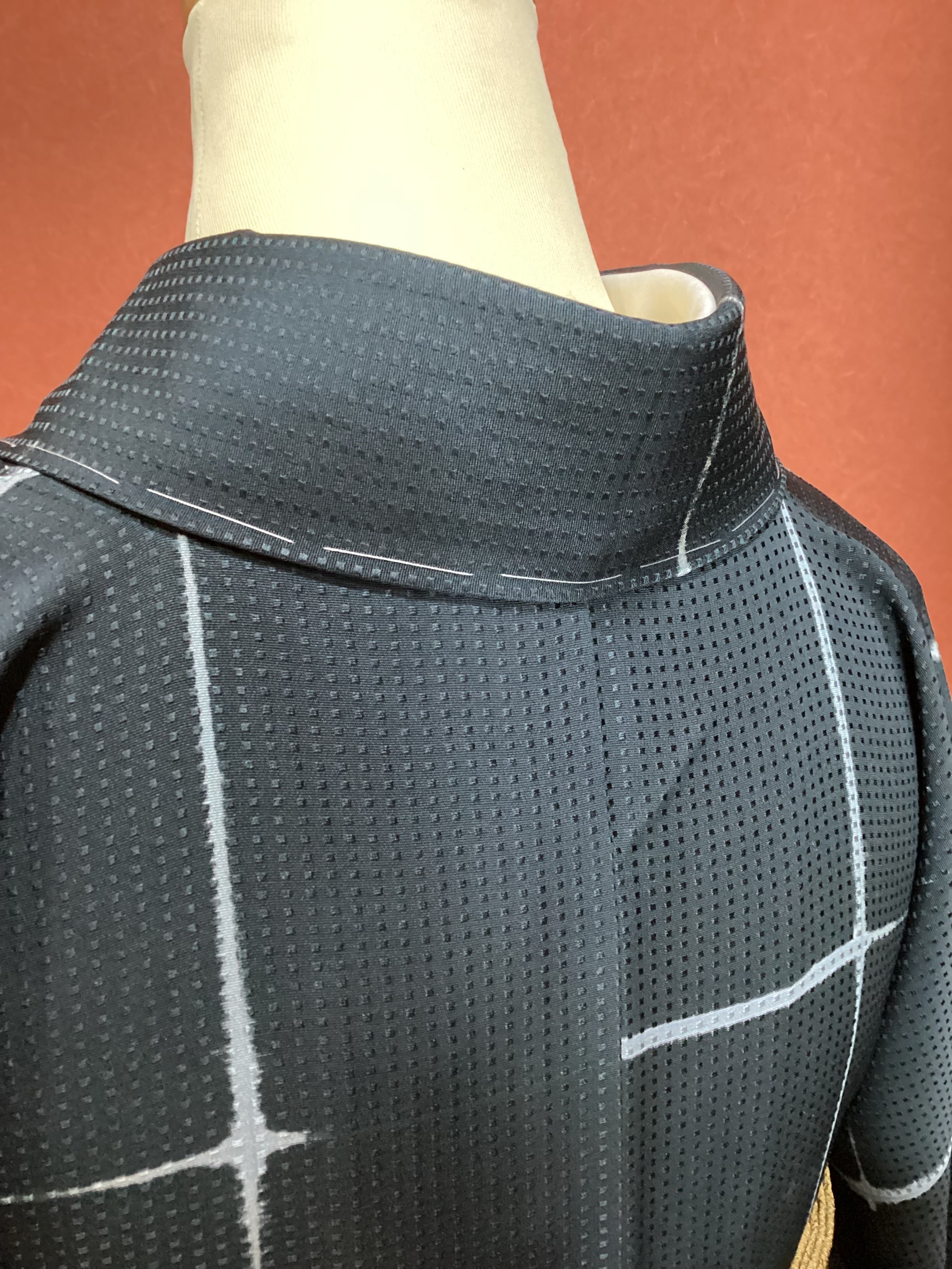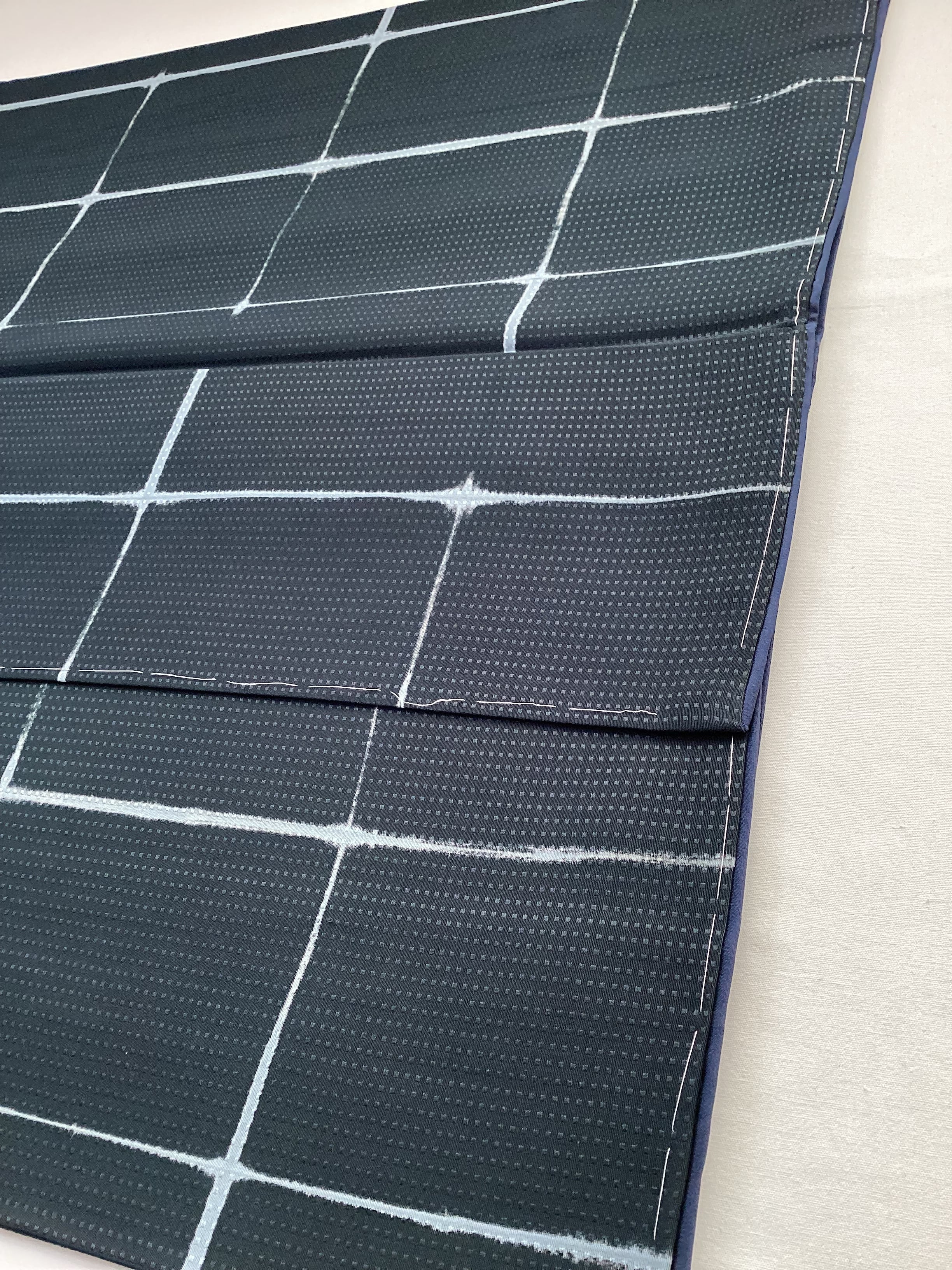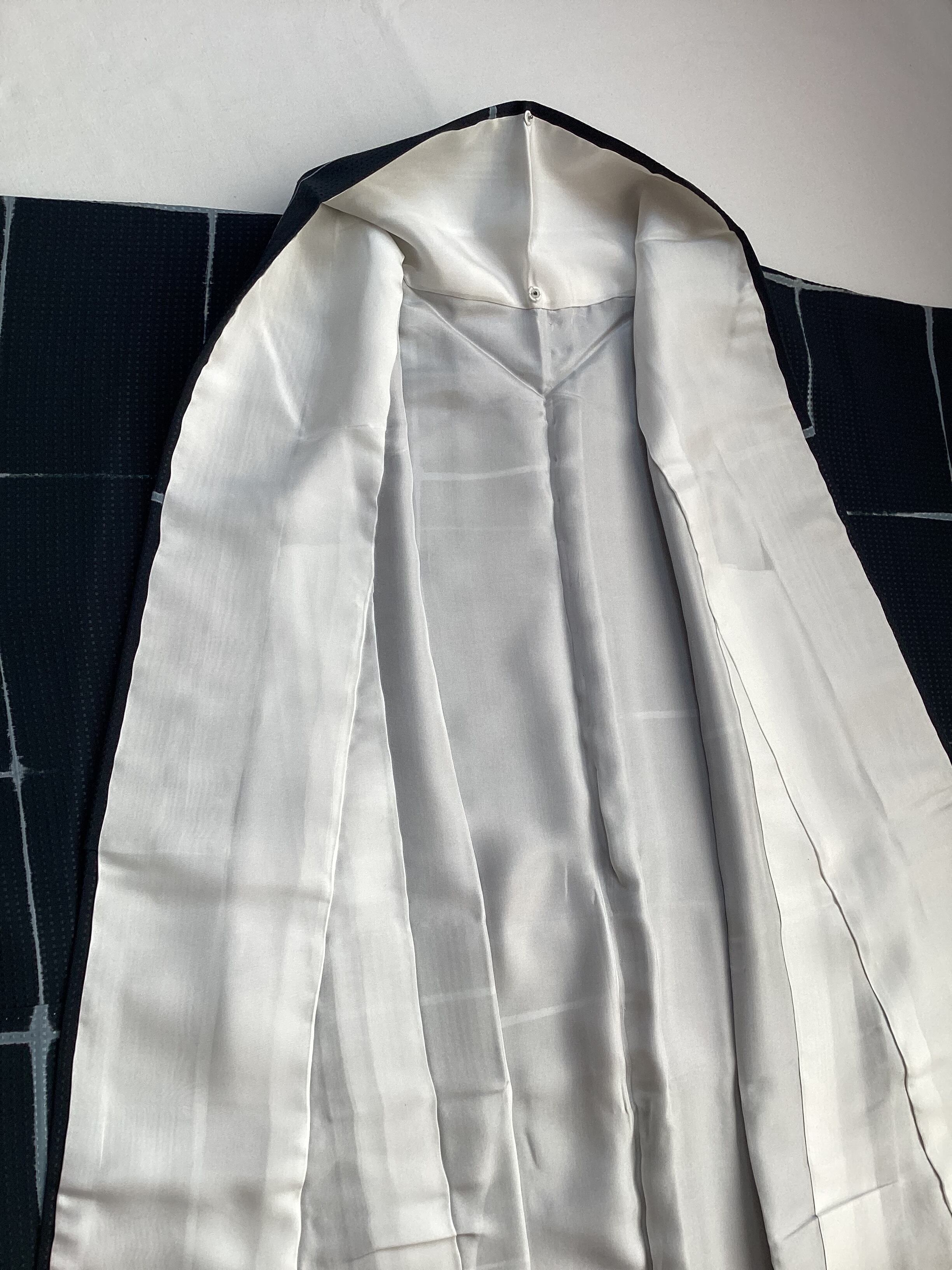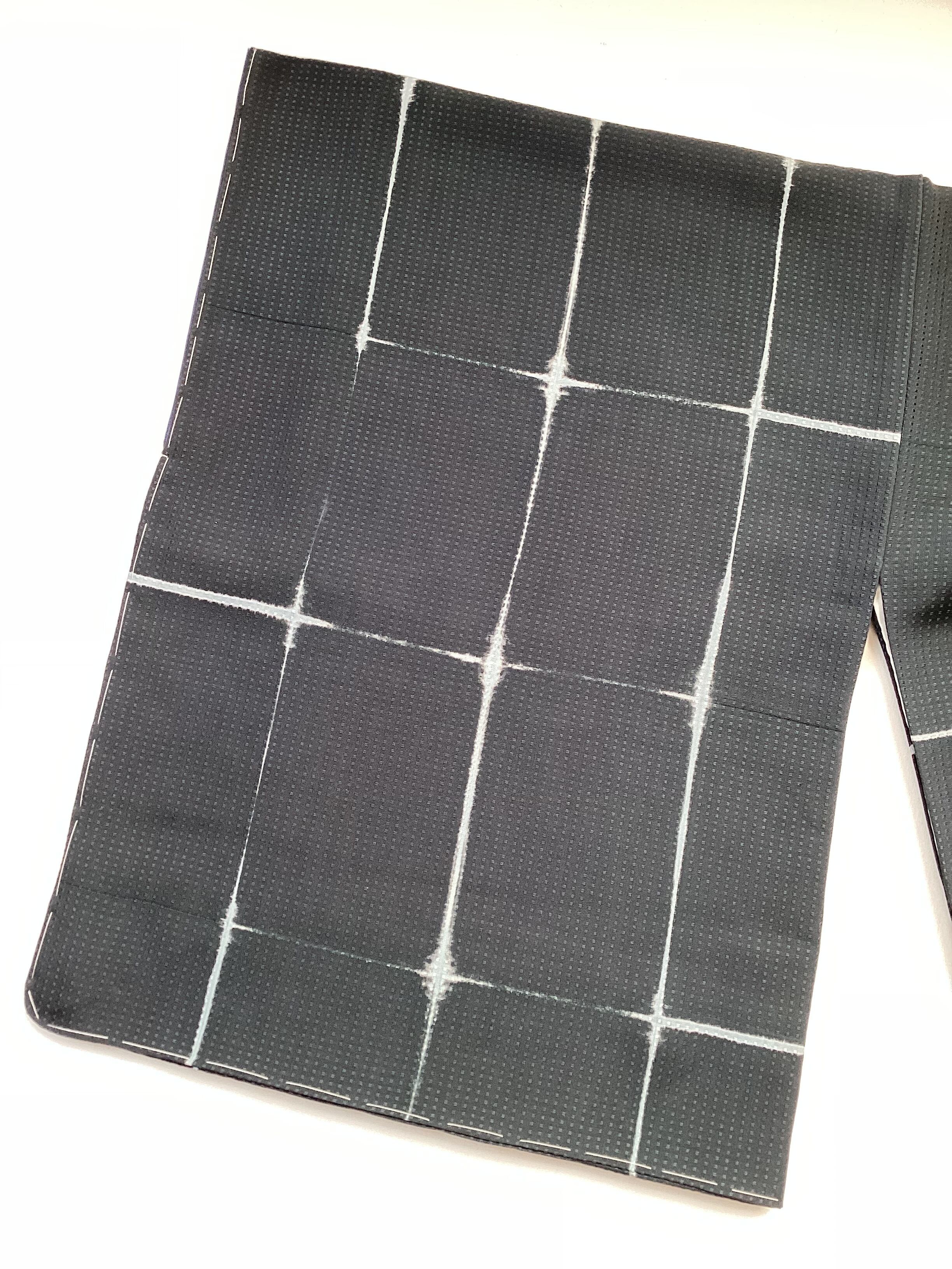 トロンとした落ち感の良いモノトーンでスタイリッシュな小紋きもののご紹介です。地紋にワッフルのような四角いぽこぽことした文様が織られているので、生地が動くと立体的に艶々と光り上質な雰囲気です。板締め絞りで染められたかすれたようなラインの格子文様にも味わいがございます。また、八掛の紺色がキリリと粋な雰囲気を醸し出しています。身丈、裄丈、身巾ともに十分ございますので、大きめサイズをお探しの方はいかがでしょうか。