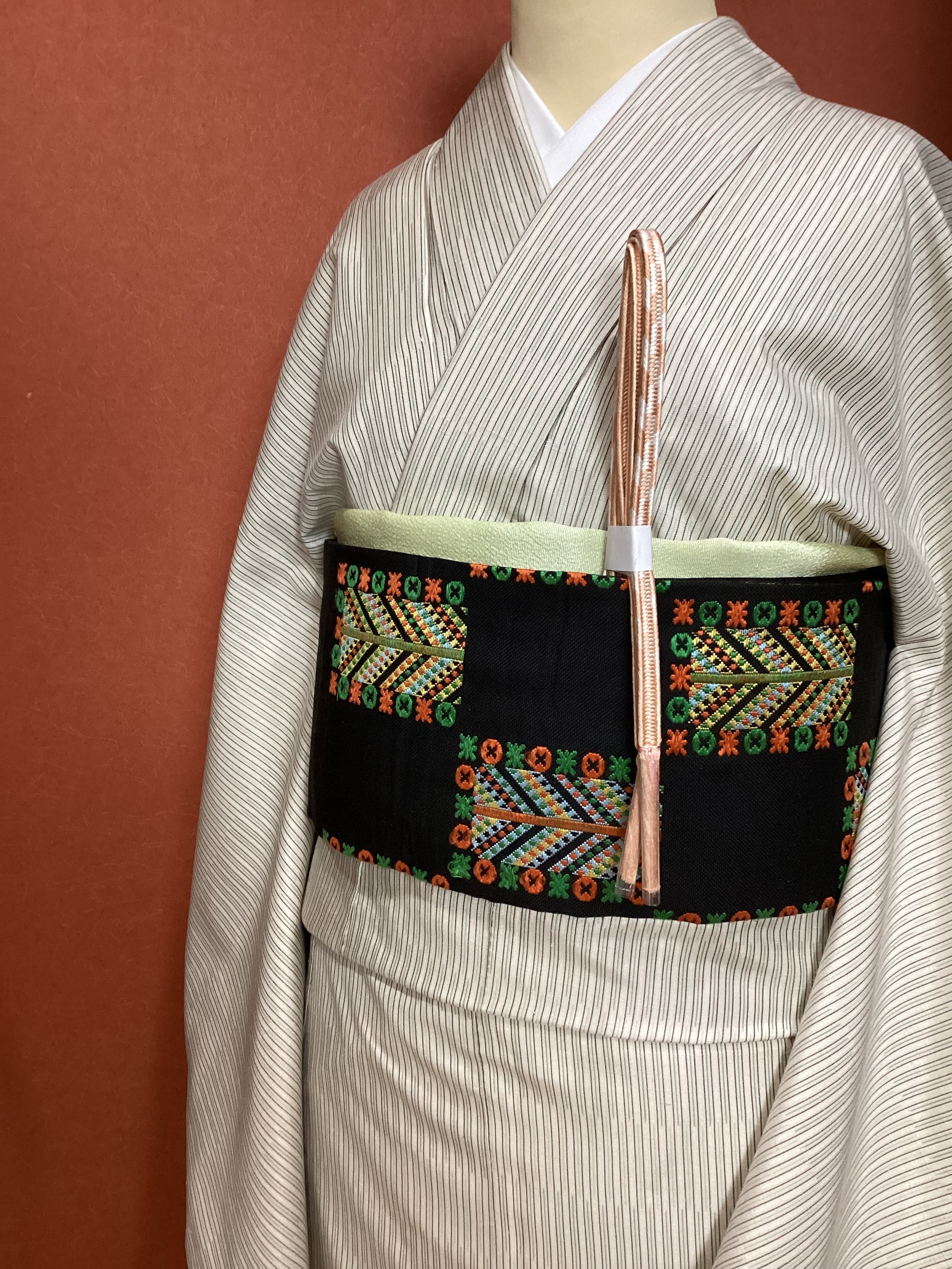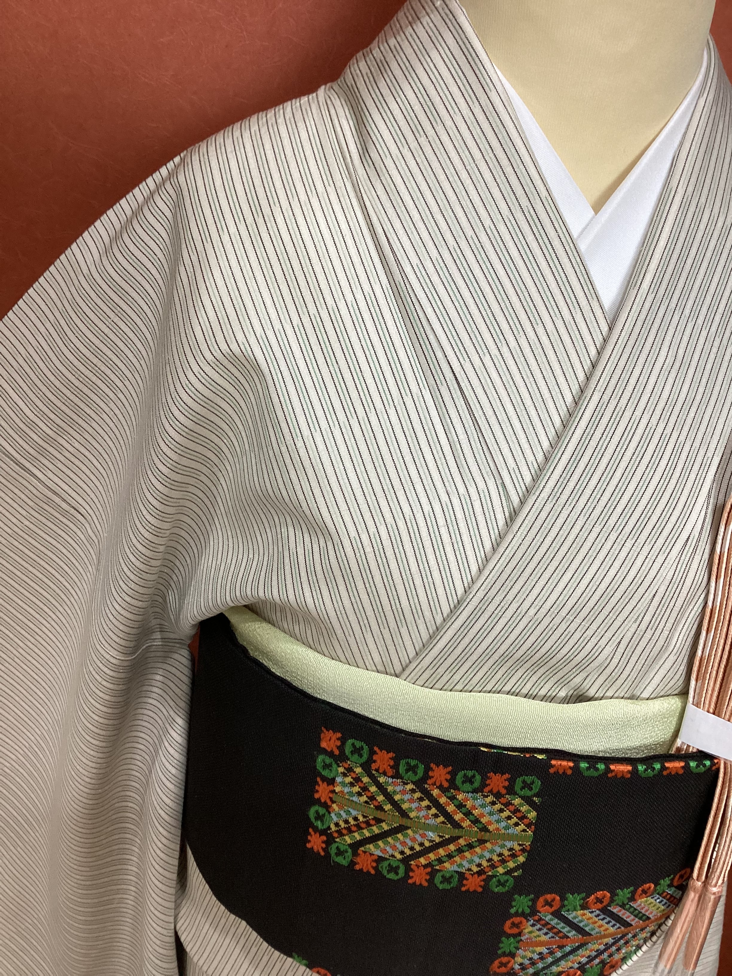 生成りにミントグリーンの縦縞文様が織られた爽やかなお色目の紬きものです。グリーンの八掛が効いて洒落味がございます。上半身に胴裏を省いた【胴抜き仕立て】で仕立てられているので、季節の変わり目や、暑がりの方にオススメする一枚です。身丈が十分ございますので、トールサイズをお探しの方にいかがでしょうか。