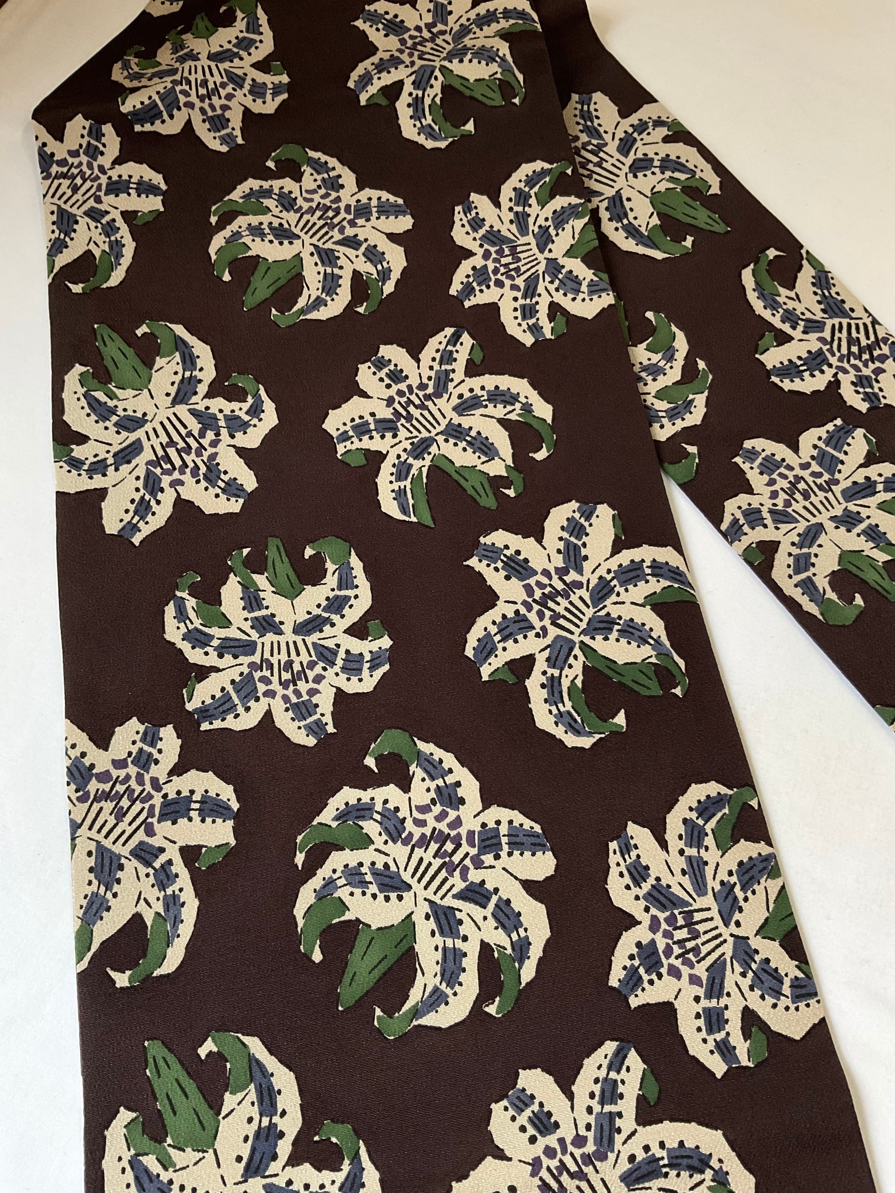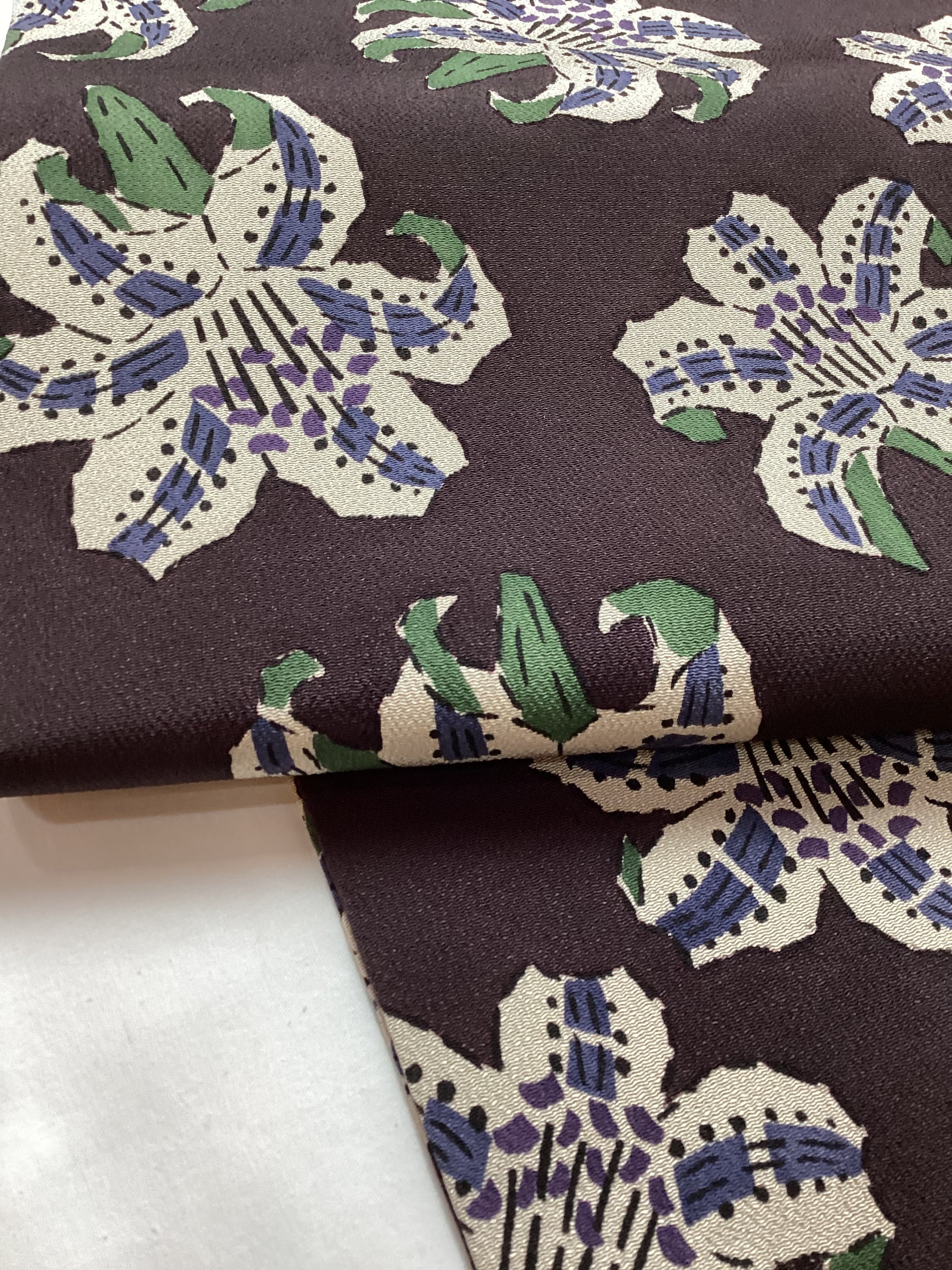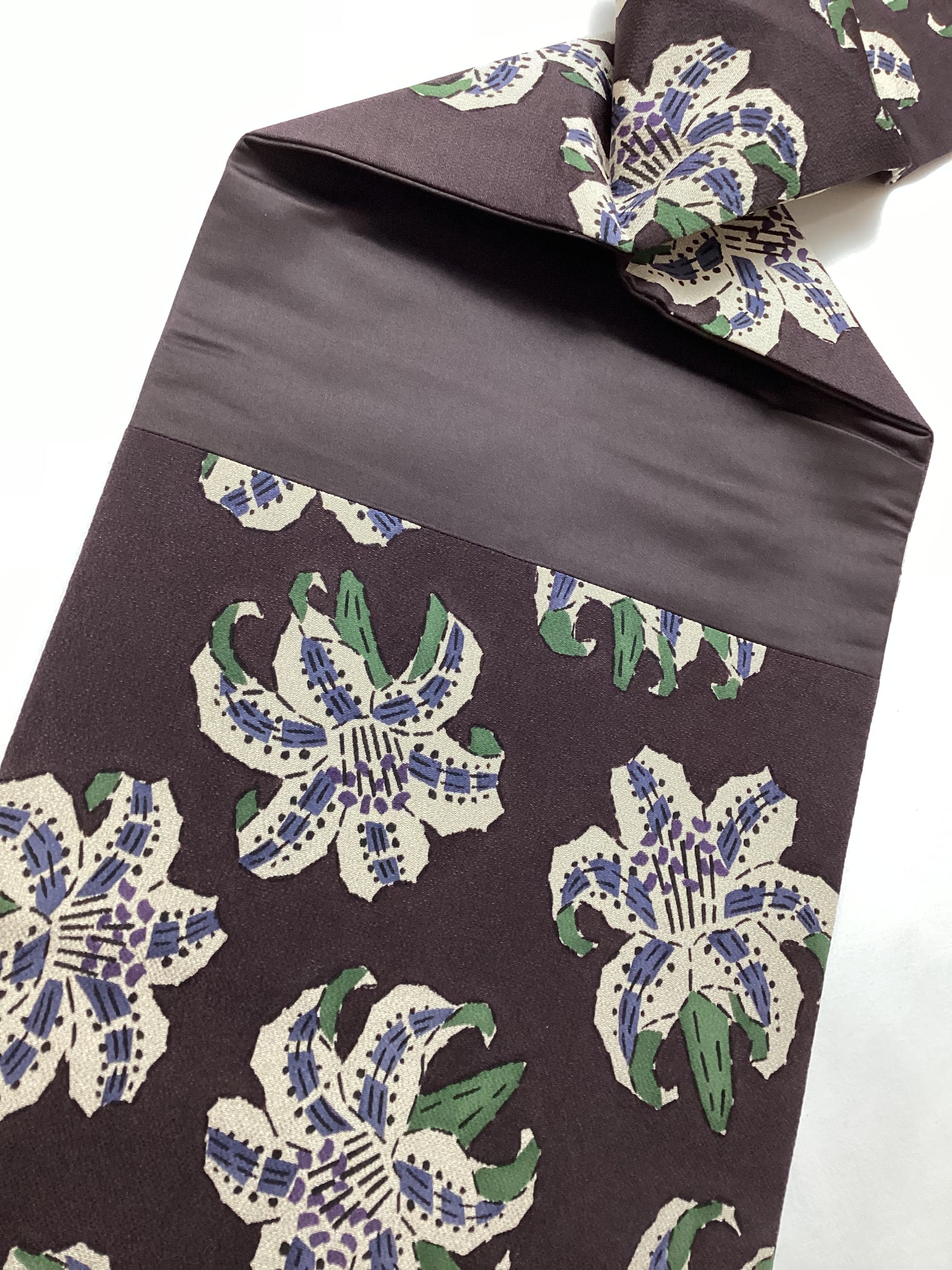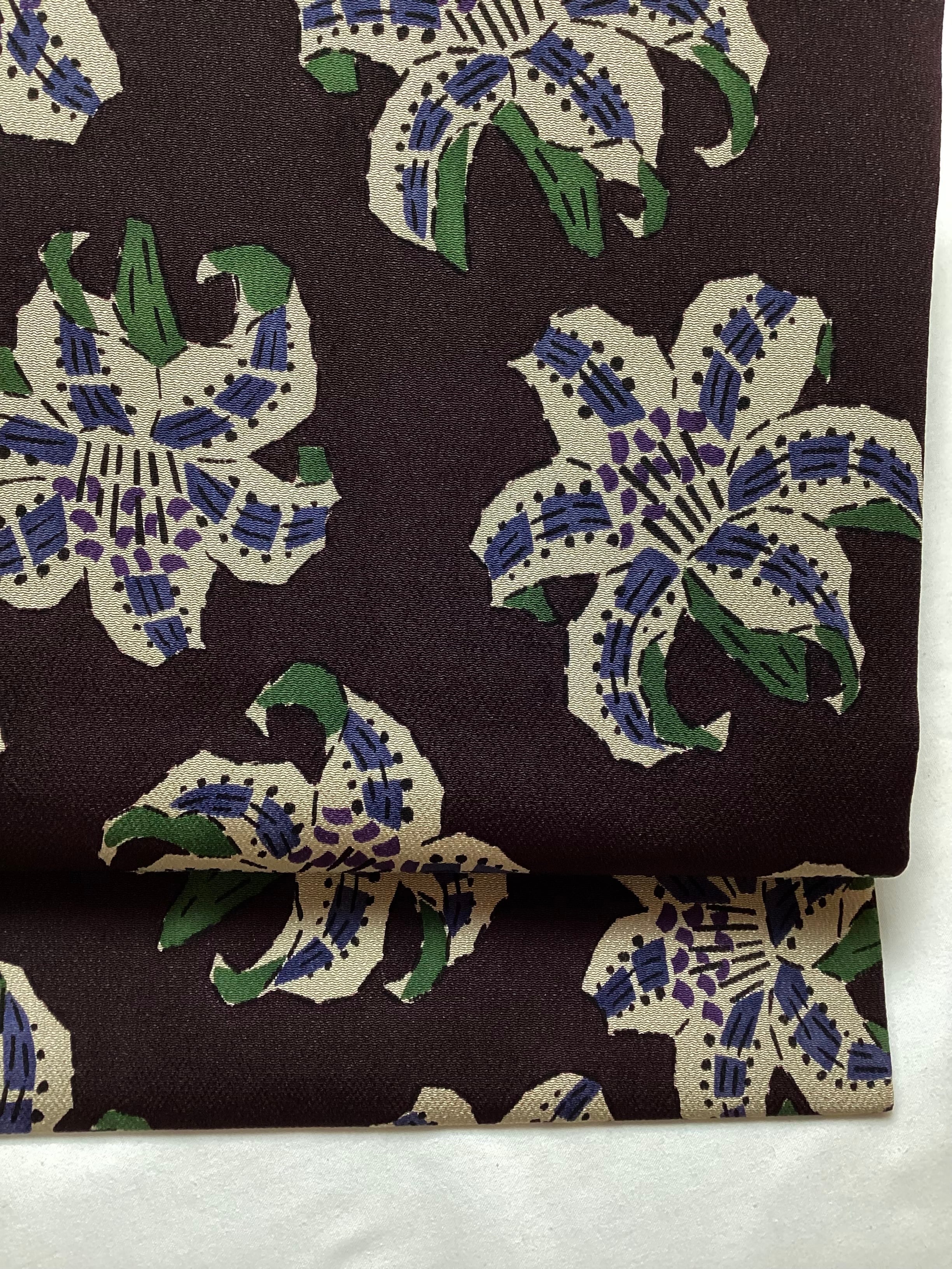 こっくりとした黒茶色のベース地に、絶妙なカラーリングで百合の花が型染めされた、なんとも味わいのある縮緬の九寸なごや帯です。江戸紅型作家【五味桂子】氏の手にかかると、可憐な百合の花がこんなにも表情豊かに、大人の可愛さ、かっこ良さ、力強さの現れた作品となって装いに個性を与えてくれる逸品です。