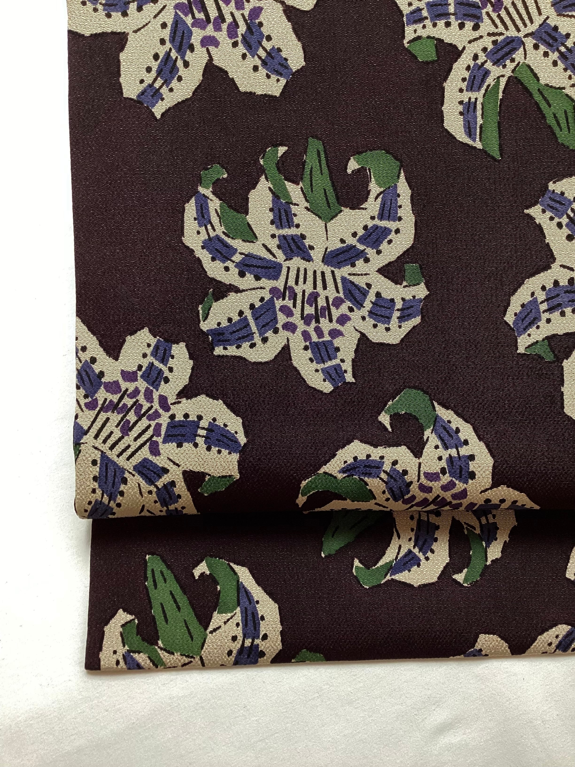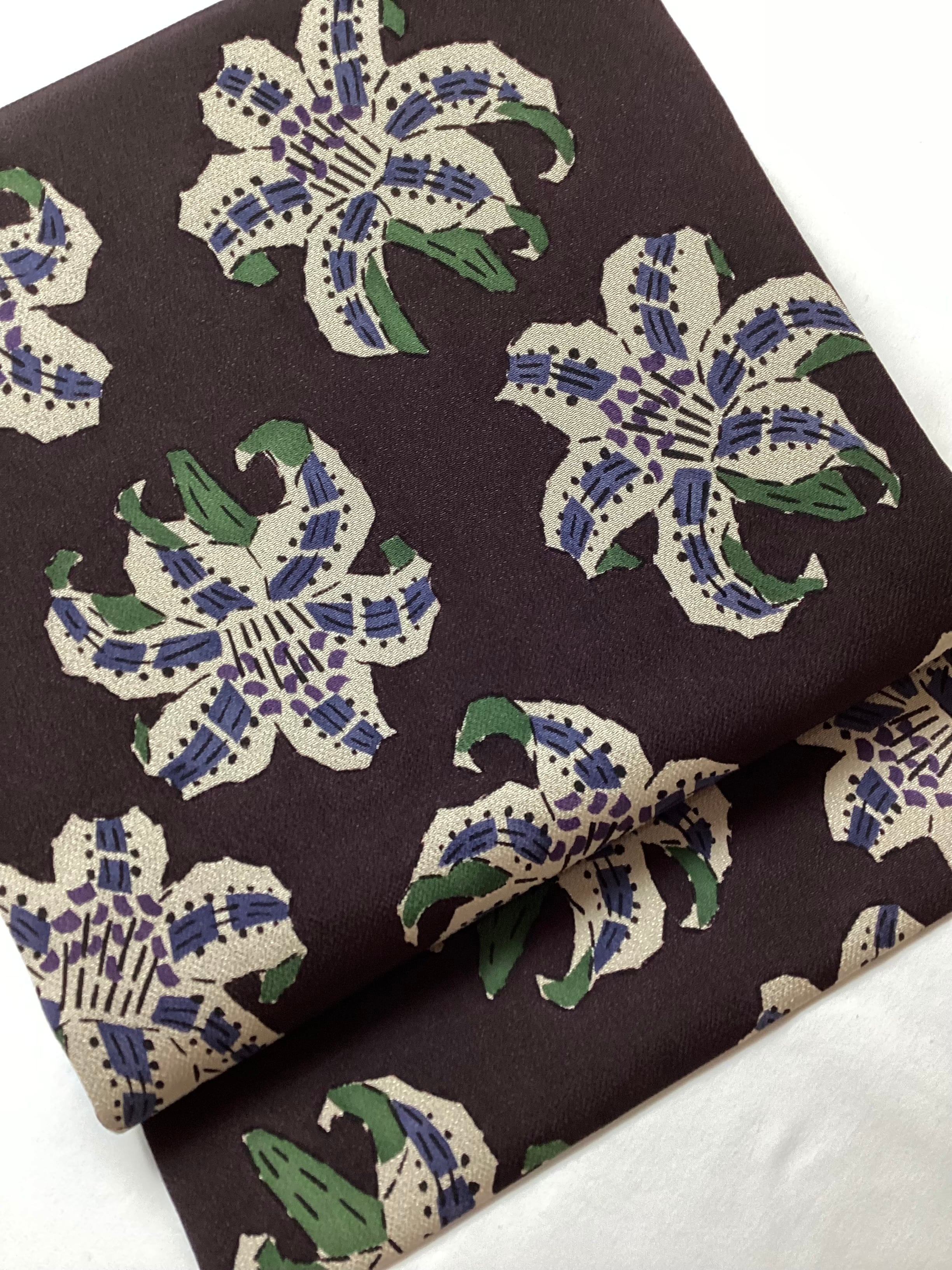 黒茶色地百合文【五味桂子】縮緬なごや帯 260109-1