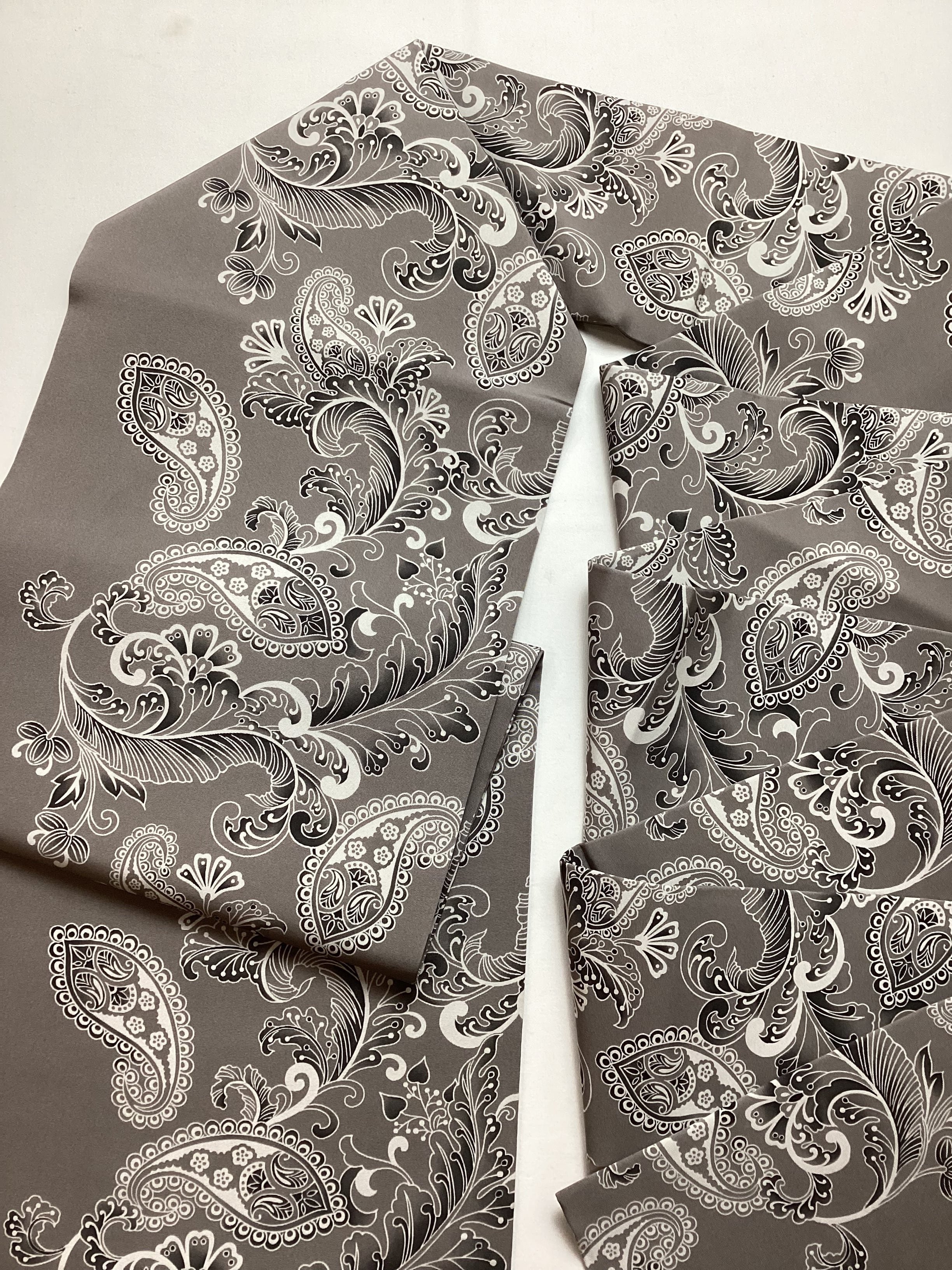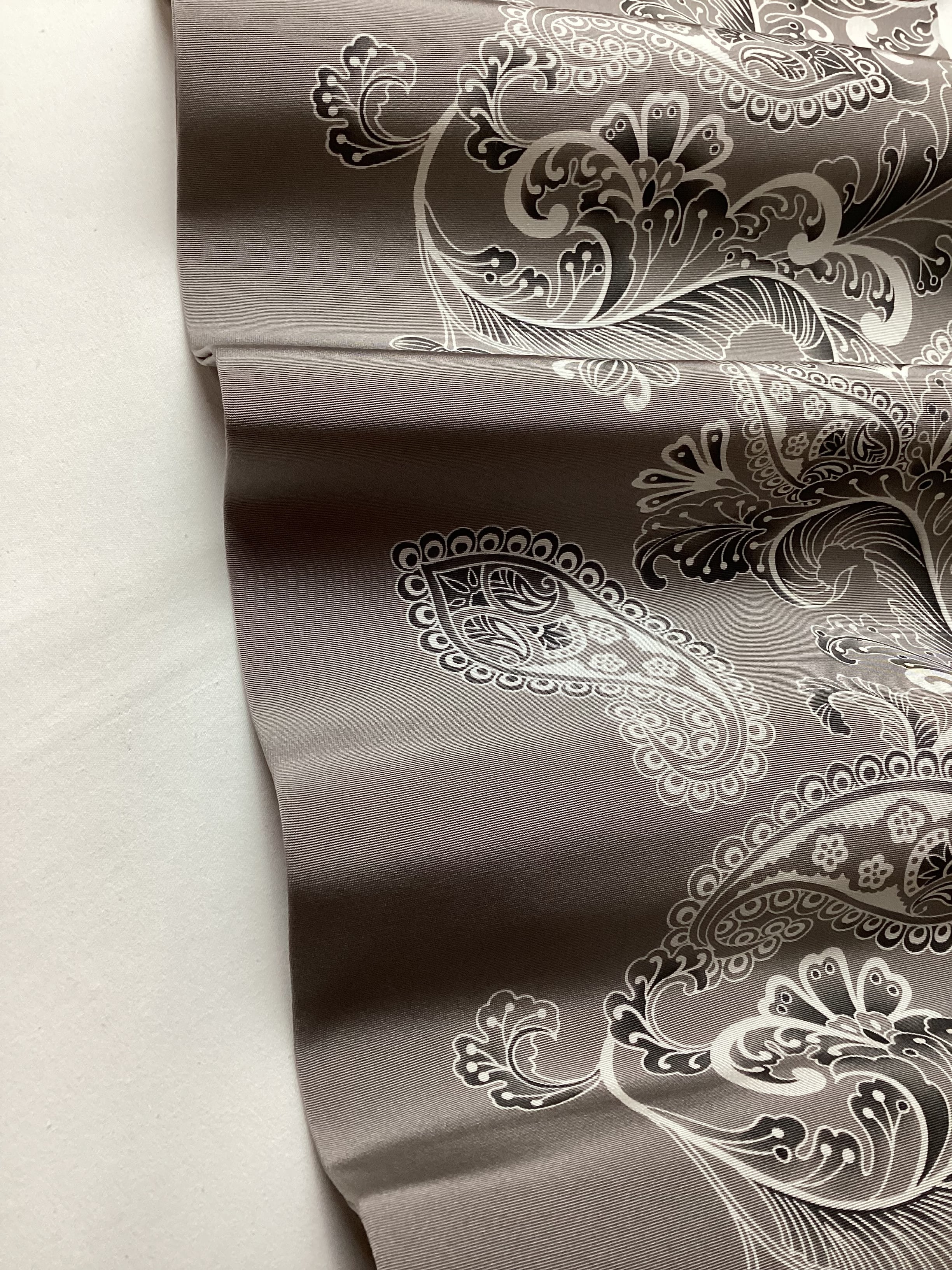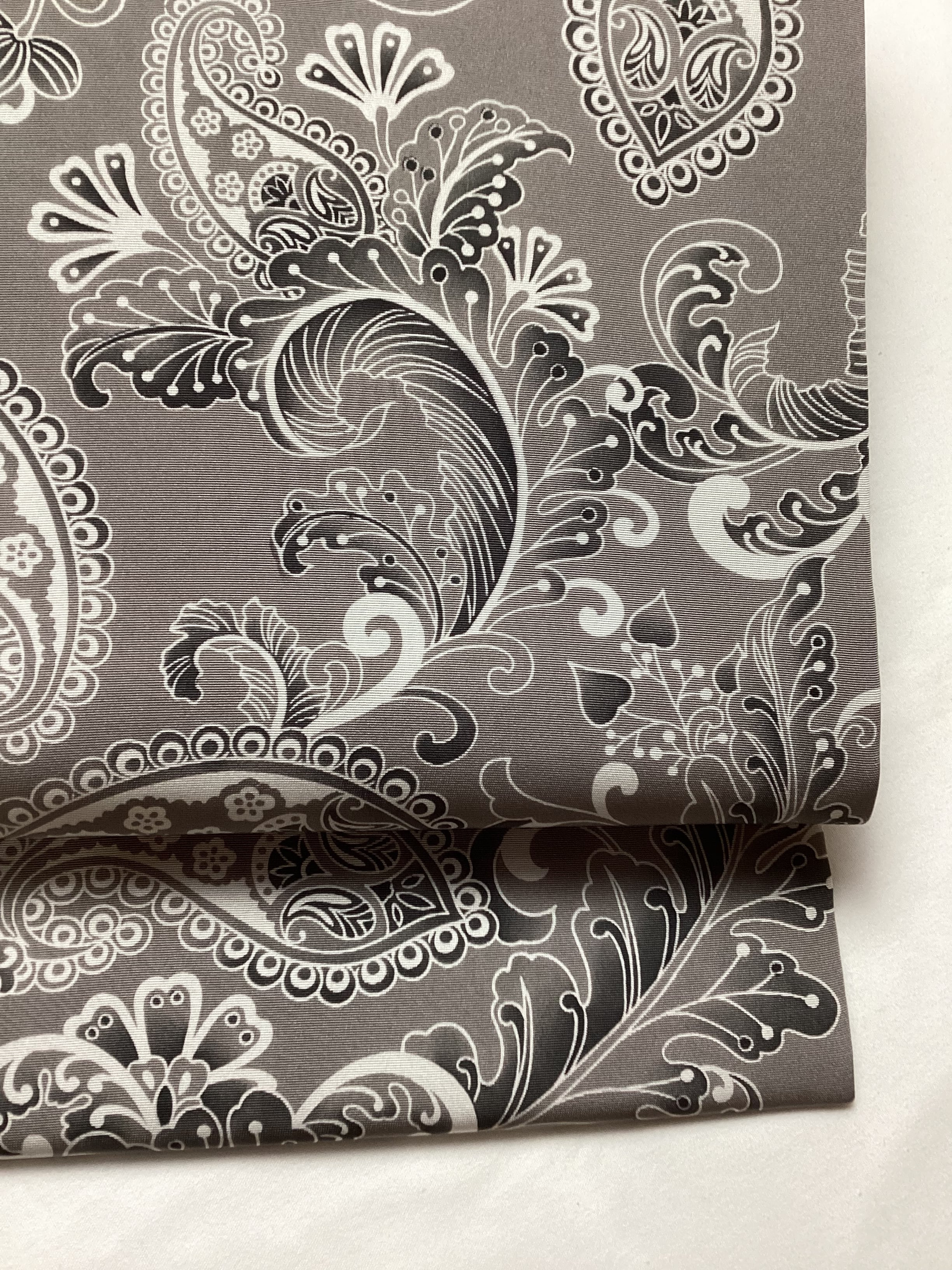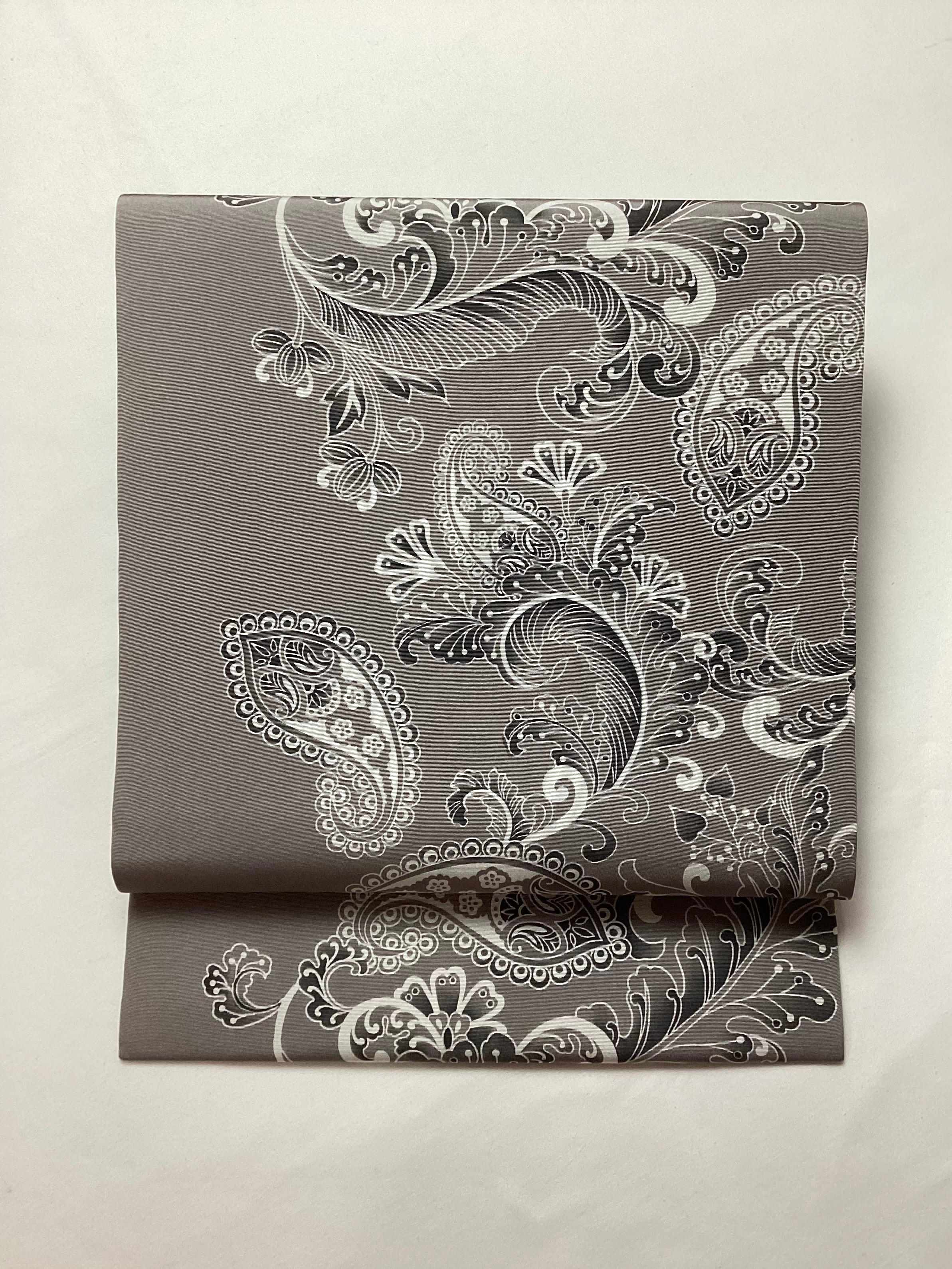 グレーのベース地に曲線の美しい植物モチーフの装飾文様がモノトーンに染められたモダンでスタイリッシュな塩瀬の染め帯です。細かい部分まで柔らかな筆のタッチで描かれており、モノトーンのグラデーションが美しいお品です。古いお着物に合わせていただいても、着姿に現代的な雰囲気を纏わせてくれ、柄を選ばず締めやすい全通柄であるところも嬉しい帯です。