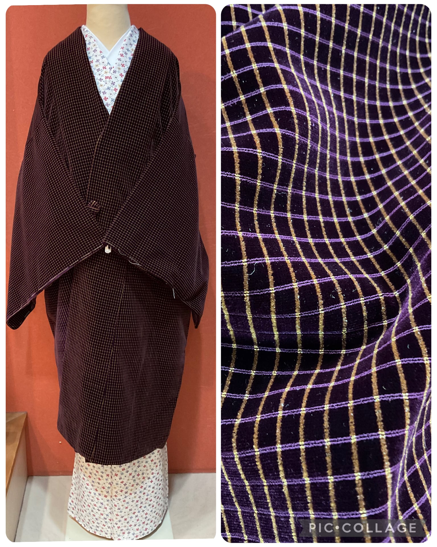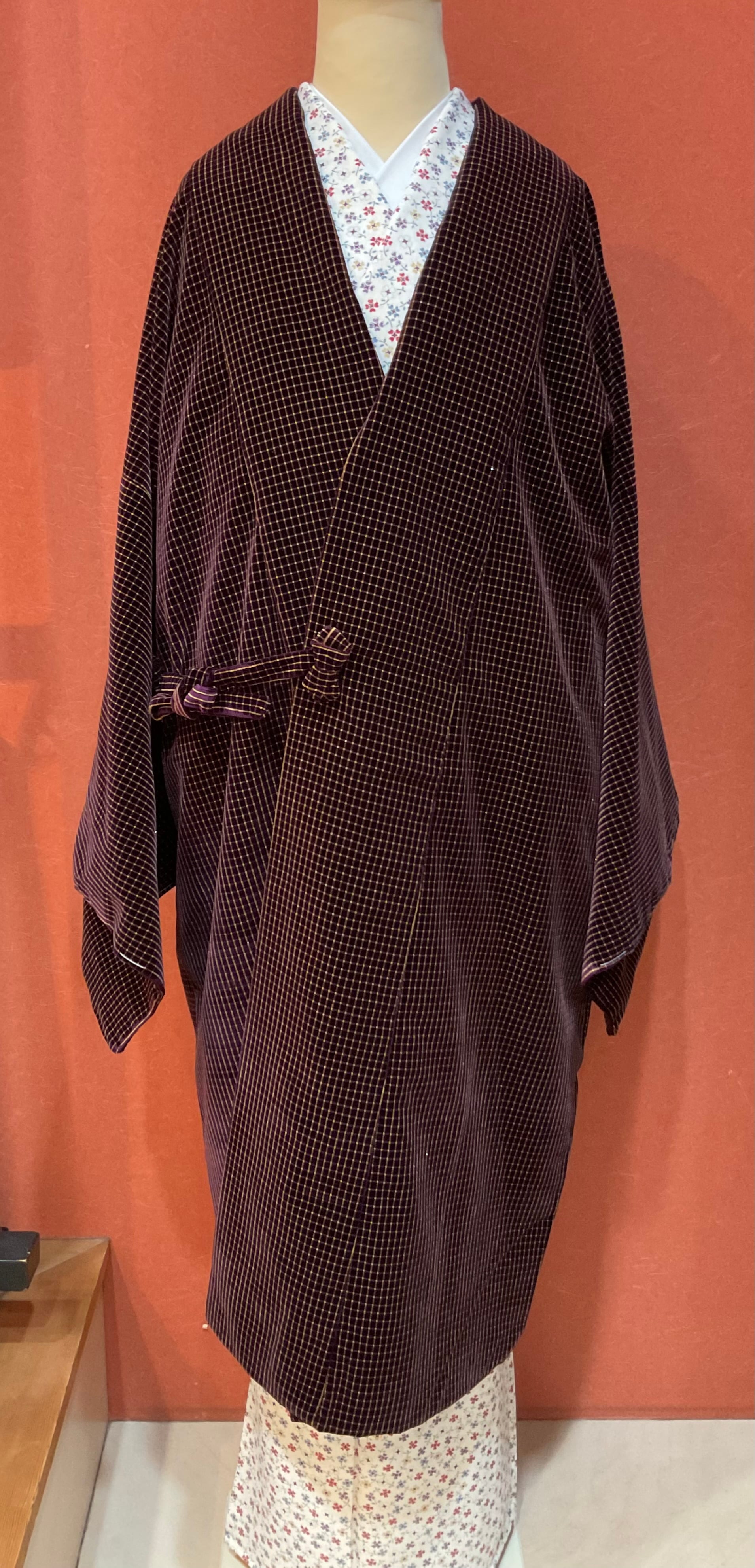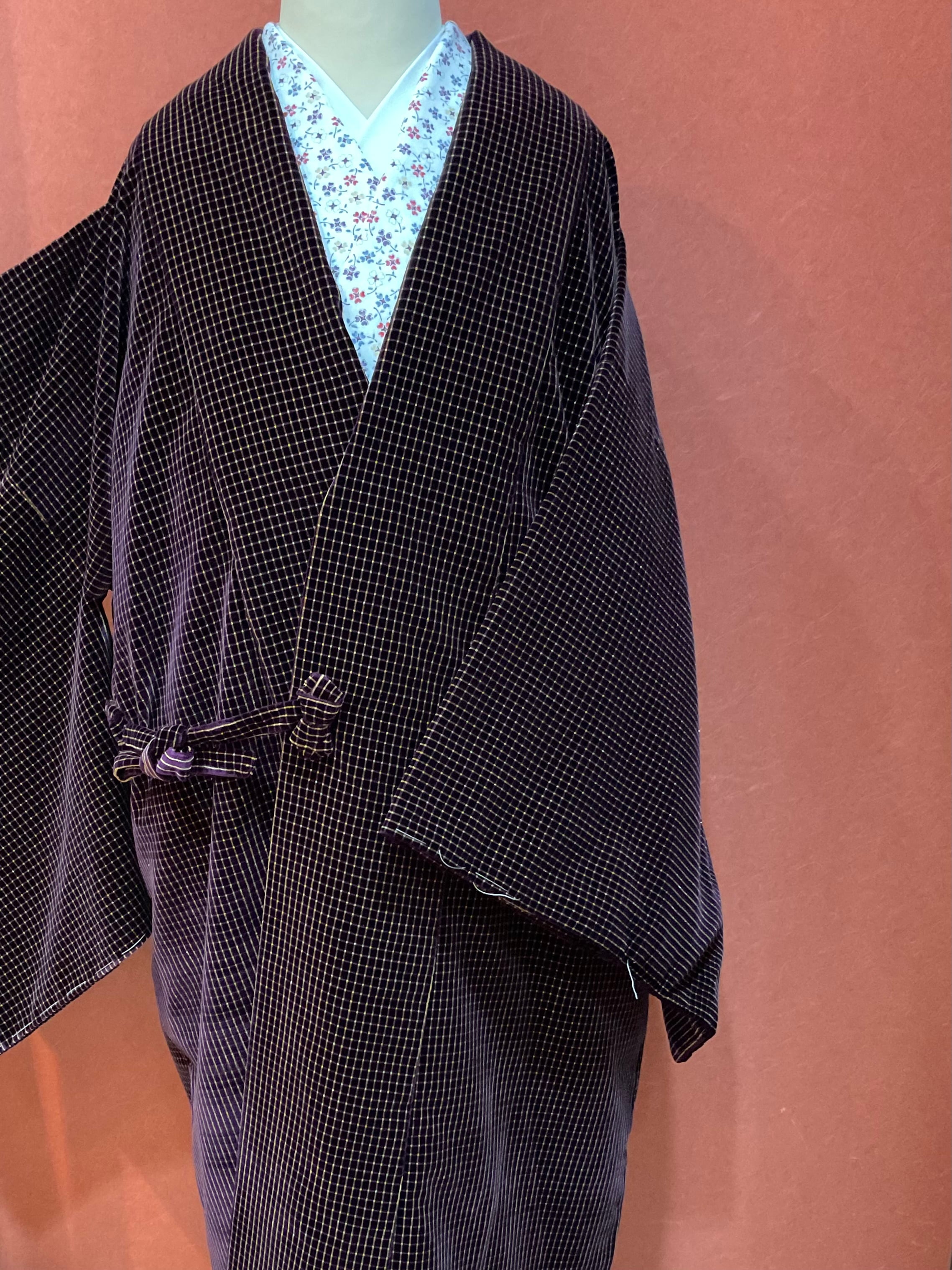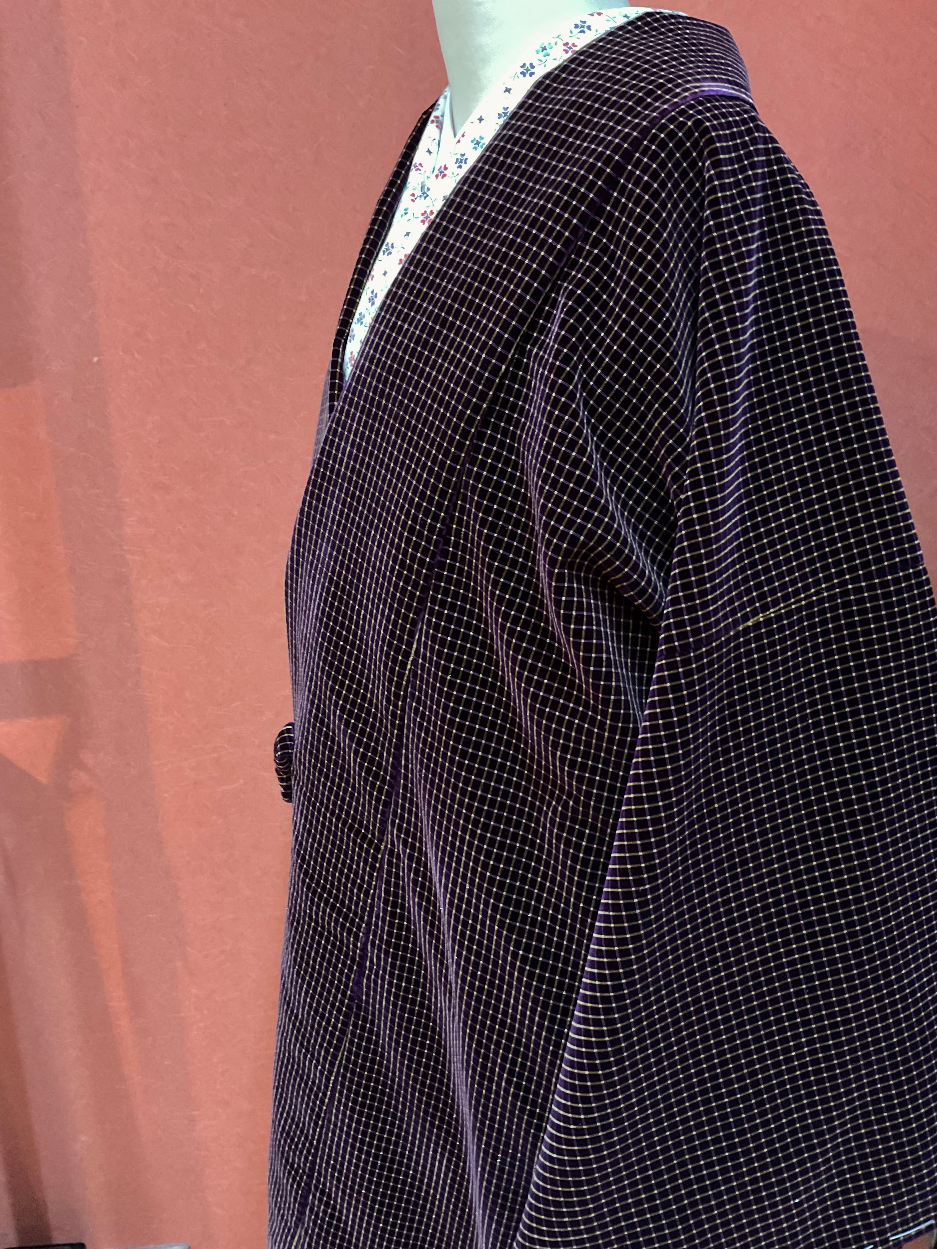 あたたかな風合いのベルベット地道中着コートです。深い紫色地にマットな金格子文様が映えてお洋服感覚で羽織れる洒落た雰囲気の防寒コートです。寒い日のお出掛け用に、いかがでしょうか。