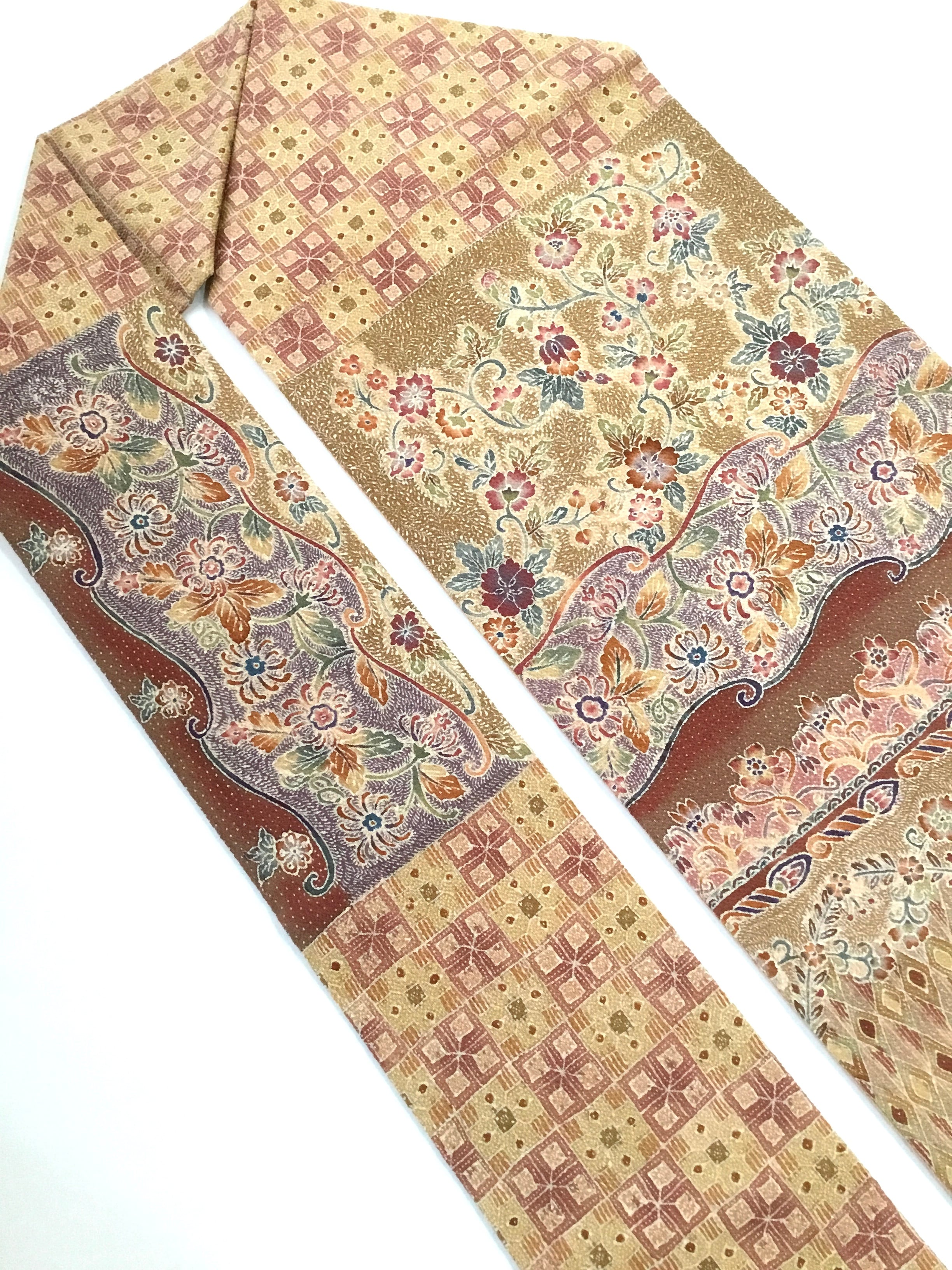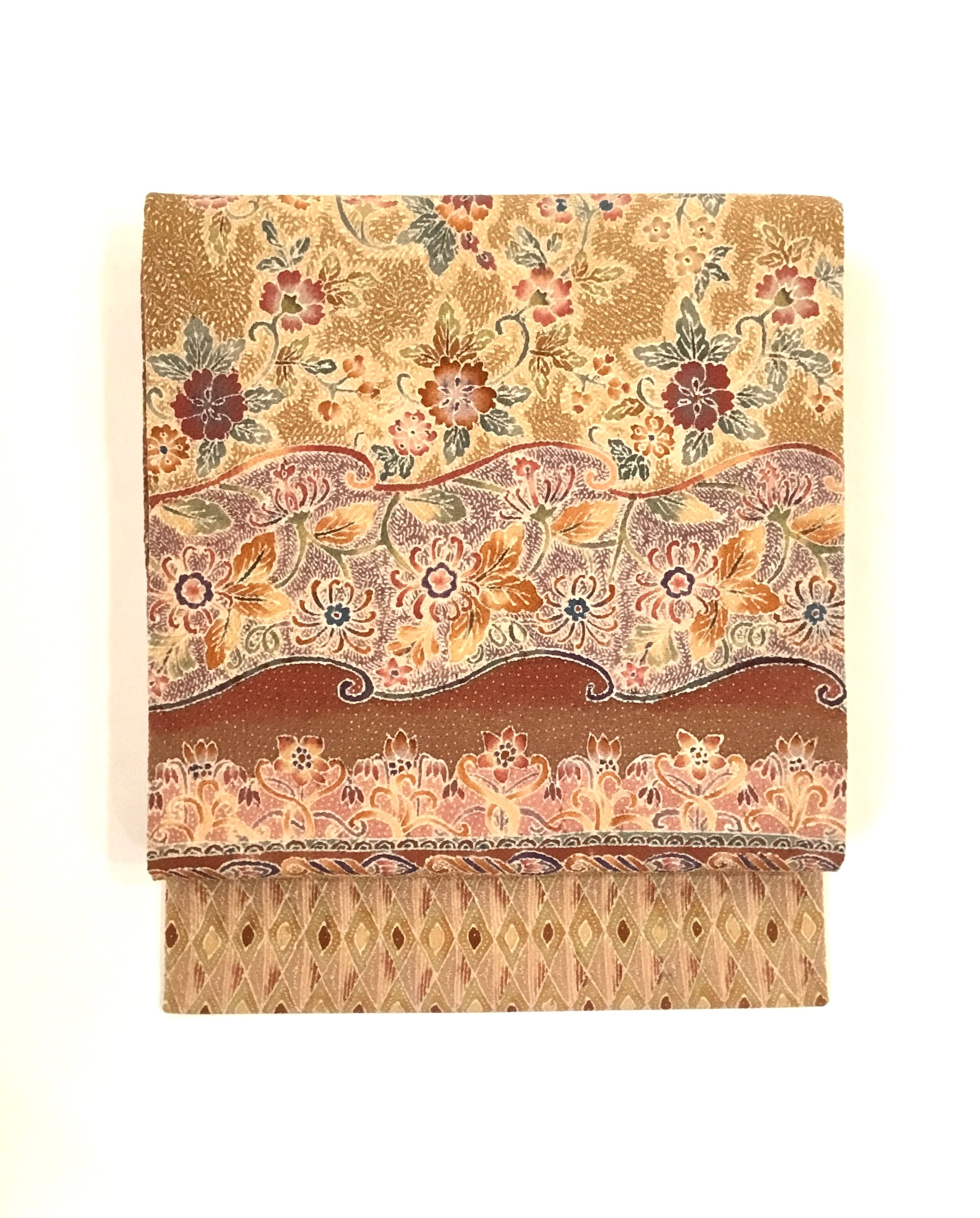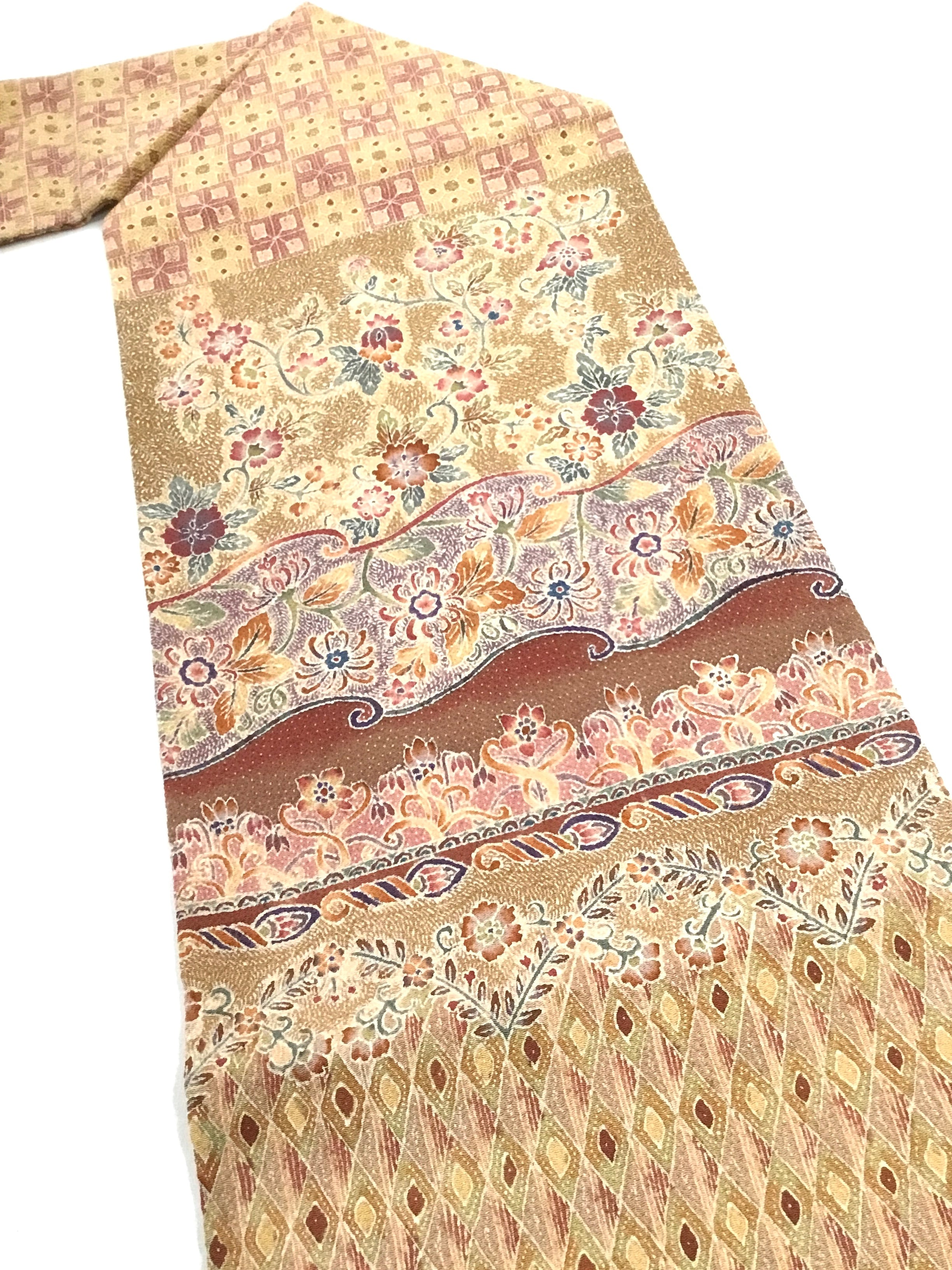 シボだった柔らかな縮緬地に隙間なく植物や装飾文様が染められた九寸なごや帯です。唐花文に四角花や菱形を様々に組み合わせ多色使いで描かれた大変に凝ったデザインです。締めると見えない部分にまで細かく彩色された美しい染め帯です。