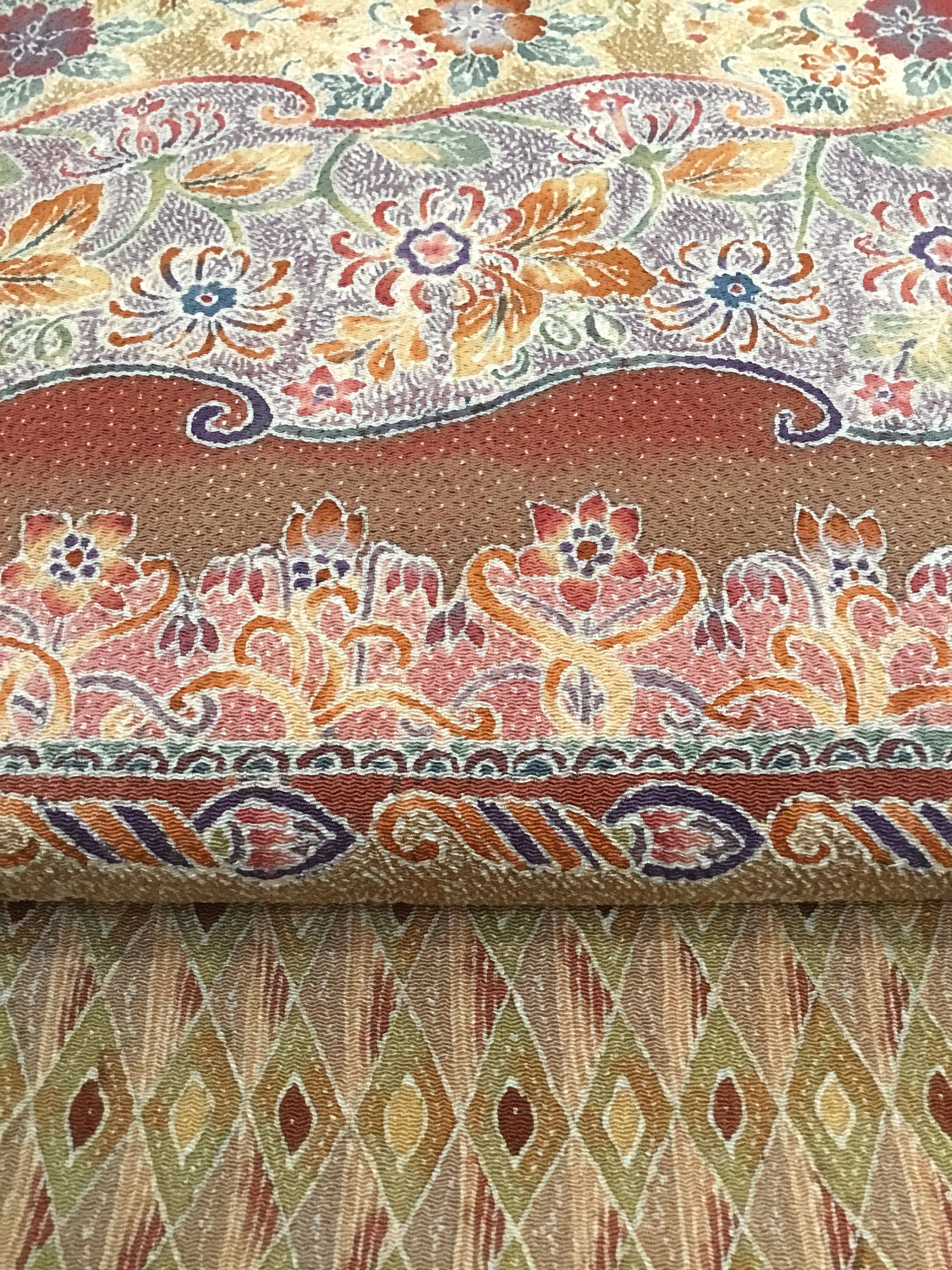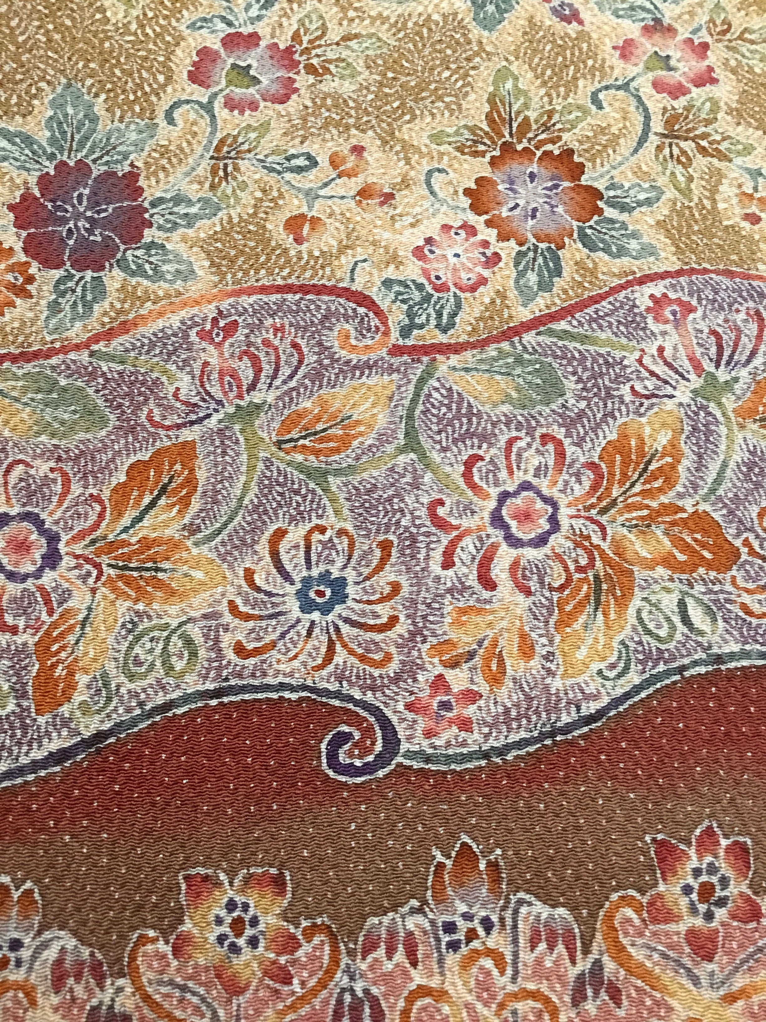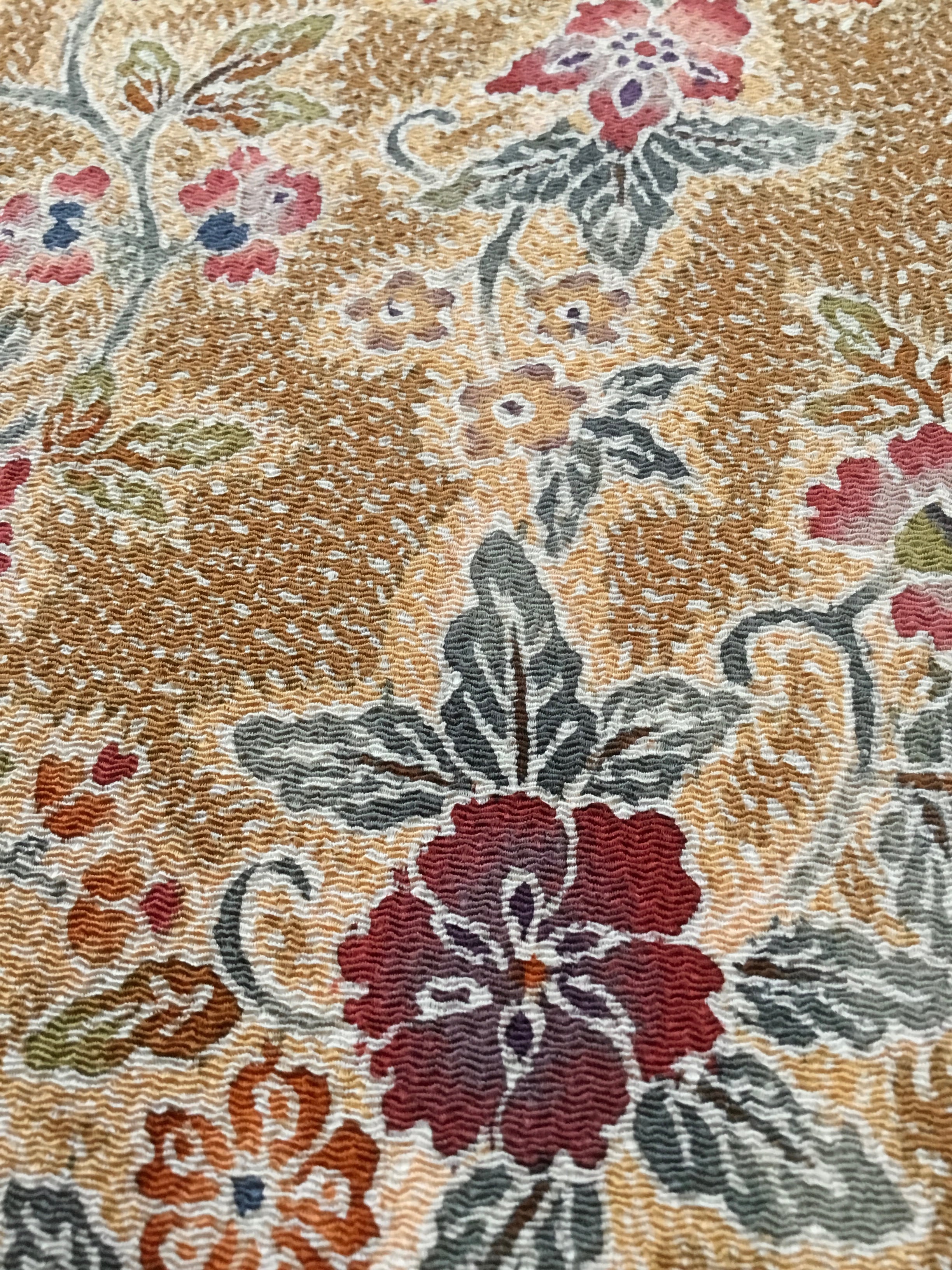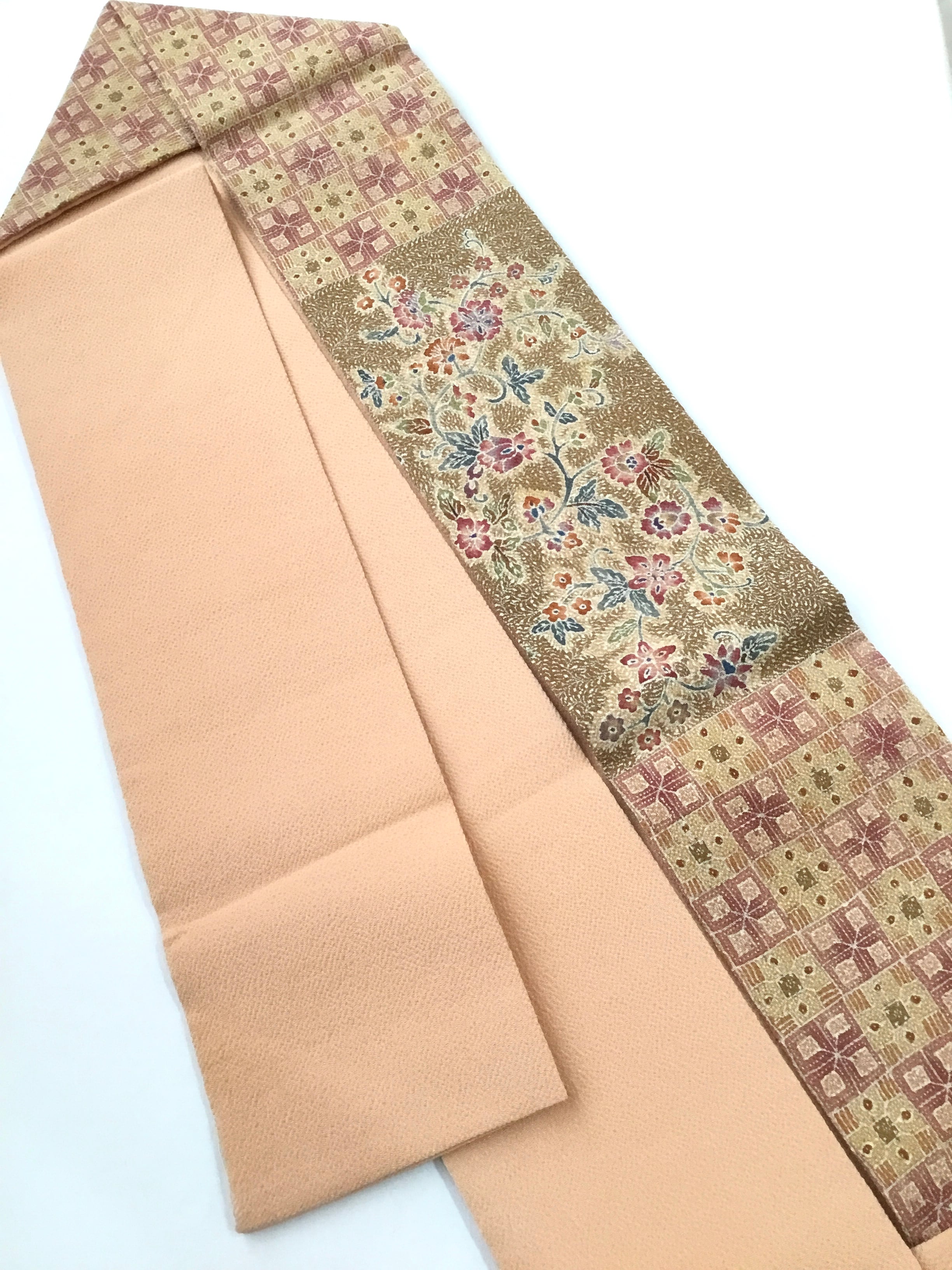 シボだった柔らかな縮緬地に隙間なく植物や装飾文様が染められた九寸なごや帯です。唐花文に四角花や菱形を様々に組み合わせ多色使いで描かれた大変に凝ったデザインです。締めると見えない部分にまで細かく彩色された美しい染め帯です。