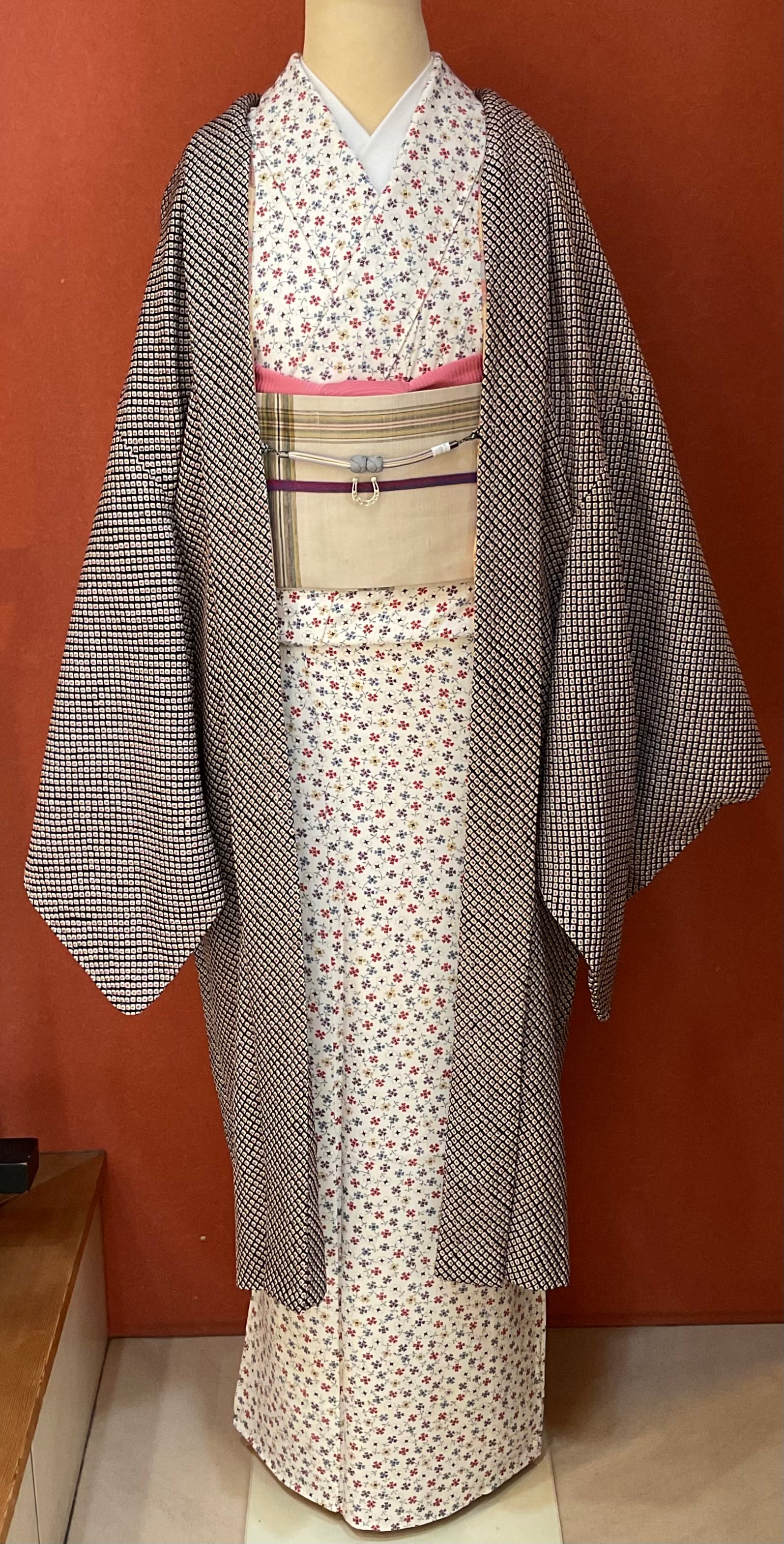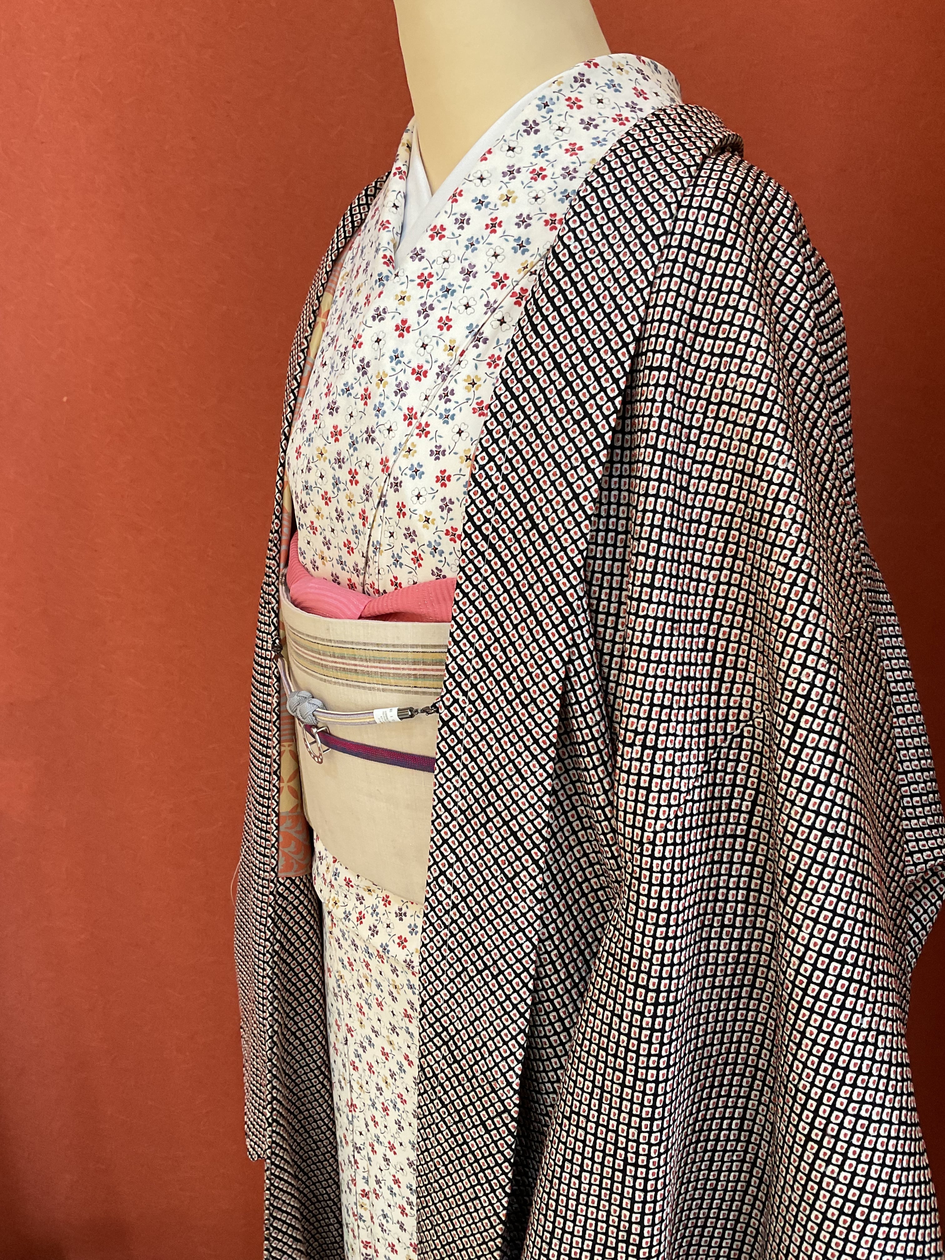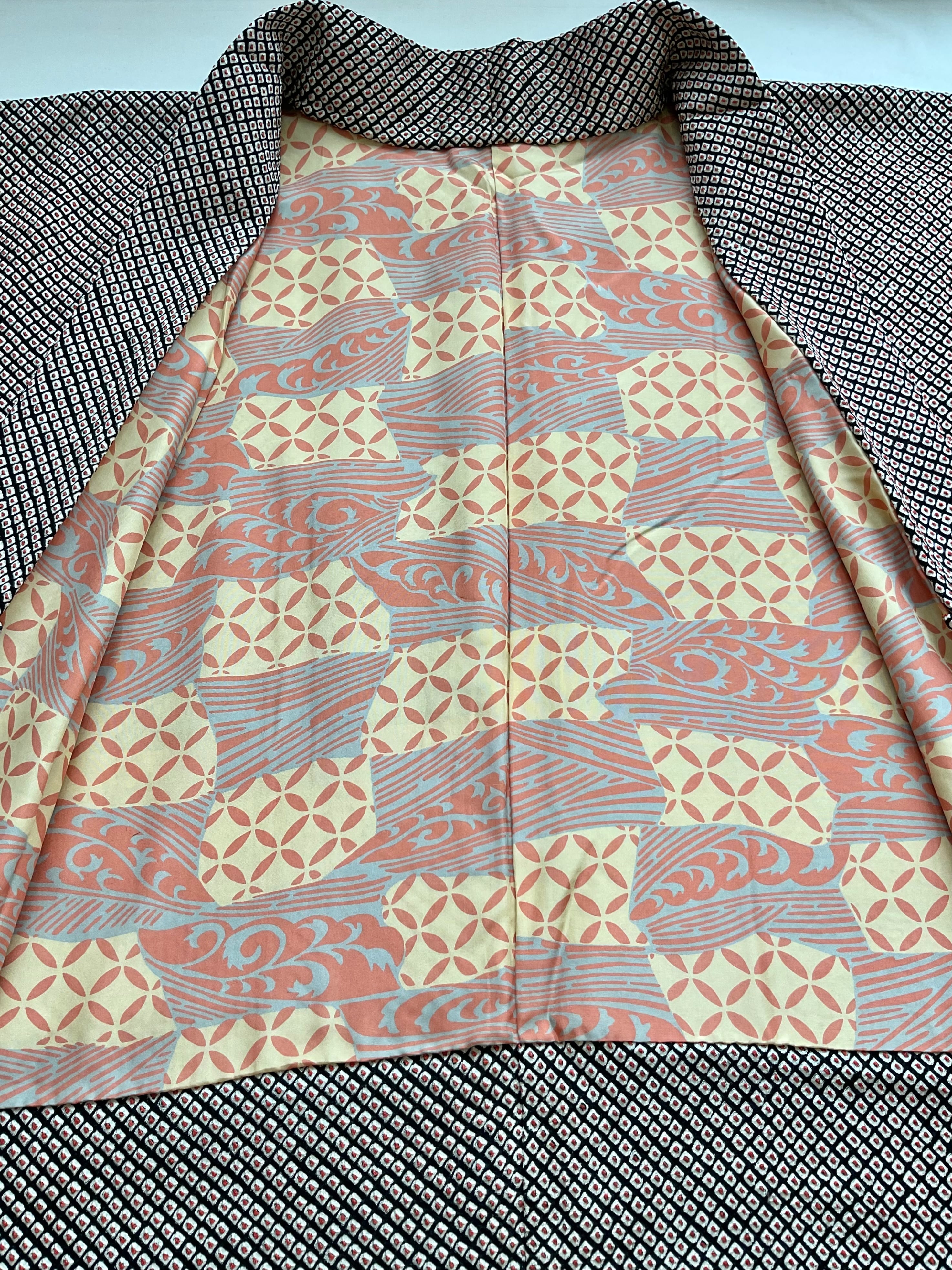 中心の紅いぽっちりが可愛いらしい総鹿の子絞りの羽織です。あたたかみを感じるふっくらとした絞り地、軽い風合いで今から春先までの羽織モノとして重宝しそうです。着物からのお仕立て替え品のため、後ろの衿中心に布継ぎがあります(画像10)