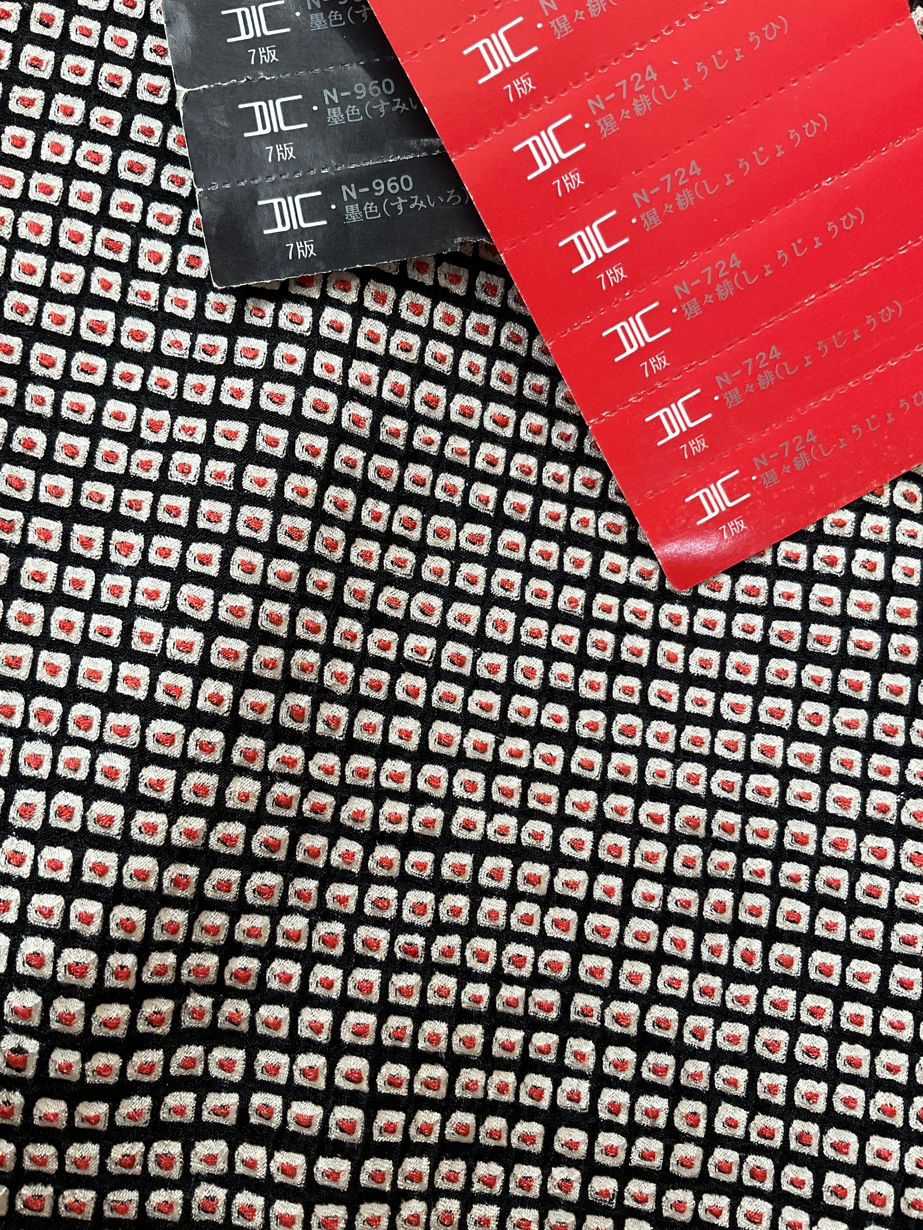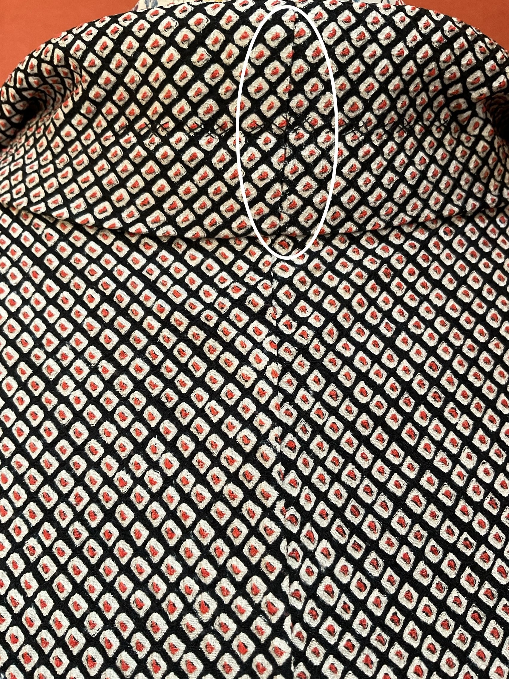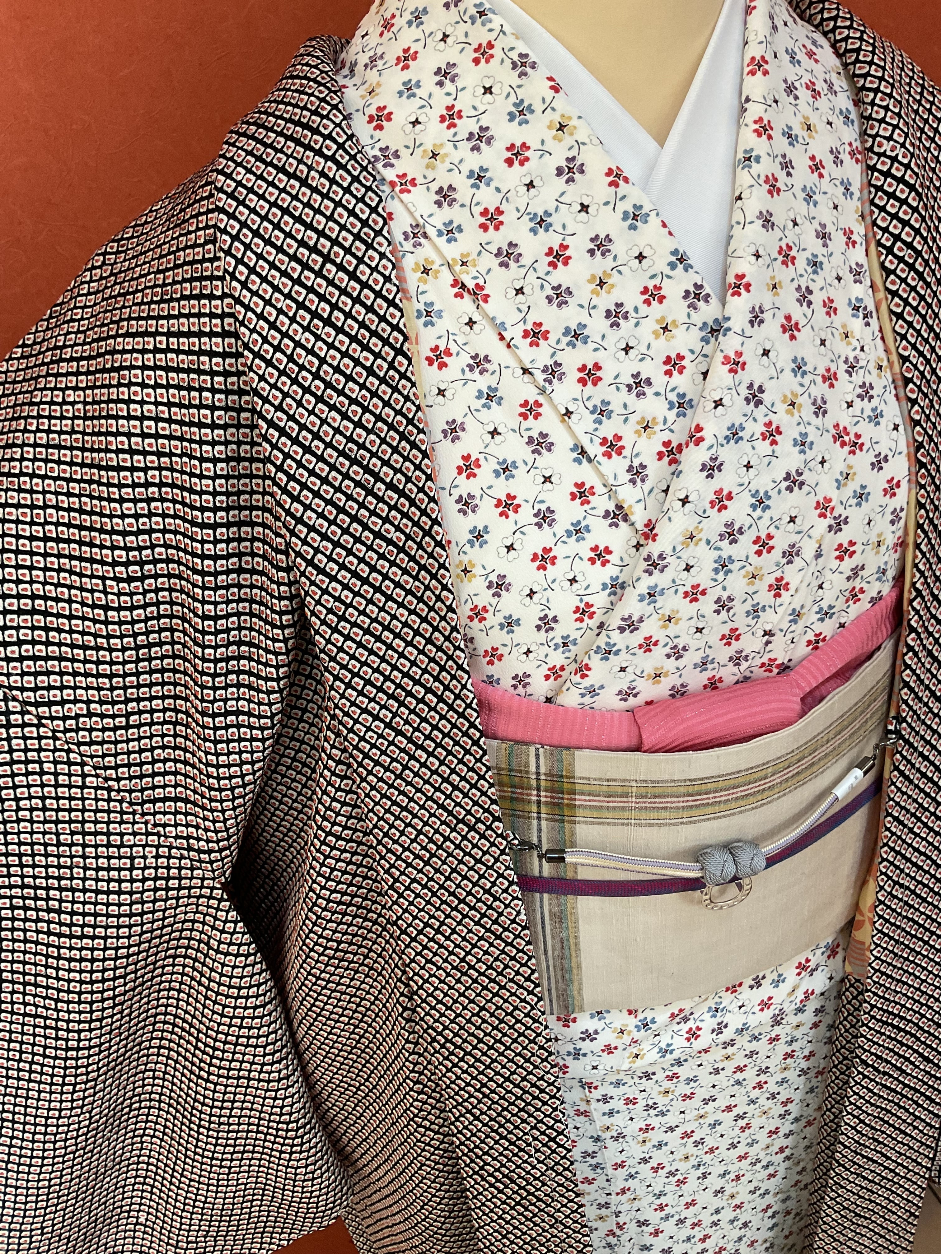中心の紅いぽっちりが可愛いらしい総鹿の子絞りの羽織です。あたたかみを感じるふっくらとした絞り地、軽い風合いで今から春先までの羽織モノとして重宝しそうです。着物からのお仕立て替え品のため、後ろの衿中心に布継ぎがあります(画像10)