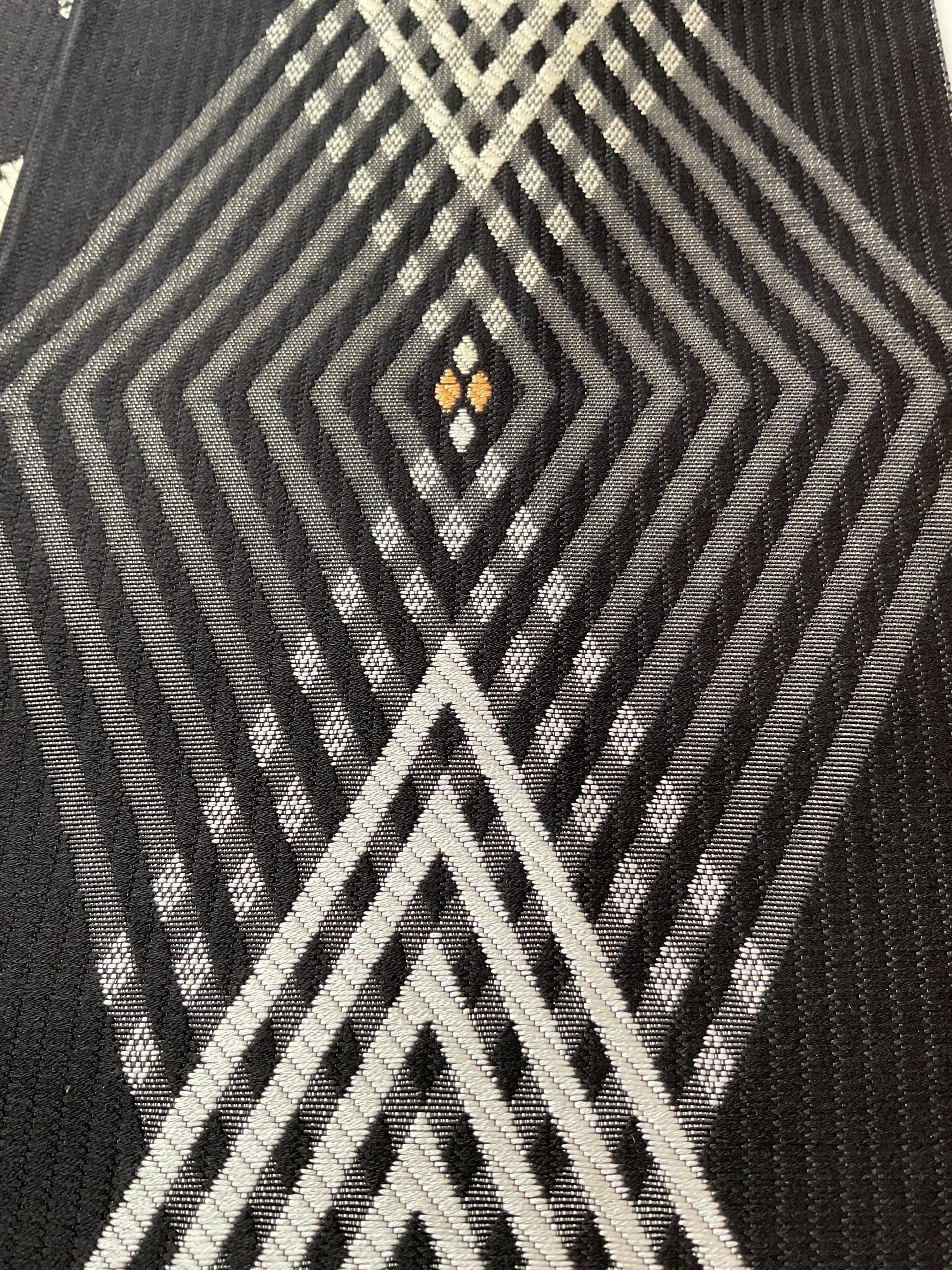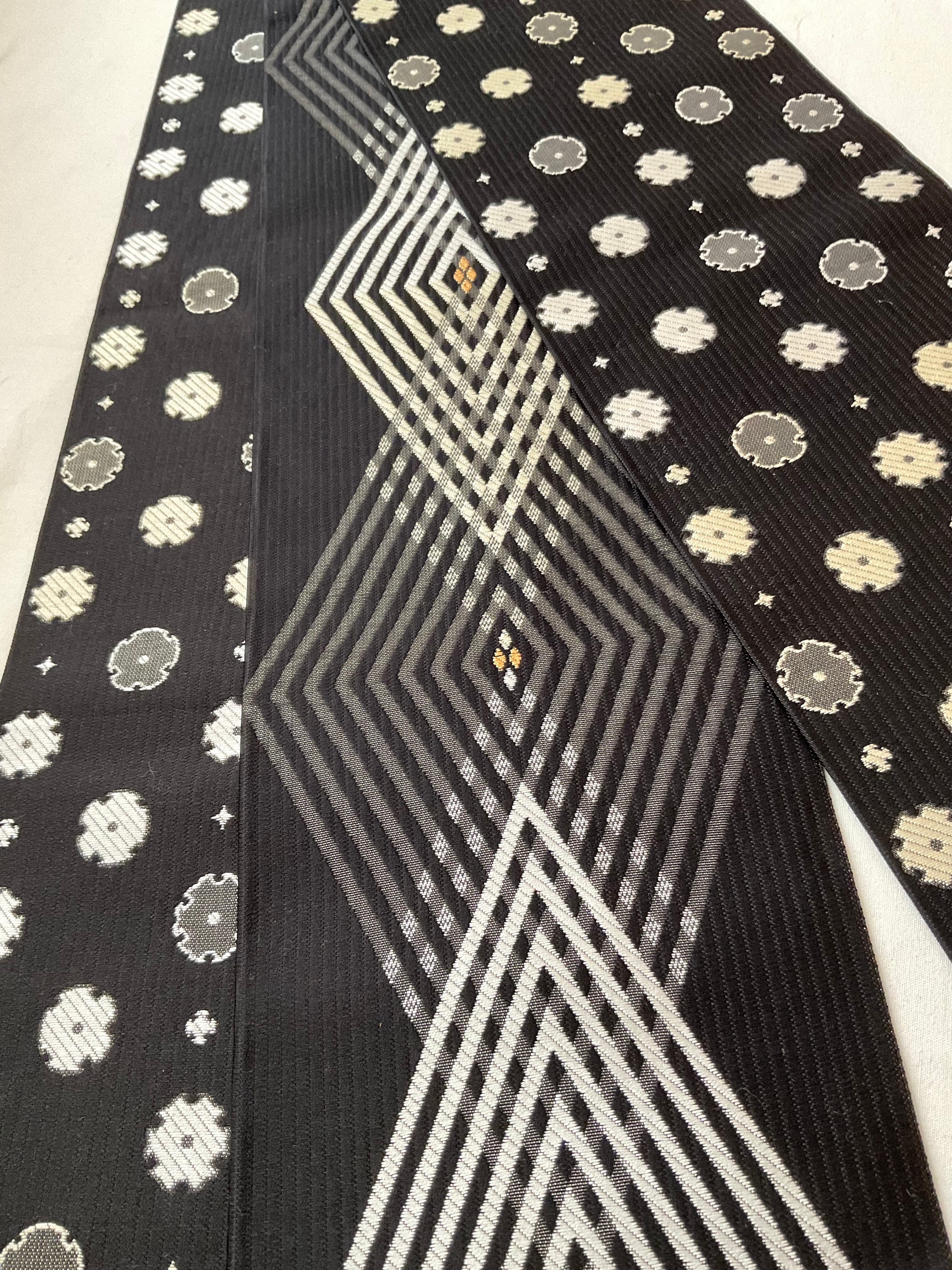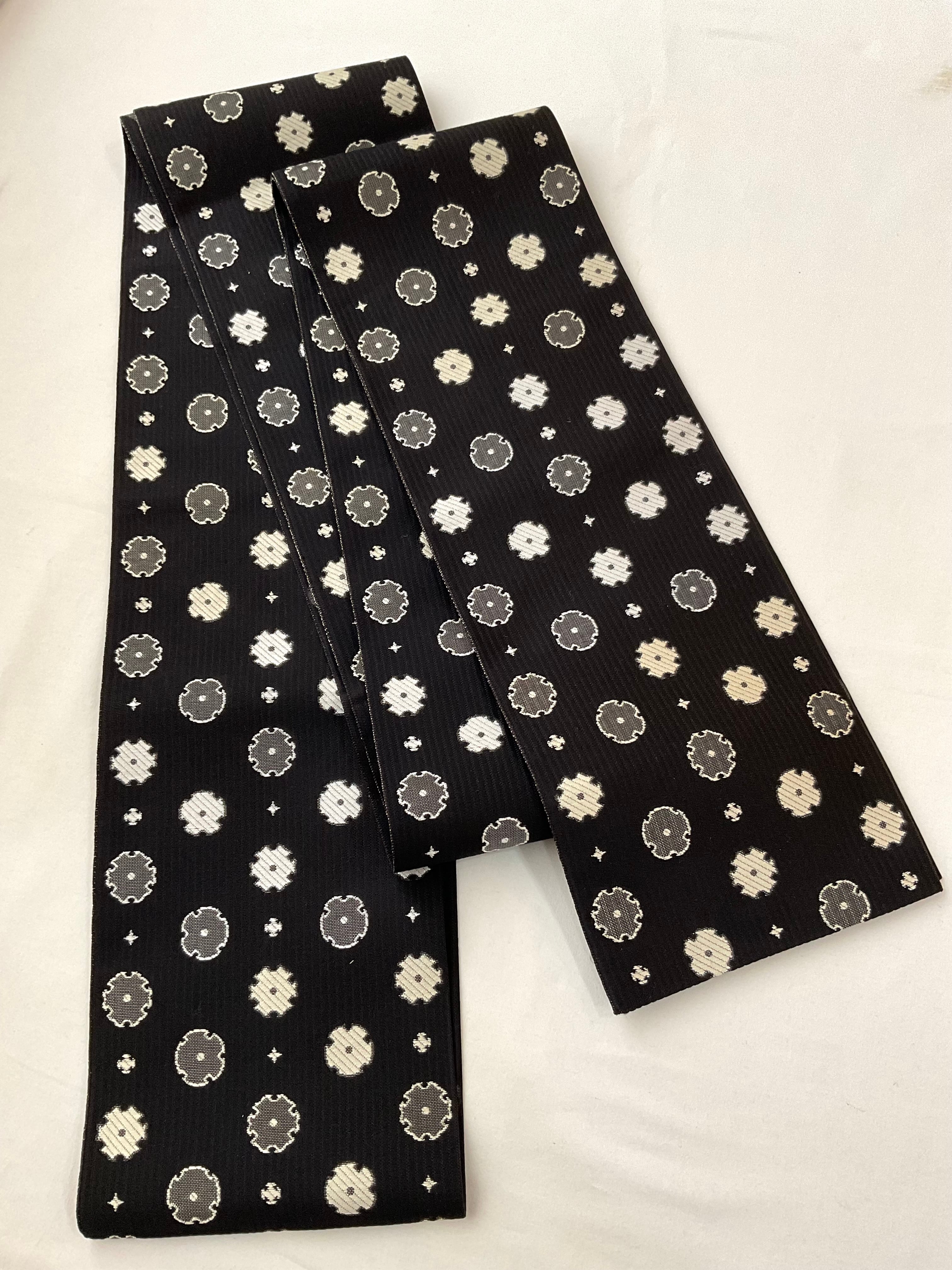 雪輪をお花のように意匠化し並べたお柄と菱文様をモダンに配置したお柄、違った雰囲気を楽しめる両面半巾帯です。しなやかで柔らかく扱いやすい織地、長さも十分にあるので、さまざまなアレンジをお楽しみいただけます。