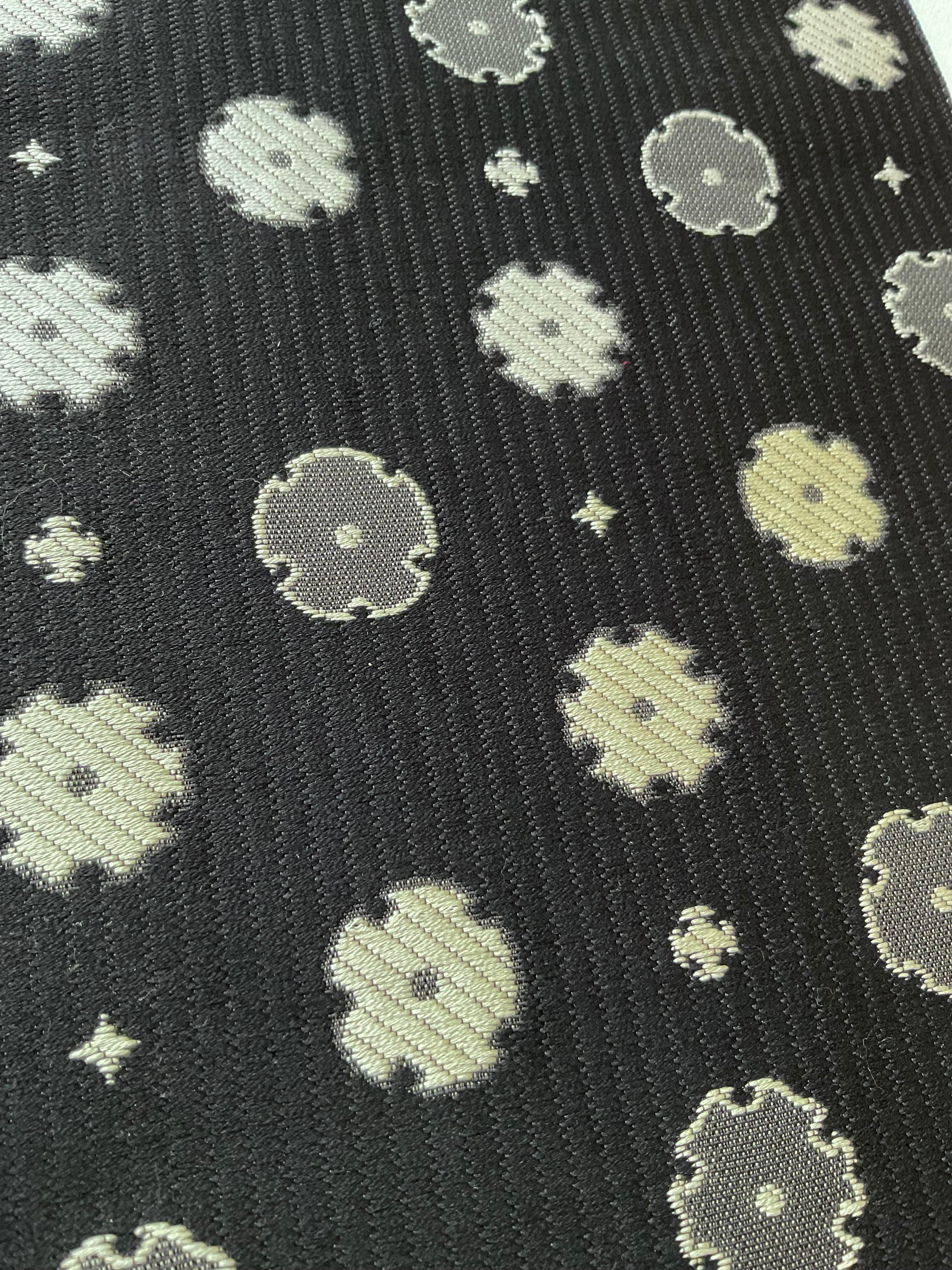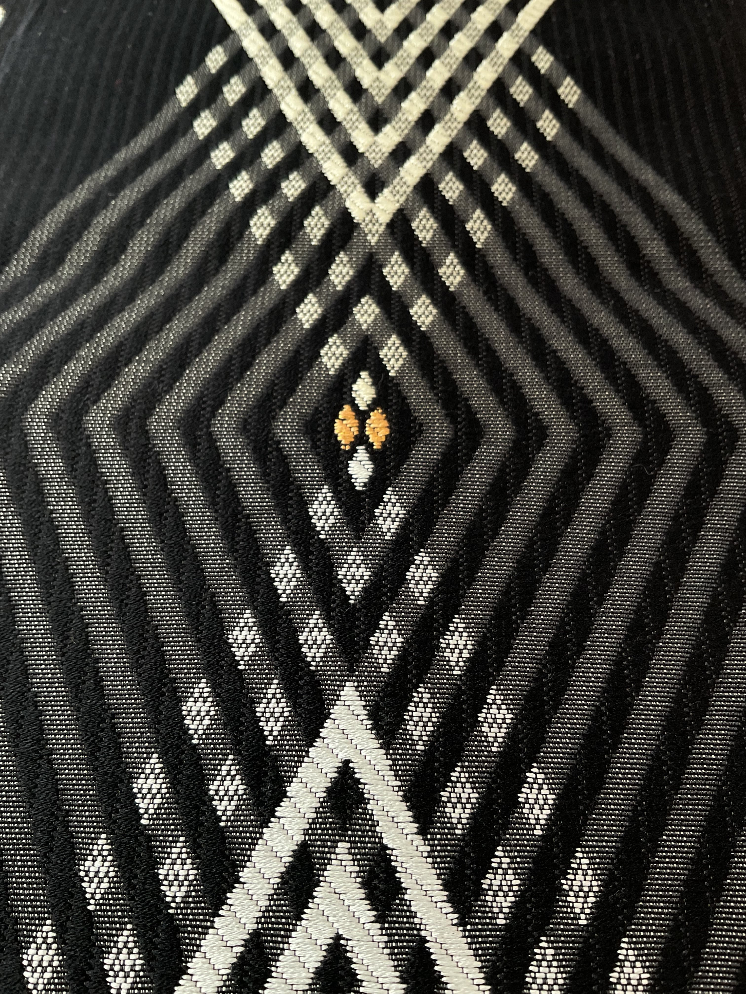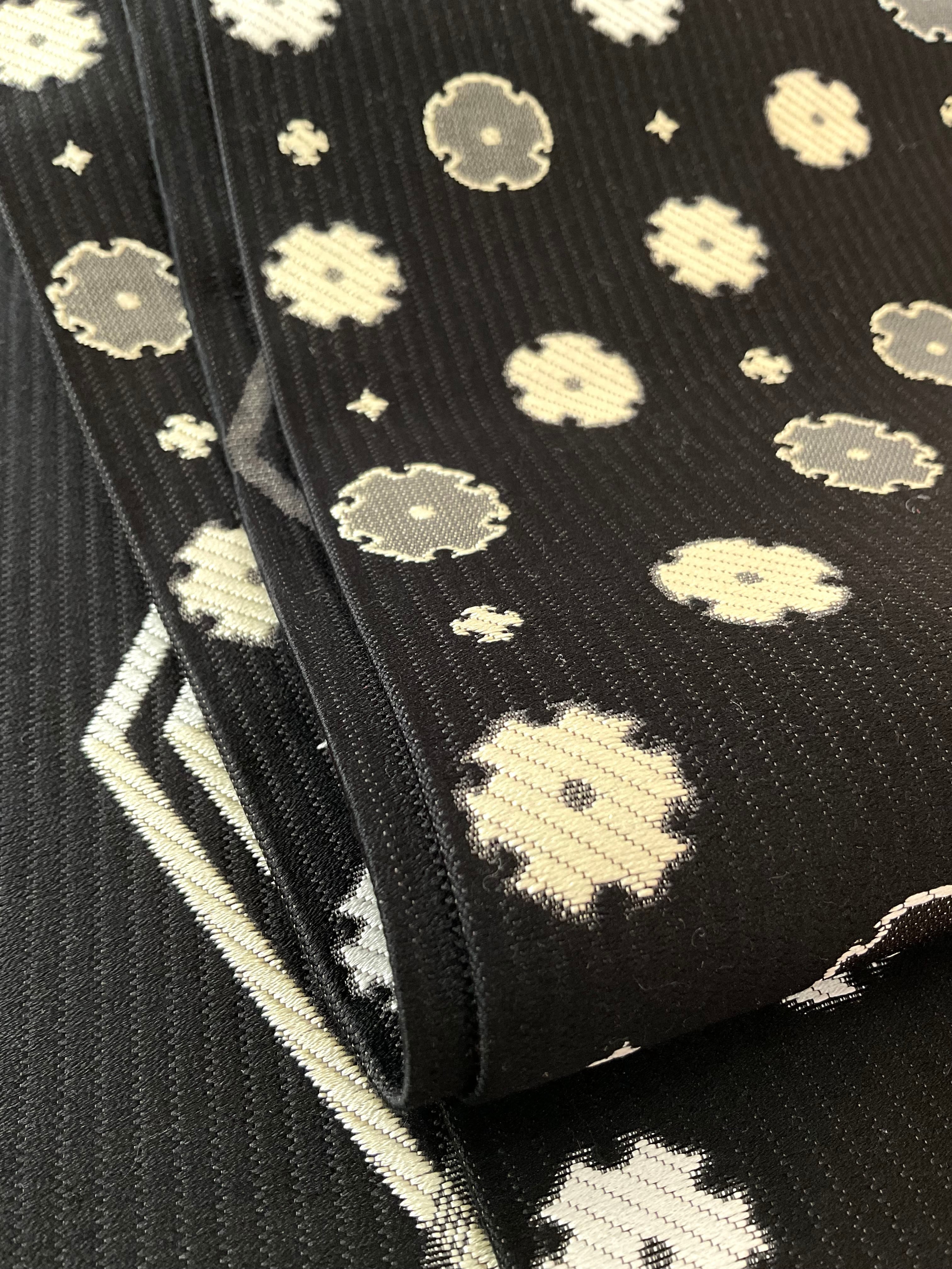 雪輪をお花のように意匠化し並べたお柄と菱文様をモダンに配置したお柄、違った雰囲気を楽しめる両面半巾帯です。しなやかで柔らかく扱いやすい織地、長さも十分にあるので、さまざまなアレンジをお楽しみいただけます。