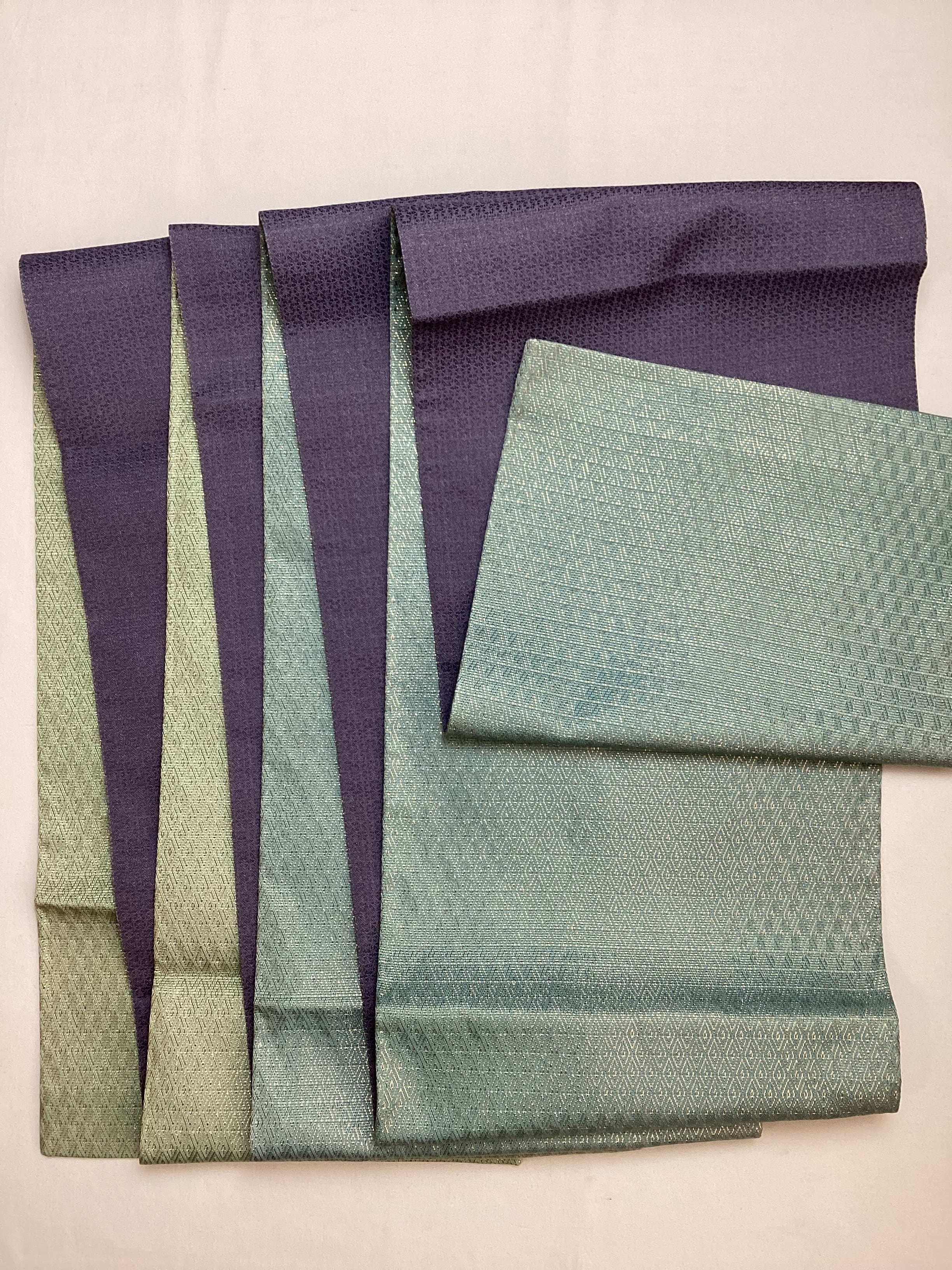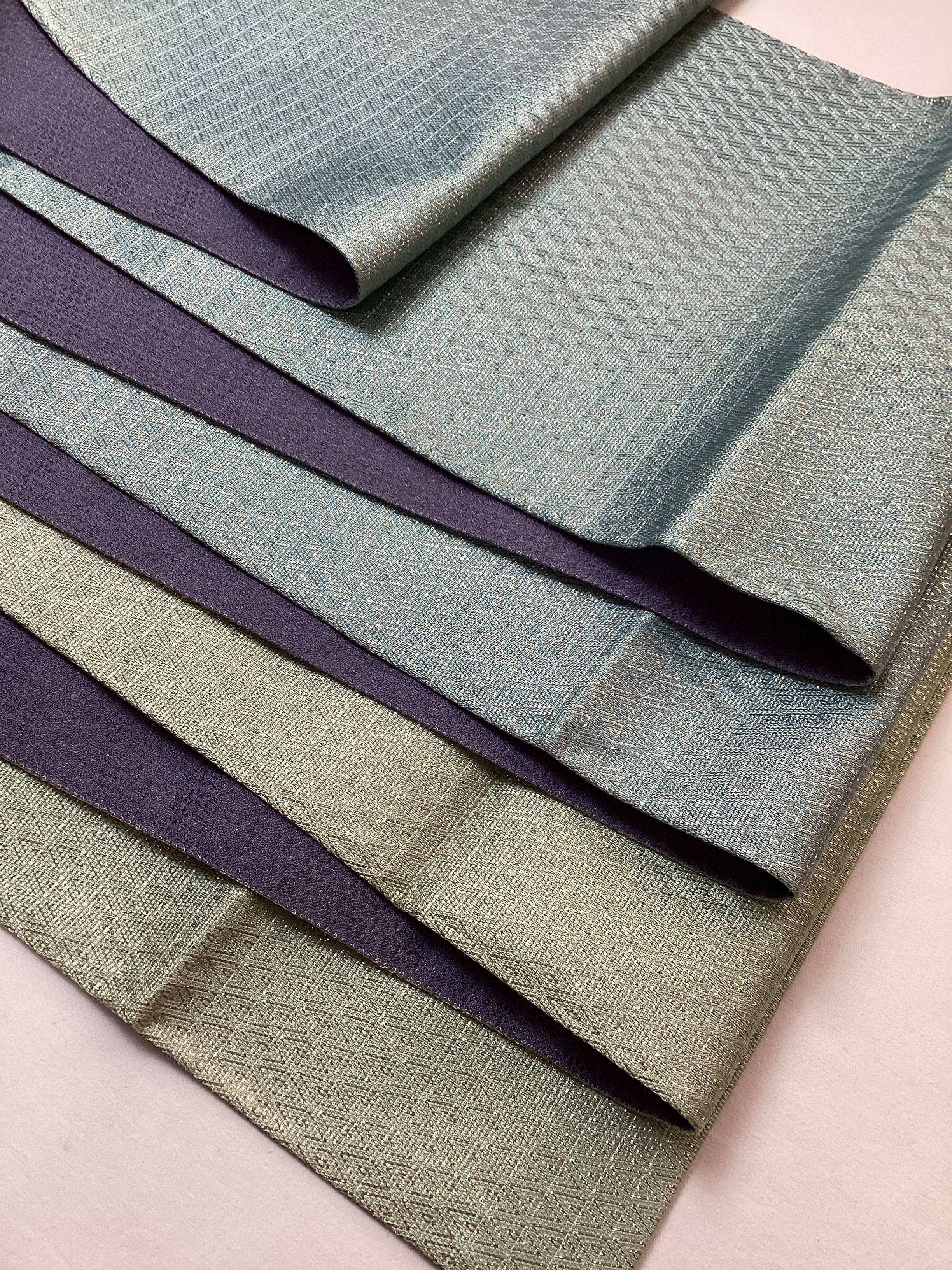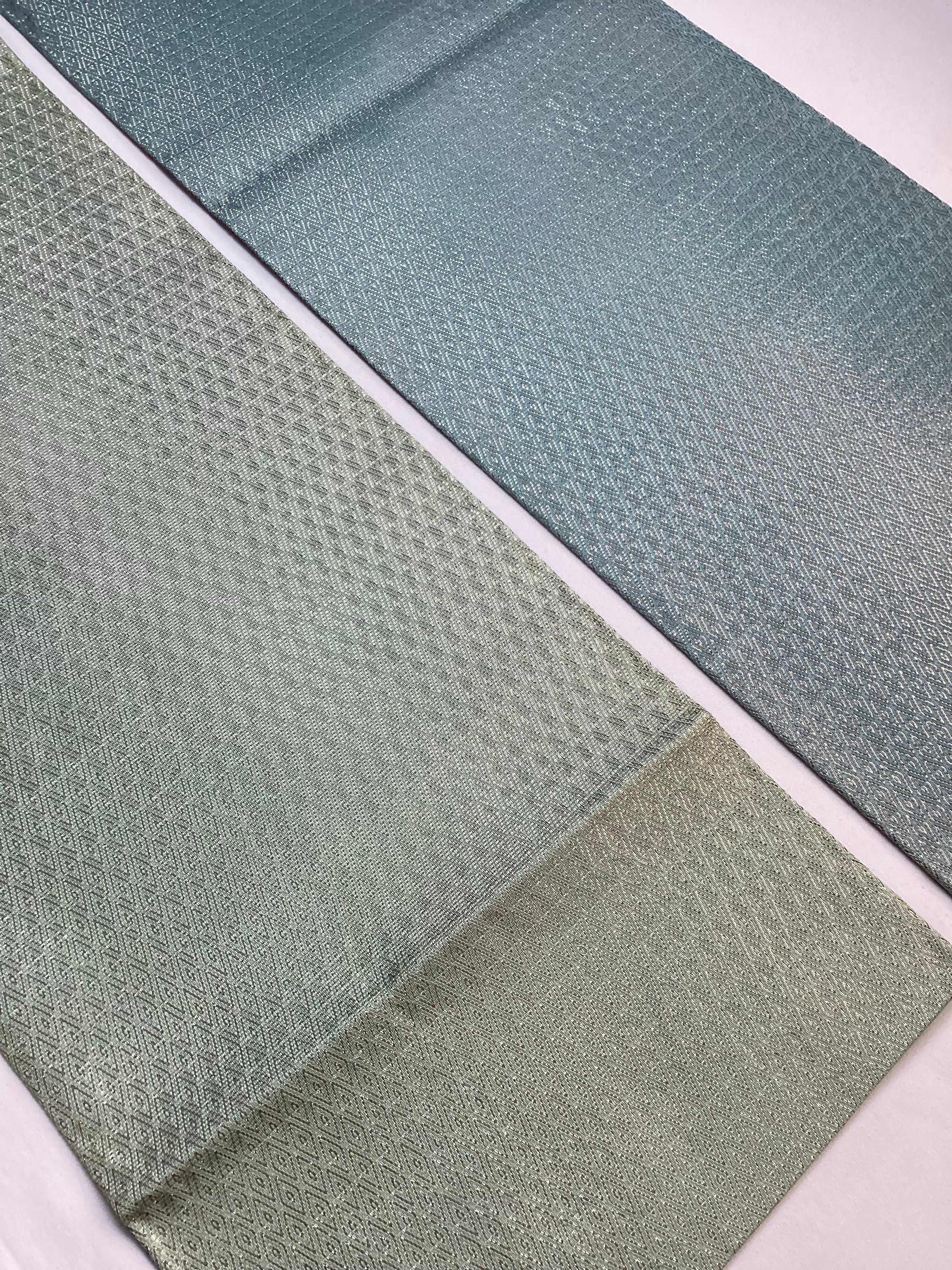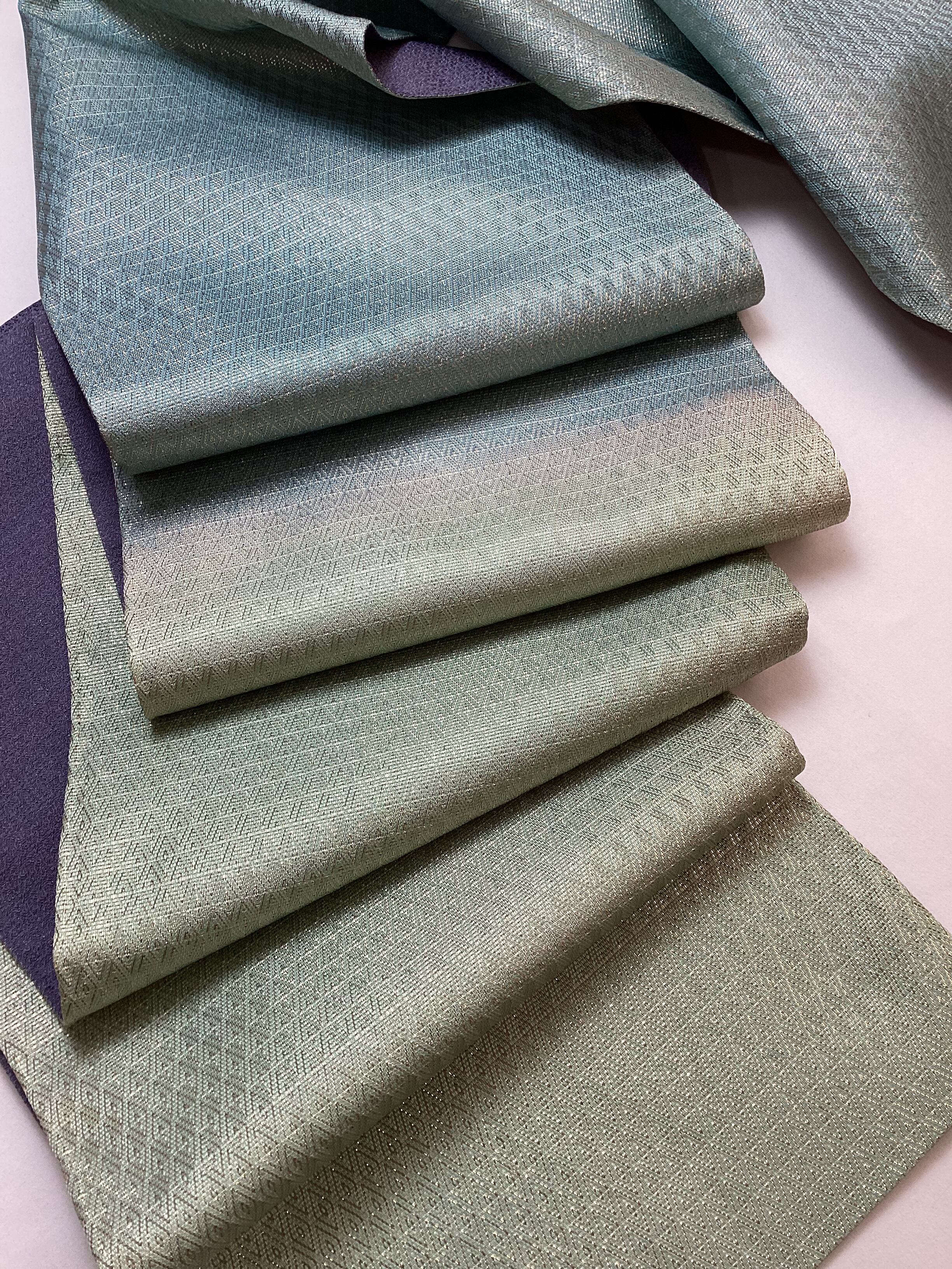 オタイコになるタレ先は裏葉色(グレイッシュグリーン)、前柄あたりで色が切り替わり、手先に向かって錆浅葱色(グレイッシュブルーグリーン)に配色された洒落袋帯です。金糸で細かい菱文様が織り込まれているので、キラキラと華やかさがございます。裏地の紫色とのコントラストにも洒落味がございます。芯無しか薄手の帯芯のようで、大変柔らかな風合いです。