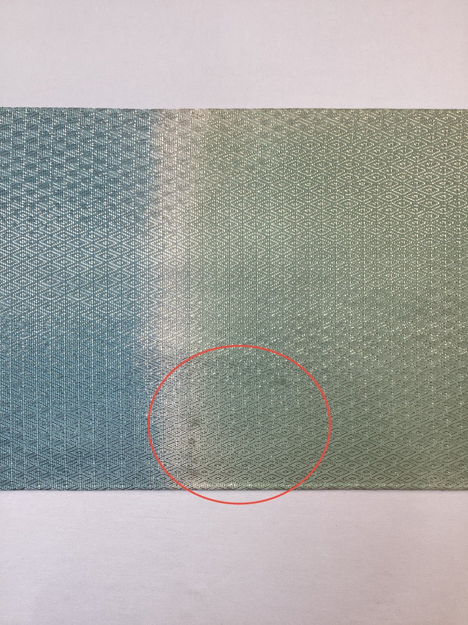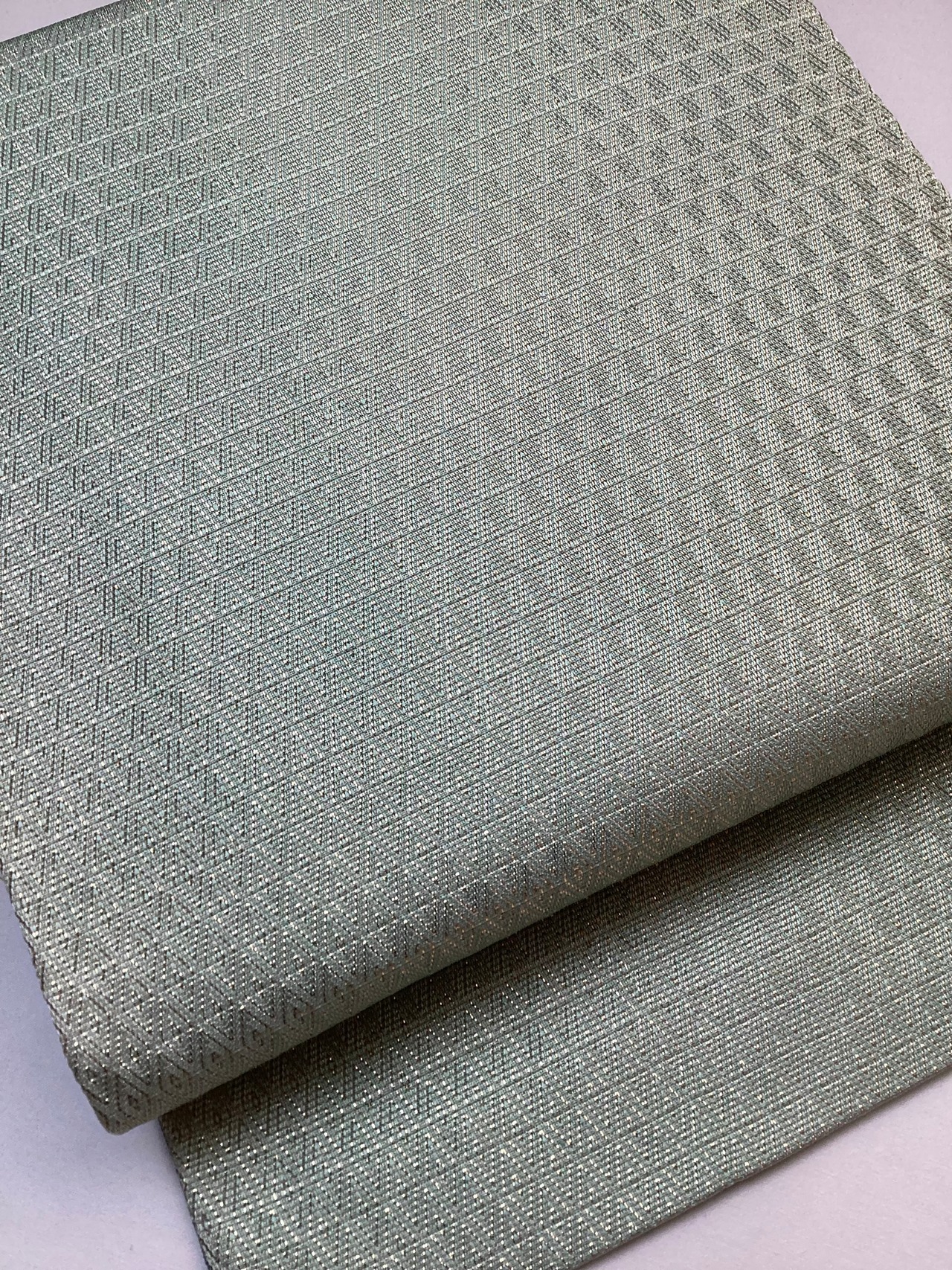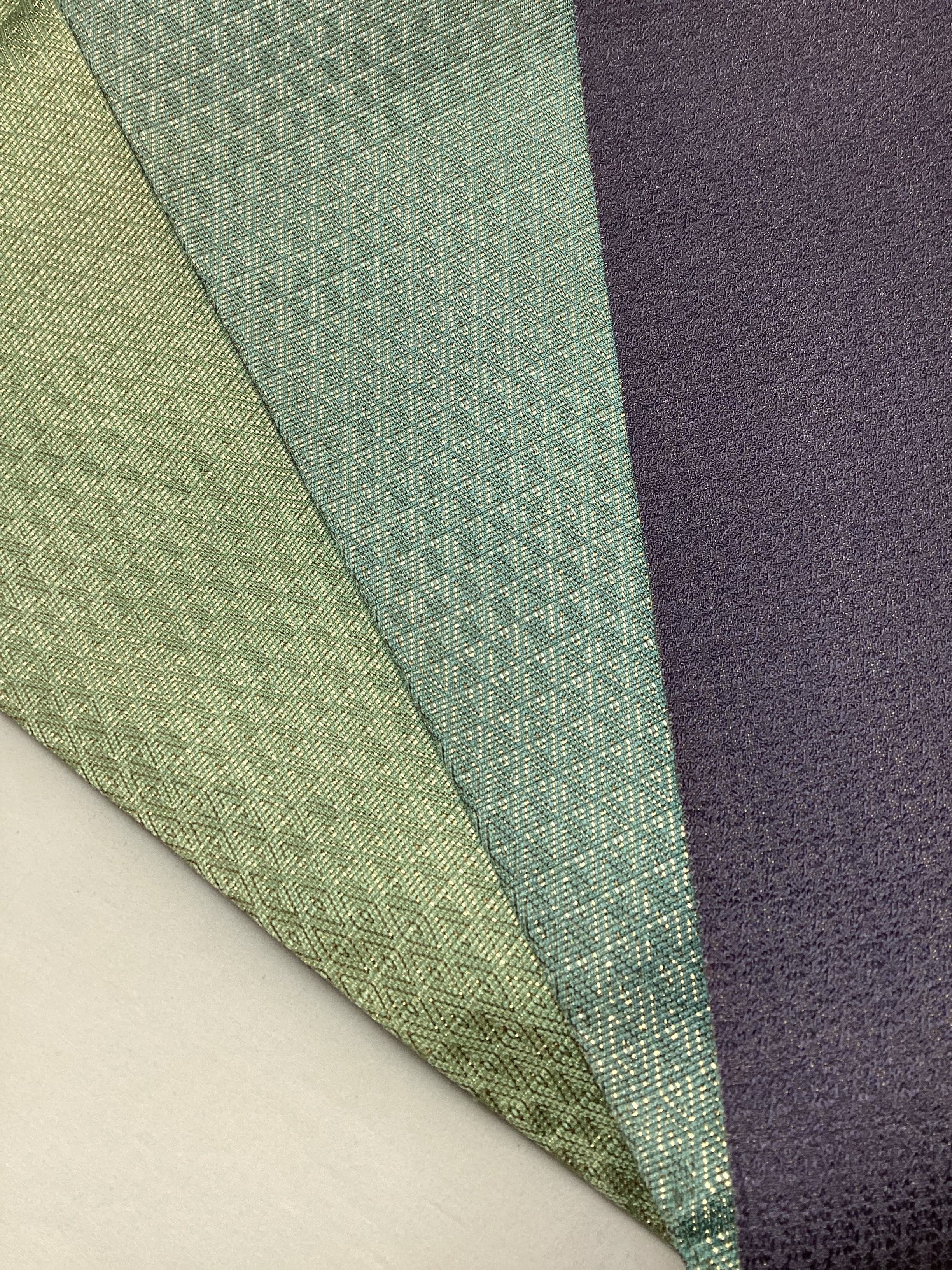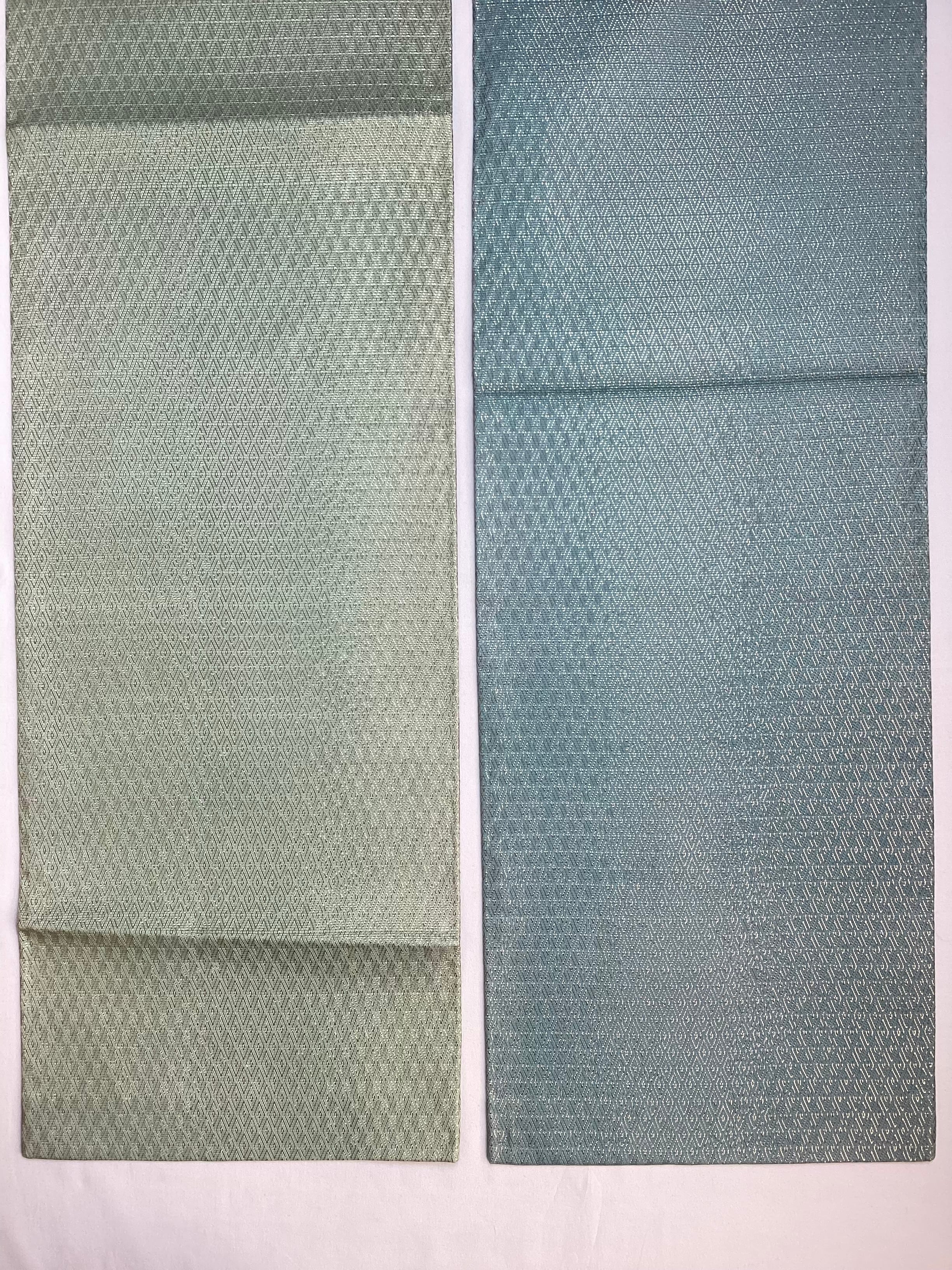 オタイコになるタレ先は裏葉色(グレイッシュグリーン)、前柄あたりで色が切り替わり、手先に向かって錆浅葱色(グレイッシュブルーグリーン)に配色された洒落袋帯です。金糸で細かい菱文様が織り込まれているので、キラキラと華やかさがございます。裏地の紫色とのコントラストにも洒落味がございます。芯無しか薄手の帯芯のようで、大変柔らかな風合いです。