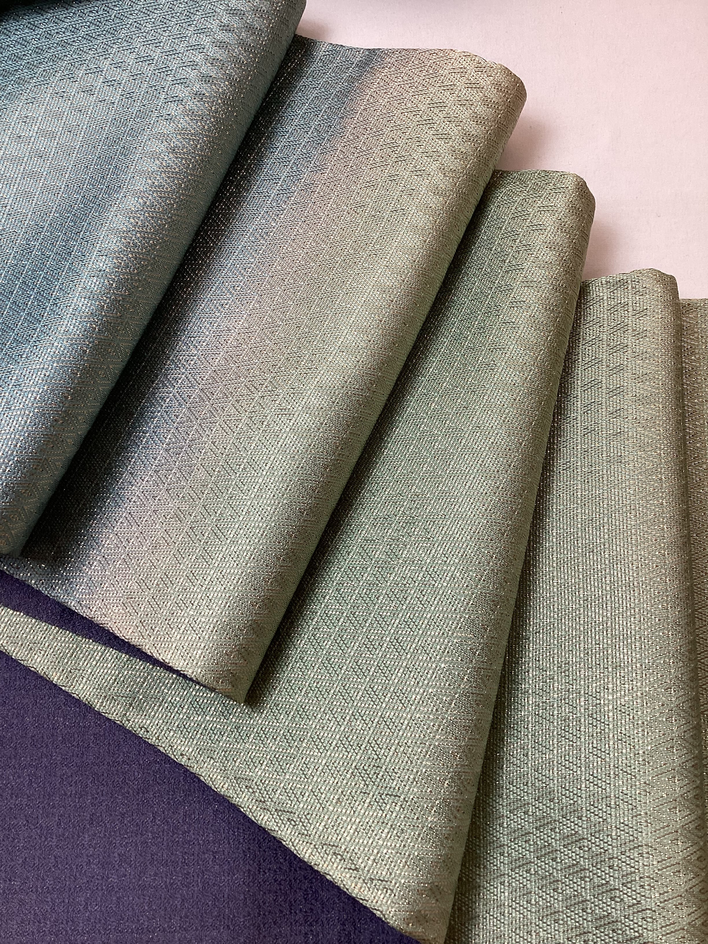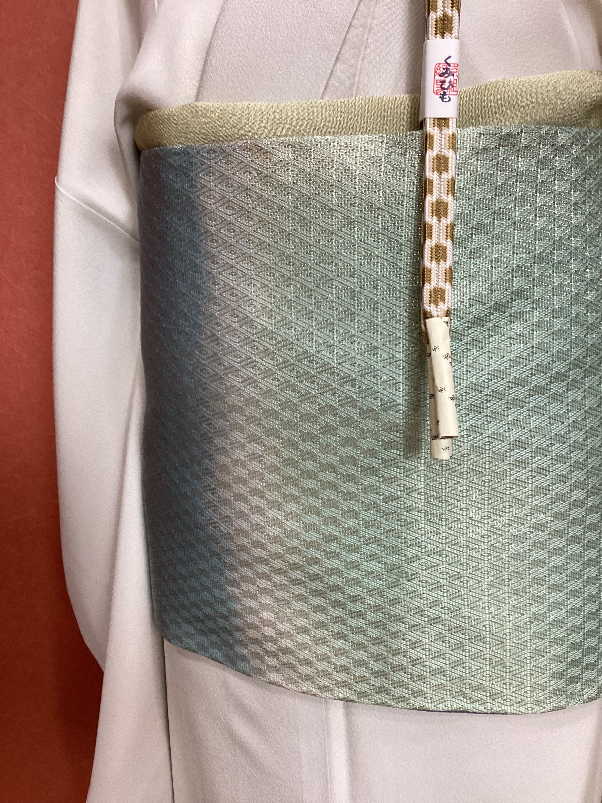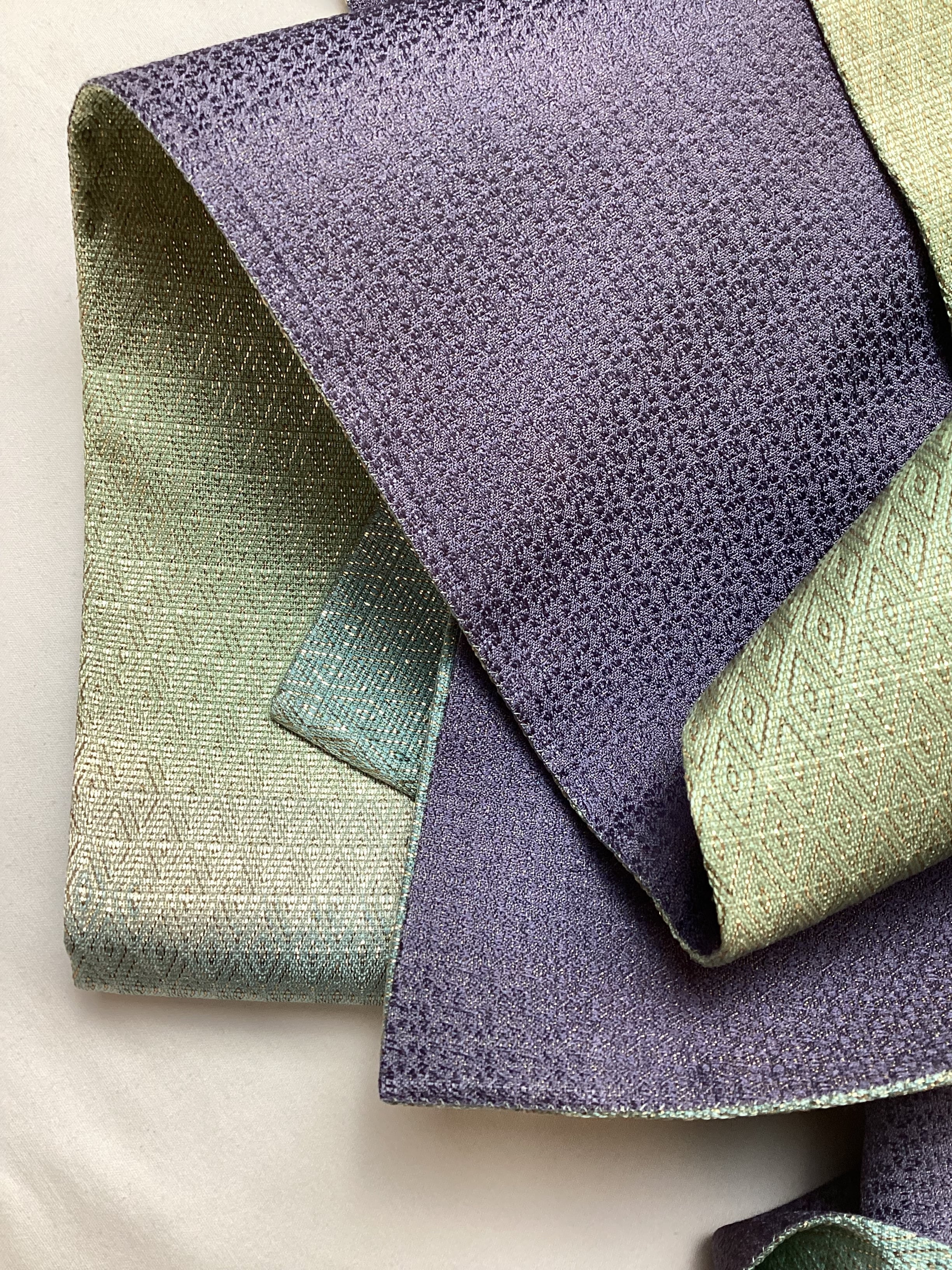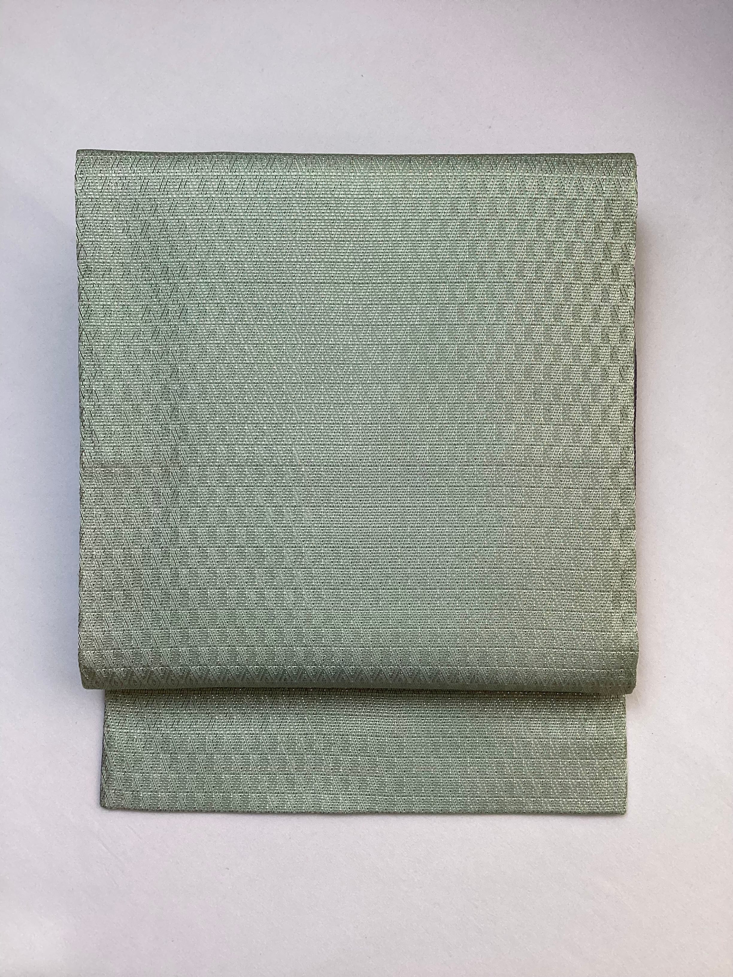 オタイコになるタレ先は裏葉色(グレイッシュグリーン)、前柄あたりで色が切り替わり、手先に向かって錆浅葱色(グレイッシュブルーグリーン)に配色された洒落袋帯です。金糸で細かい菱文様が織り込まれているので、キラキラと華やかさがございます。裏地の紫色とのコントラストにも洒落味がございます。芯無しか薄手の帯芯のようで、大変柔らかな風合いです。