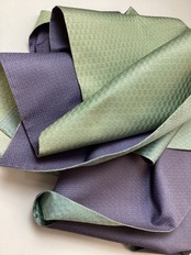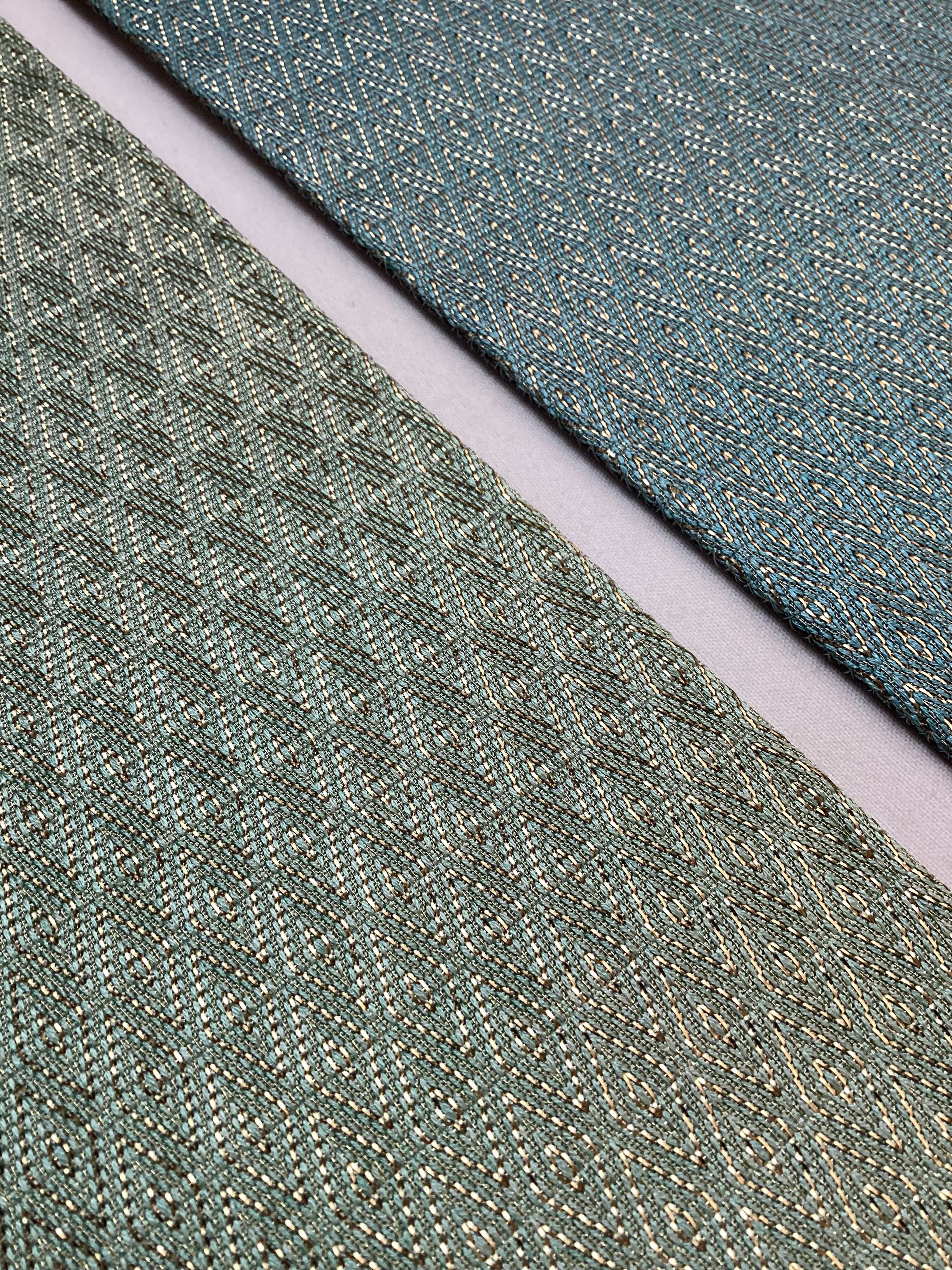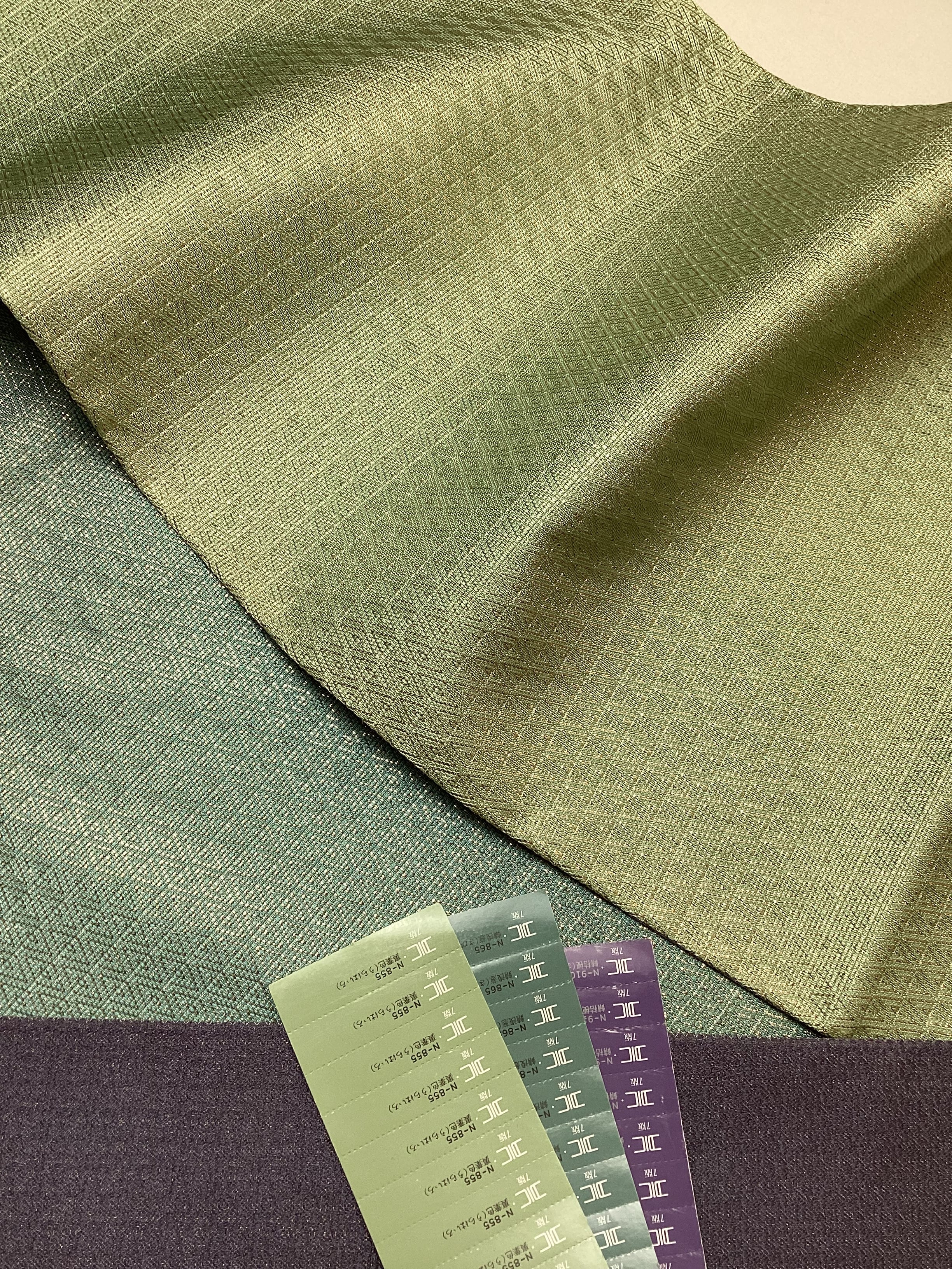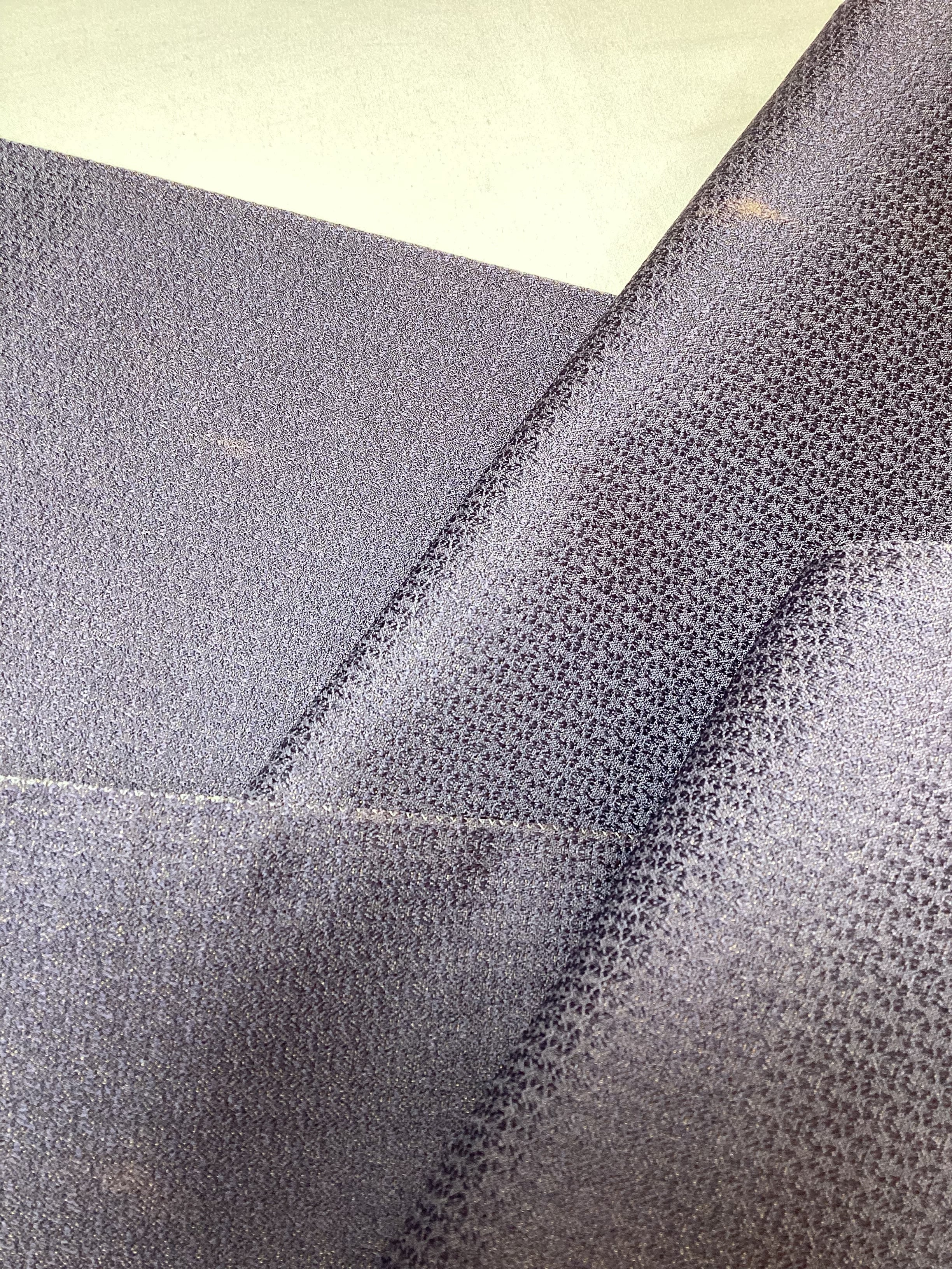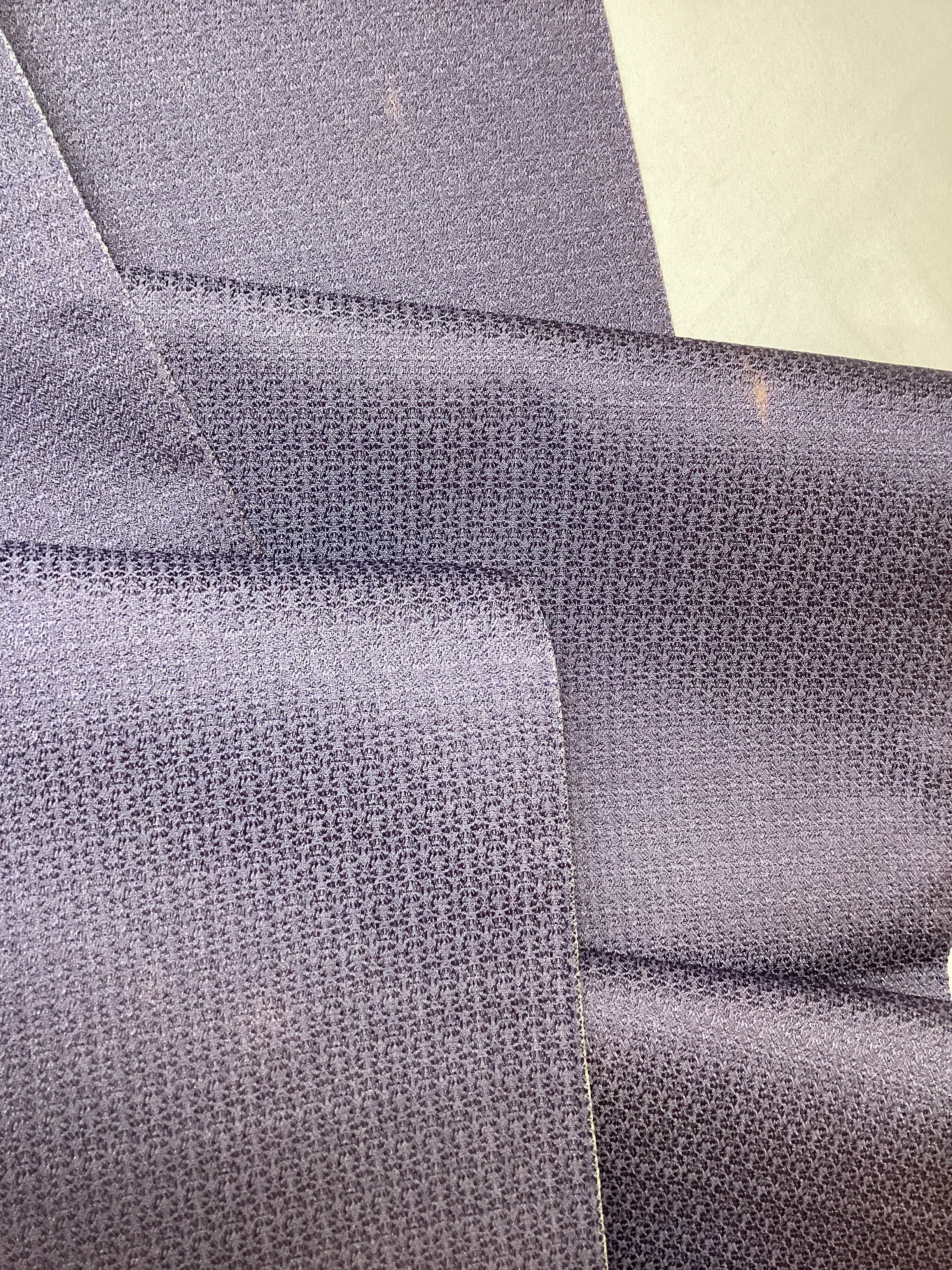 オタイコになるタレ先は裏葉色(グレイッシュグリーン)、前柄あたりで色が切り替わり、手先に向かって錆浅葱色(グレイッシュブルーグリーン)に配色された洒落袋帯です。金糸で細かい菱文様が織り込まれているので、キラキラと華やかさがございます。裏地の紫色とのコントラストにも洒落味がございます。芯無しか薄手の帯芯のようで、大変柔らかな風合いです。