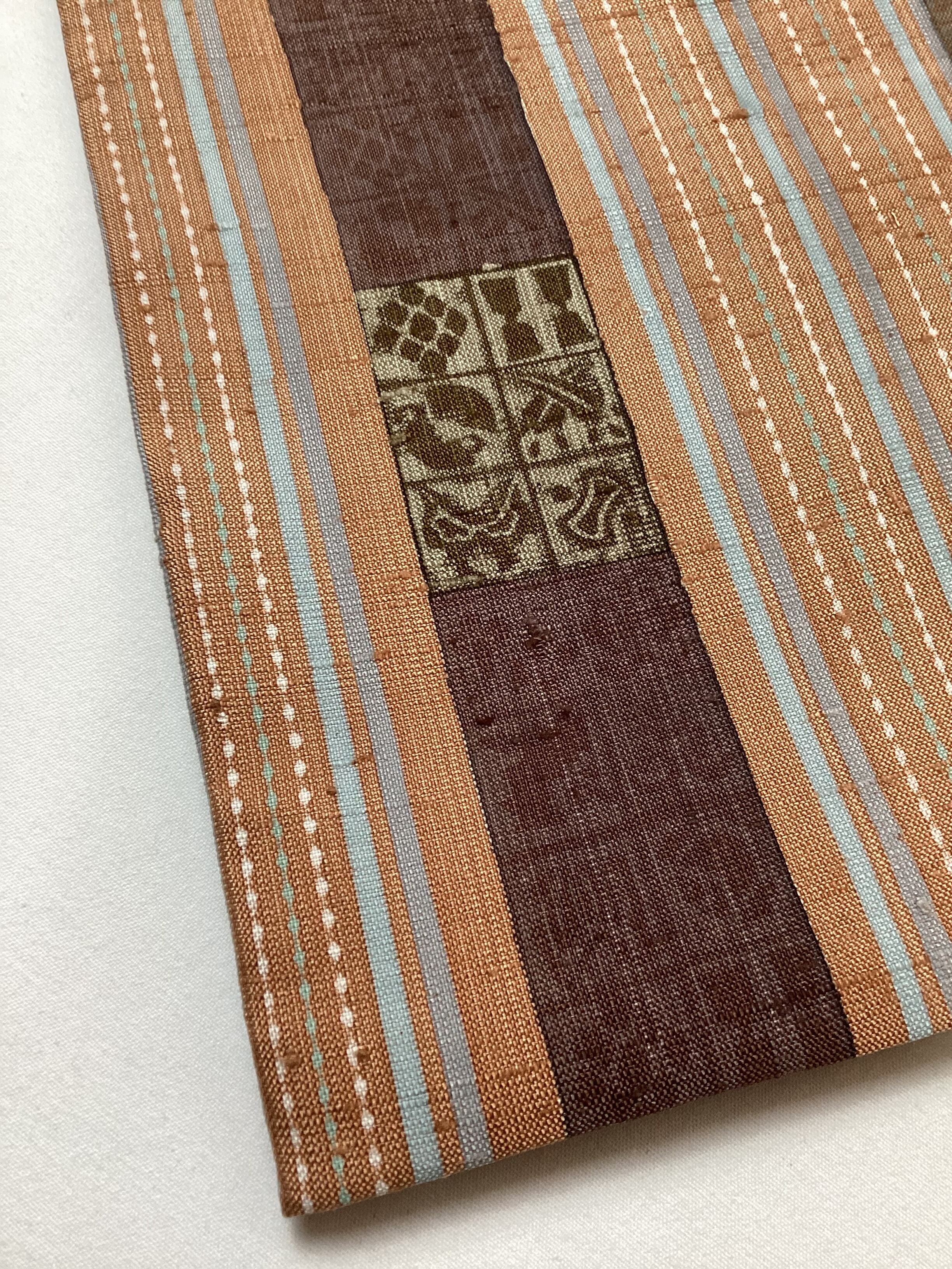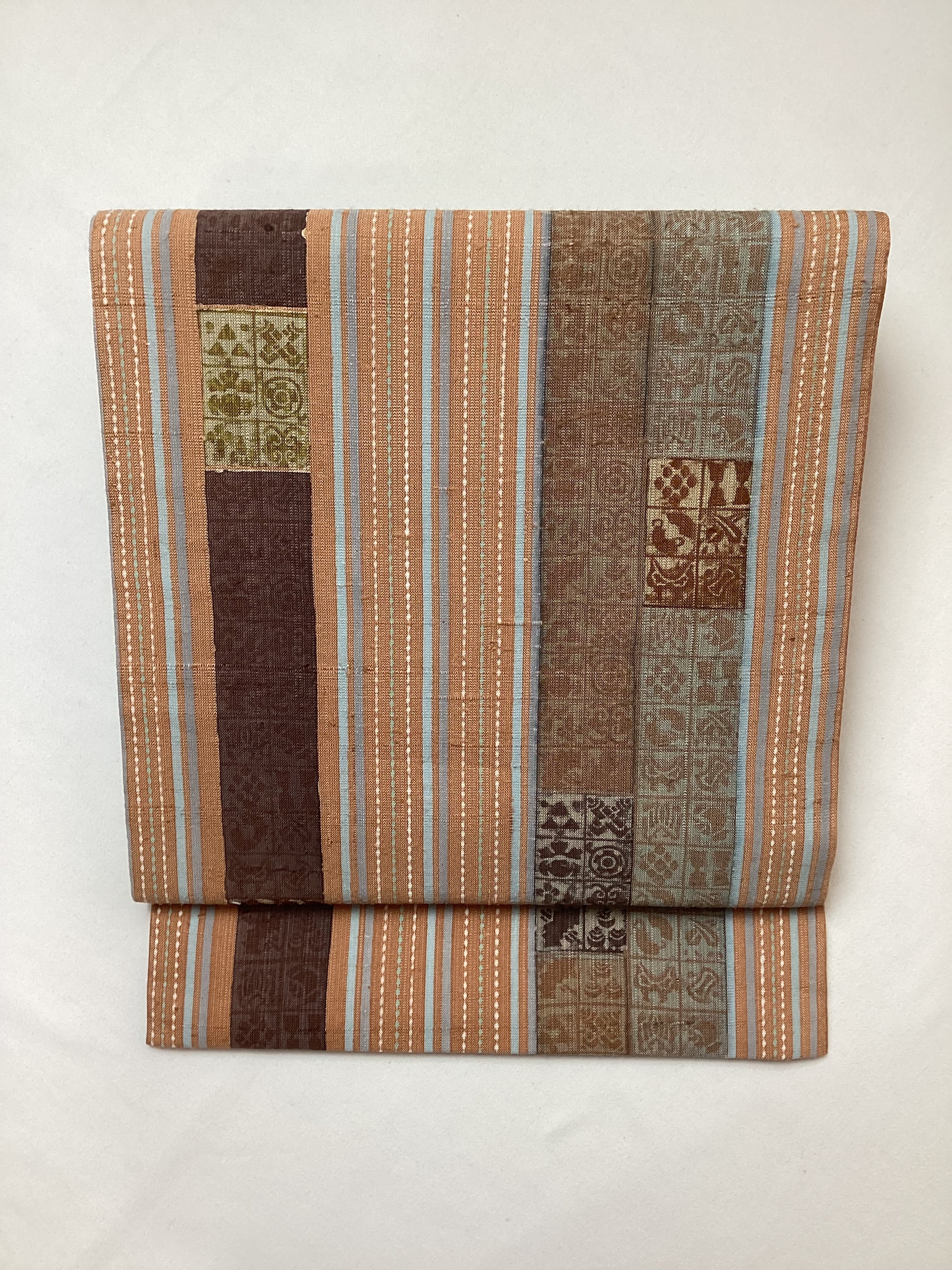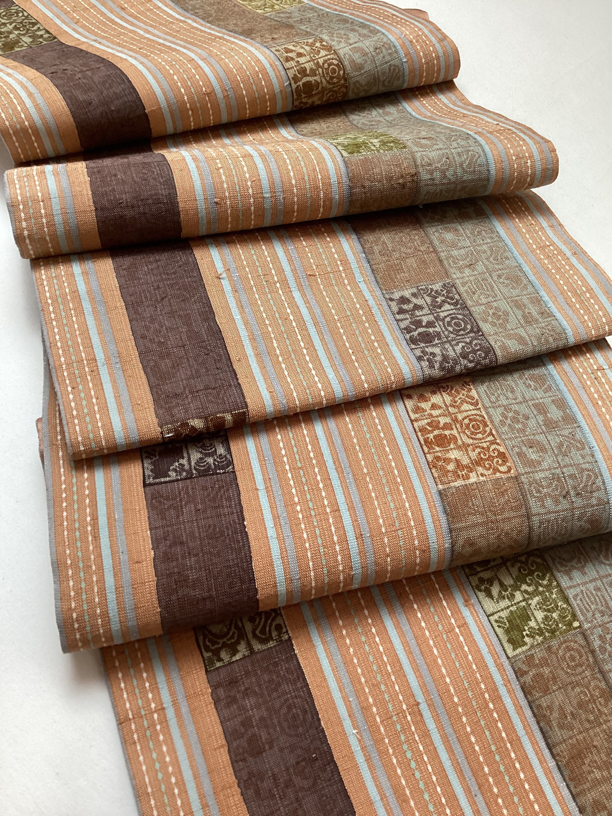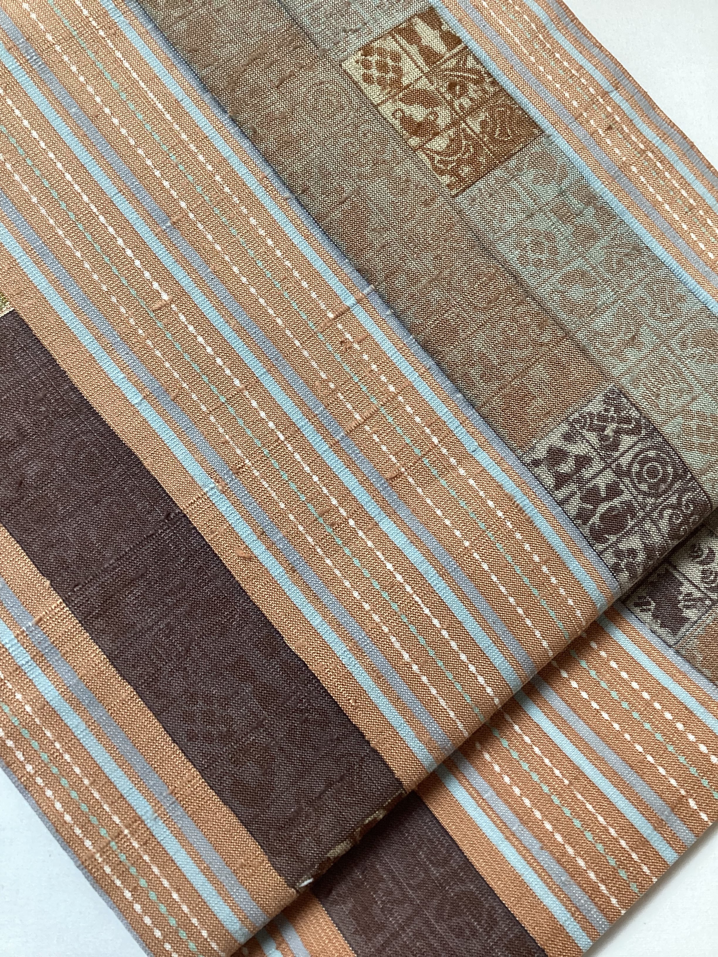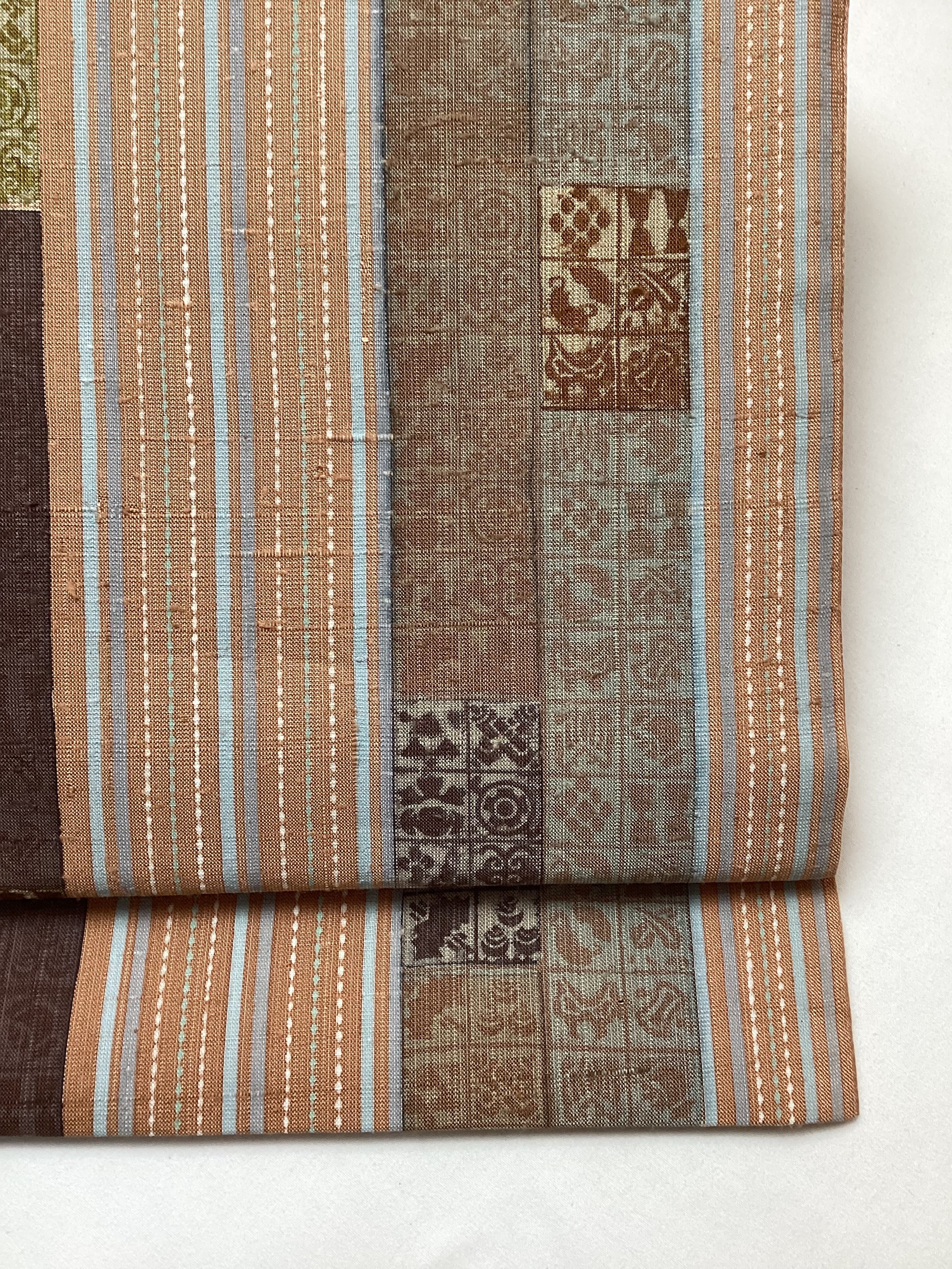 肉桂色(赤みを帯びたライトブラウン)に水色や青磁色のスッキリとした縦ラインがアクセントとなり、木版で押された様々な宝の文様や吉祥の文様が味わいのあるカジュアルな洒落袋帯です。紬のお着物に馴染むお色目で重宝に締めていただけるかと思います。全通柄で贅沢に柄付けされており、着物ビギナーさんにも柄出しに迷わずに結んでいただける紬の袋帯です。