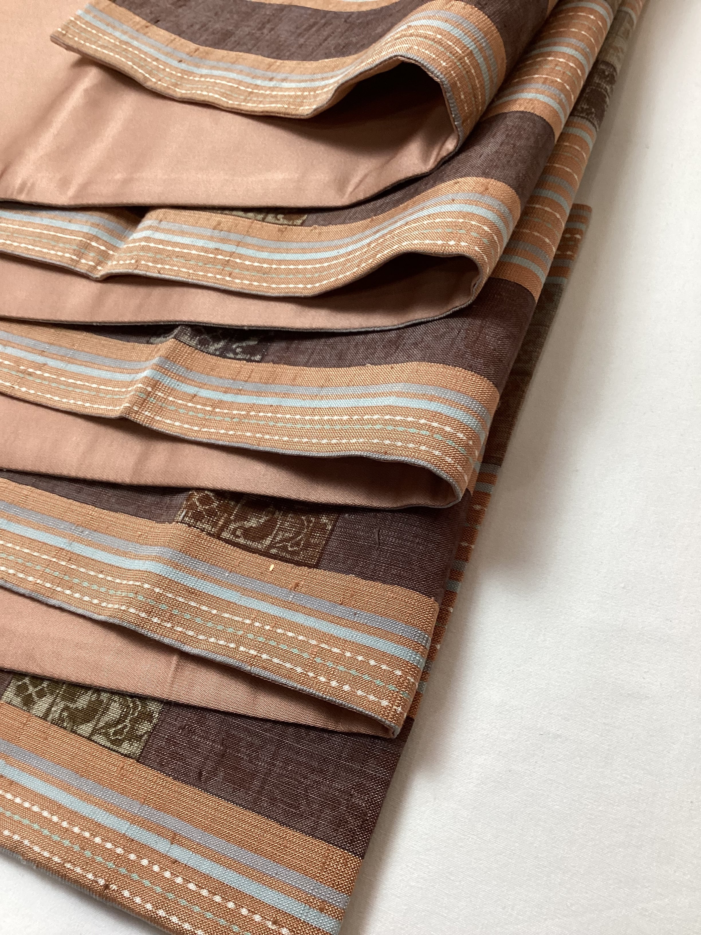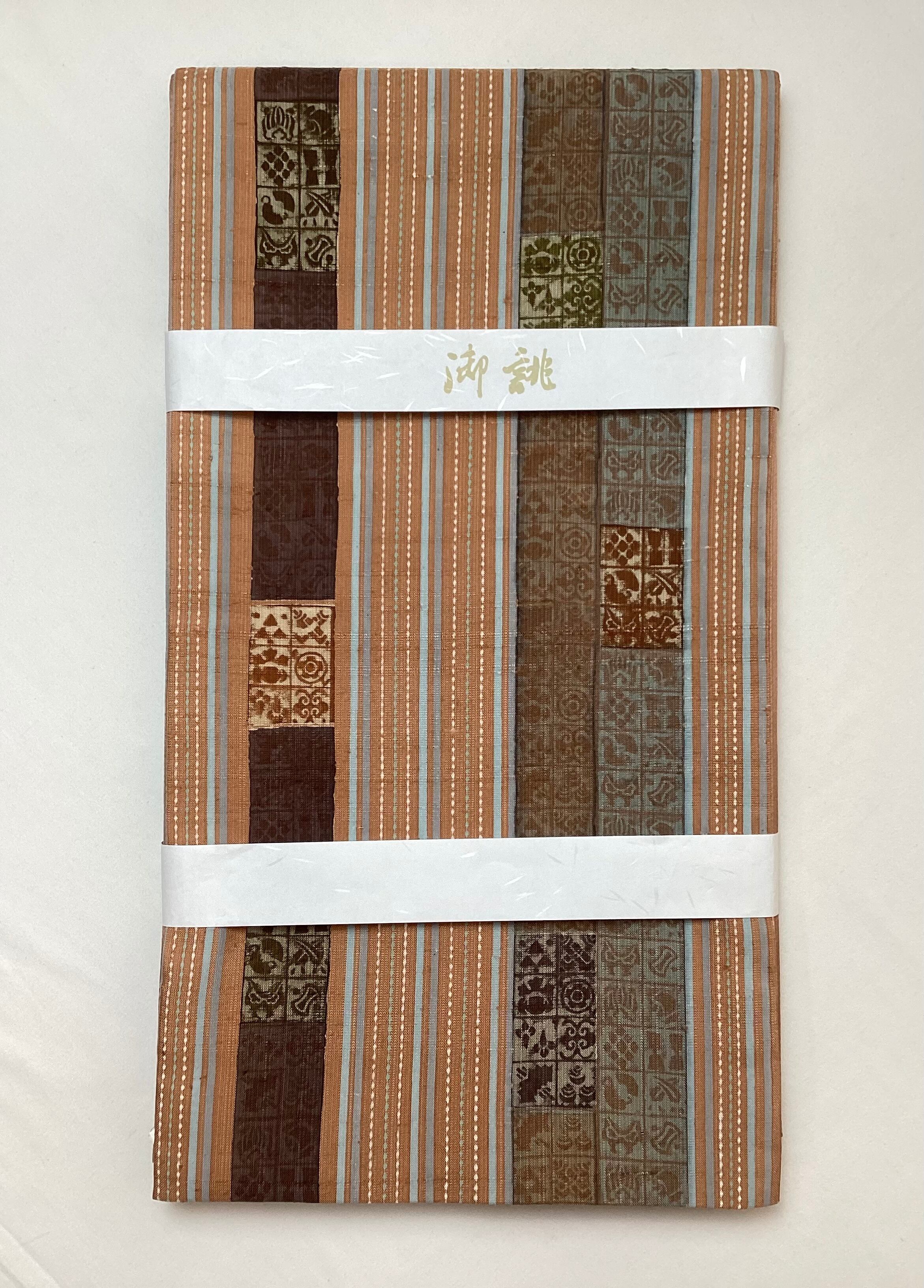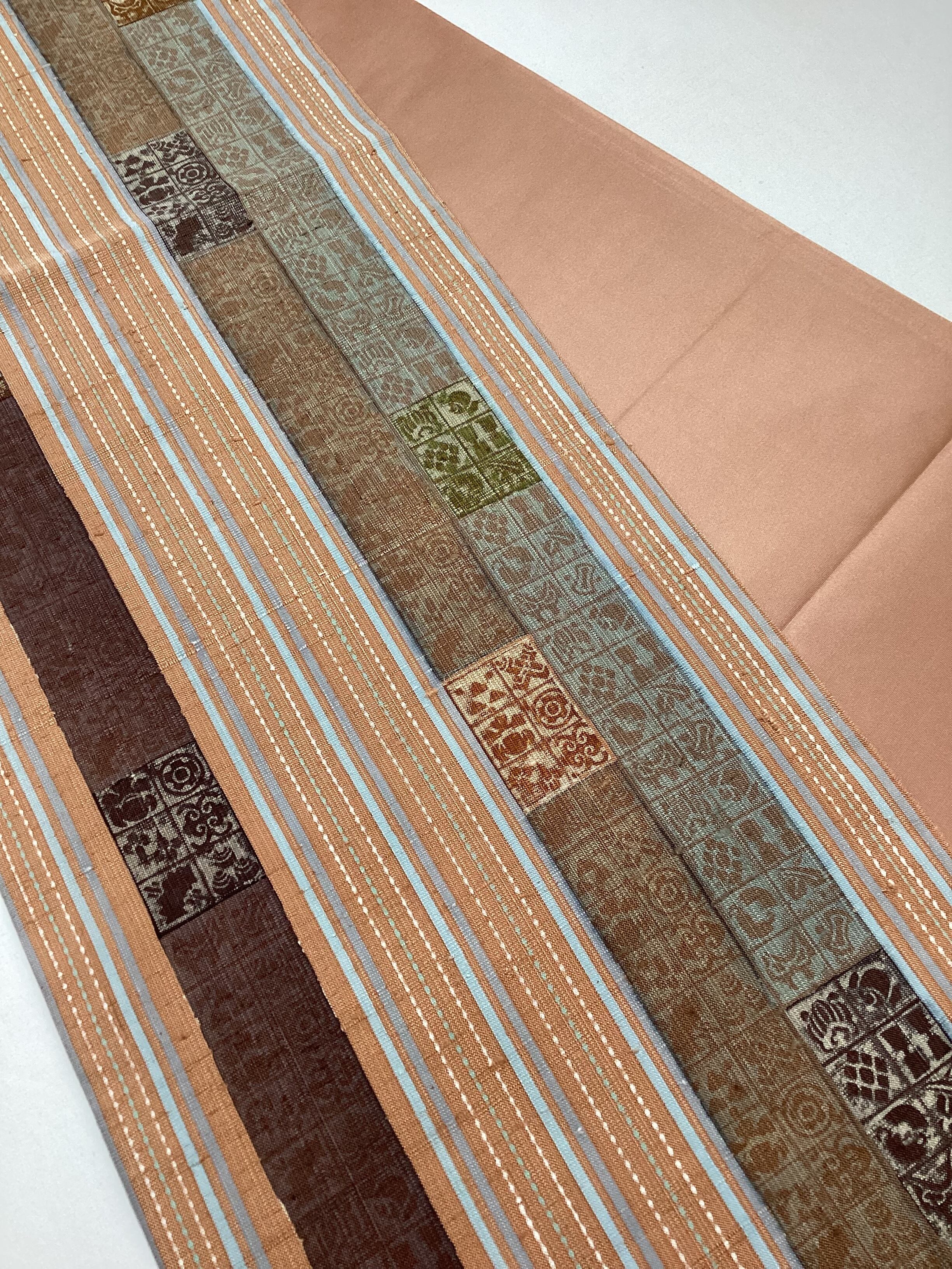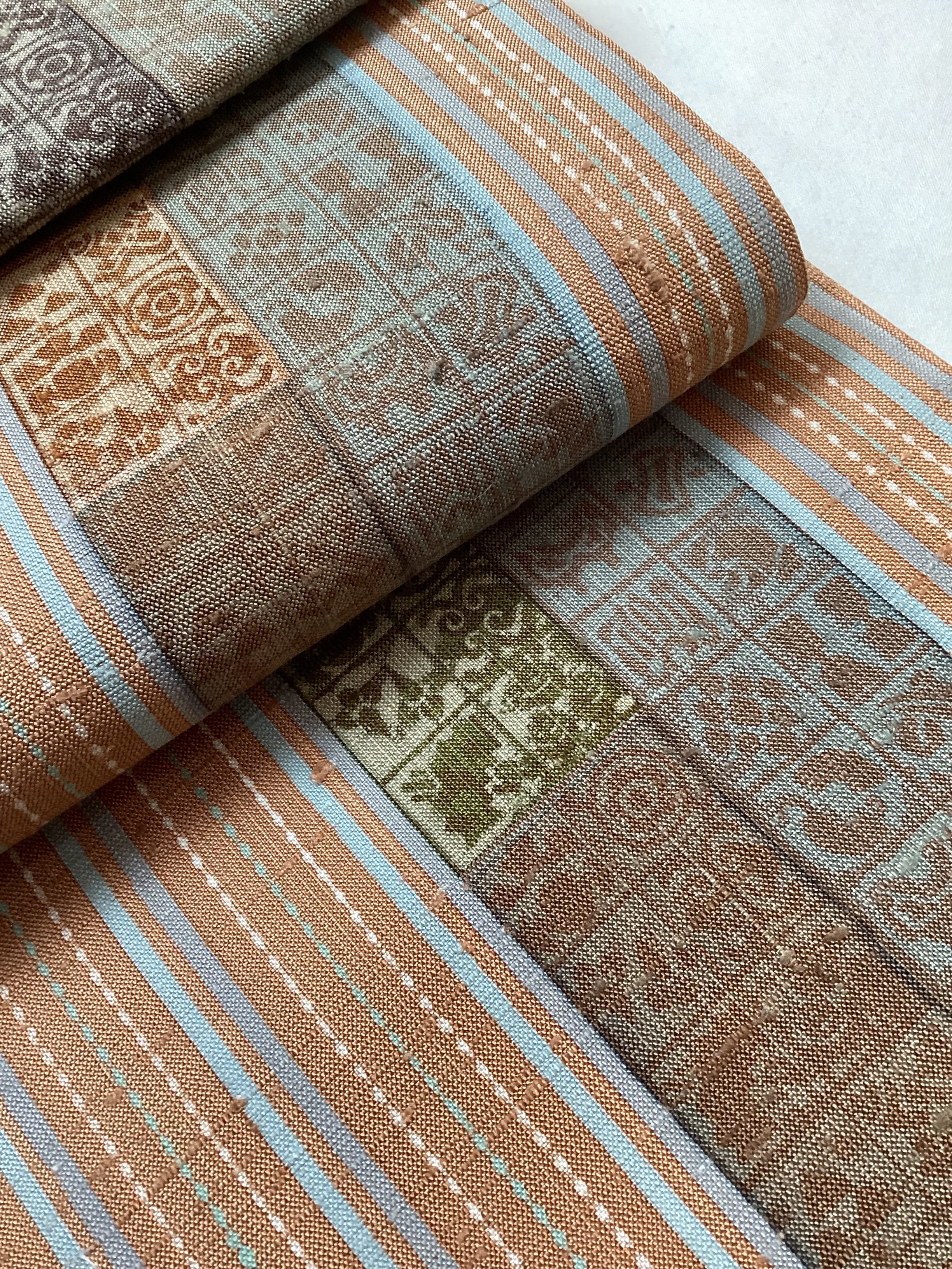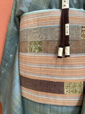 肉桂色(赤みを帯びたライトブラウン)に水色や青磁色のスッキリとした縦ラインがアクセントとなり、木版で押された様々な宝の文様や吉祥の文様が味わいのあるカジュアルな洒落袋帯です。紬のお着物に馴染むお色目で重宝に締めていただけるかと思います。全通柄で贅沢に柄付けされており、着物ビギナーさんにも柄出しに迷わずに結んでいただける紬の袋帯です。
