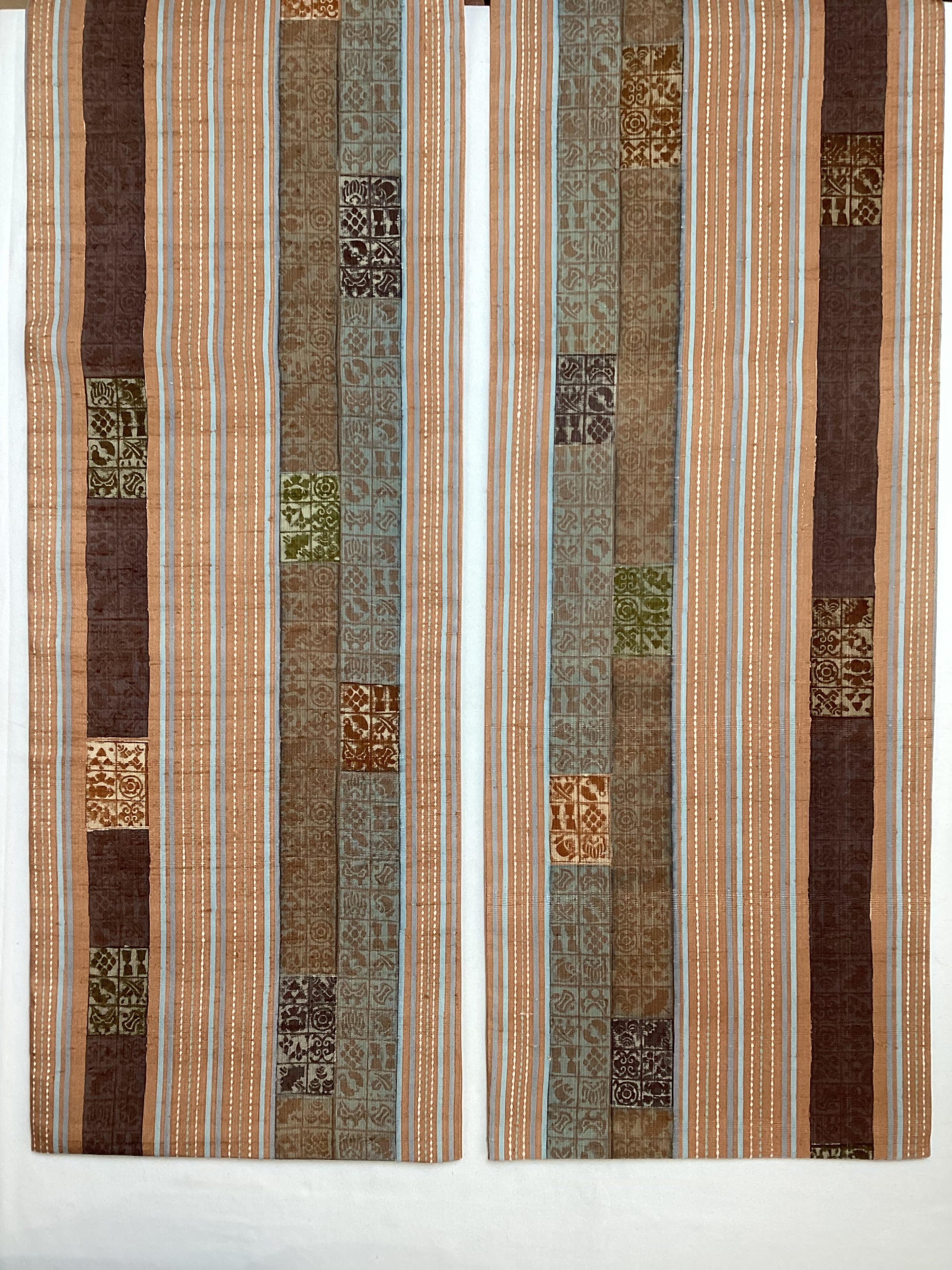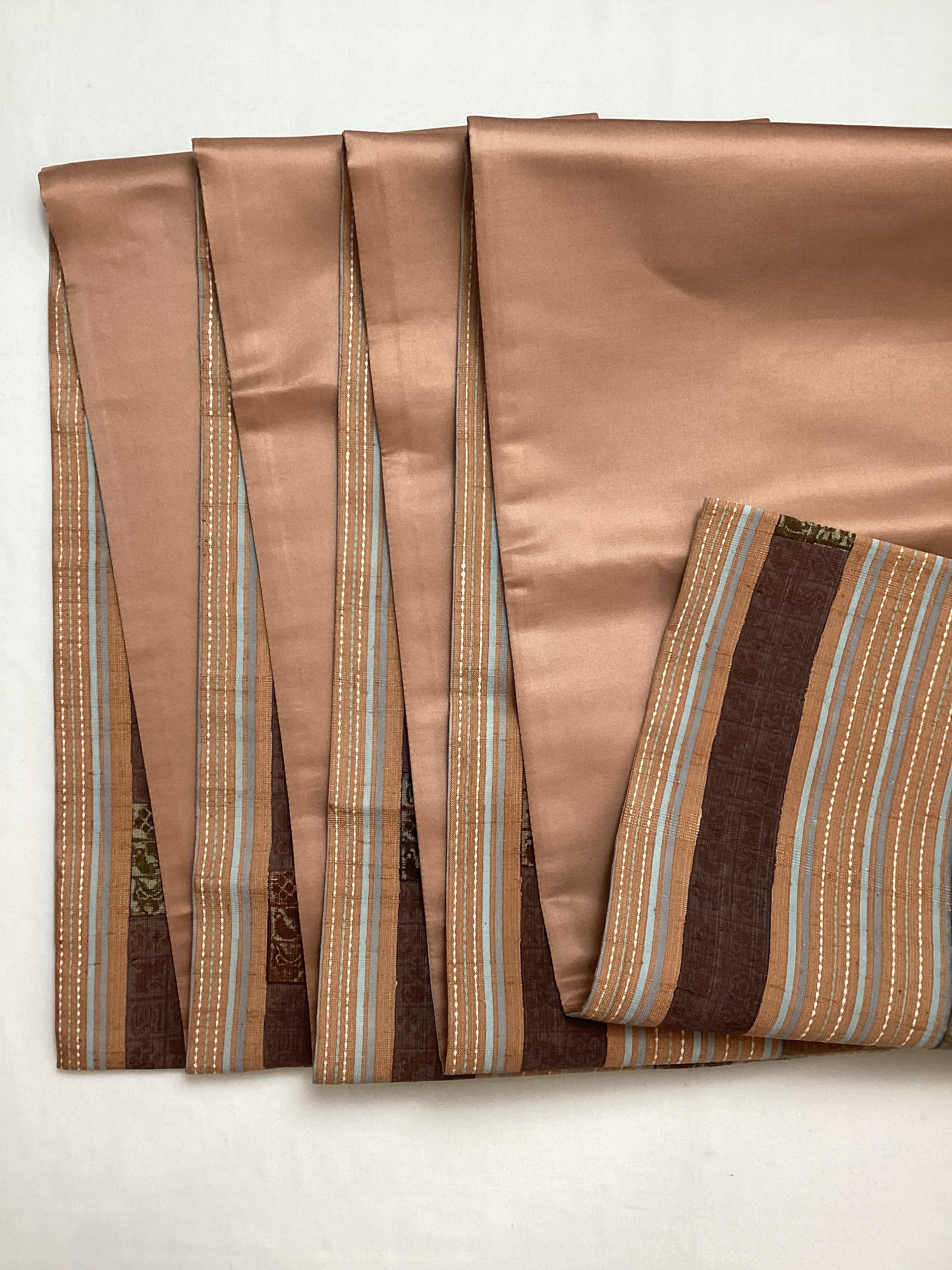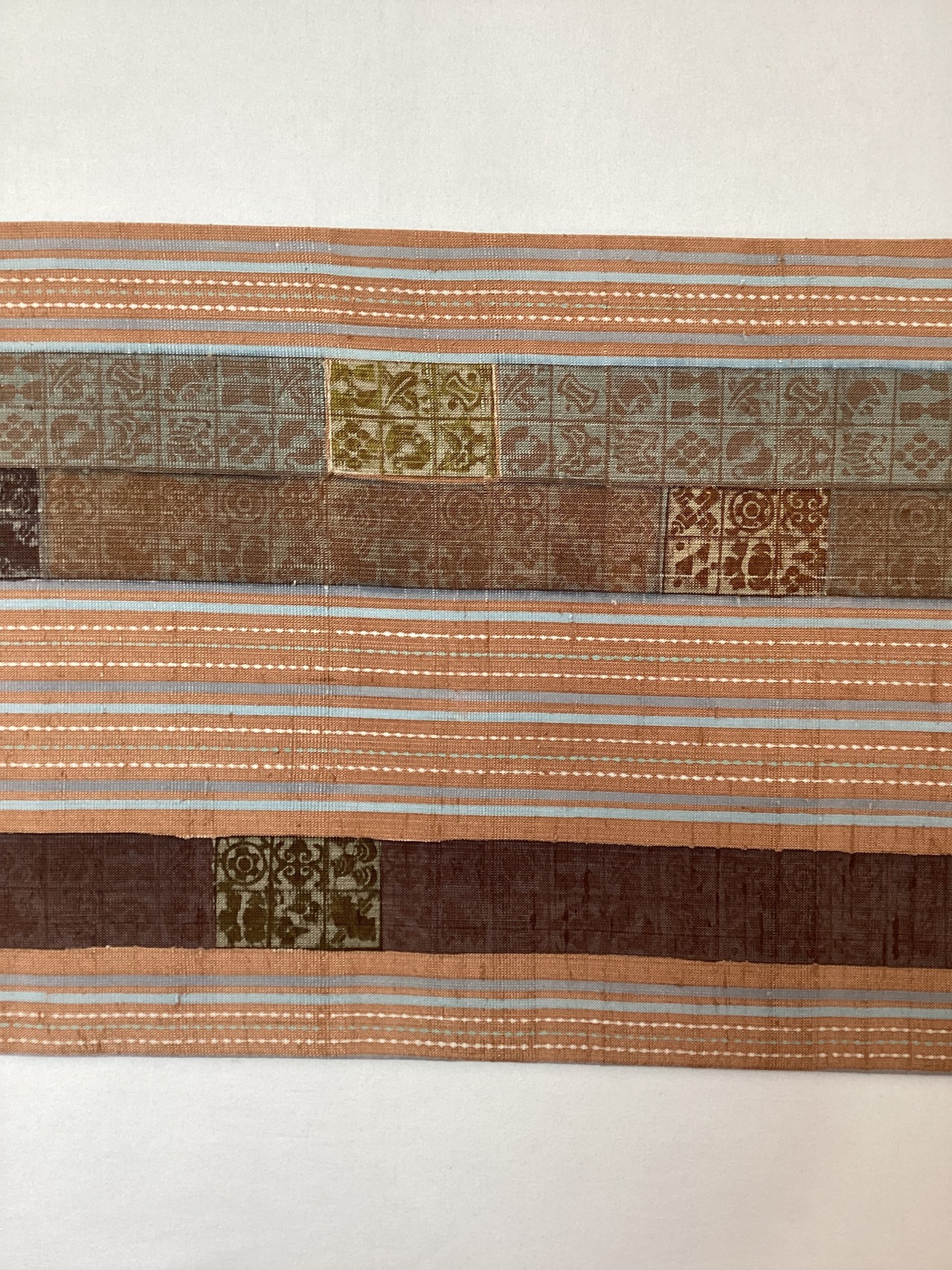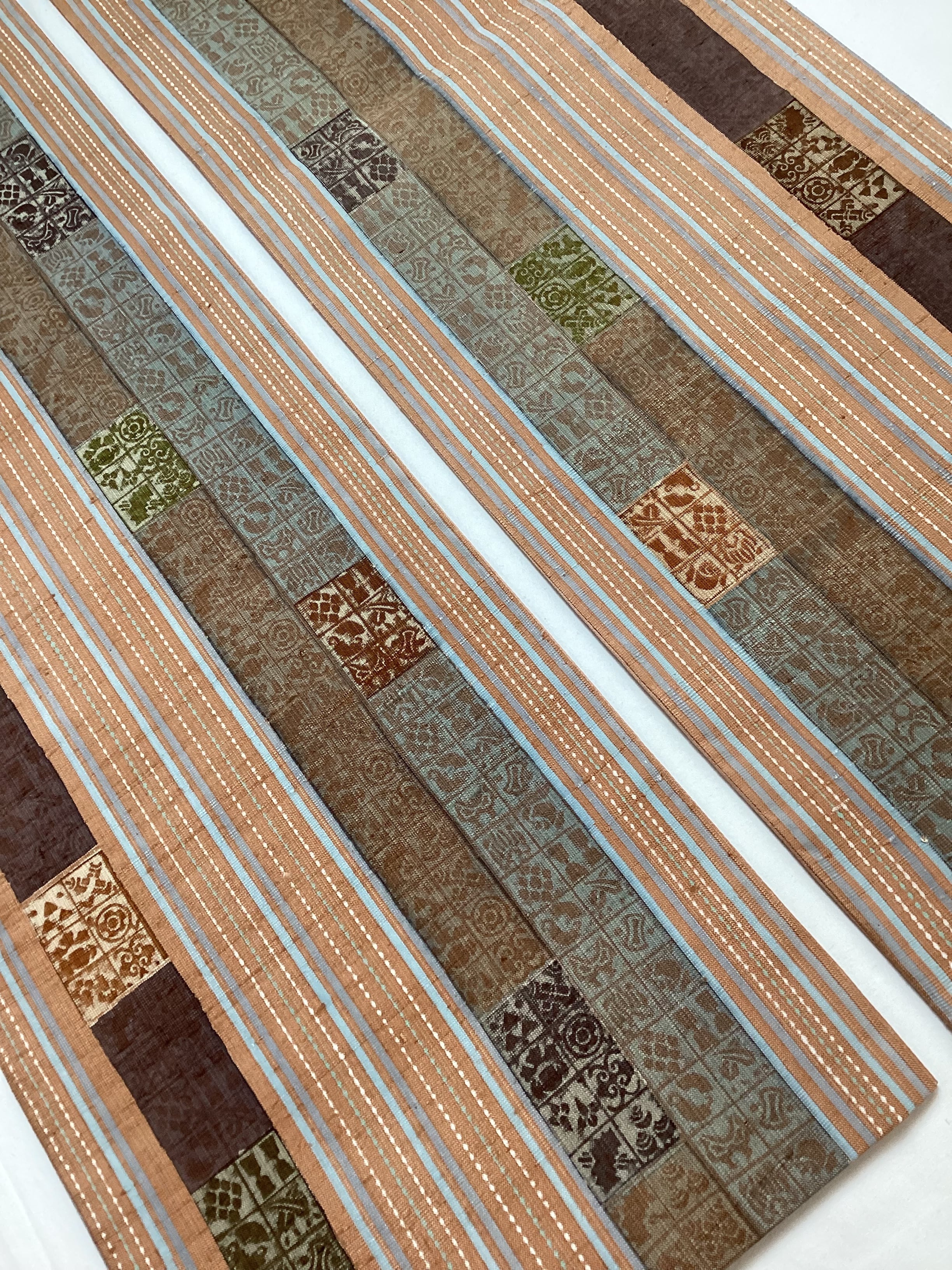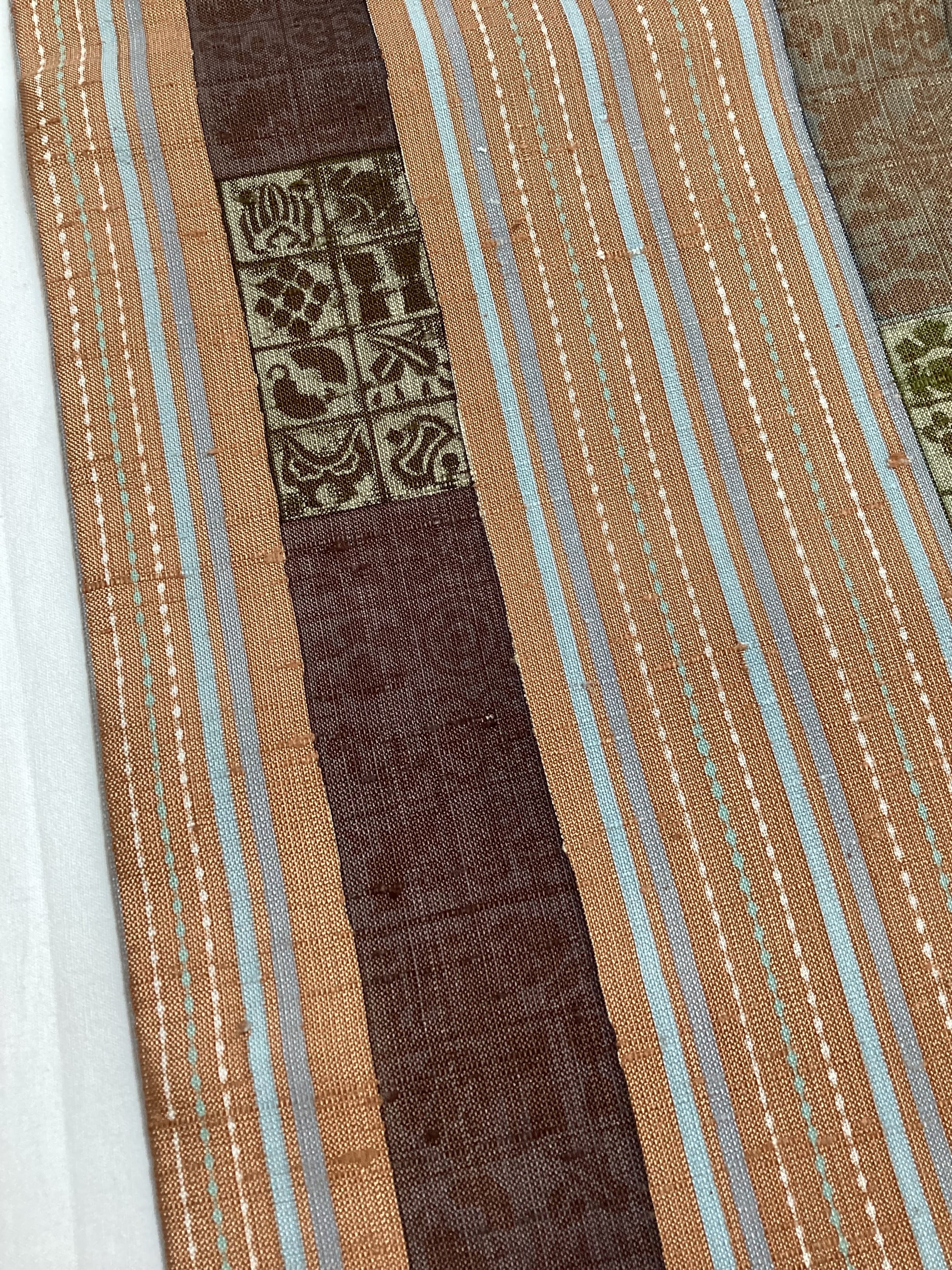 肉桂色(赤みを帯びたライトブラウン)に水色や青磁色のスッキリとした縦ラインがアクセントとなり、木版で押された様々な宝の文様や吉祥の文様が味わいのあるカジュアルな洒落袋帯です。紬のお着物に馴染むお色目で重宝に締めていただけるかと思います。全通柄で贅沢に柄付けされており、着物ビギナーさんにも柄出しに迷わずに結んでいただける紬の袋帯です。