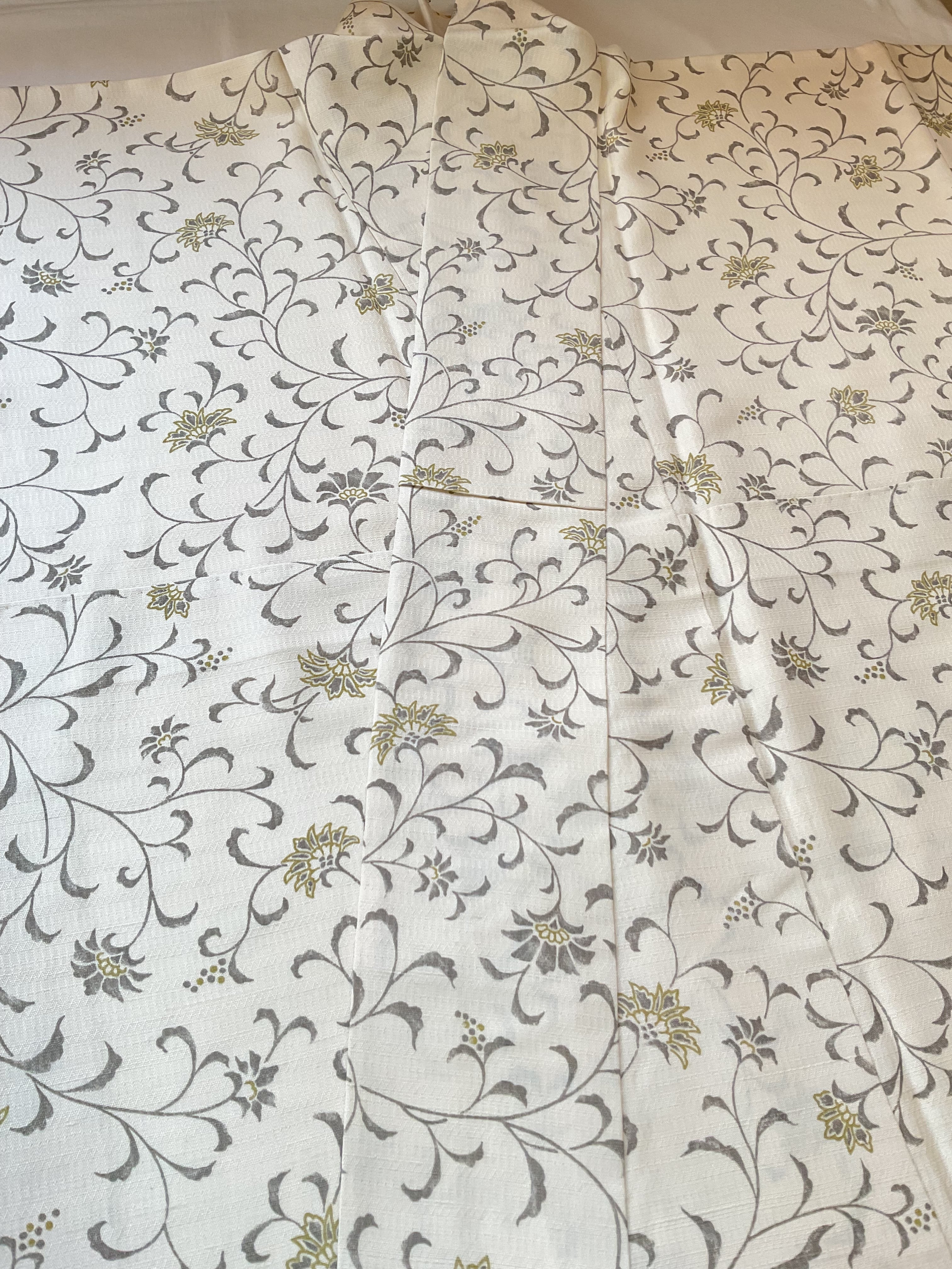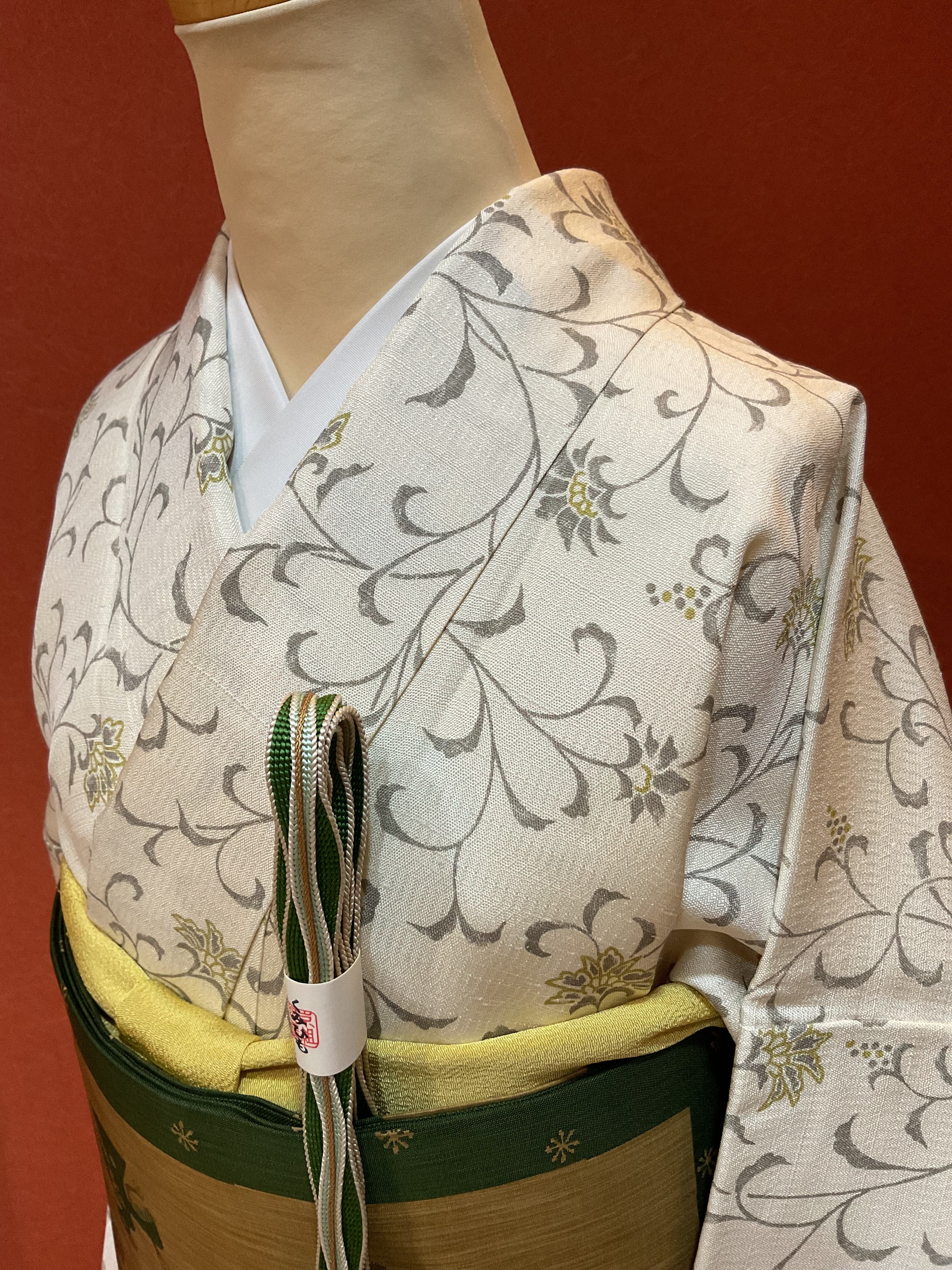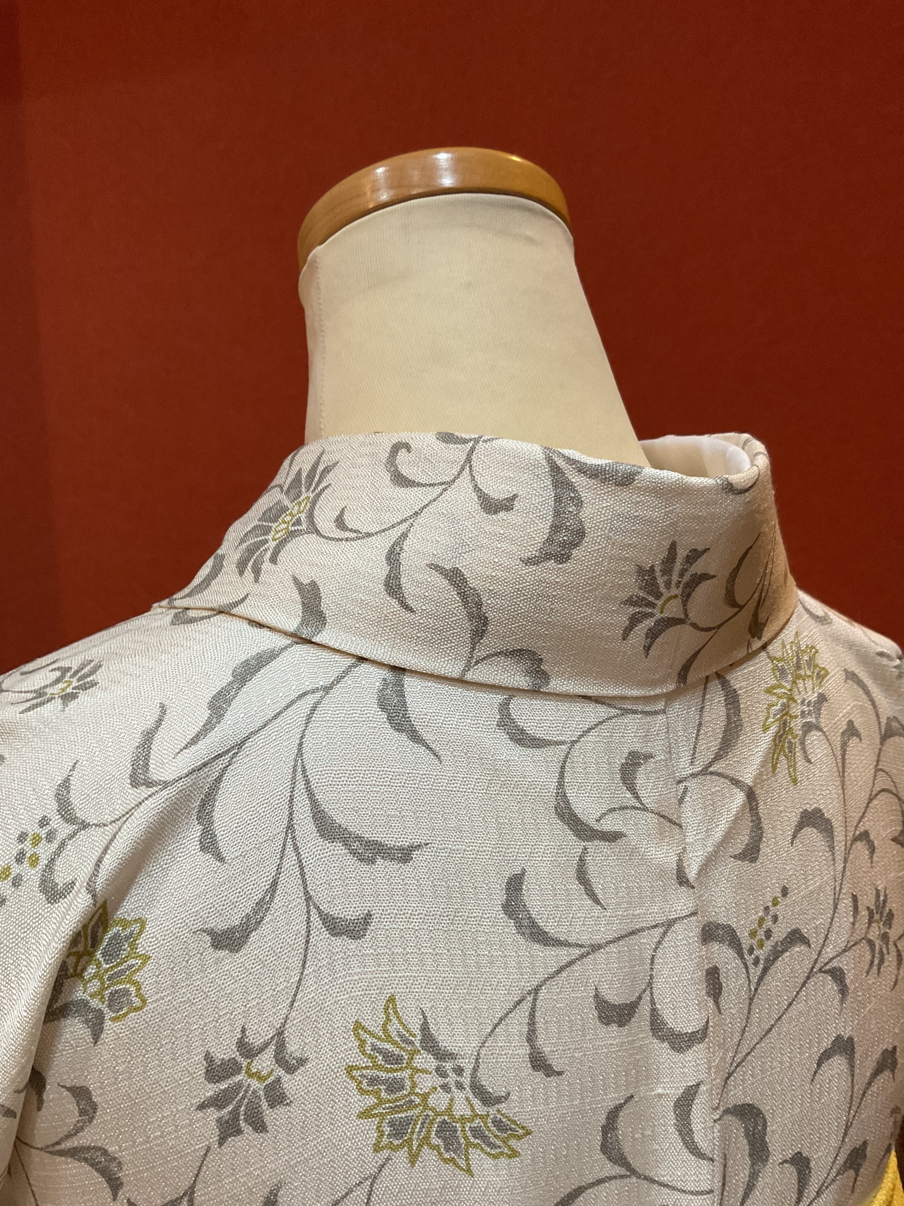 さらりとした薄手の軽やかな乳白色の織地にモダンな唐花文様が染められています。色味を抑えた柄行で現代的な装いが楽しめるお洒落着物です。帯合わせで少しオメカシした雰囲気も出せ、TPOに合わせて着回せる重宝な一枚です。