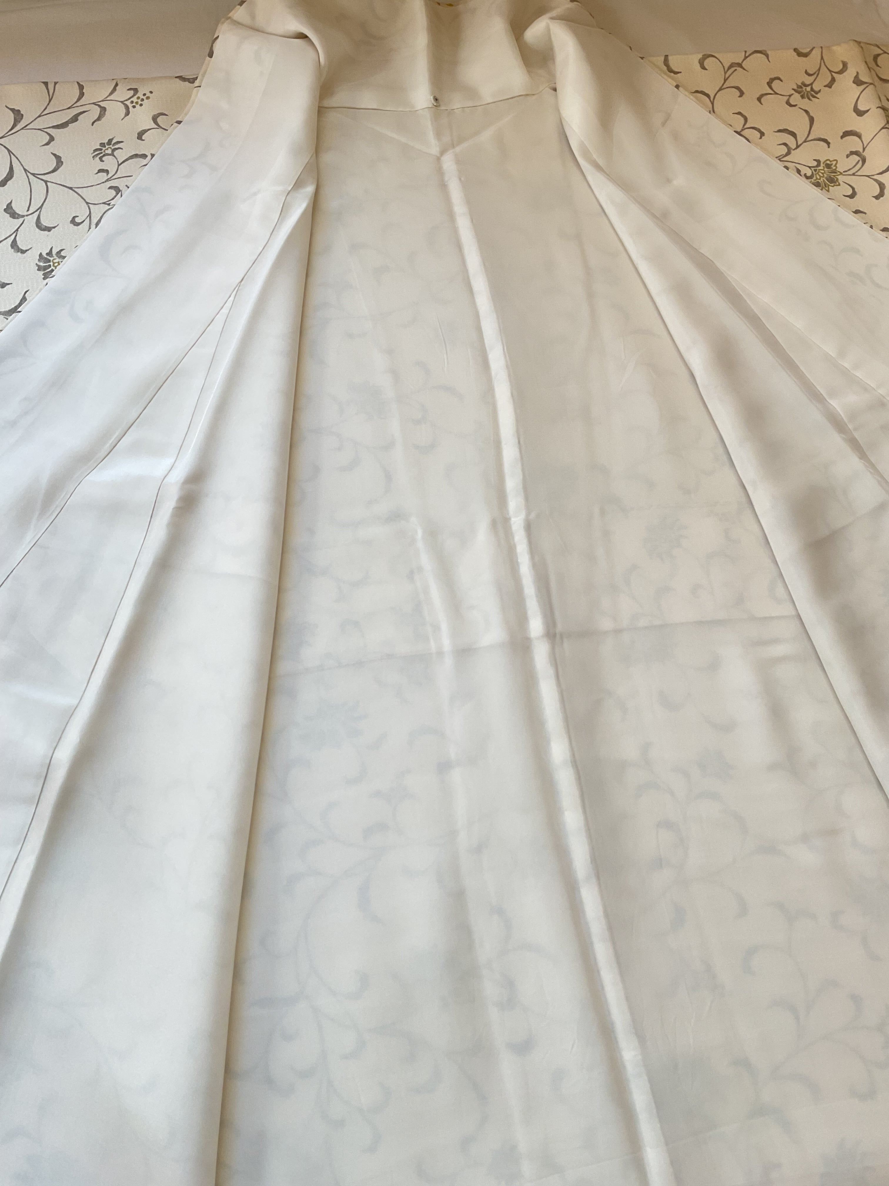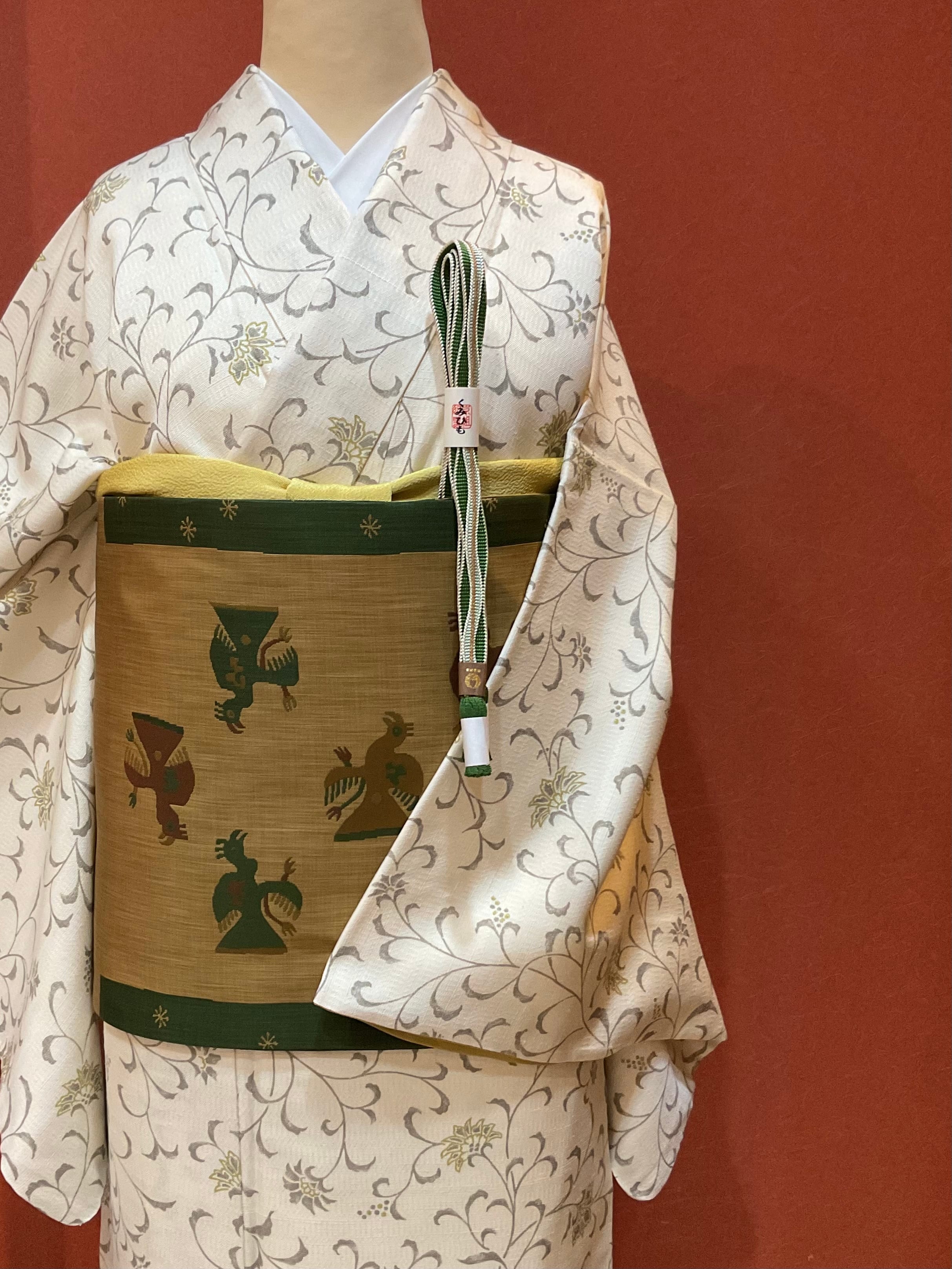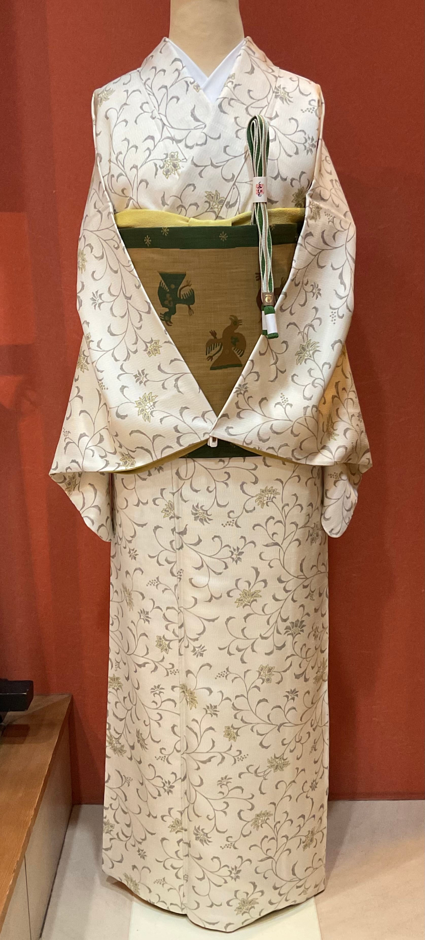 さらりとした薄手の軽やかな乳白色の織地にモダンな唐花文様が染められています。色味を抑えた柄行で現代的な装いが楽しめるお洒落着物です。帯合わせで少しオメカシした雰囲気も出せ、TPOに合わせて着回せる重宝な一枚です。