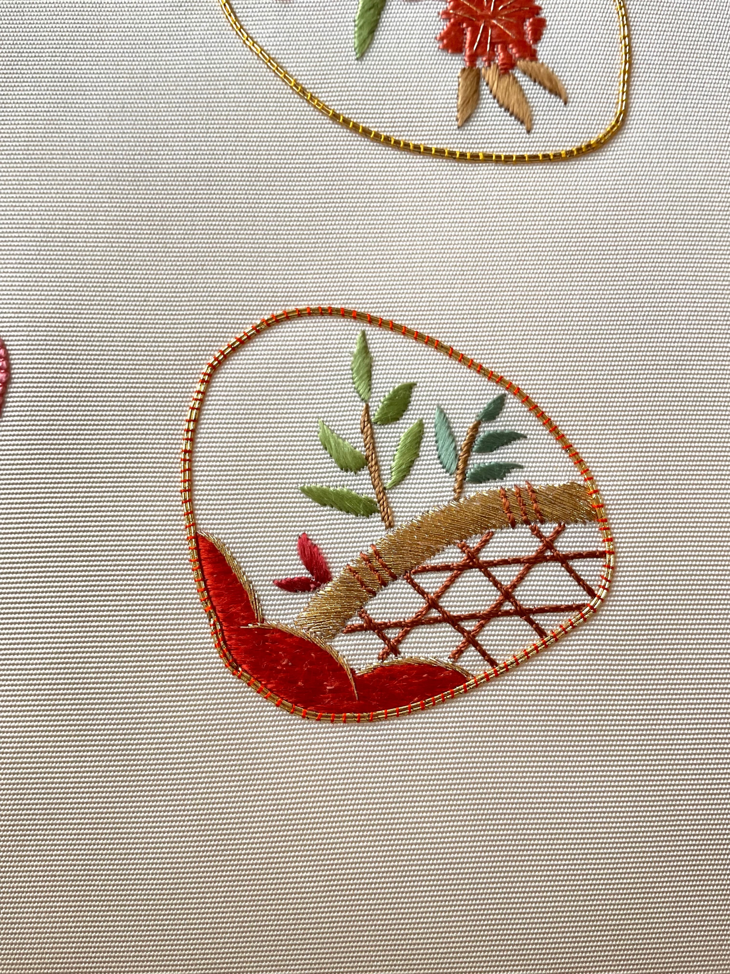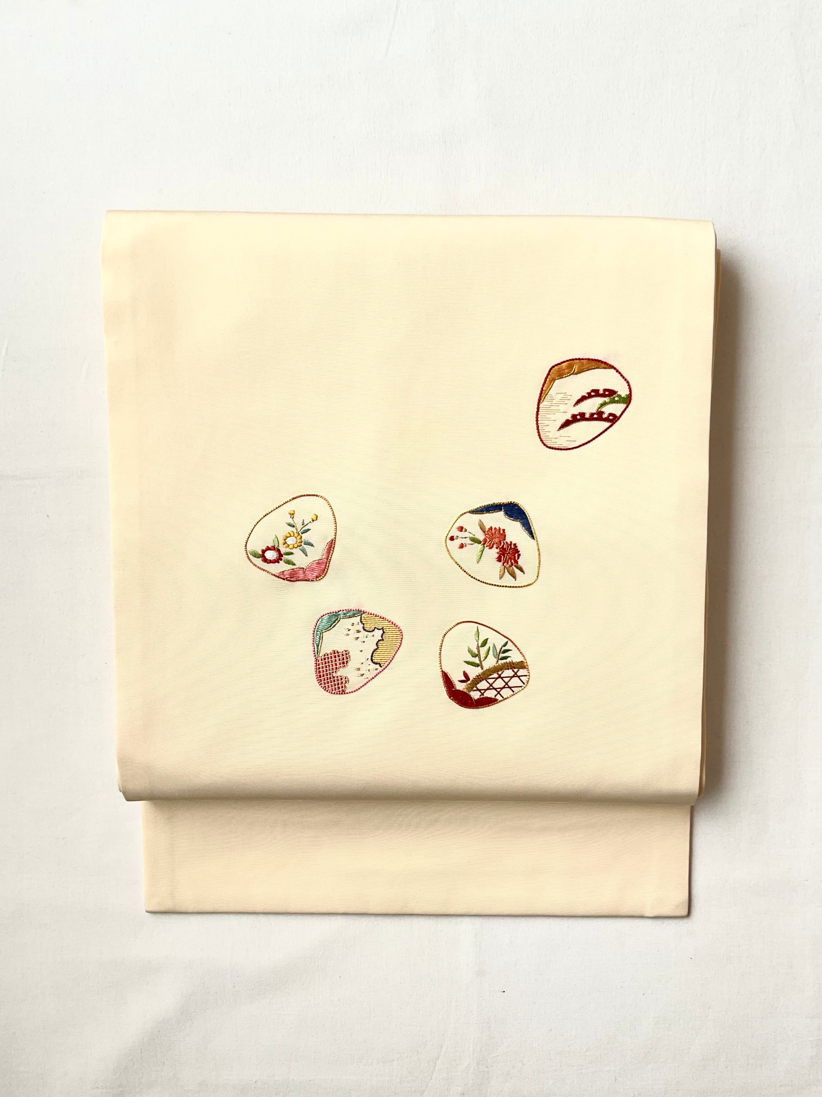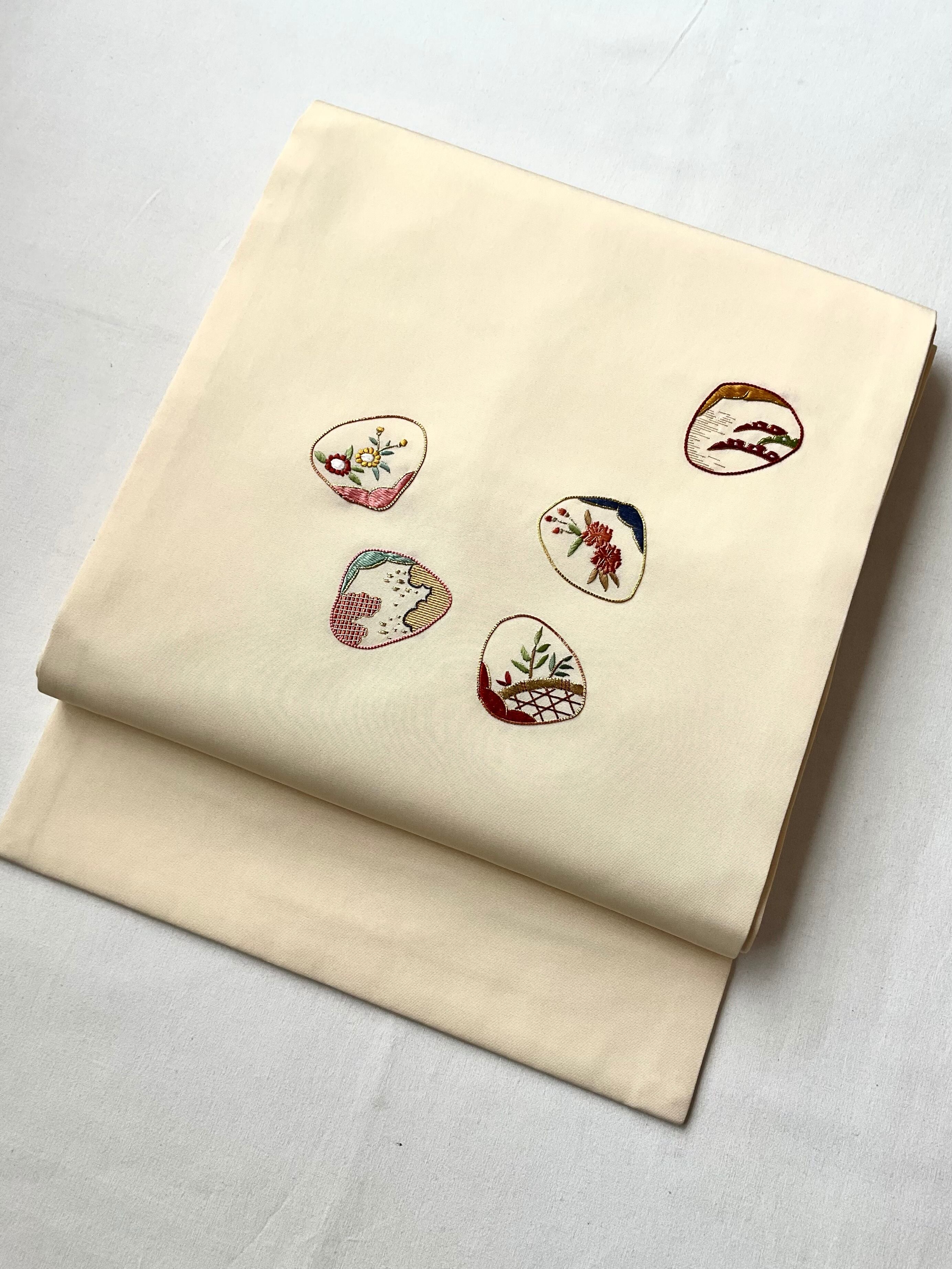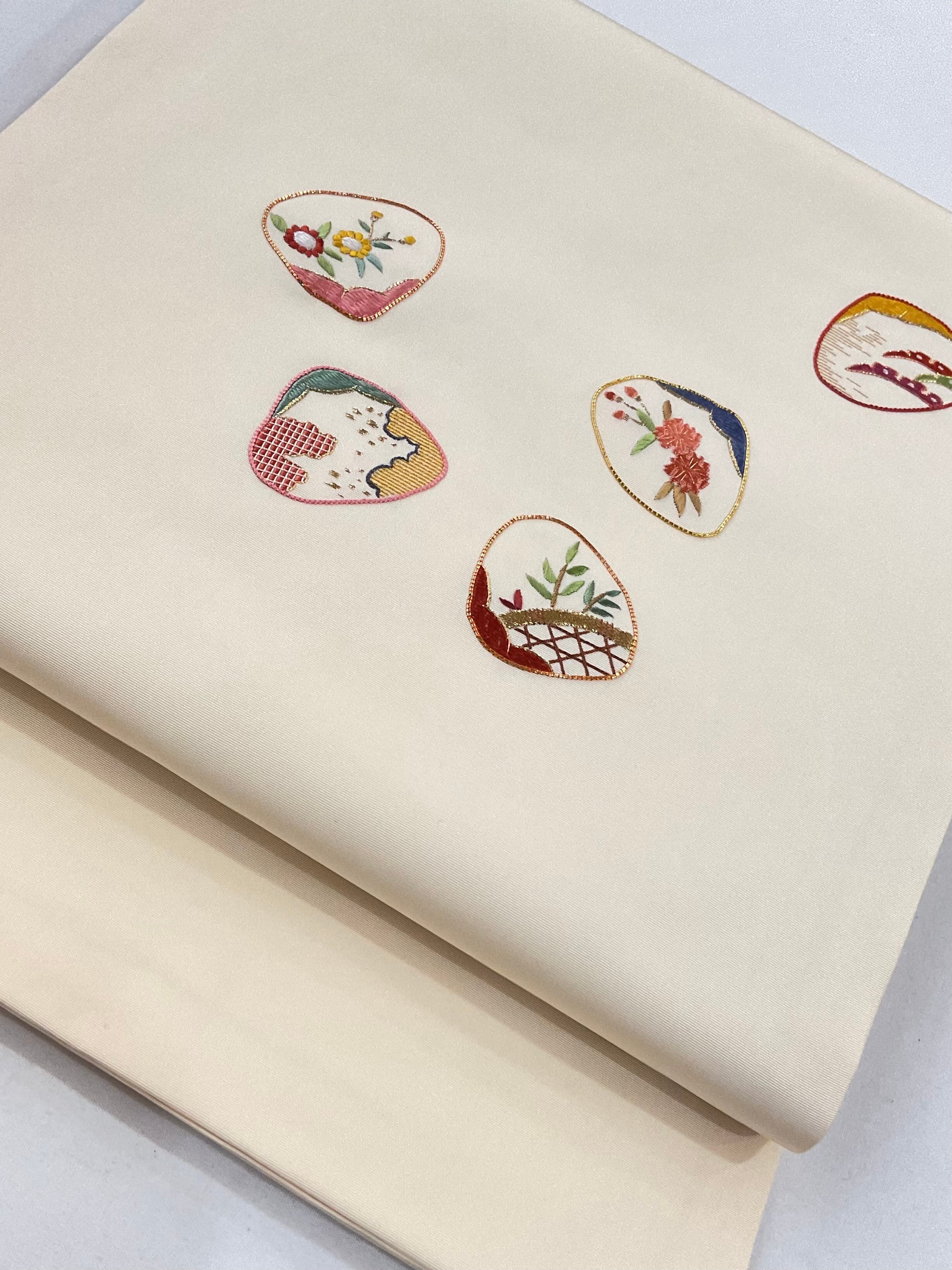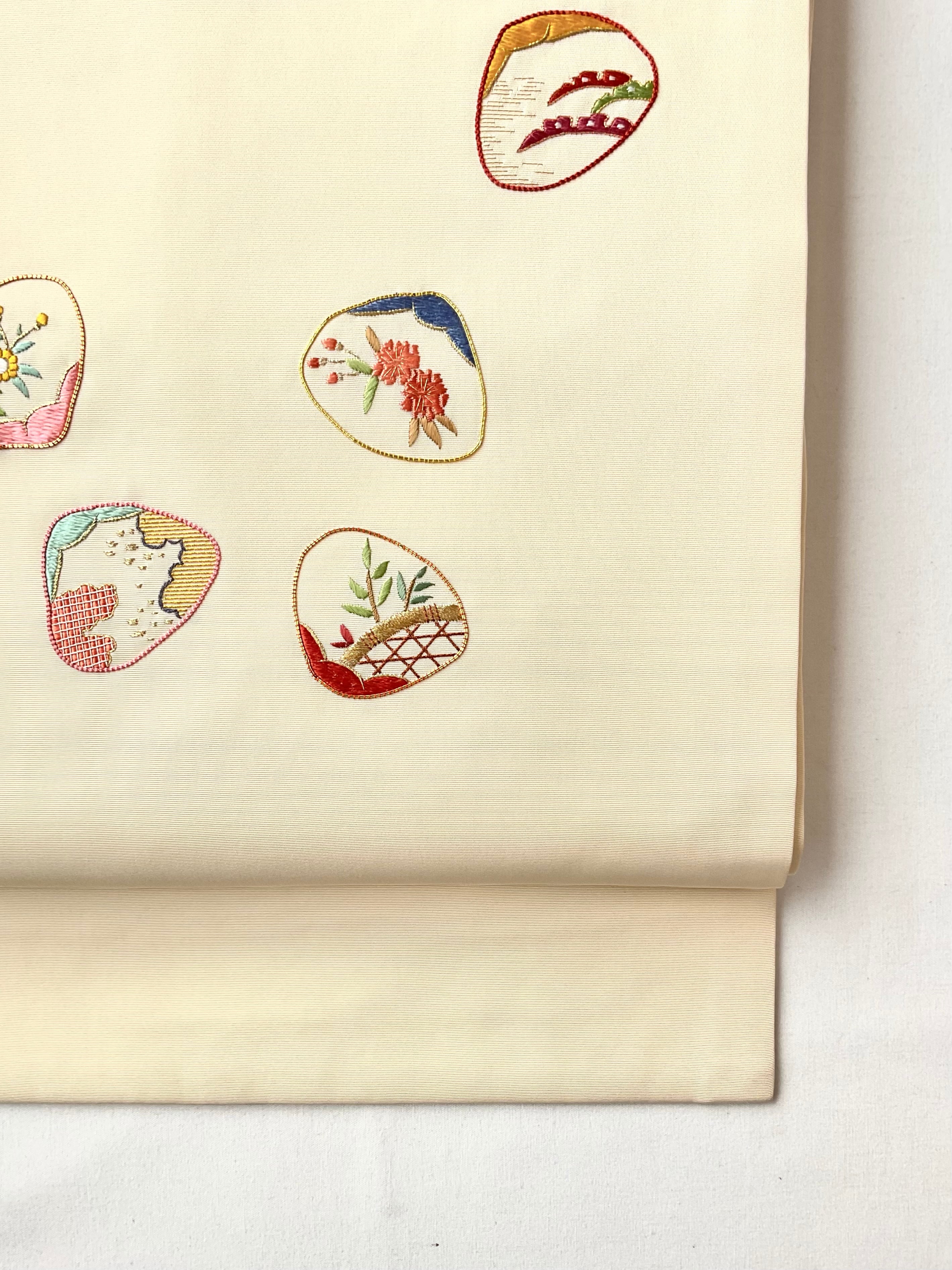 淡いクリーム色の塩瀬地に貝合わせの文様が刺繍された開きなごや帯です。桜の花や雪芝文様などが小さな貝の内側に繊細な刺繍で表現されています。艶やかな絹糸の細かな縫いに金駒刺繍が華やかさを添えます。上品で雅やかな雰囲気をお楽しみいただける帯です。