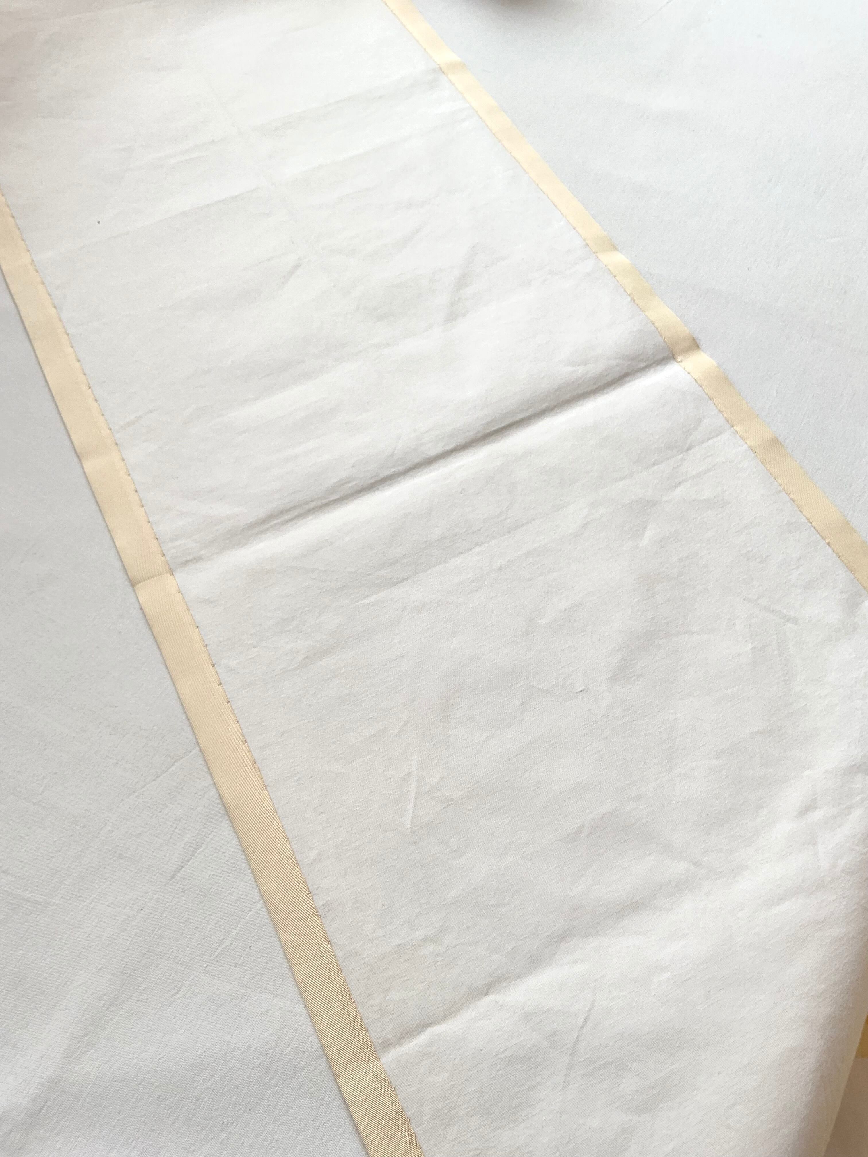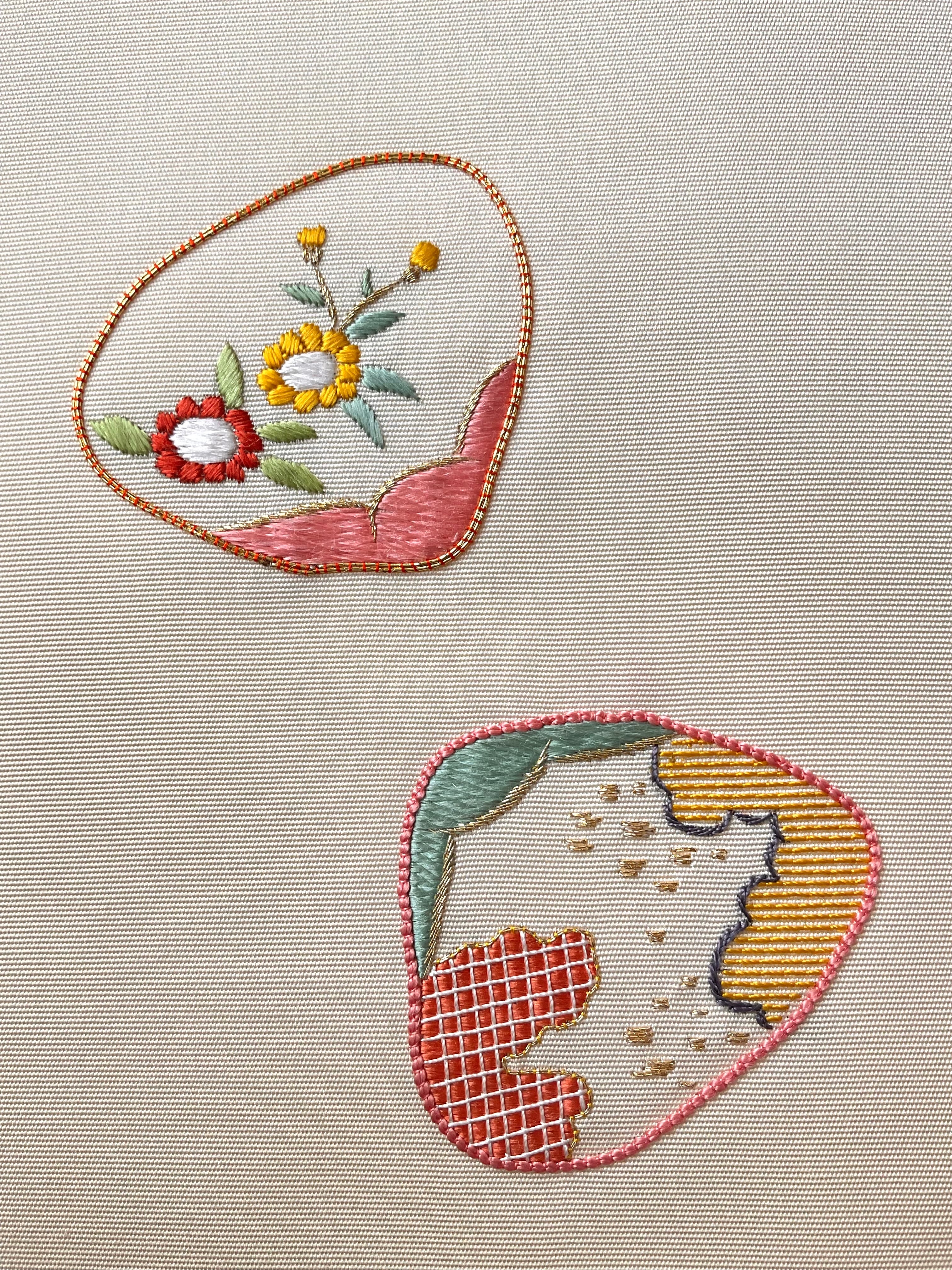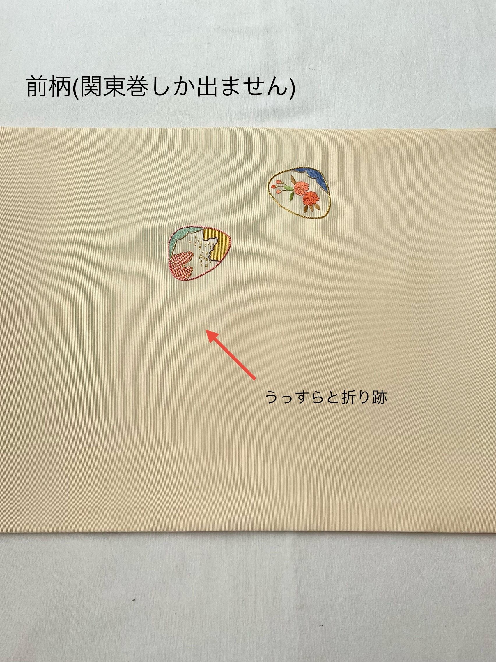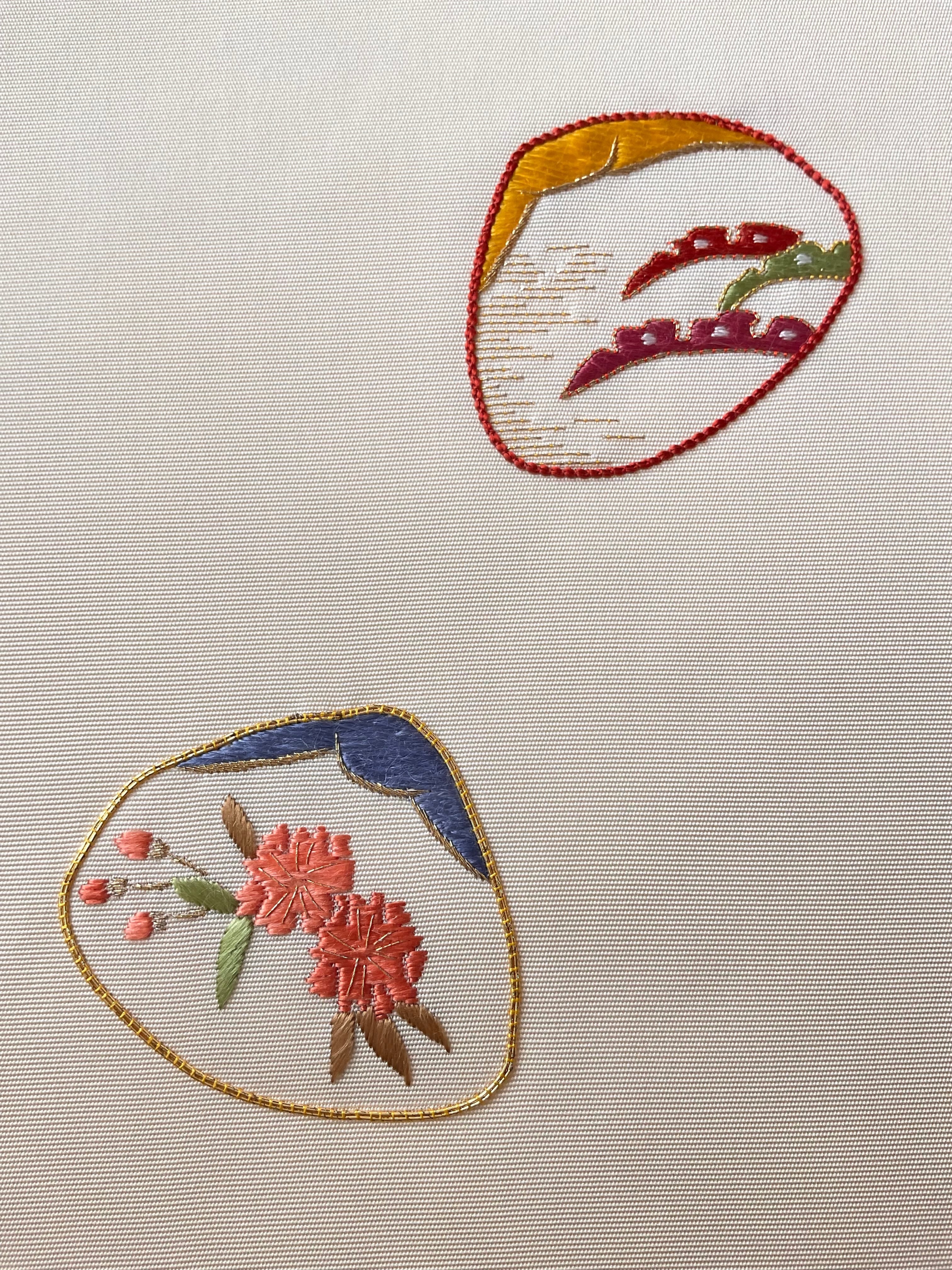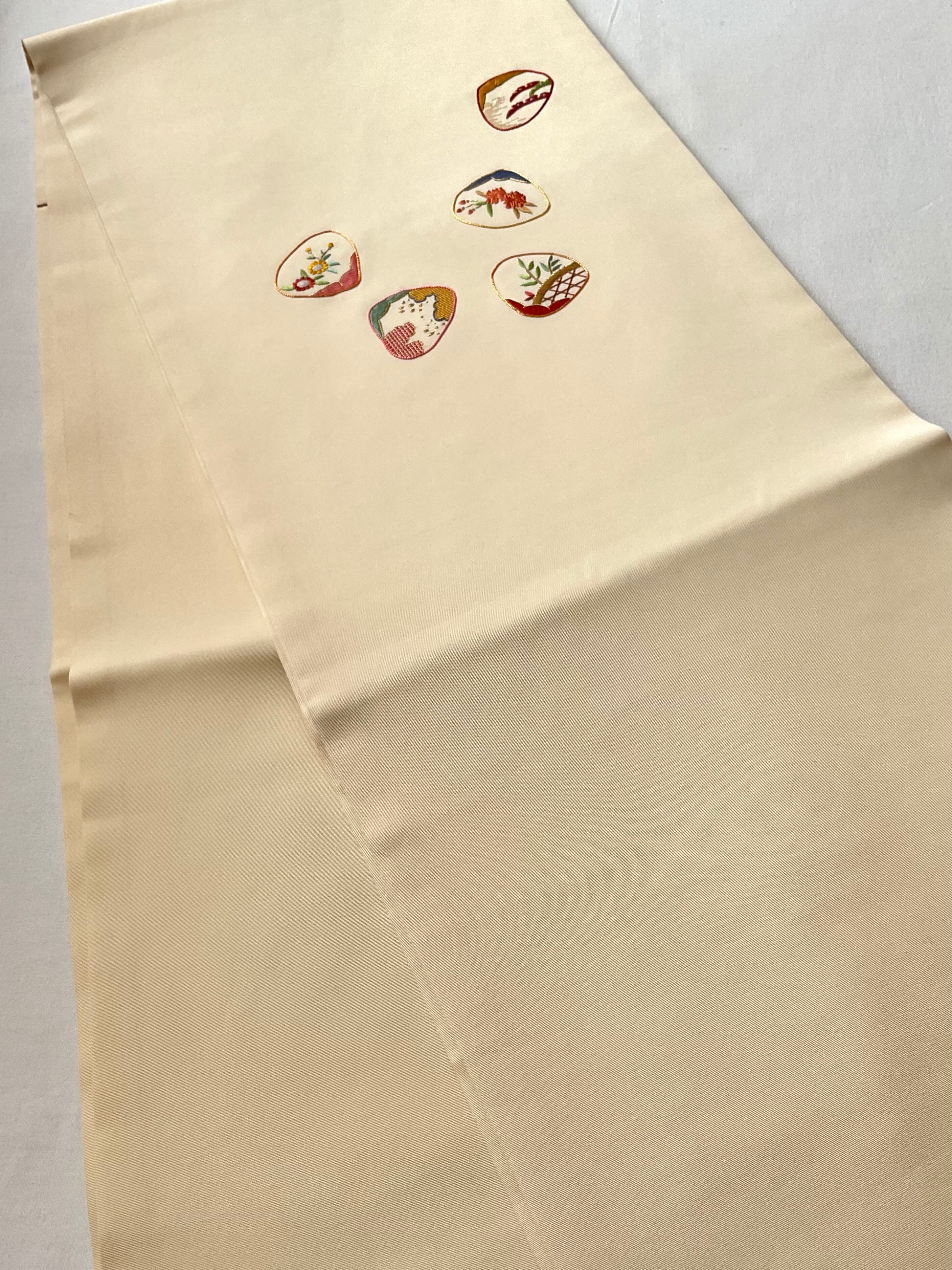 淡いクリーム色の塩瀬地に貝合わせの文様が刺繍された開きなごや帯です。桜の花や雪芝文様などが小さな貝の内側に繊細な刺繍で表現されています。艶やかな絹糸の細かな縫いに金駒刺繍が華やかさを添えます。上品で雅やかな雰囲気をお楽しみいただける帯です。