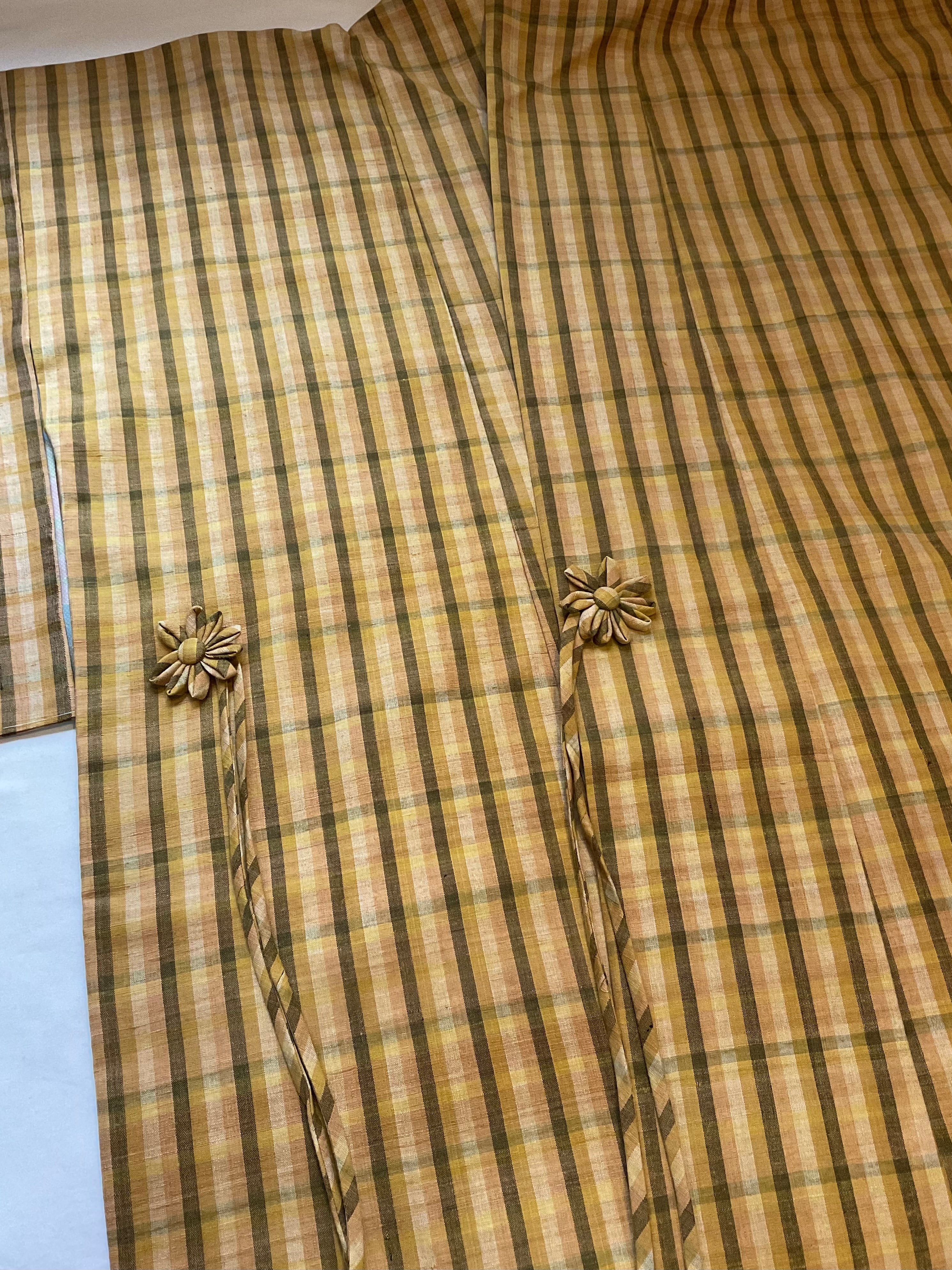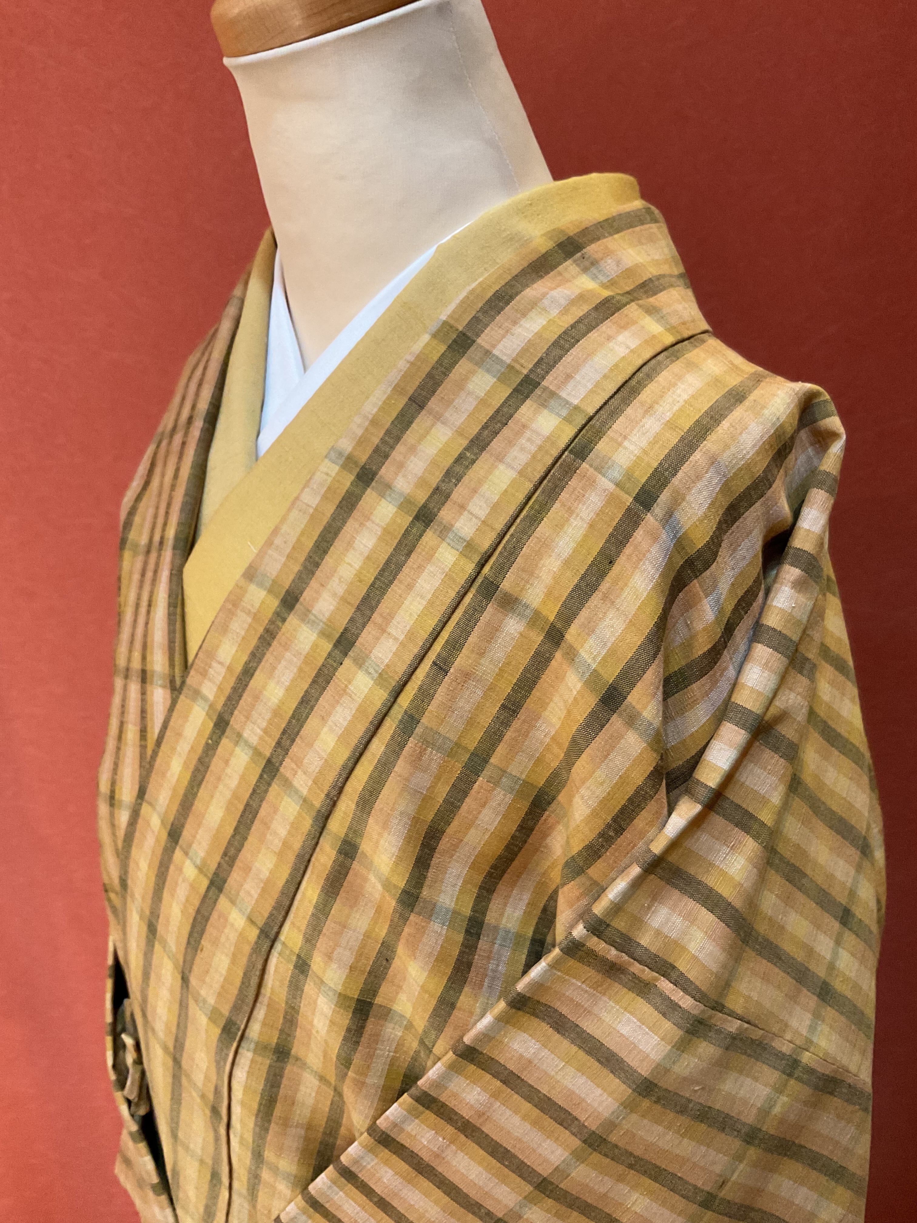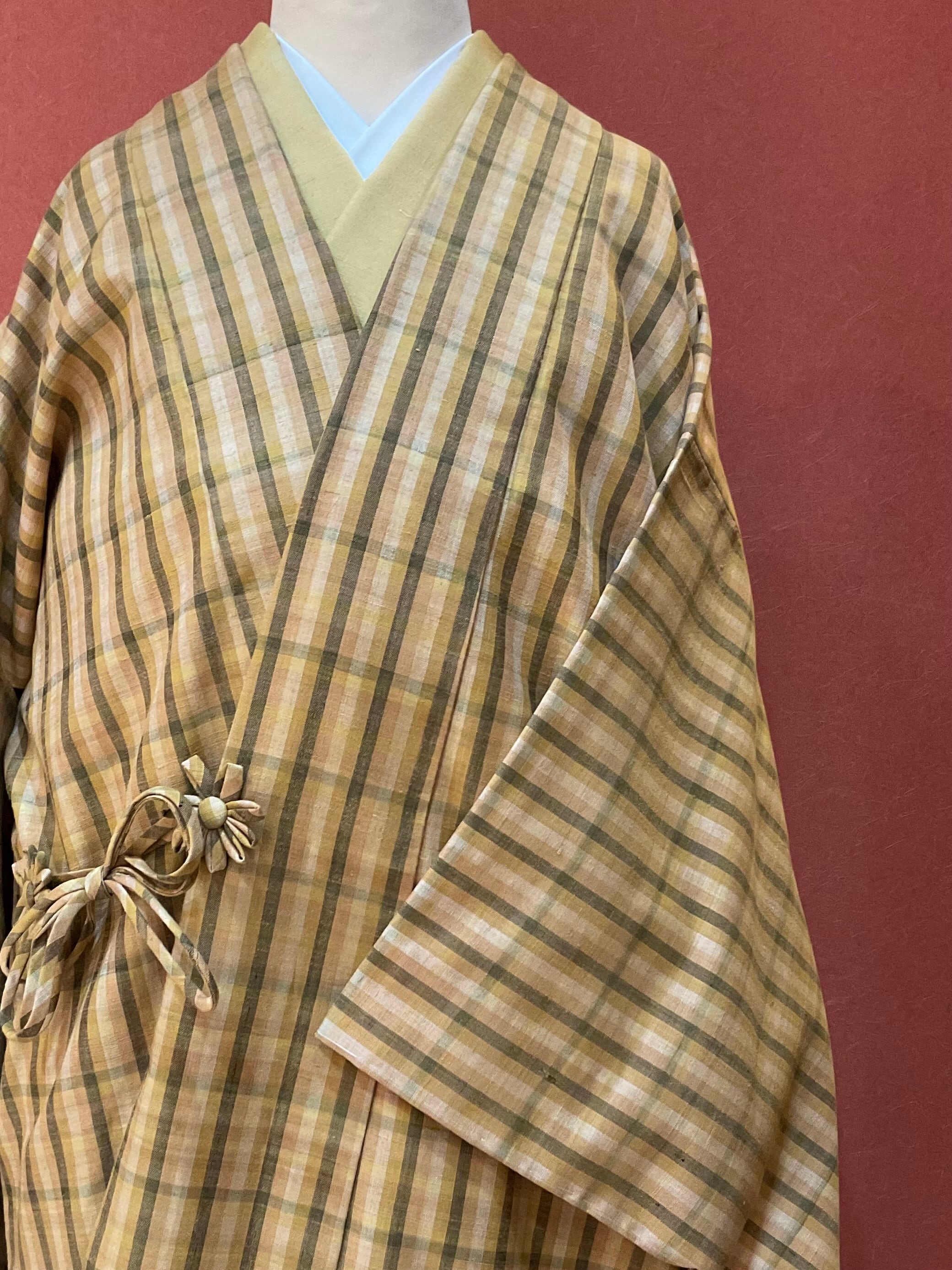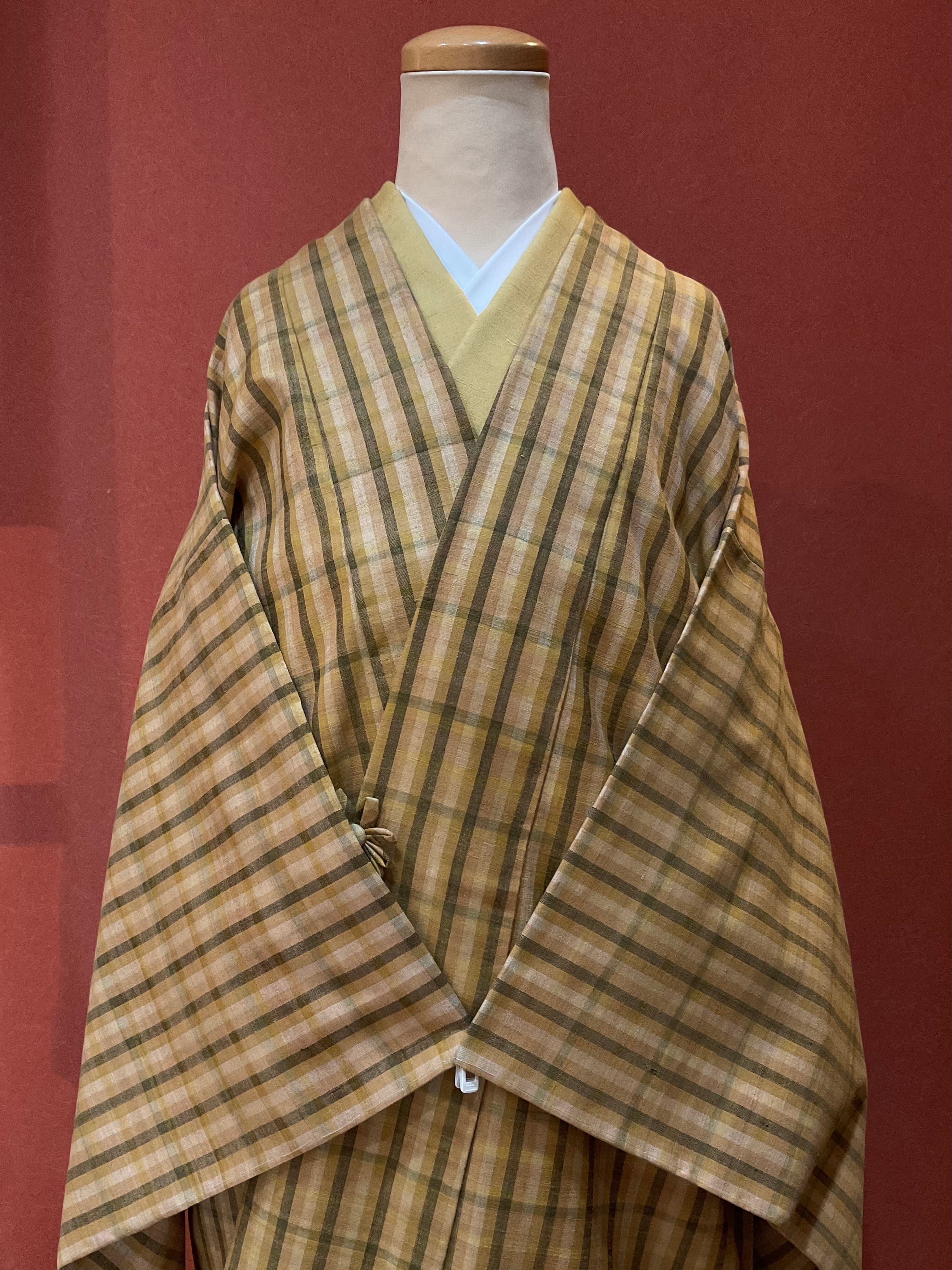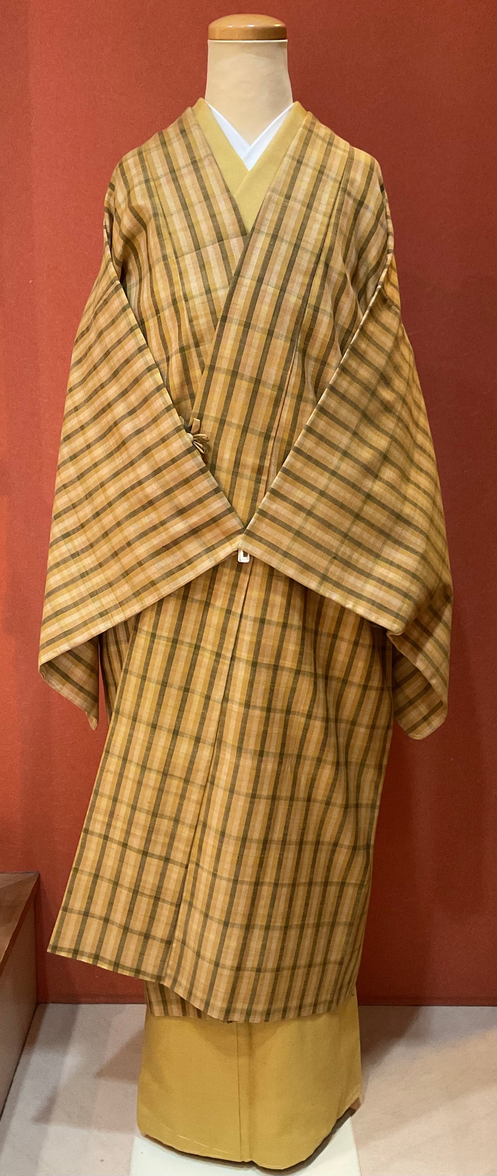明るい目の黄土色地に、格子の緑色が春の芽吹きを感じさせる道中着です。