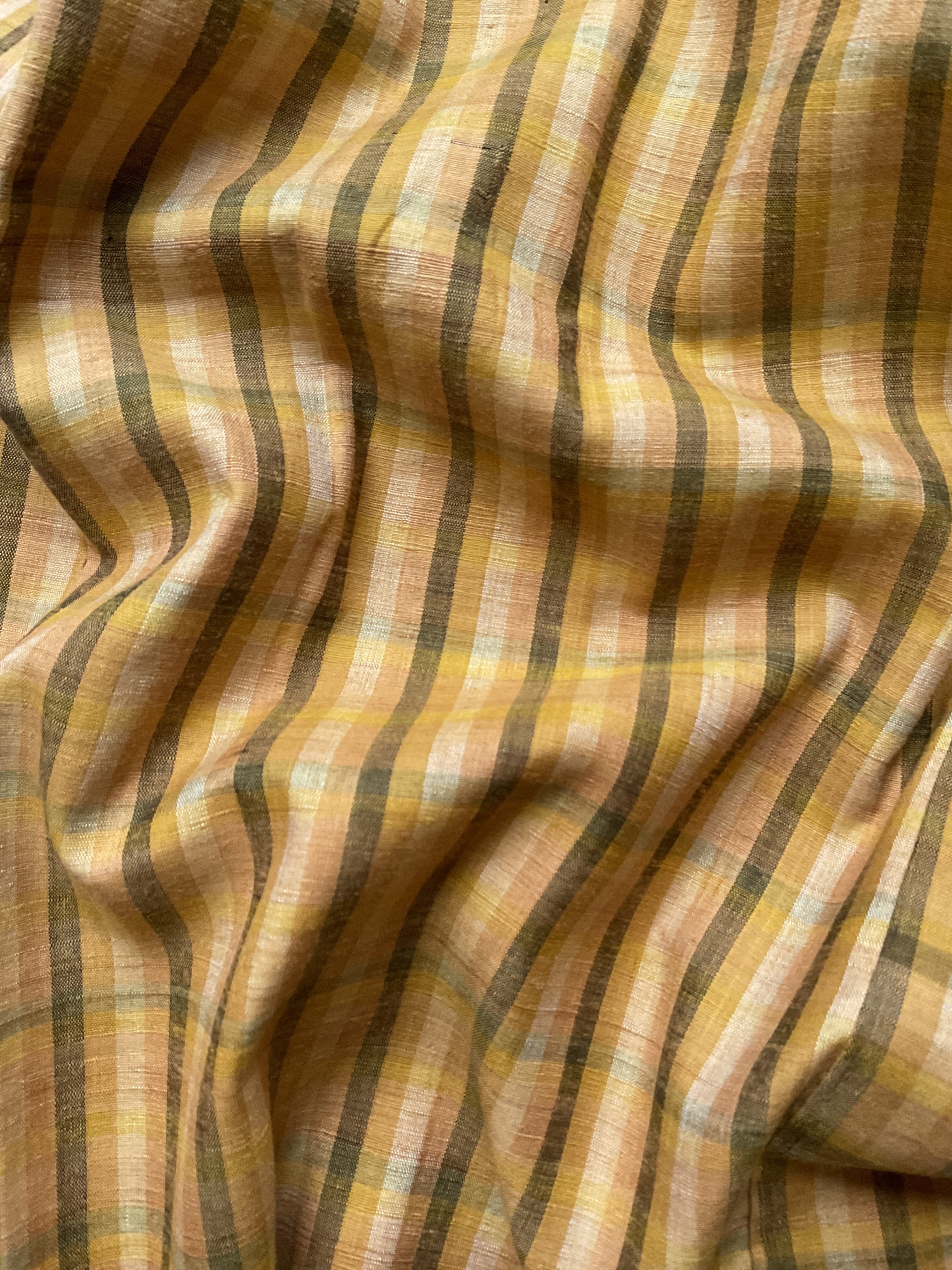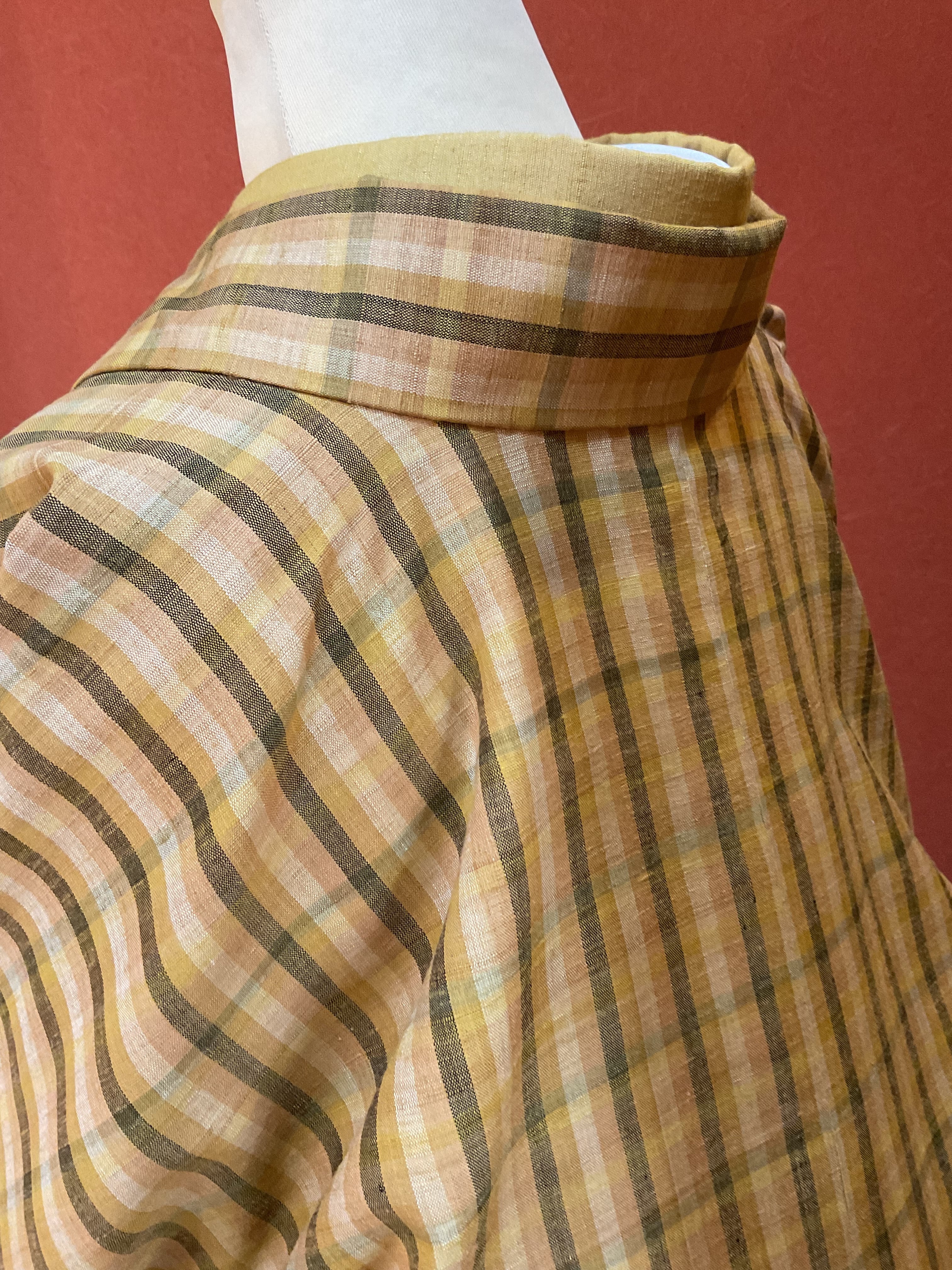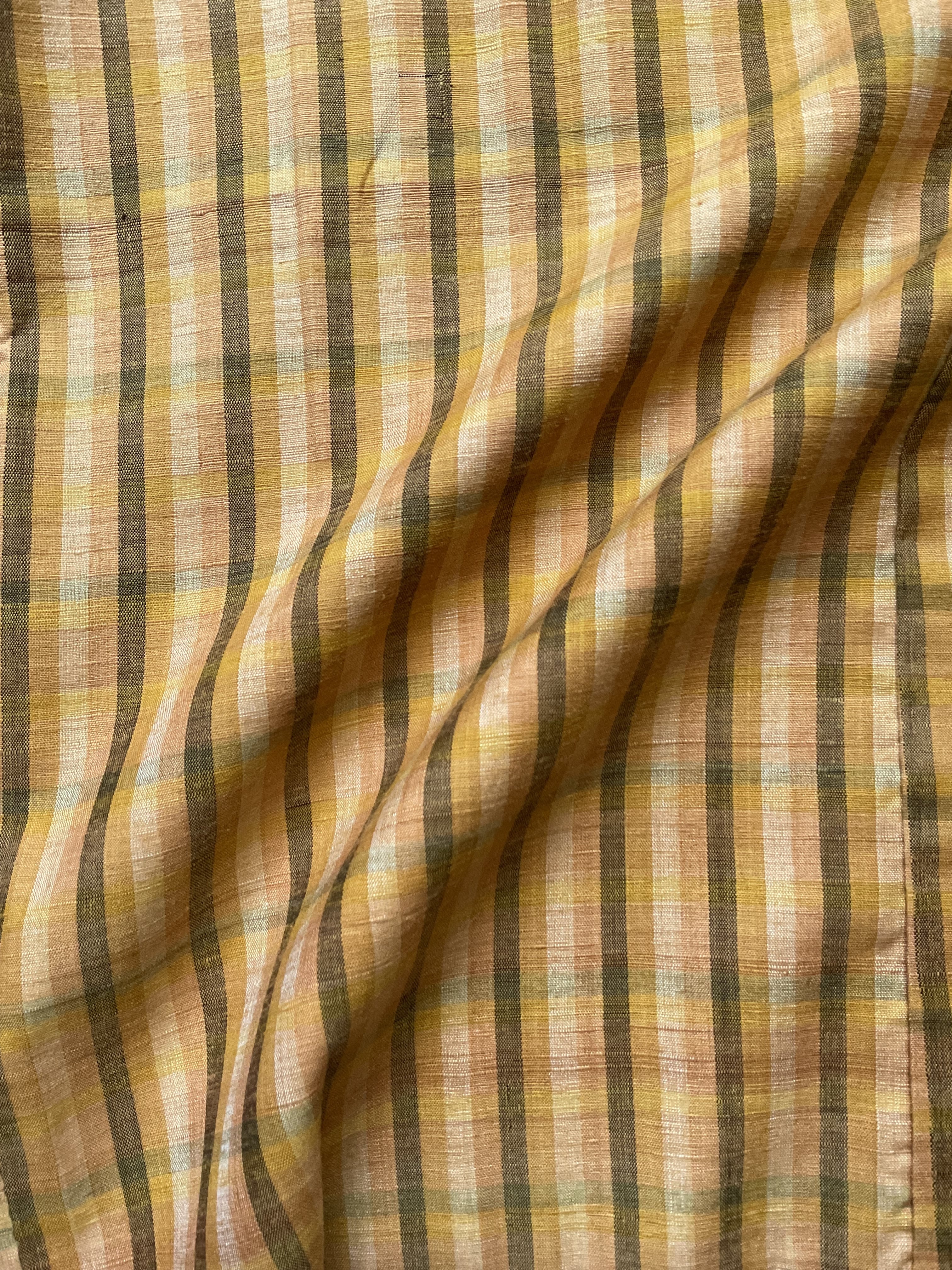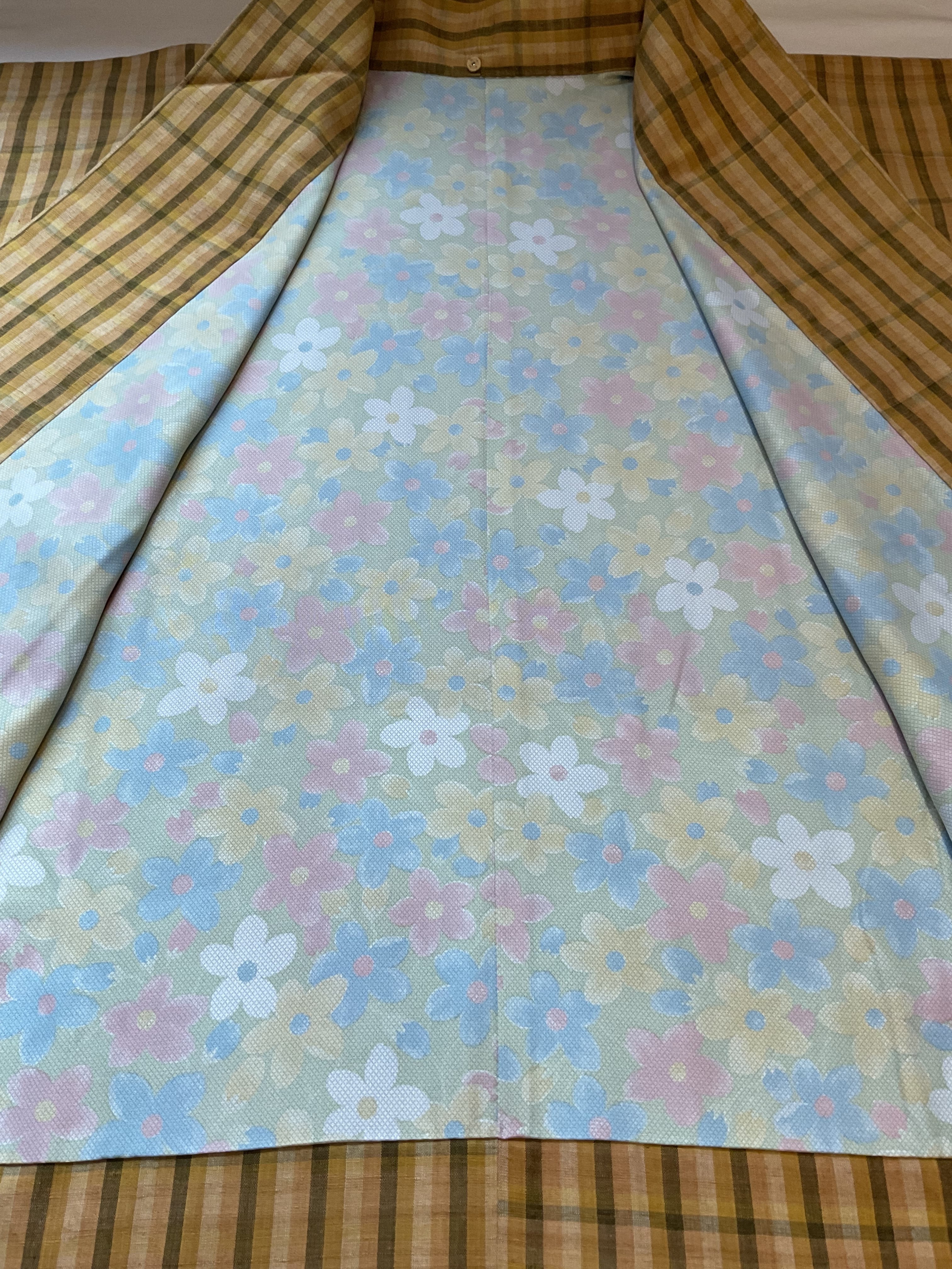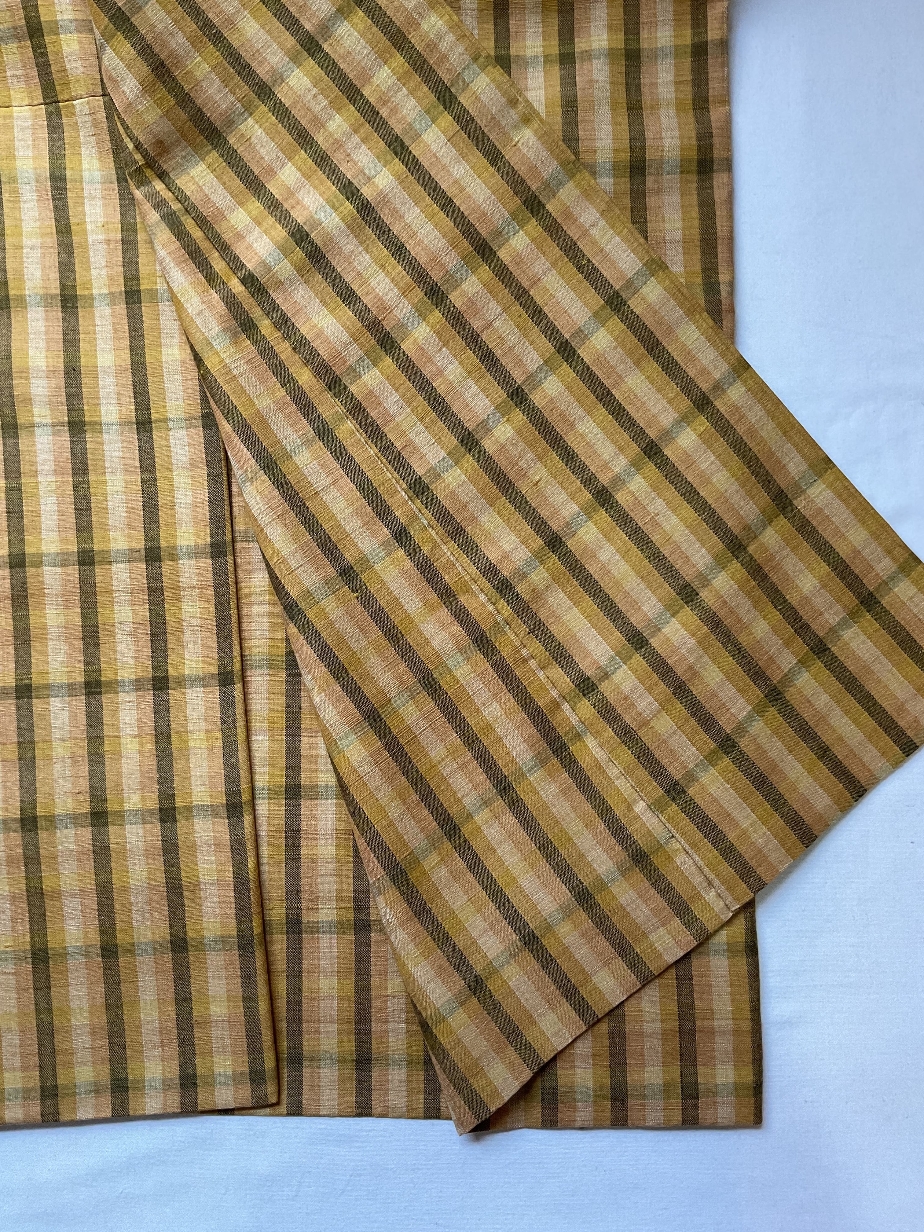 明るい目の黄土色地に、格子の緑色が春の芽吹きを感じさせる道中着です。
