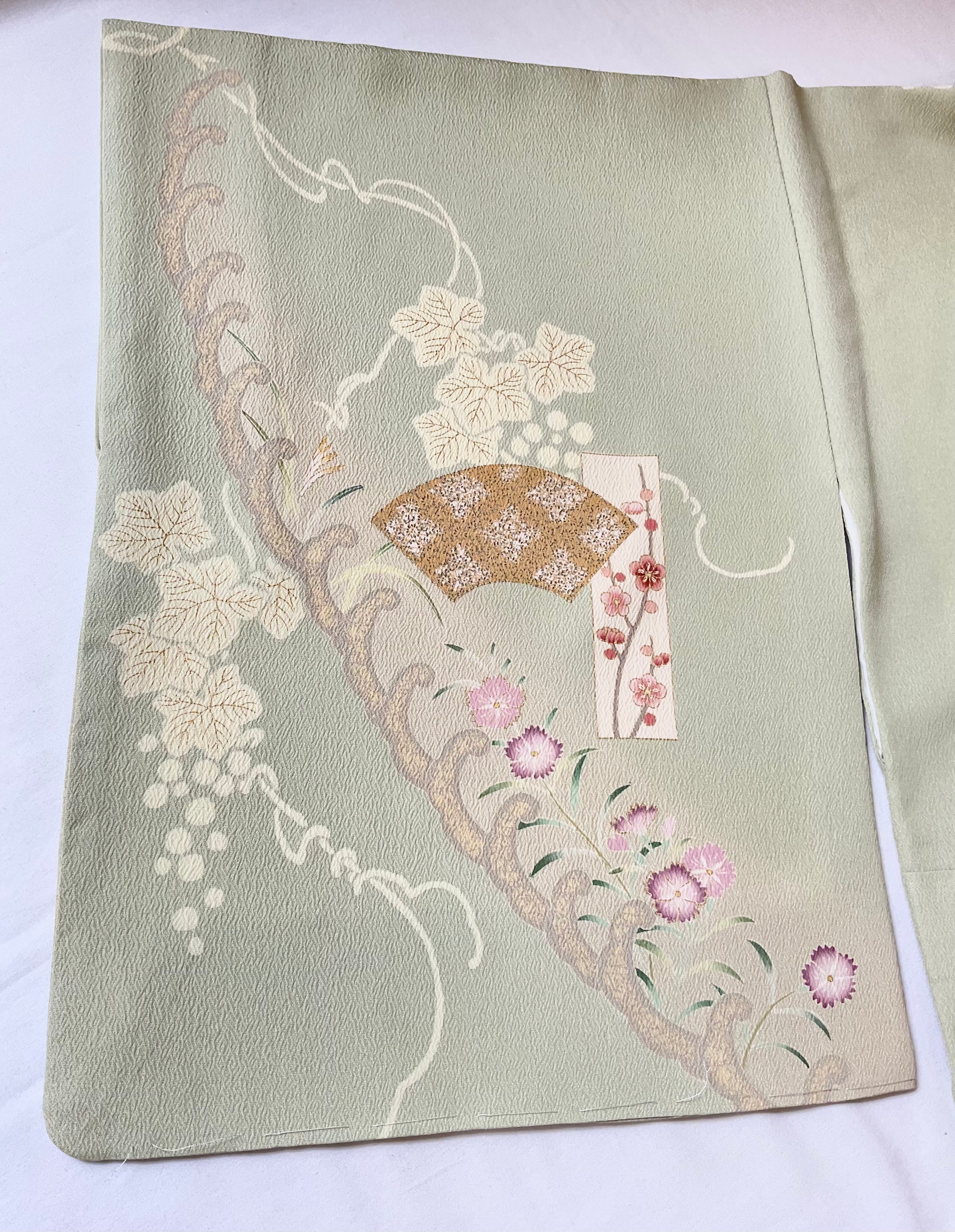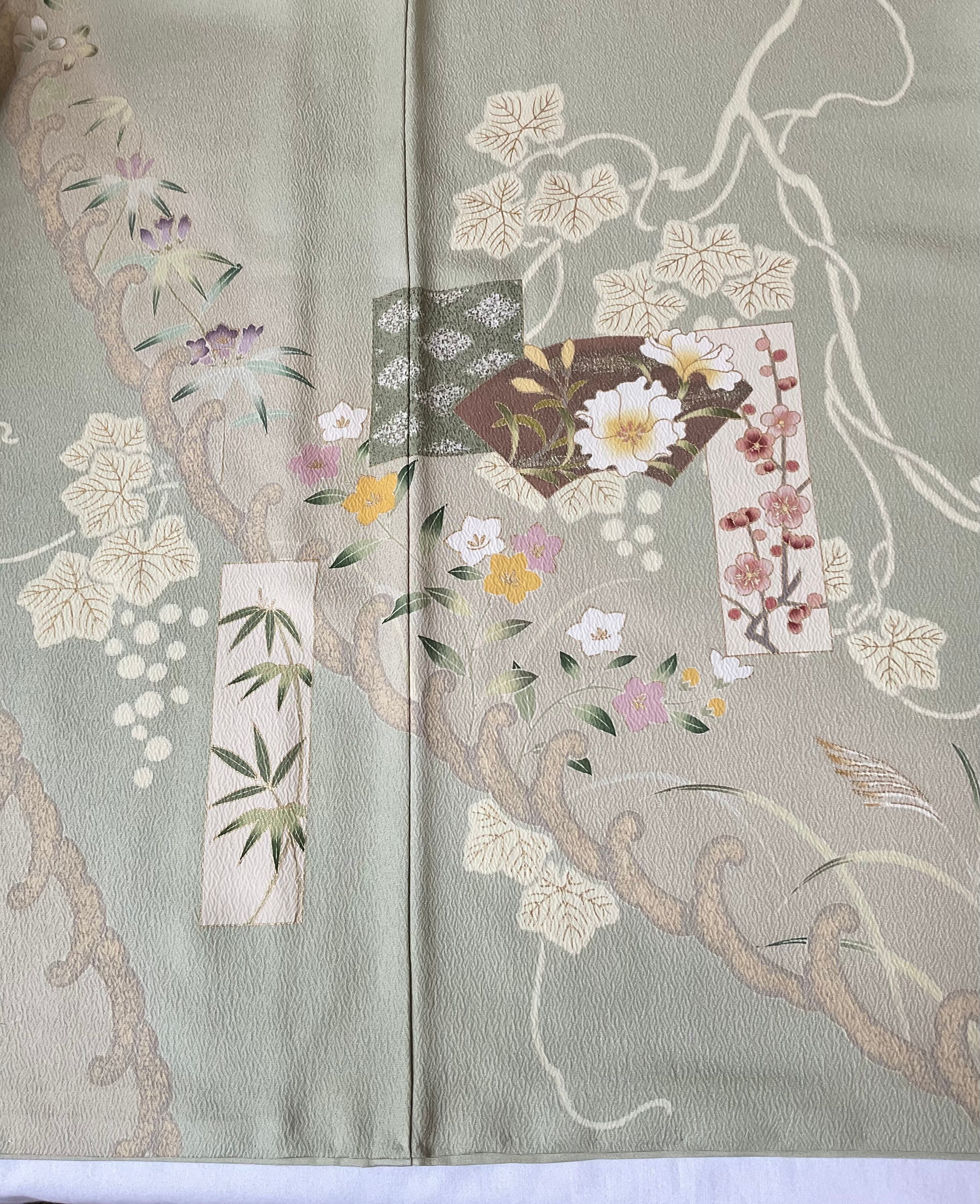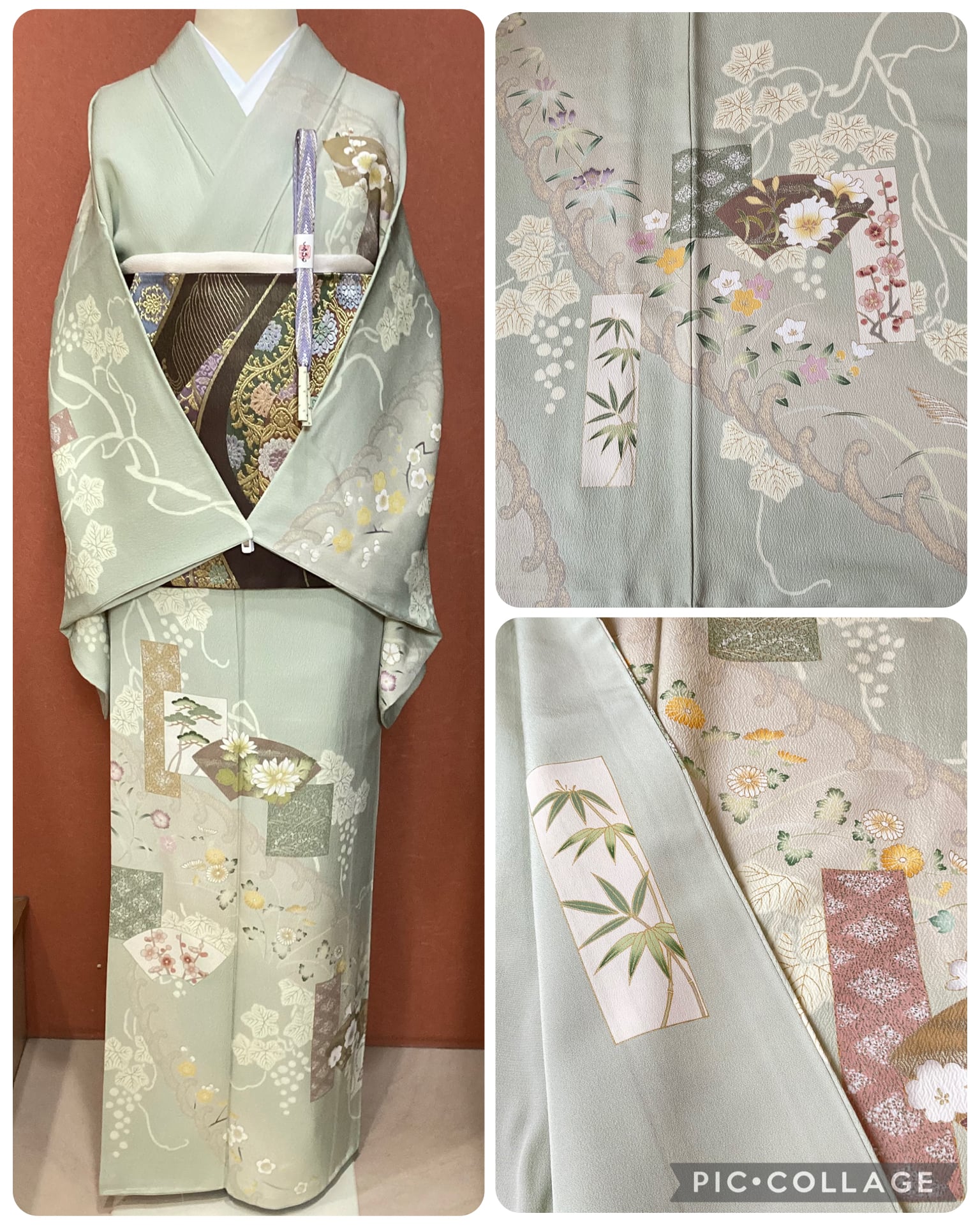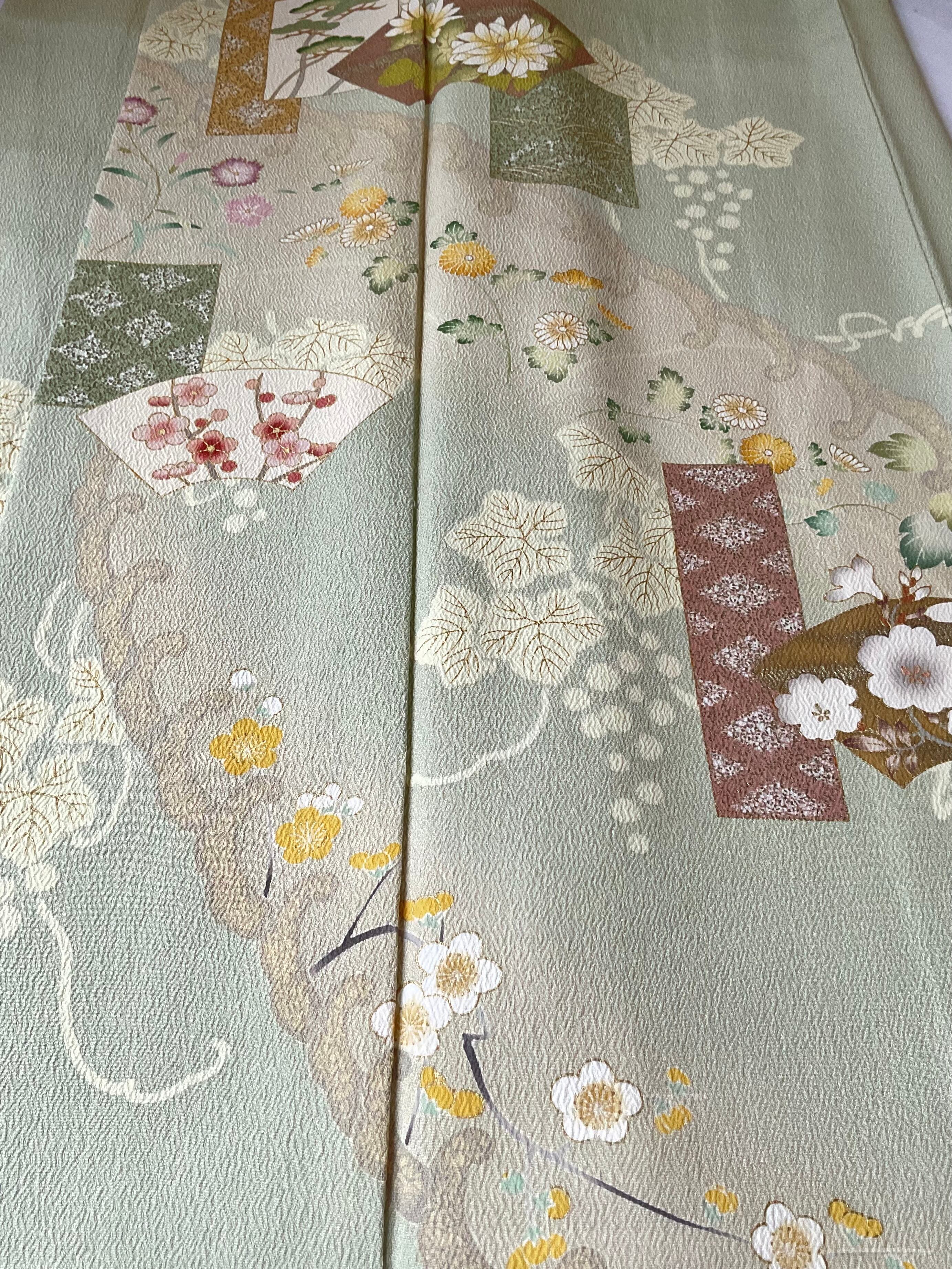 白みがかった淡い黄緑色に染められた丹後縮緬地のベースの上に、たっぷりと日本の季節の花々が柄付けされた美しい訪問着です。扇や短冊が配置され、松竹梅や藤や菊、そして葡萄の蔓の曲線が重なるように贅沢に染められております。裾の柄、そして背中から肩、袖への柄付けもたっぷりとされております。吉祥文様が格調高く、豪華な柄付けが華やかですが、お色目の優しさと柔らかさが調和しており派手にならず、はんなりとした上品な訪問着でございます。