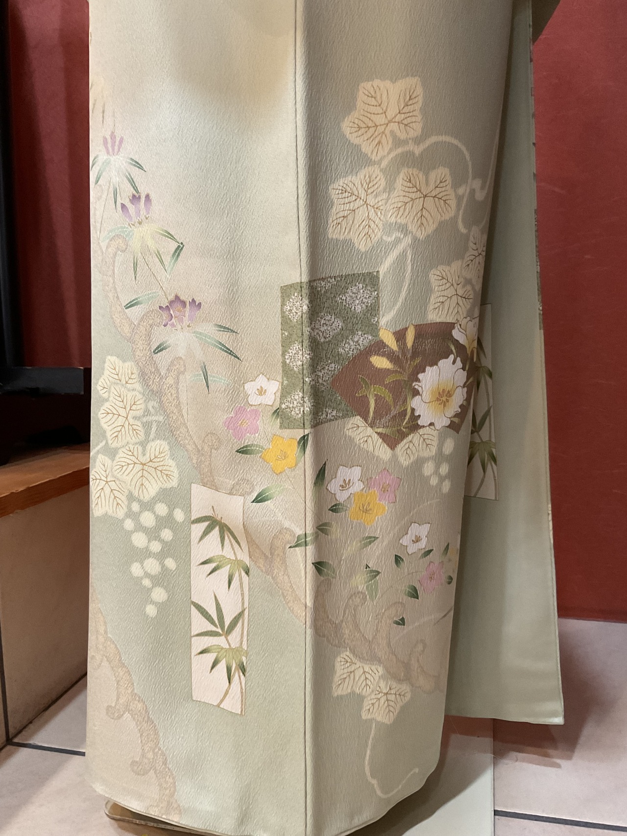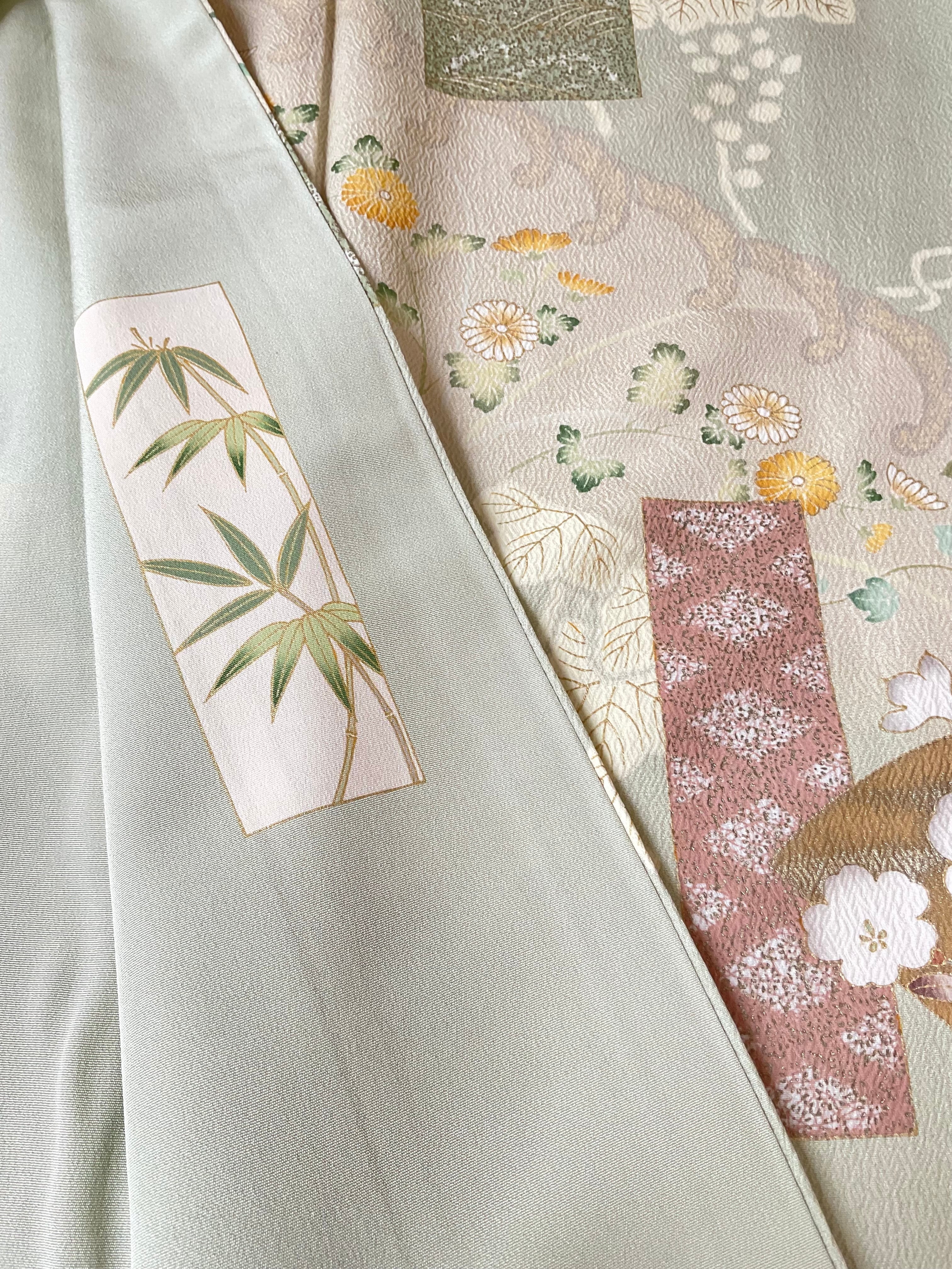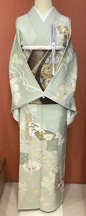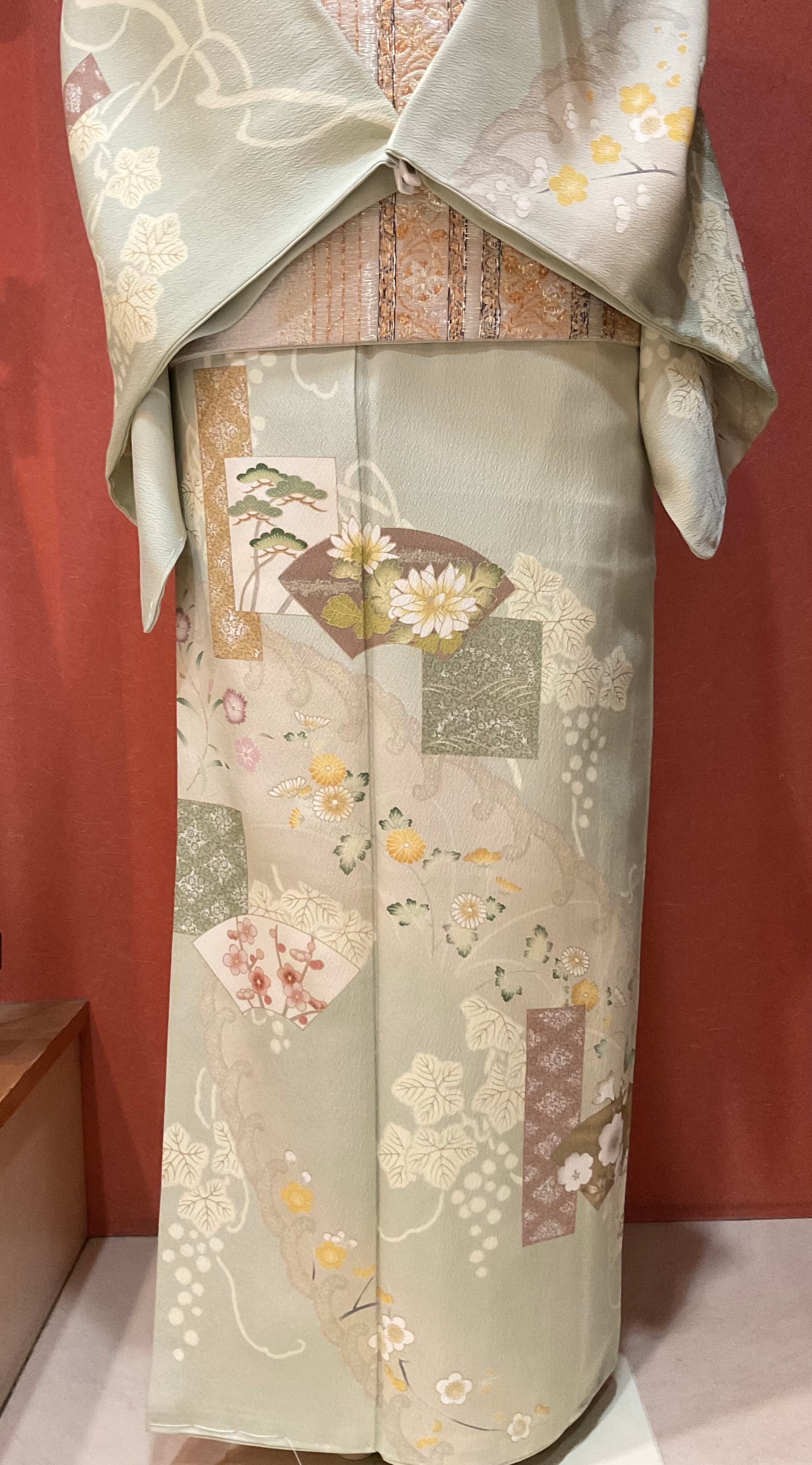 白みがかった淡い黄緑色に染められた丹後縮緬地のベースの上に、たっぷりと日本の季節の花々が柄付けされた美しい訪問着です。扇や短冊が配置され、松竹梅や藤や菊、そして葡萄の蔓の曲線が重なるように贅沢に染められております。裾の柄、そして背中から肩、袖への柄付けもたっぷりとされております。吉祥文様が格調高く、豪華な柄付けが華やかですが、お色目の優しさと柔らかさが調和しており派手にならず、はんなりとした上品な訪問着でございます。