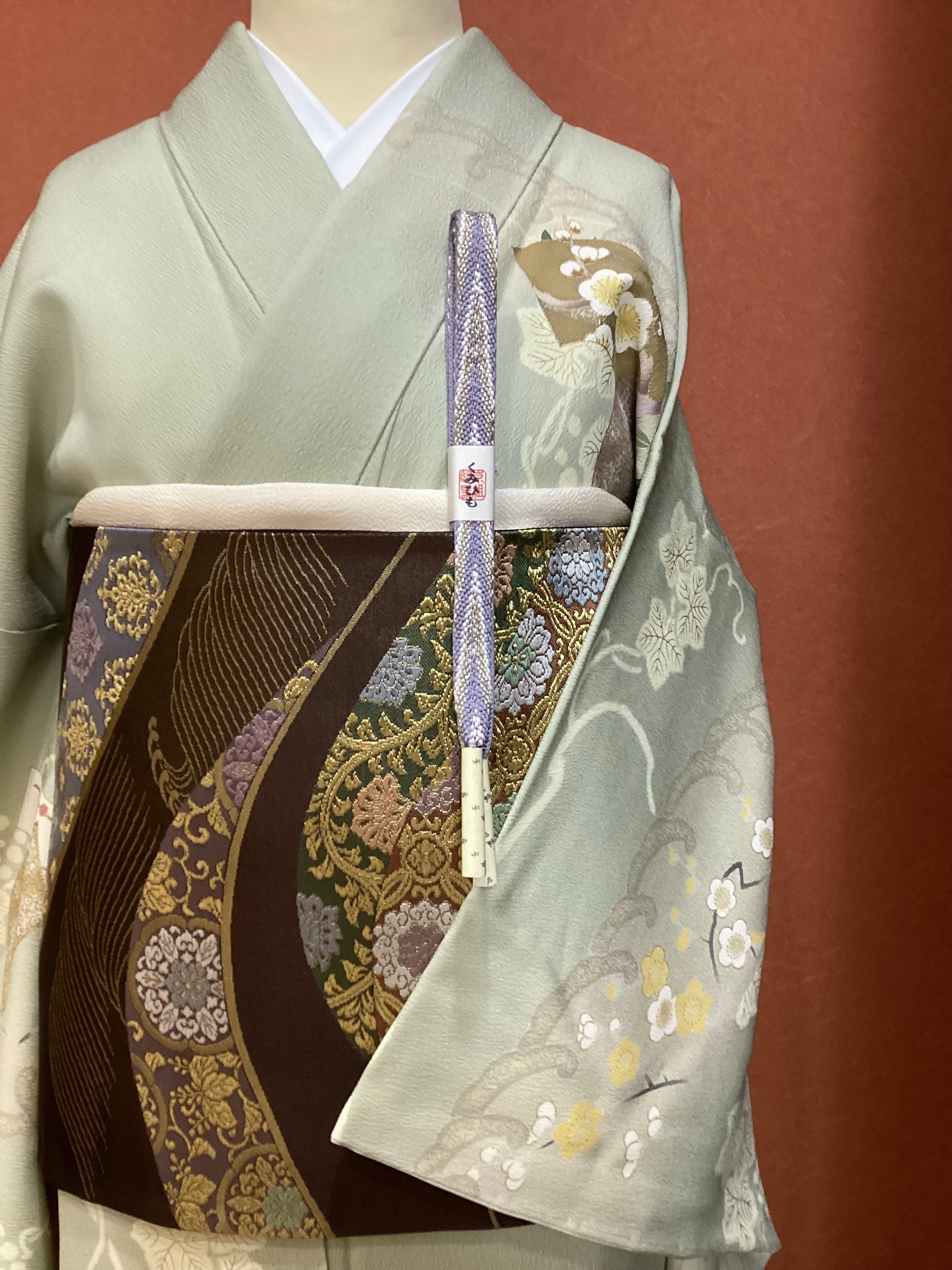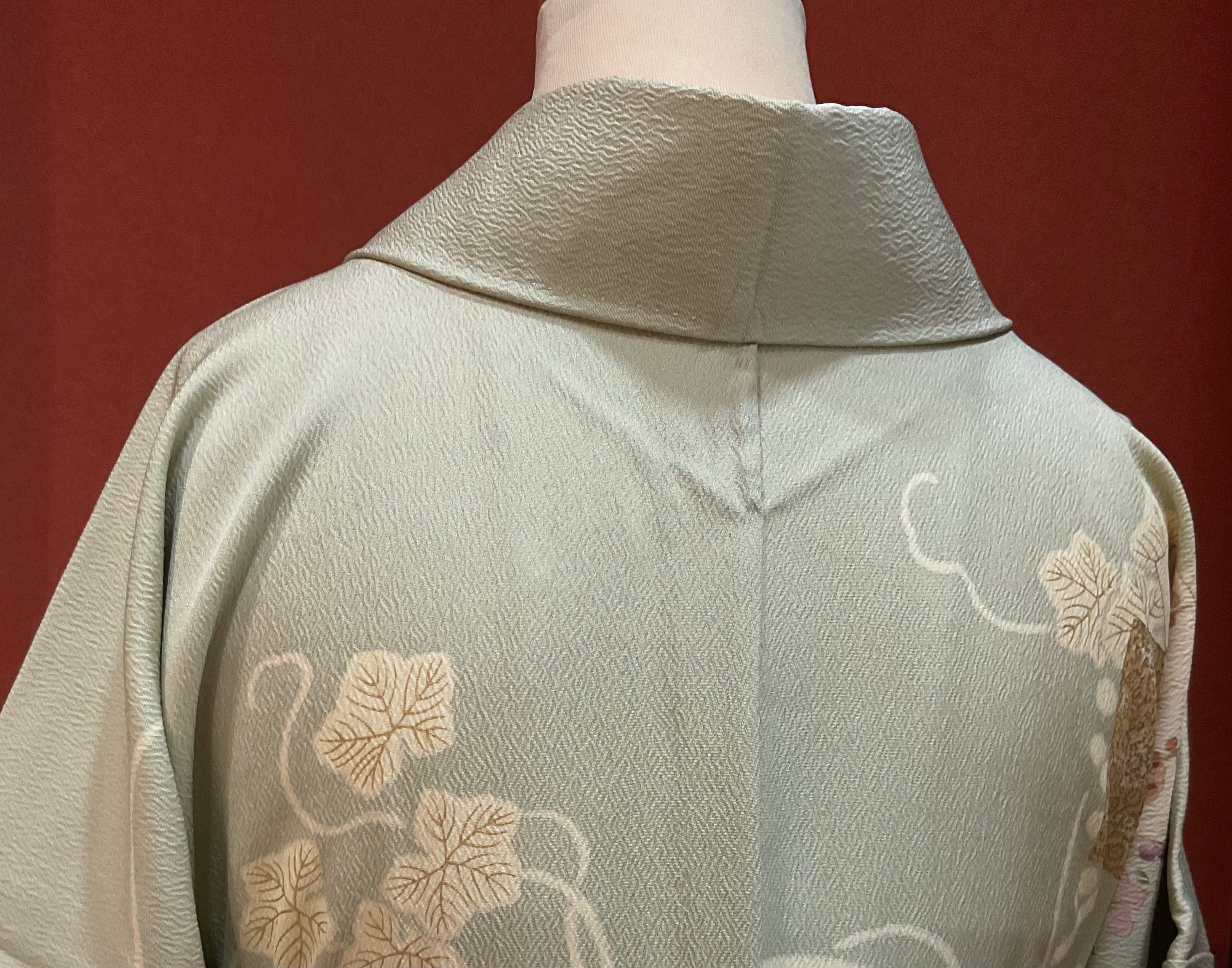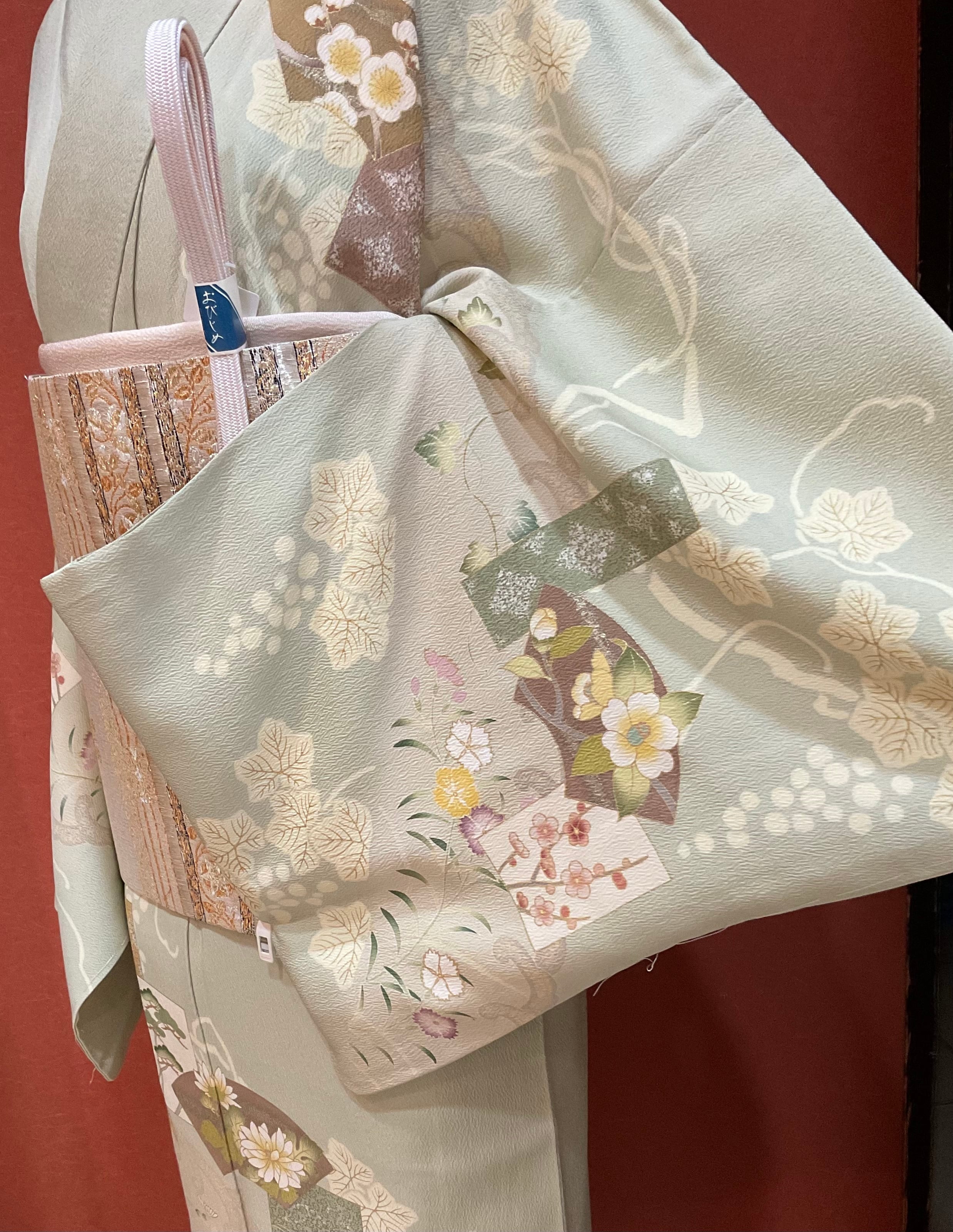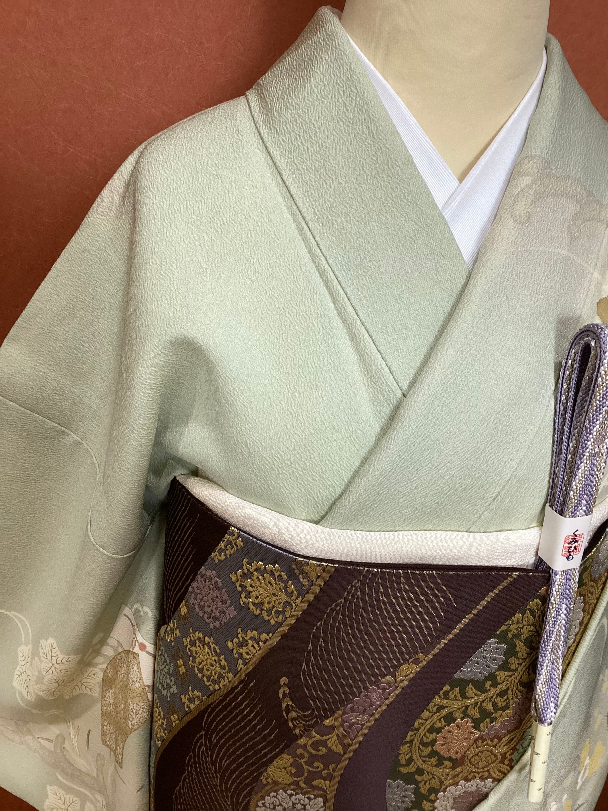 白みがかった淡い黄緑色に染められた丹後縮緬地のベースの上に、たっぷりと日本の季節の花々が柄付けされた美しい訪問着です。扇や短冊が配置され、松竹梅や藤や菊、そして葡萄の蔓の曲線が重なるように贅沢に染められております。裾の柄、そして背中から肩、袖への柄付けもたっぷりとされております。吉祥文様が格調高く、豪華な柄付けが華やかですが、お色目の優しさと柔らかさが調和しており派手にならず、はんなりとした上品な訪問着でございます。