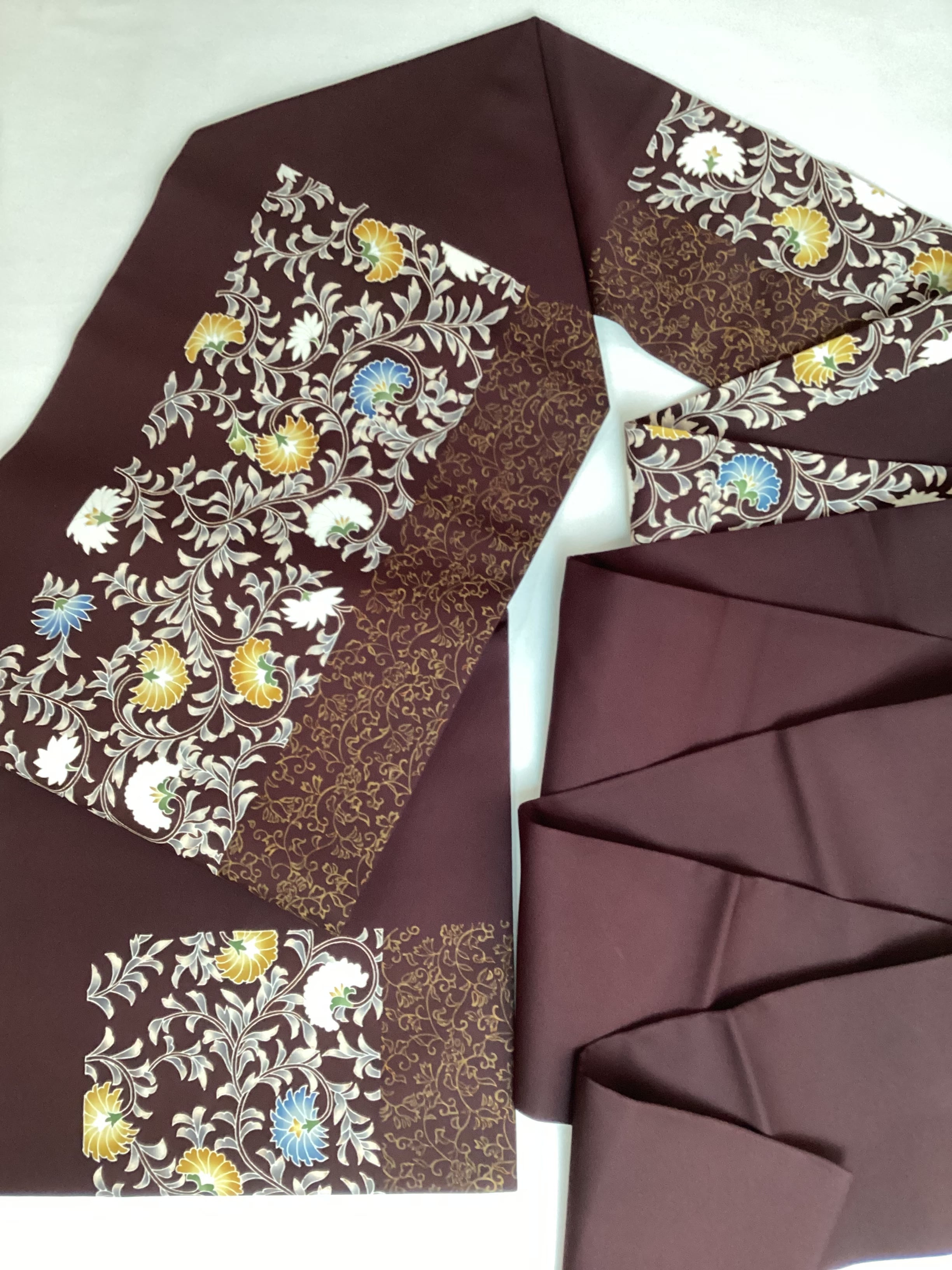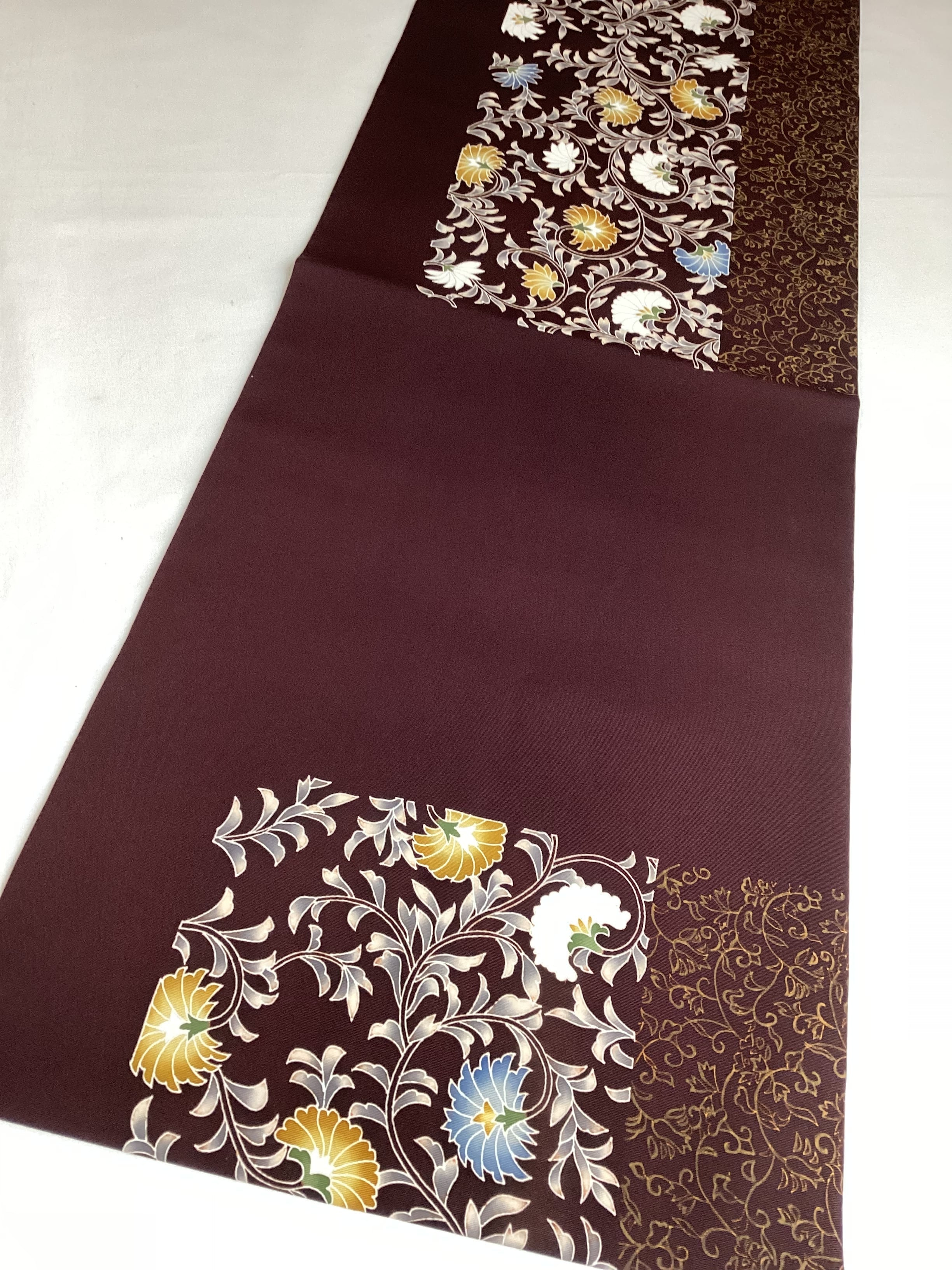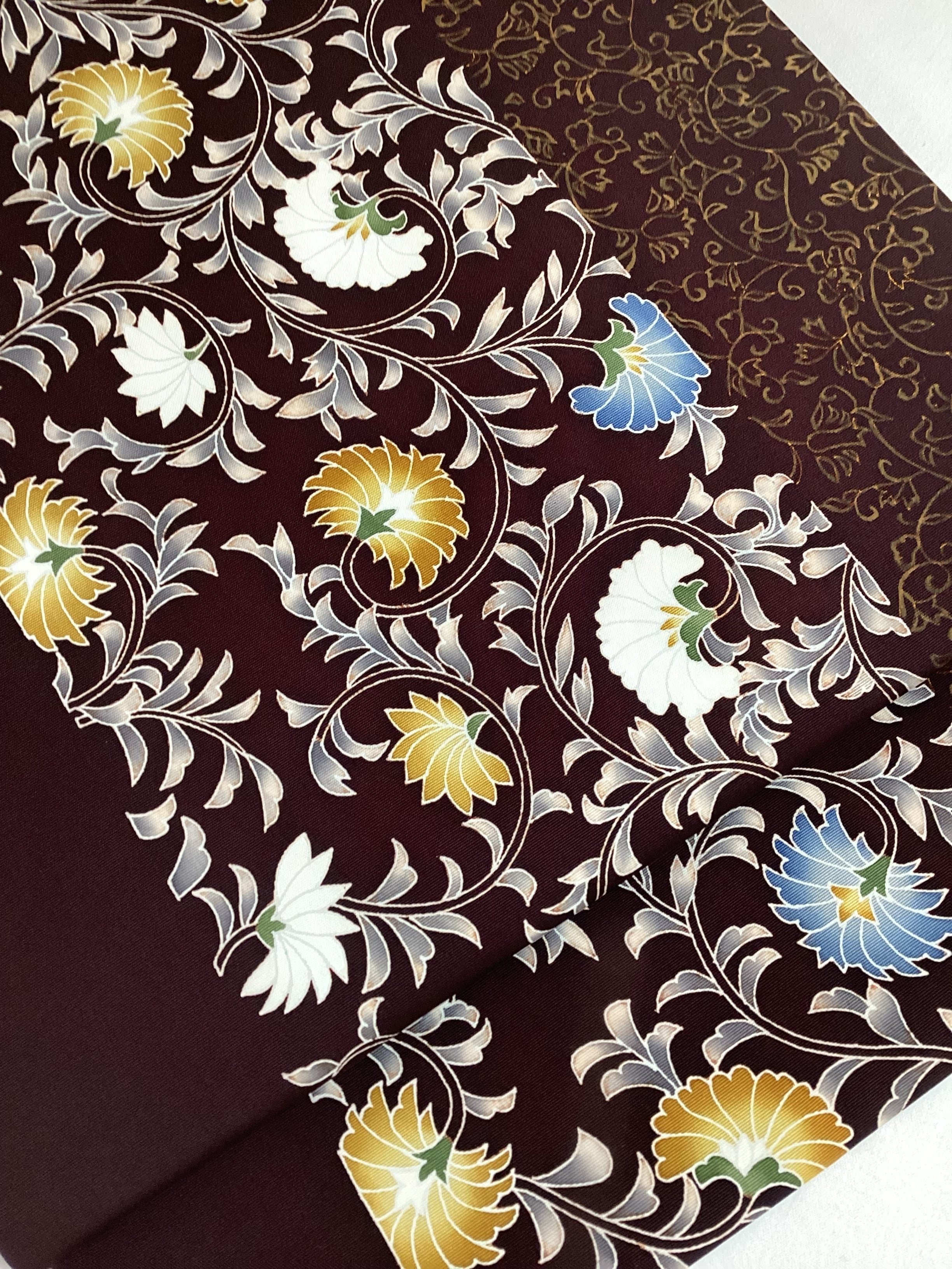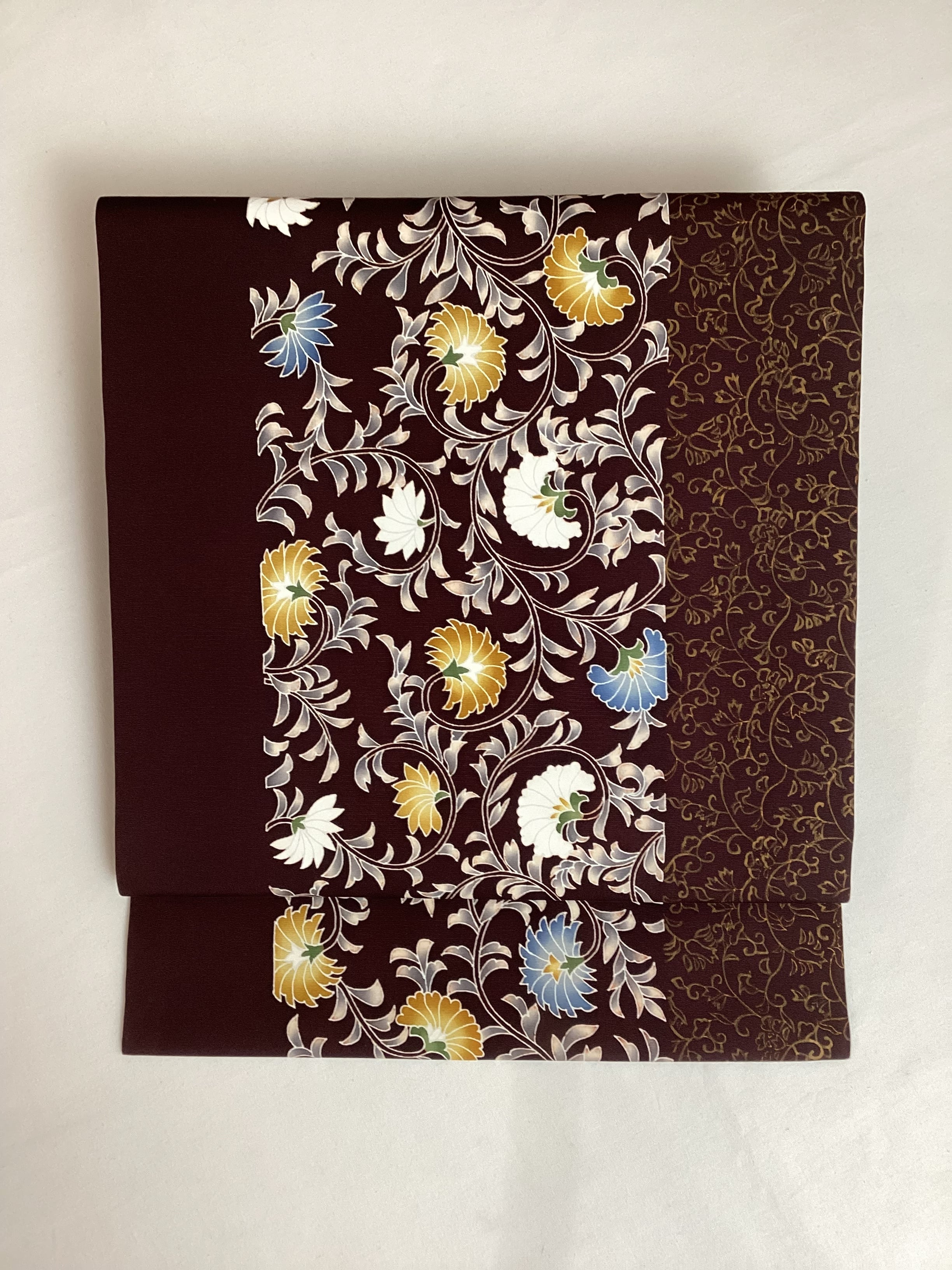 深みのある黒みがかった濃い紫色の塩瀬地に、流れるような花唐草文様が落ち着いた華やかな着姿を演出してくれる染め帯です。アシンメトリーに片側に配されたハンドタッチの唐花文様が変化を付けて洒落味を添えています。小紋、江戸小紋、色無地や、軽めの附下にコーディネートして観劇やお食事会などにいかがでしょうか。季節や流行に左右されず長くご愛用いただけるお品です。