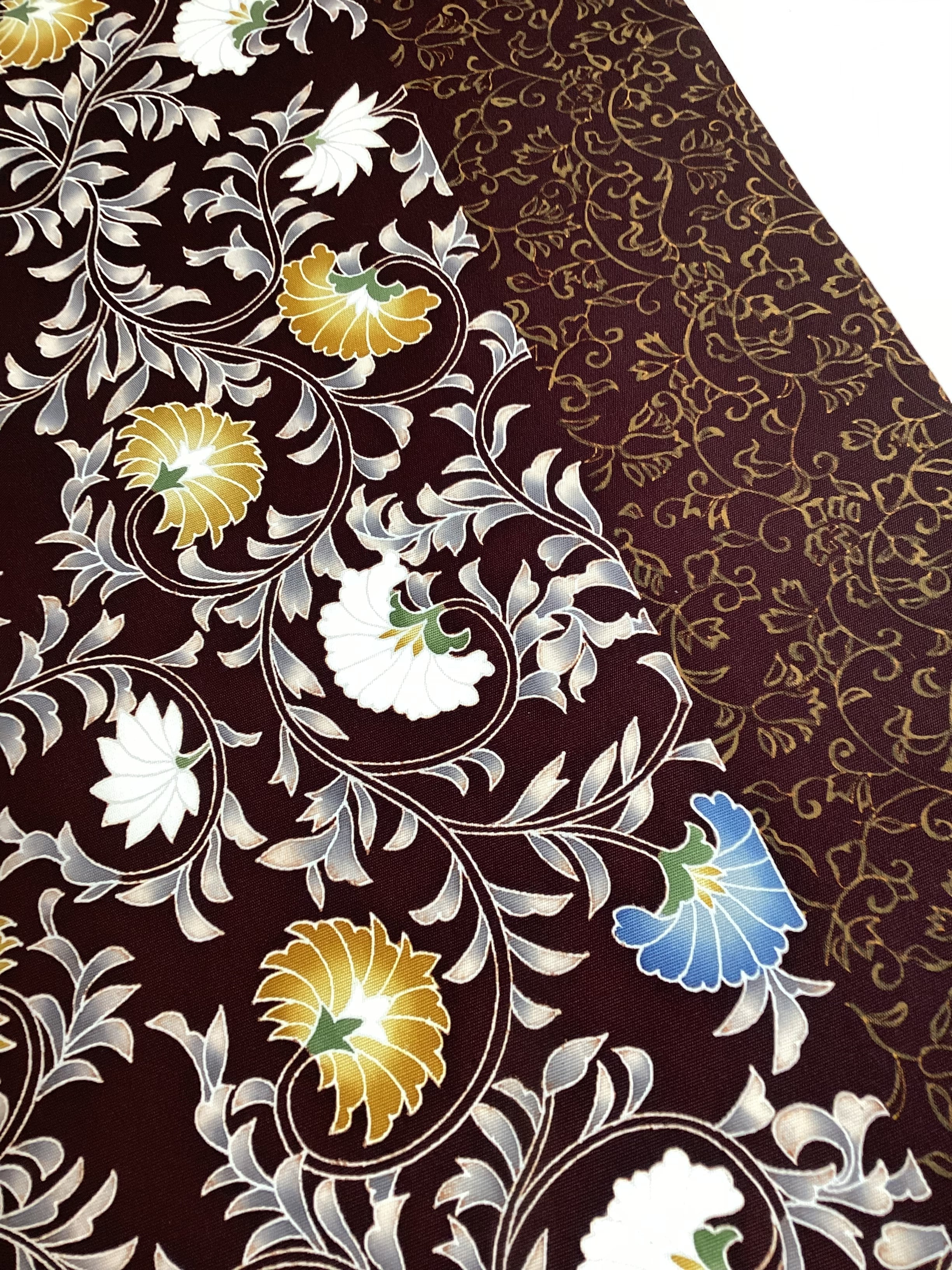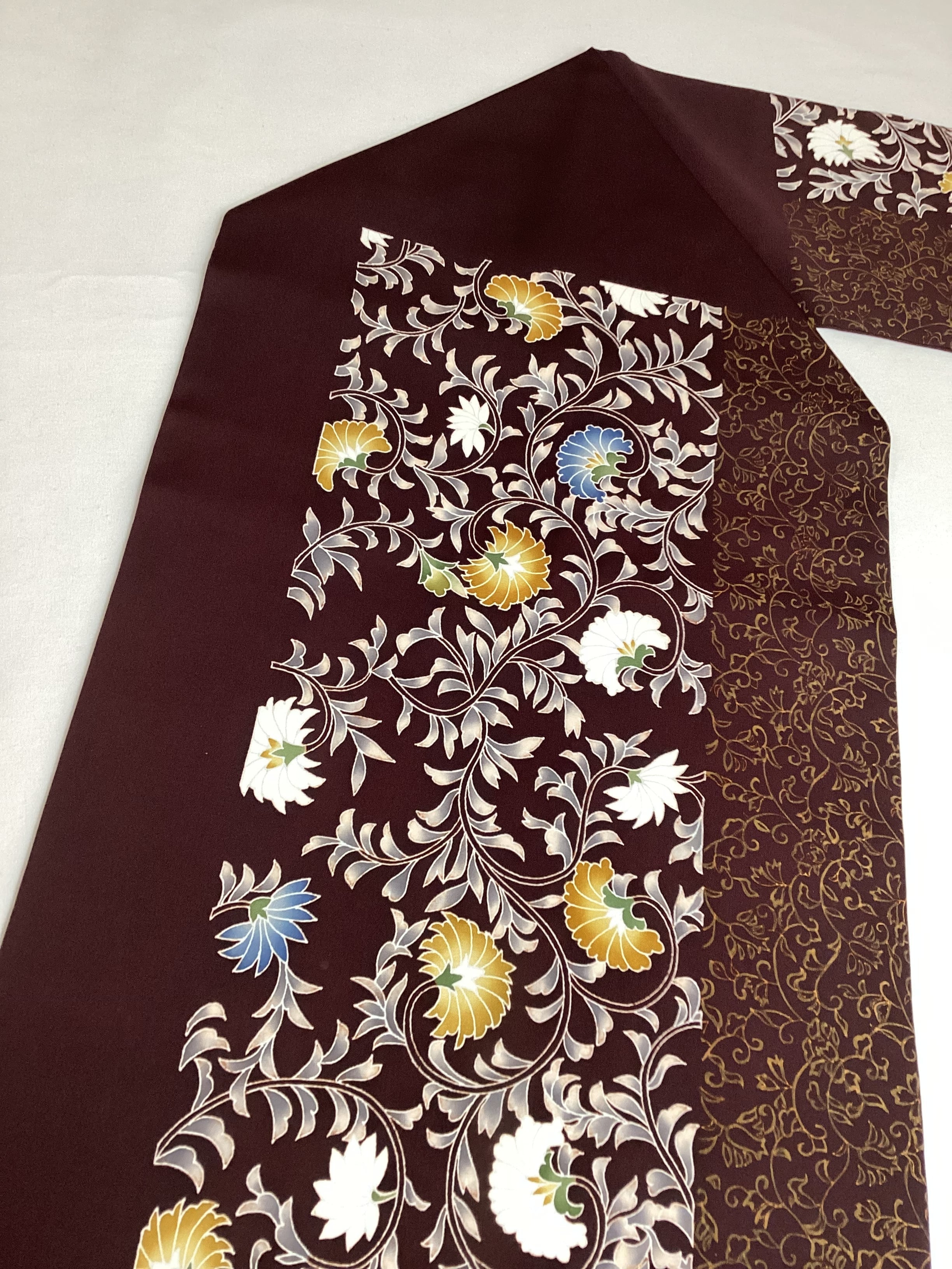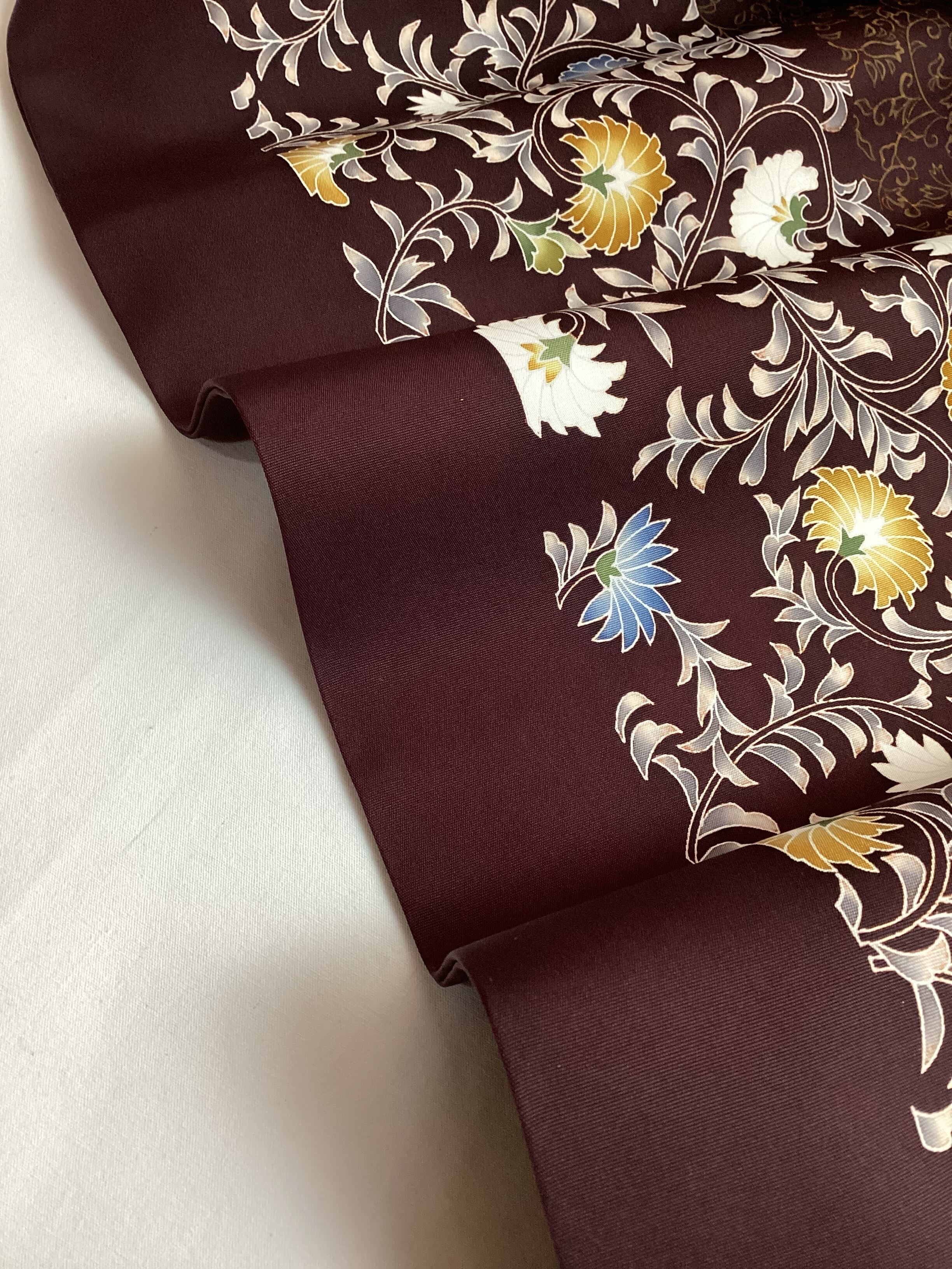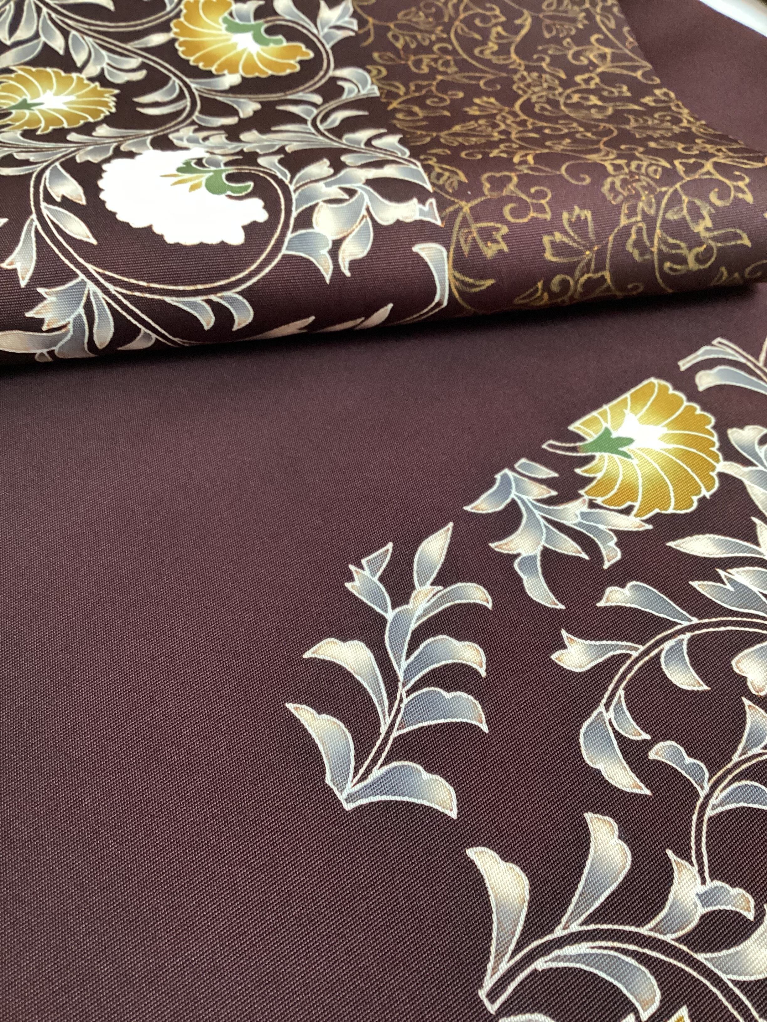 深みのある黒みがかった濃い紫色の塩瀬地に、流れるような花唐草文様が落ち着いた華やかな着姿を演出してくれる染め帯です。アシンメトリーに片側に配されたハンドタッチの唐花文様が変化を付けて洒落味を添えています。小紋、江戸小紋、色無地や、軽めの附下にコーディネートして観劇やお食事会などにいかがでしょうか。季節や流行に左右されず長くご愛用いただけるお品です。