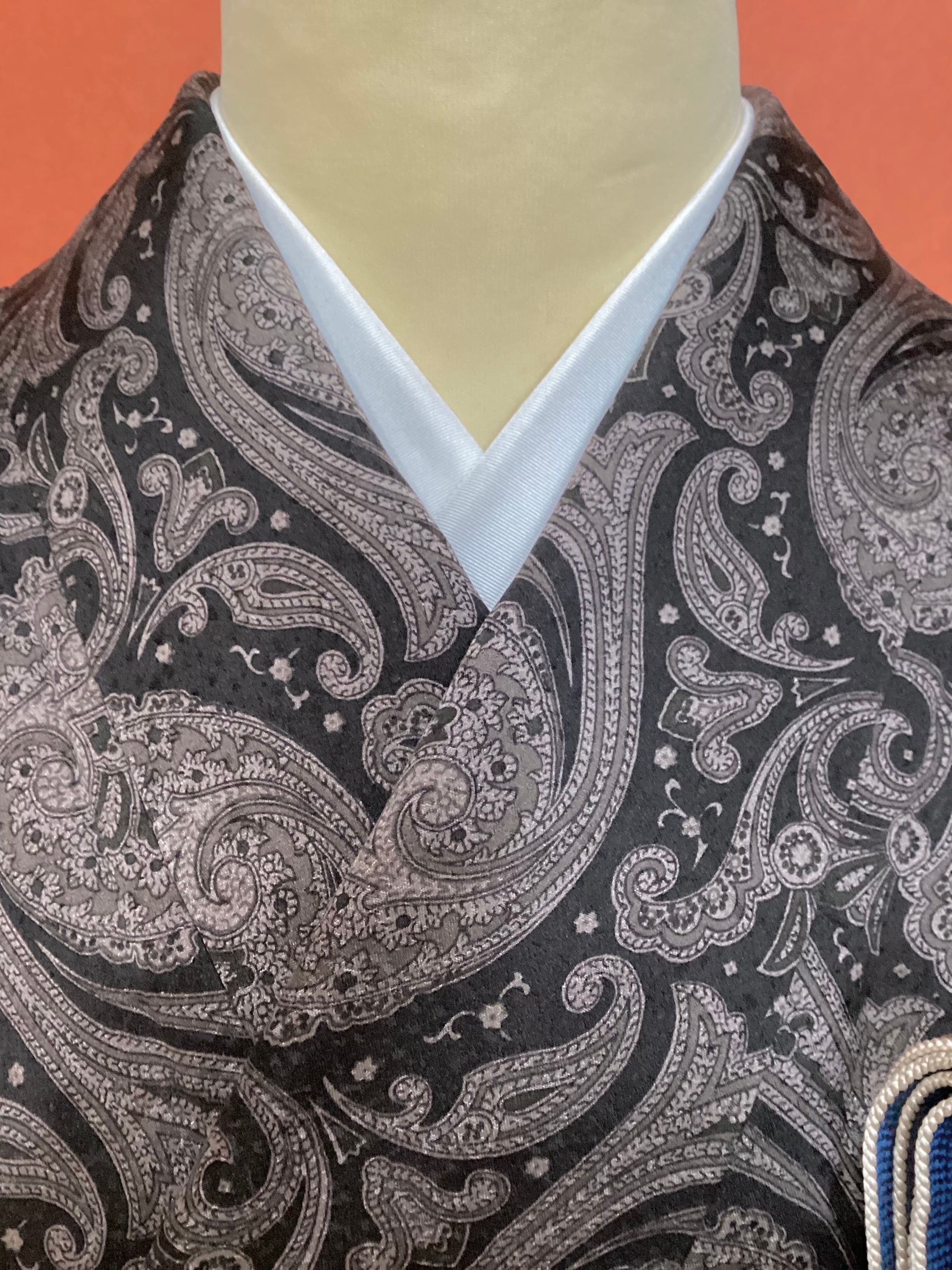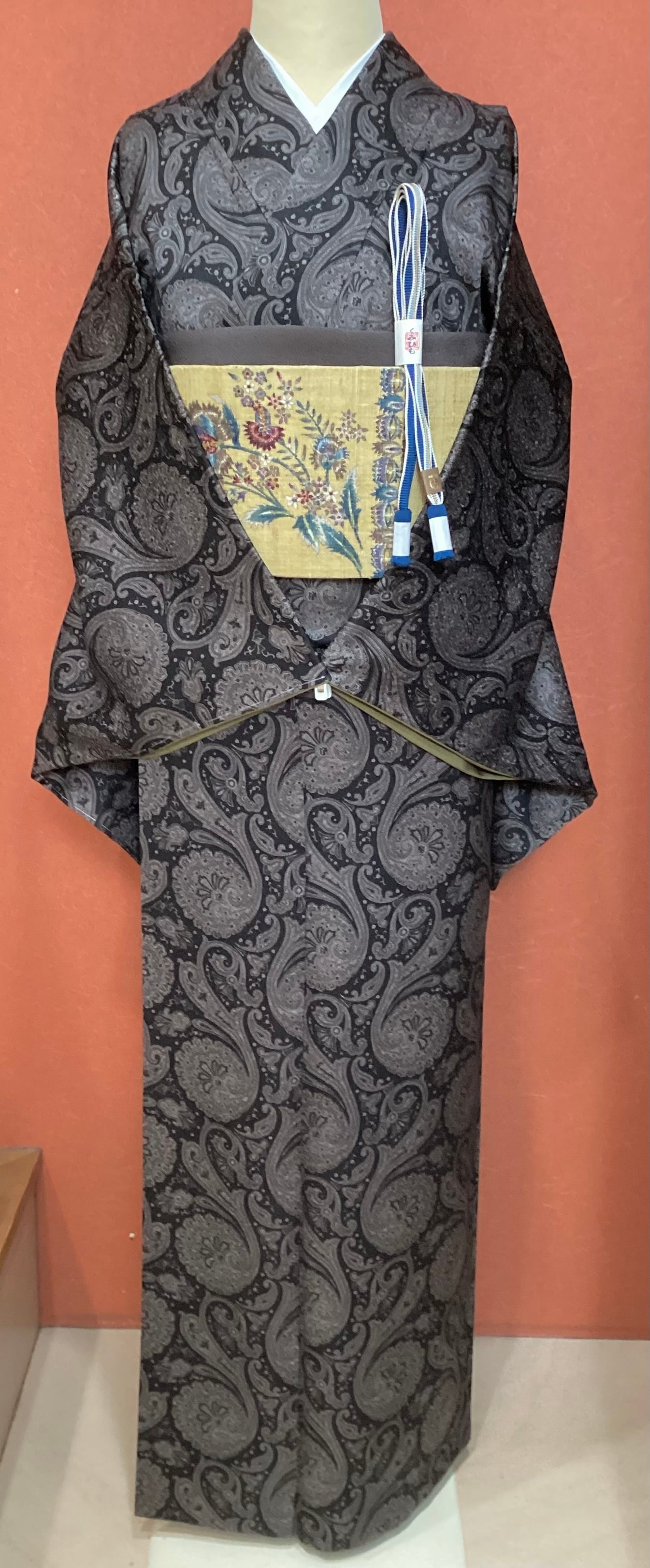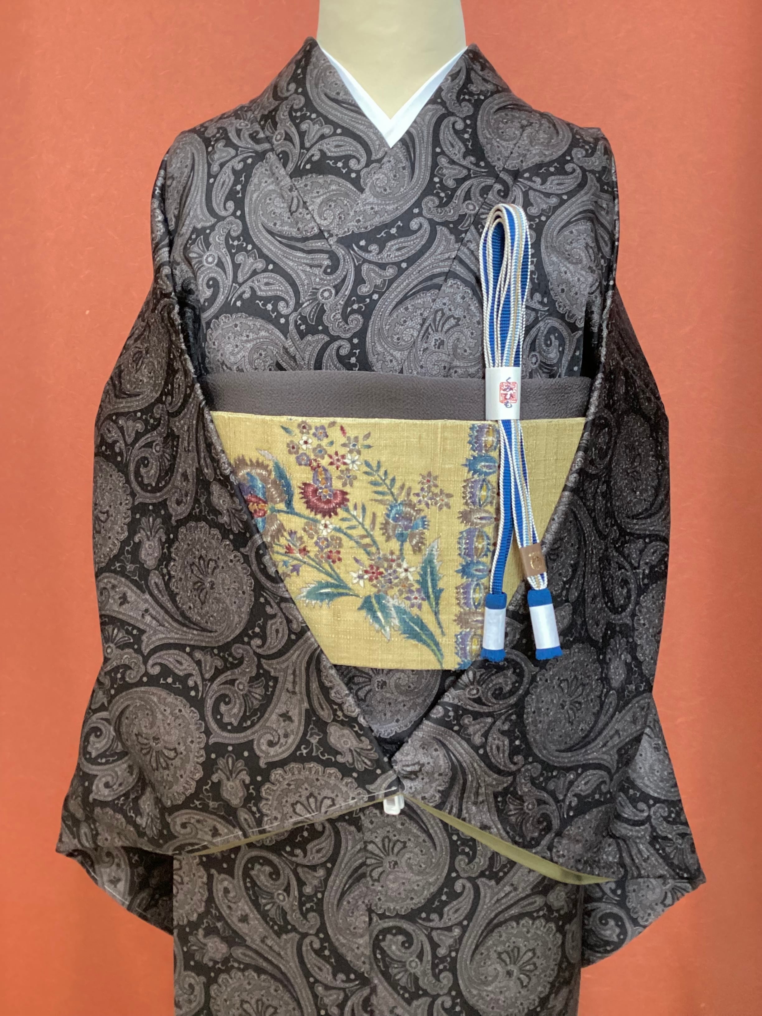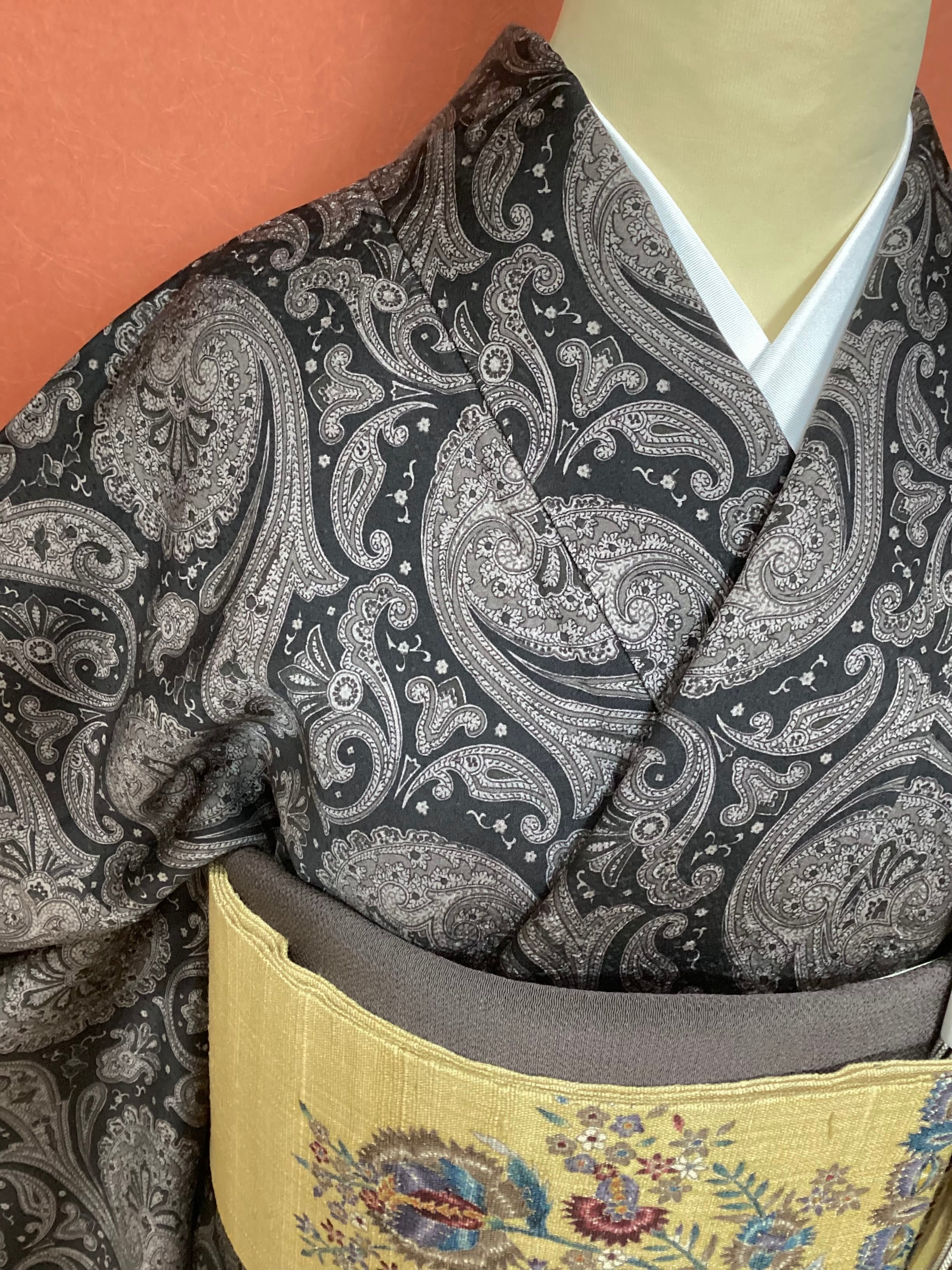 モノトーンのワンピース感覚でお召しになっていただけるペイズリー文様のお洒落小紋です。少し起毛したようにも感じられるふんわりとした手触りで重厚感のある織地です。異国情緒がありながら配色を抑えることで和装に自然に溶け込む通好みな小紋で、年齢を問わずにお召しいただけます。改まり過ぎずカジュアル過ぎない絶妙な雰囲気を持ち、シャイニーな帯を合わせてパーティや観劇へ、カジュアルな帯を合わせて気軽なお出掛けにと幅広いシーンに対応出来るお品です。身丈、身幅が十分ございますので、お探しの方はいかがでしょうか?