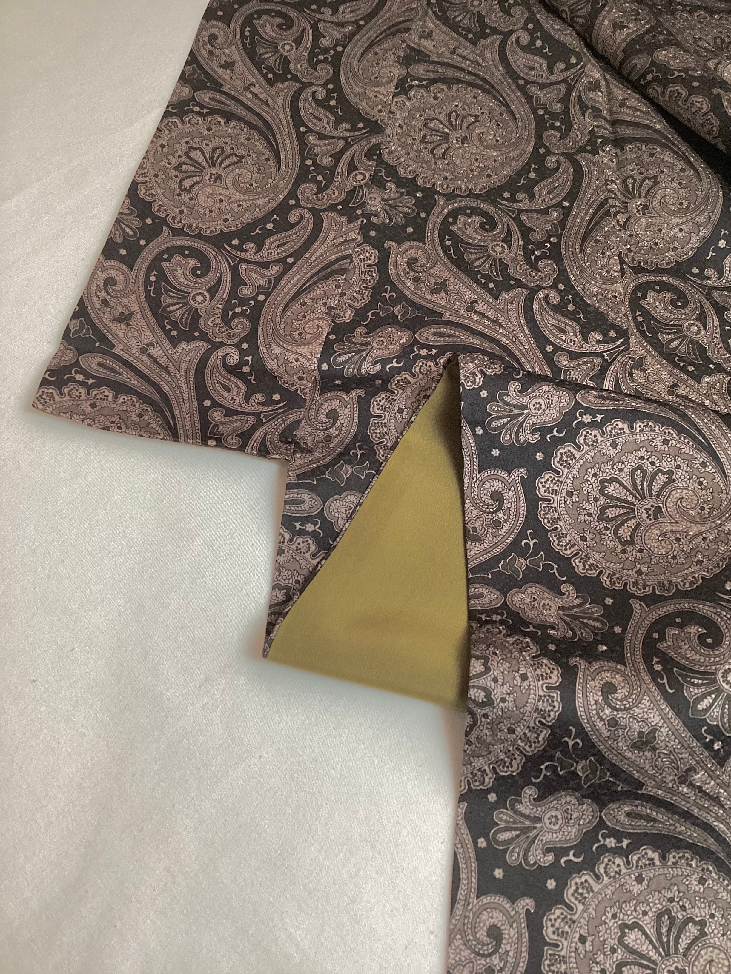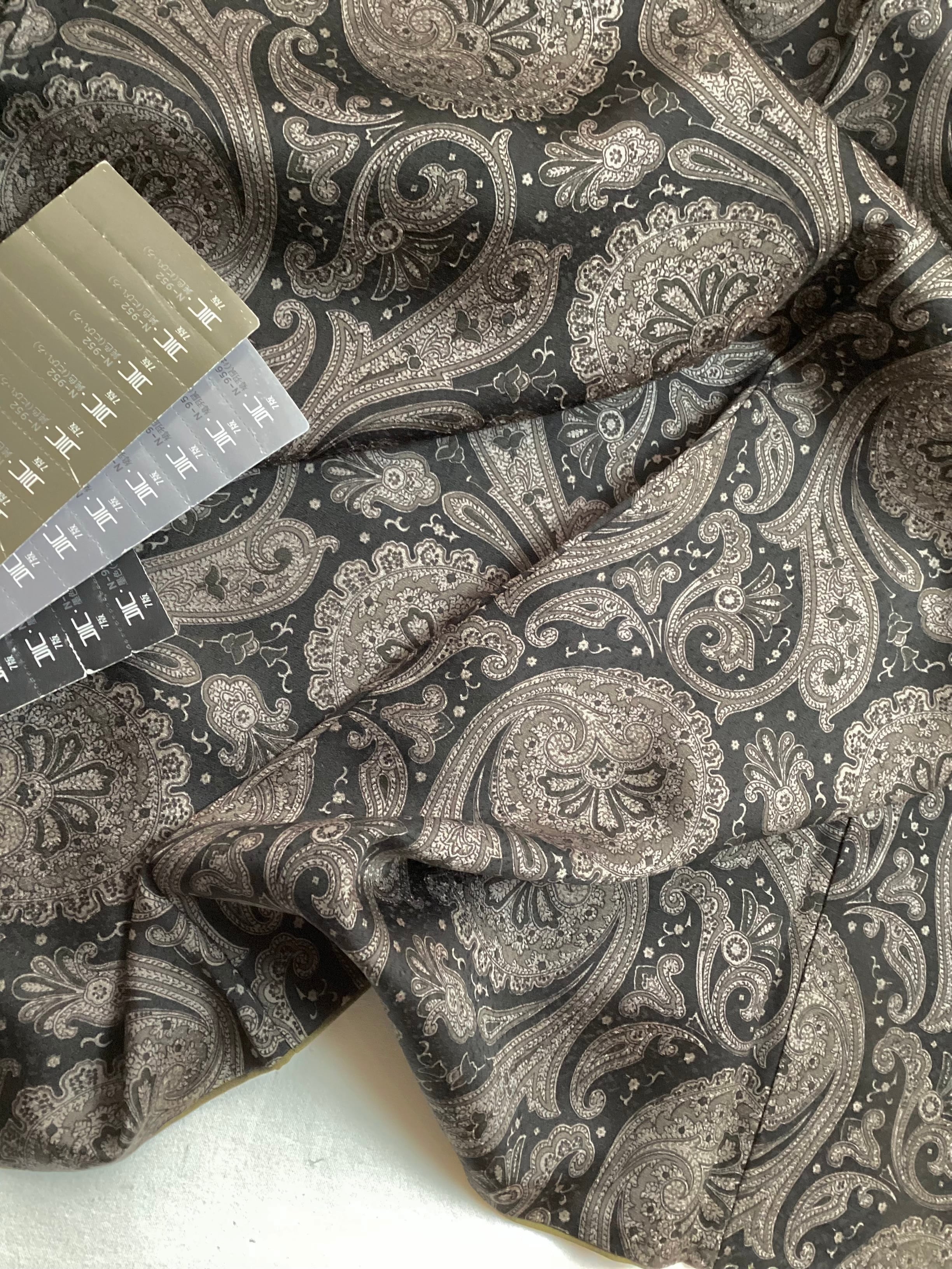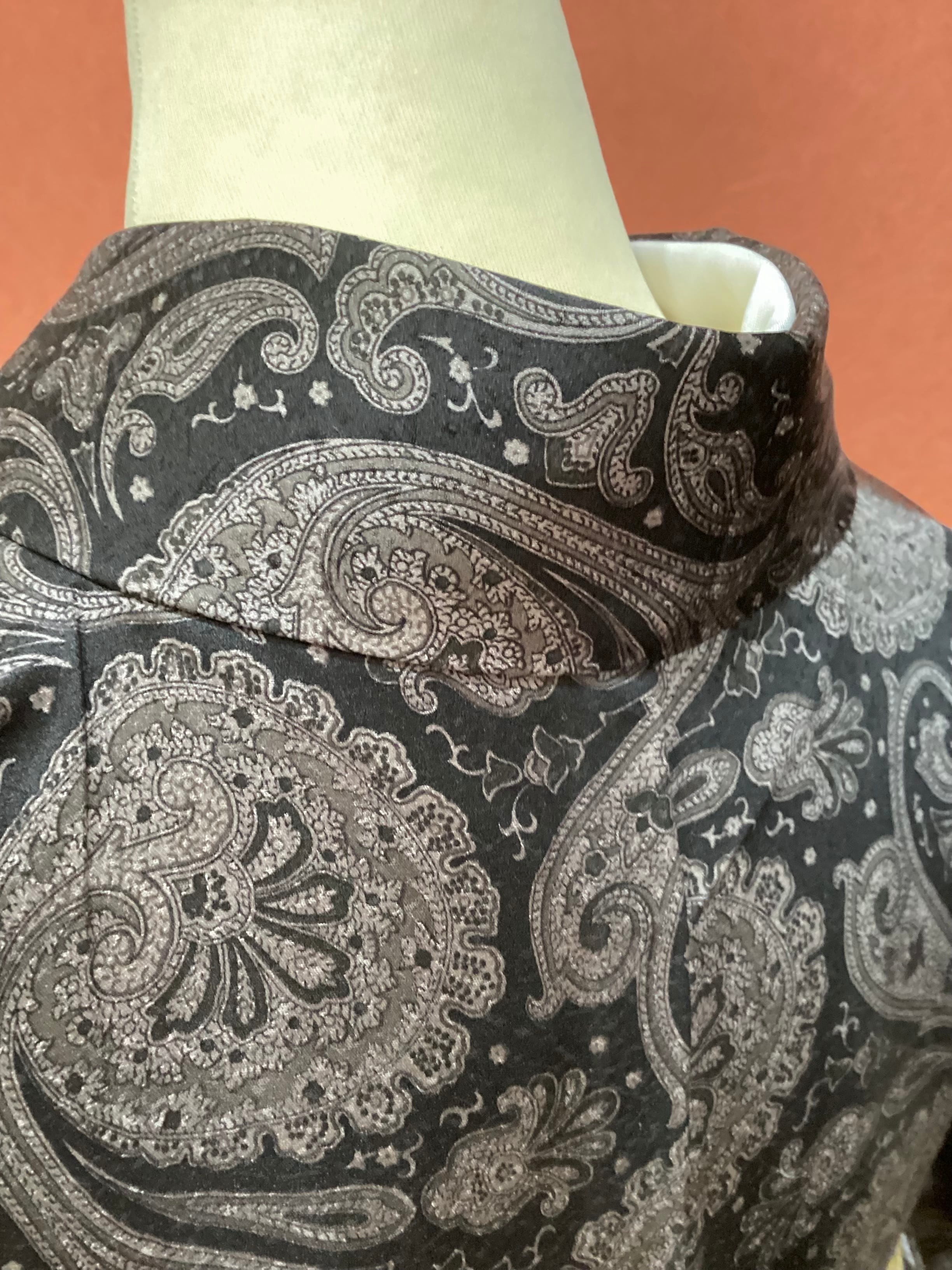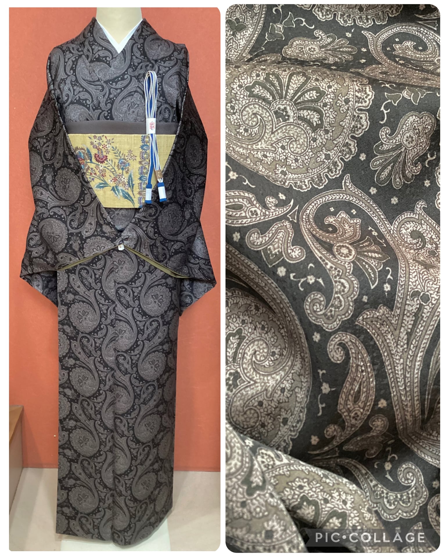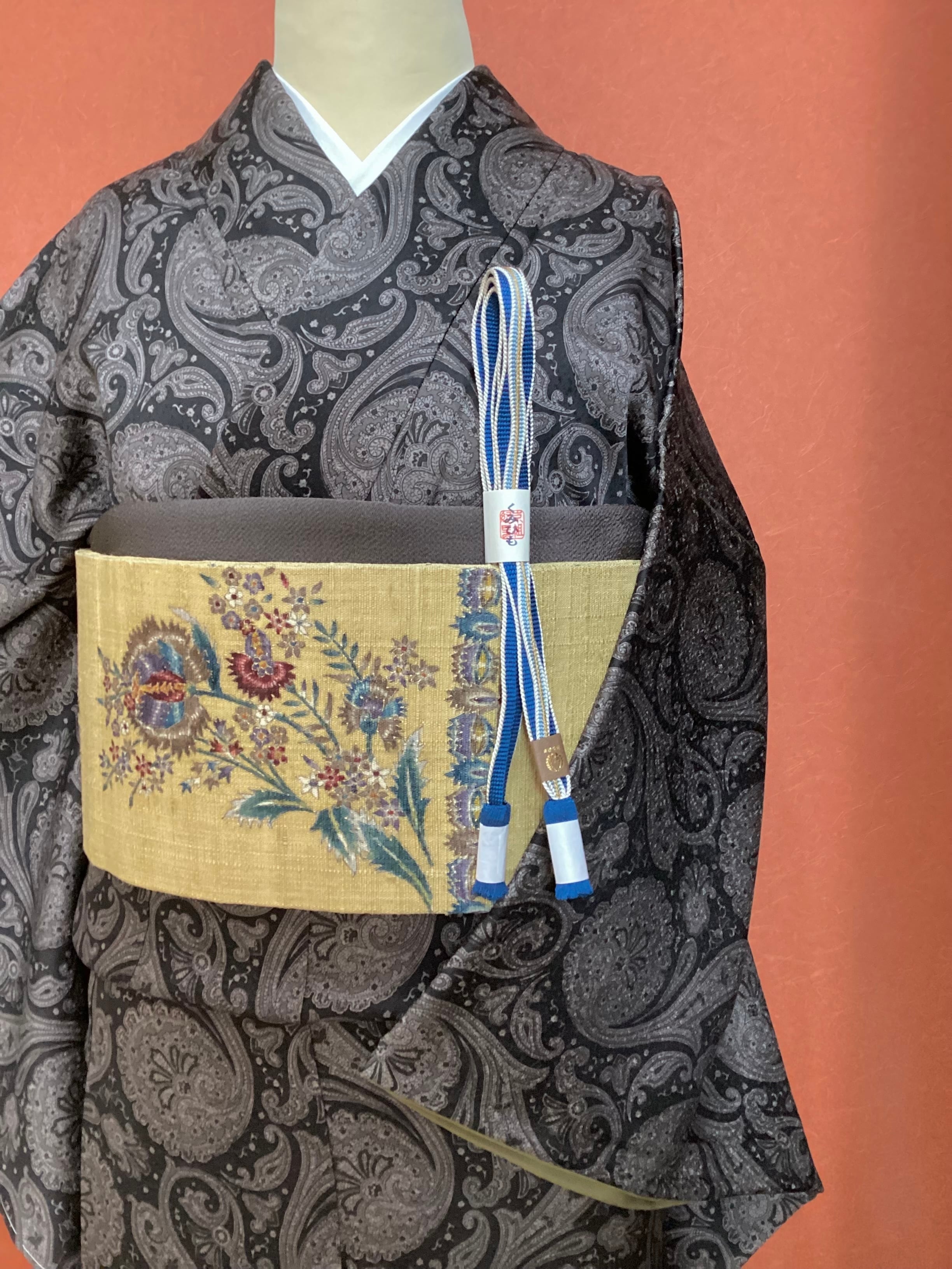 モノトーンのワンピース感覚でお召しになっていただけるペイズリー文様のお洒落小紋です。少し起毛したようにも感じられるふんわりとした手触りで重厚感のある織地です。異国情緒がありながら配色を抑えることで和装に自然に溶け込む通好みな小紋で、年齢を問わずにお召しいただけます。改まり過ぎずカジュアル過ぎない絶妙な雰囲気を持ち、シャイニーな帯を合わせてパーティや観劇へ、カジュアルな帯を合わせて気軽なお出掛けにと幅広いシーンに対応出来るお品です。身丈、身幅が十分ございますので、お探しの方はいかがでしょうか?