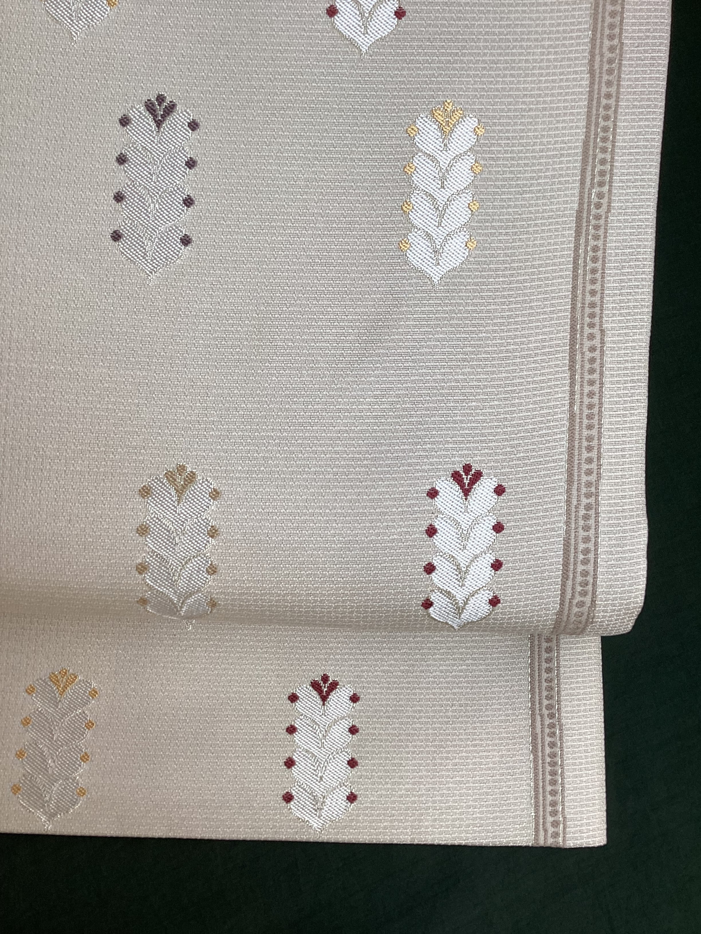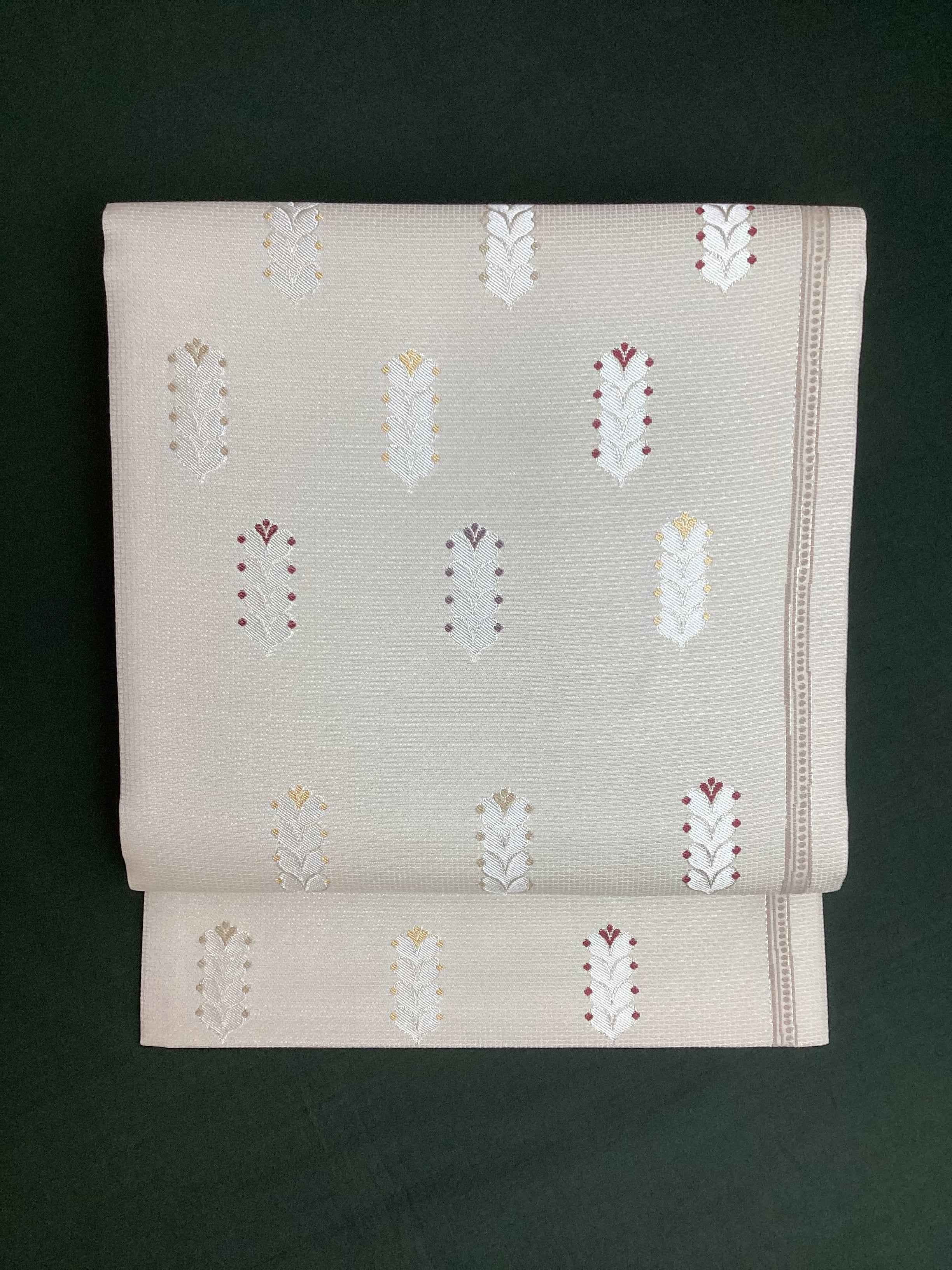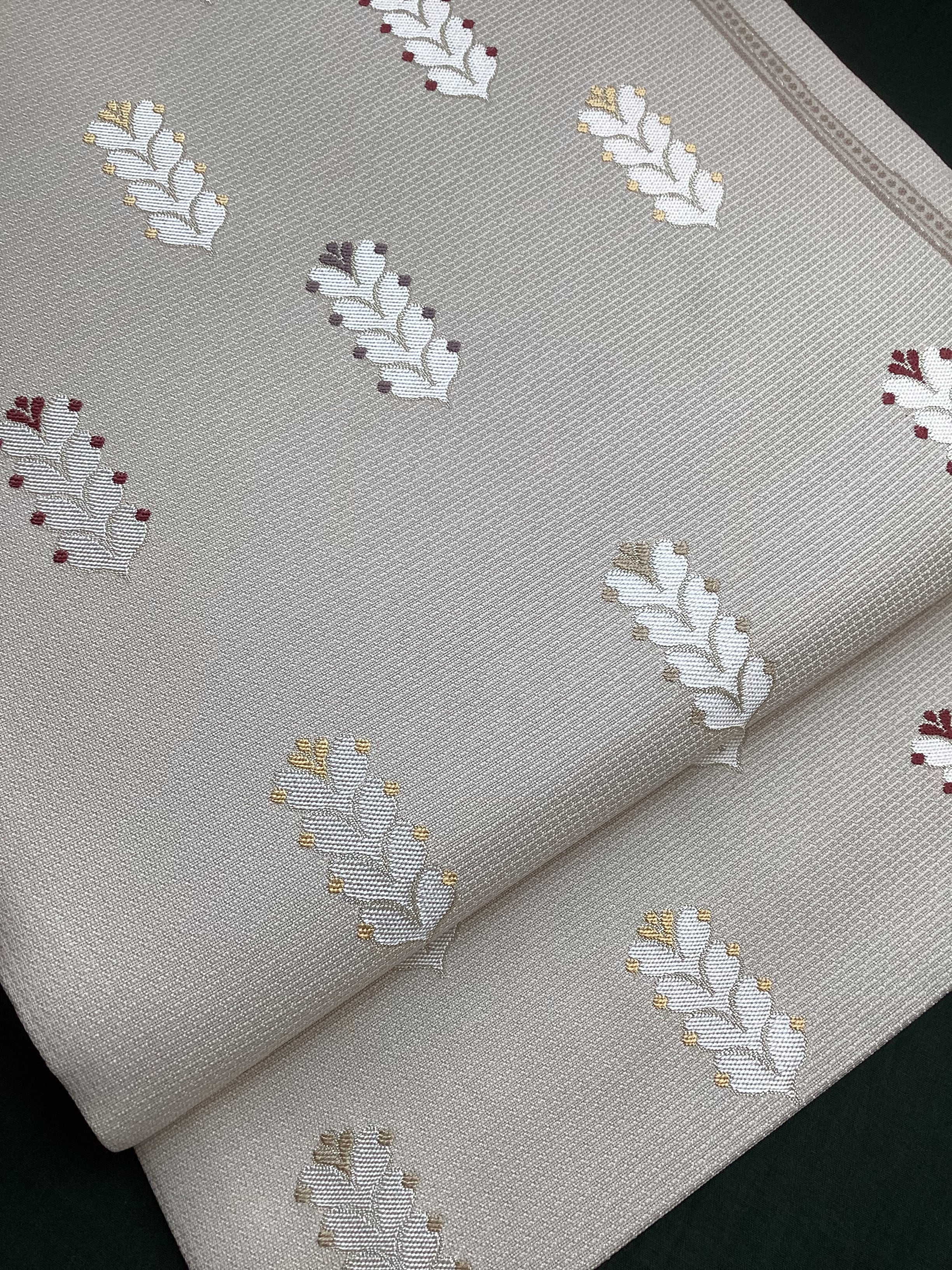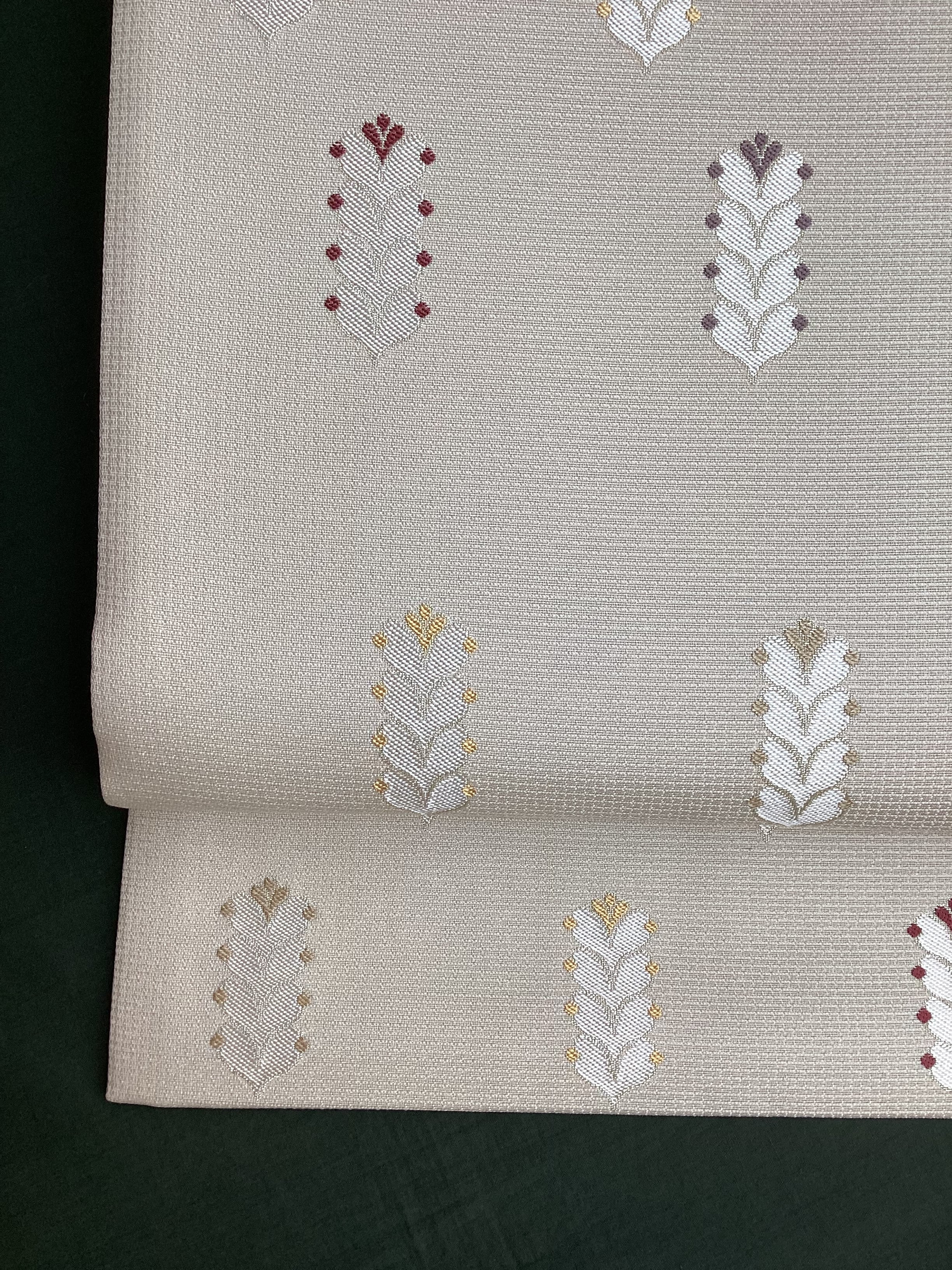 細かな格子状に織られた白っぱいベージュ色地に羽根のような文様が並んで、大人しめの意匠ですが、ポップなさりげない可愛らしさもある六通柄の洒落袋帯です。黄金ムガ蚕を用いて織られた立体的な織地の上に、艶のある糸の文様が浮き上がります。アシンメトリーに配された縦のラインにも洒落味があります。また、裏面にも蔓草のよろけたラインが織り込まれ、こだわりのあるお品です。