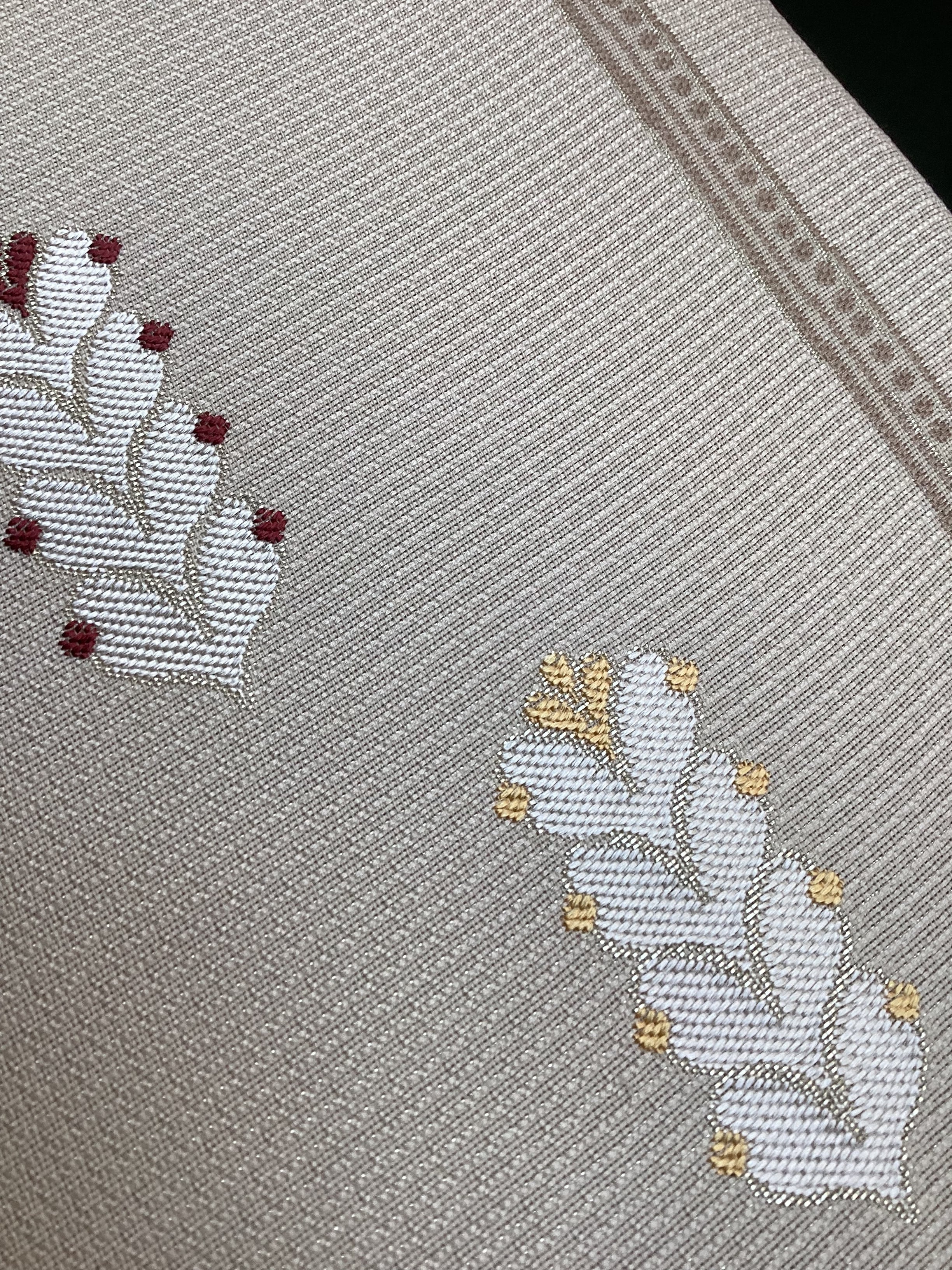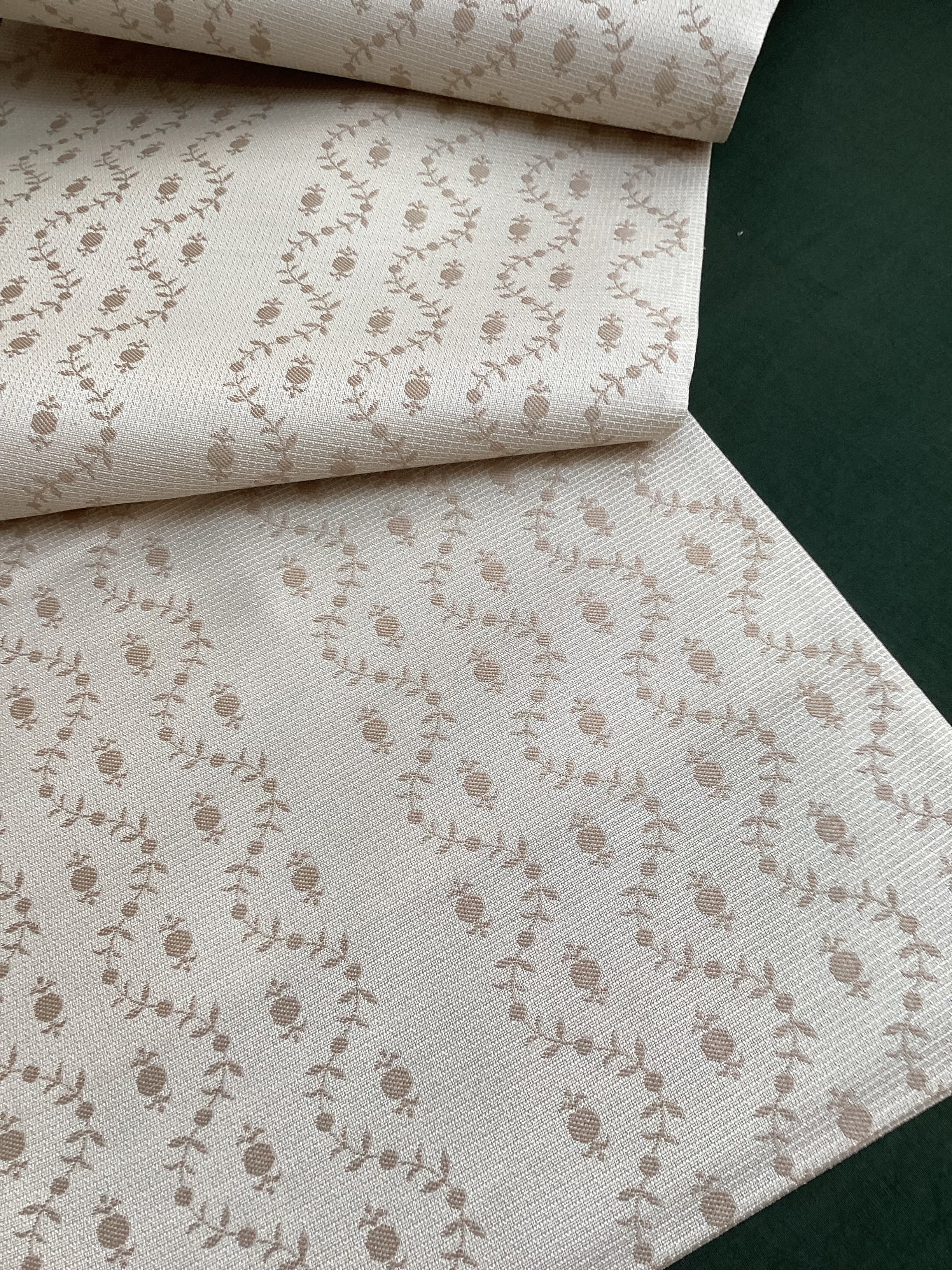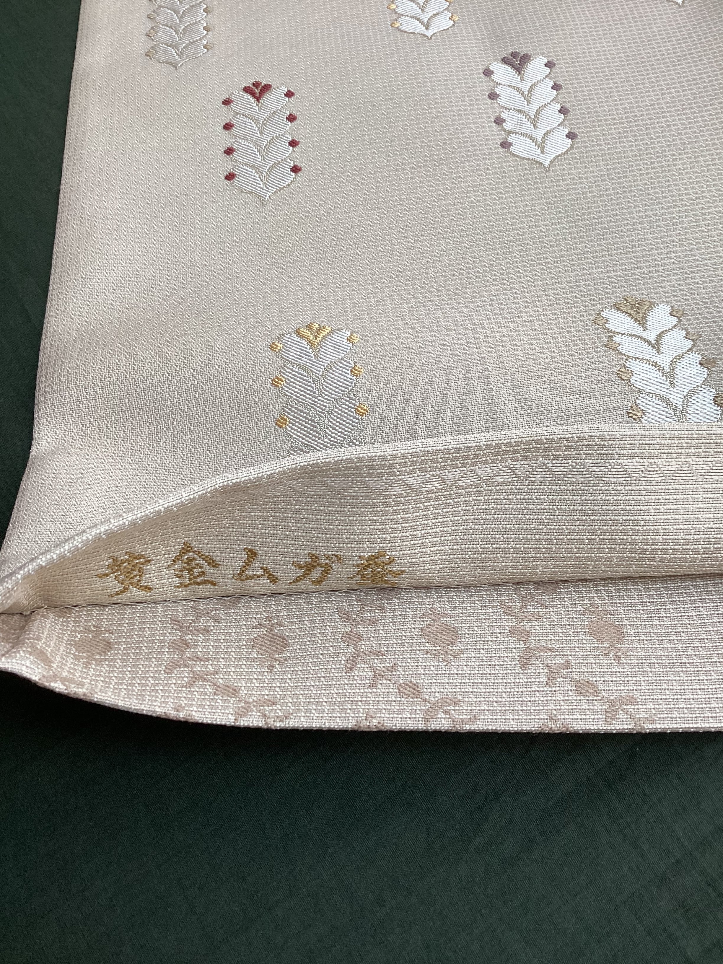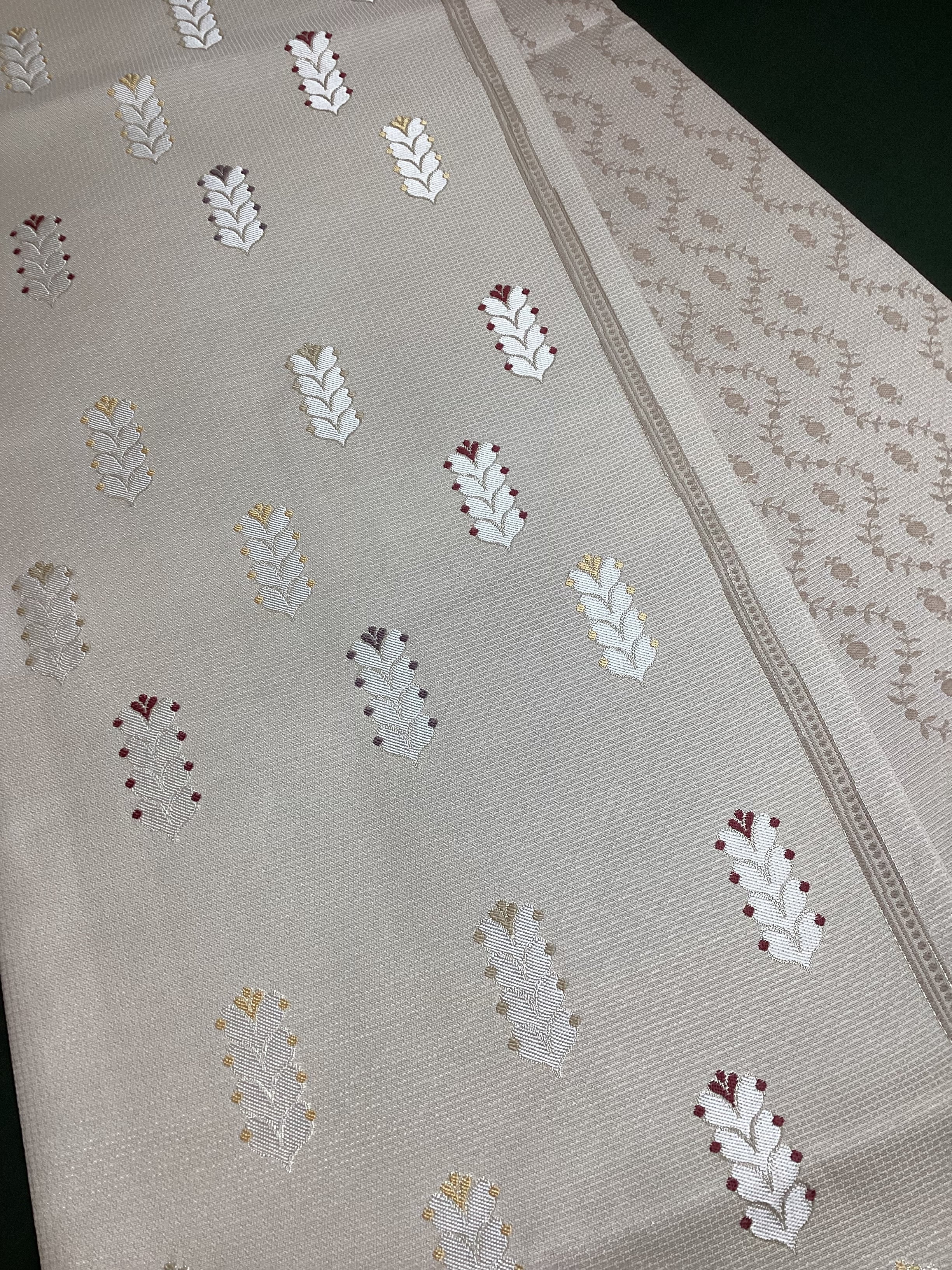細かな格子状に織られた白っぱいベージュ色地に羽根のような文様が並んで、大人しめの意匠ですが、ポップなさりげない可愛らしさもある六通柄の洒落袋帯です。黄金ムガ蚕を用いて織られた立体的な織地の上に、艶のある糸の文様が浮き上がります。アシンメトリーに配された縦のラインにも洒落味があります。また、裏面にも蔓草のよろけたラインが織り込まれ、こだわりのあるお品です。