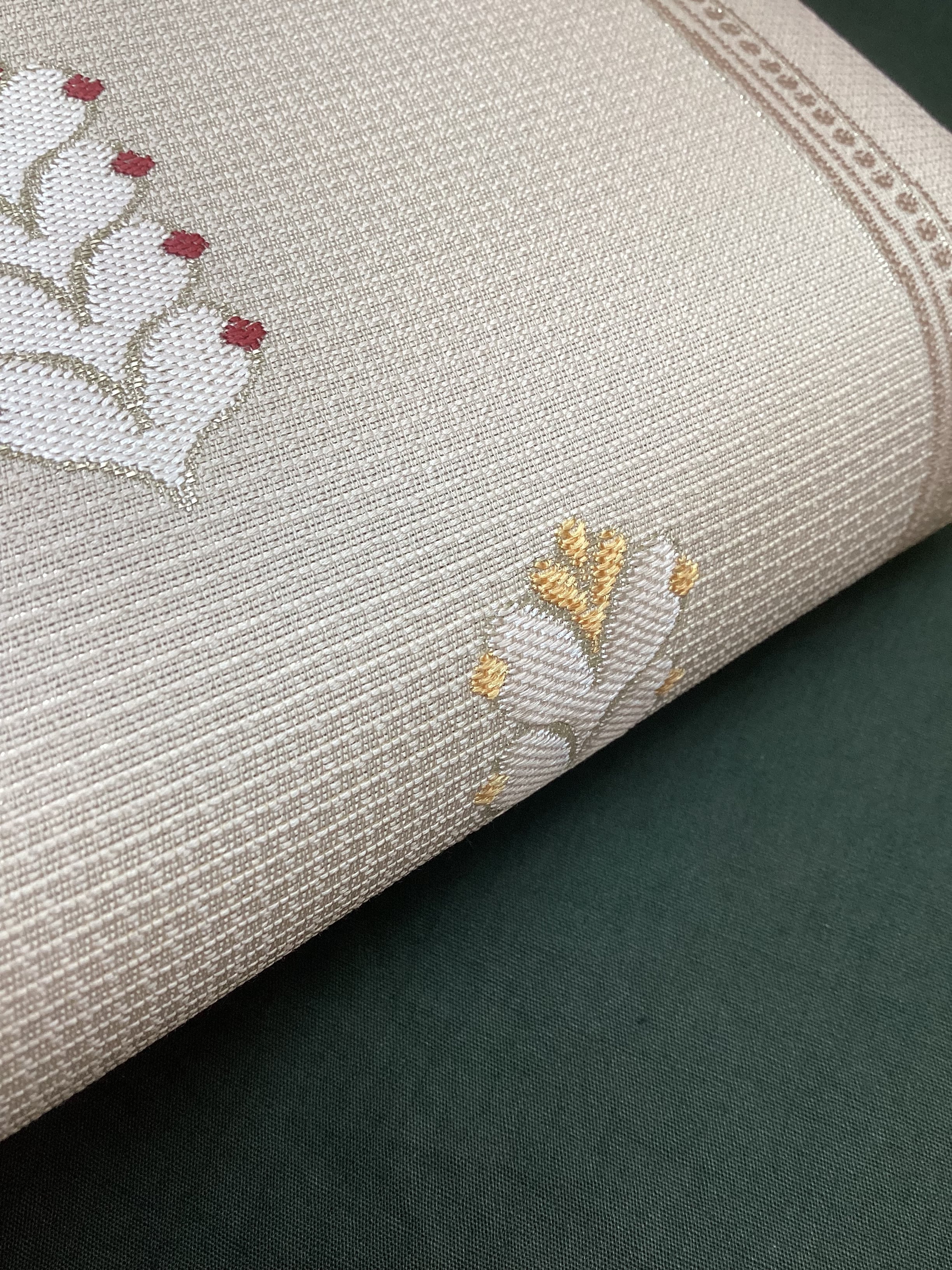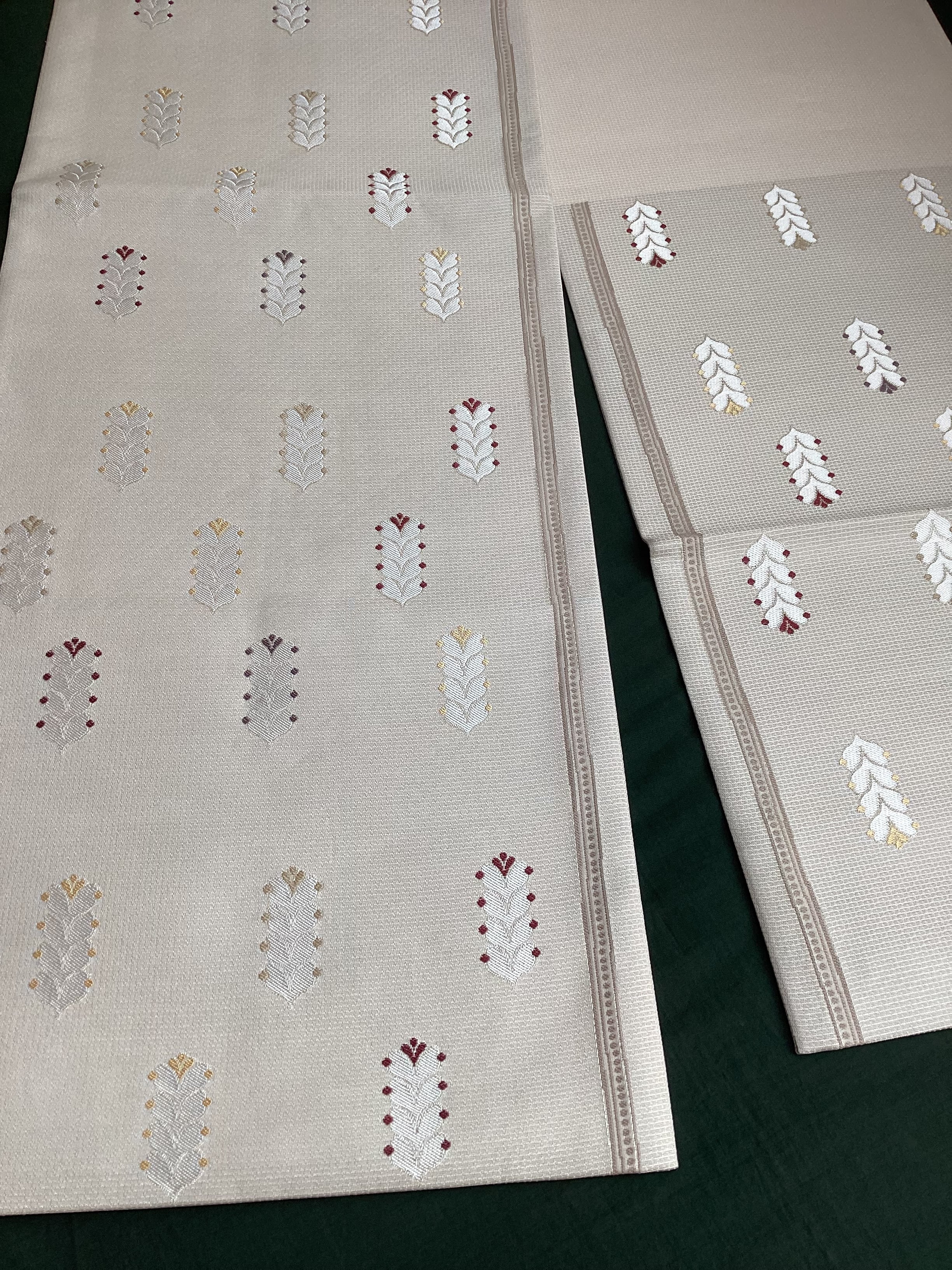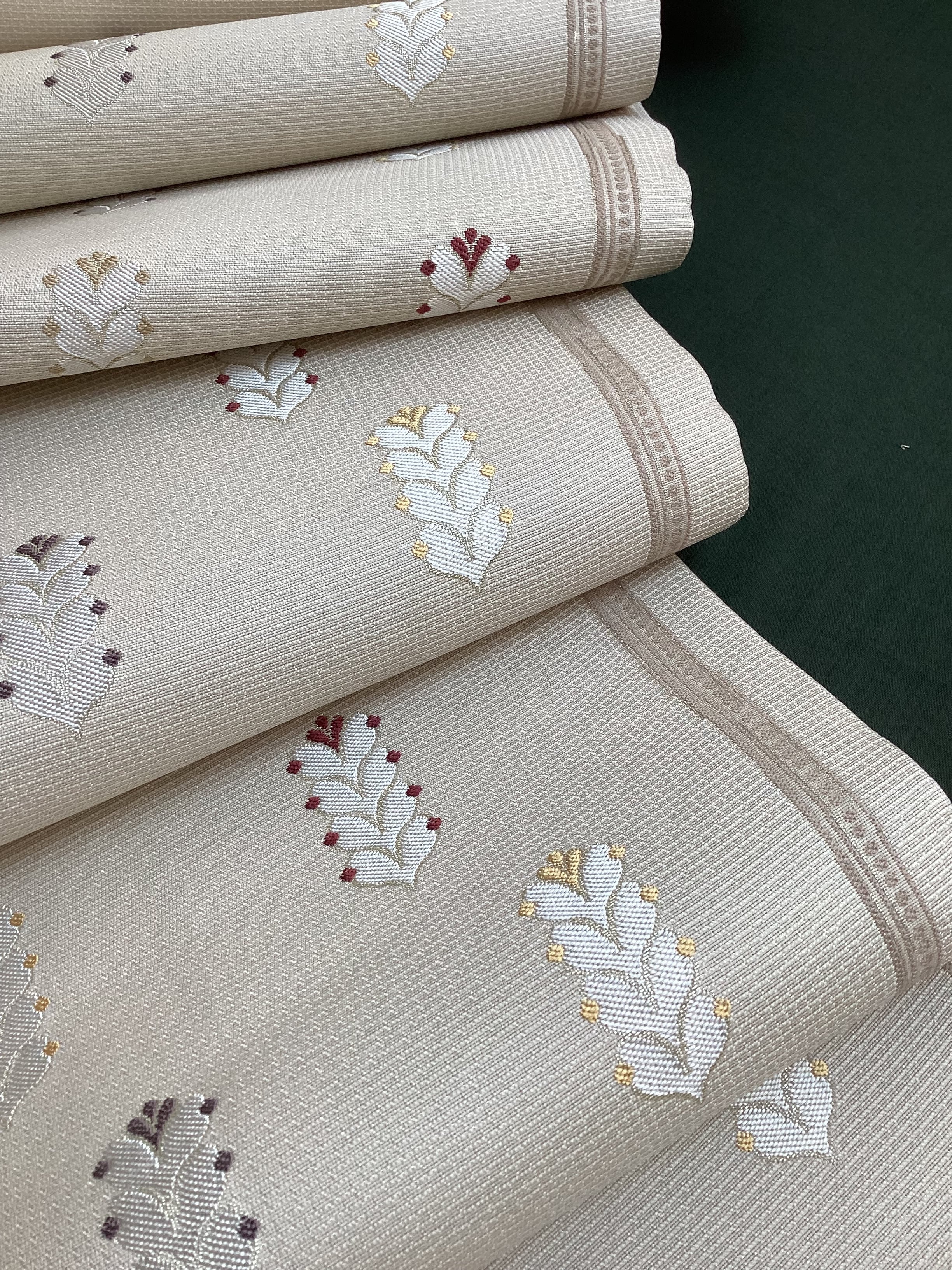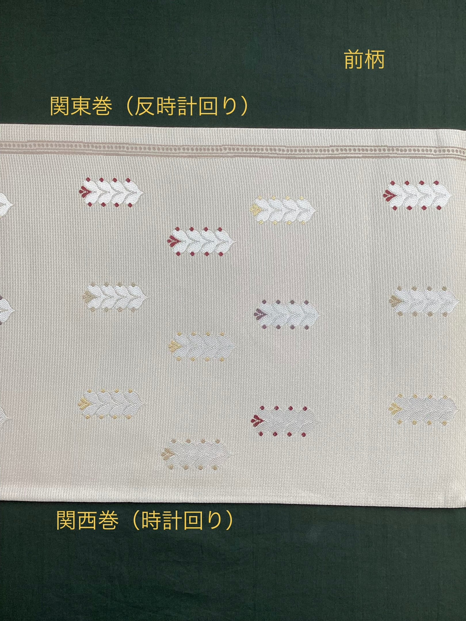 細かな格子状に織られた白っぱいベージュ色地に羽根のような文様が並んで、大人しめの意匠ですが、ポップなさりげない可愛らしさもある六通柄の洒落袋帯です。黄金ムガ蚕を用いて織られた立体的な織地の上に、艶のある糸の文様が浮き上がります。アシンメトリーに配された縦のラインにも洒落味があります。また、裏面にも蔓草のよろけたラインが織り込まれ、こだわりのあるお品です。