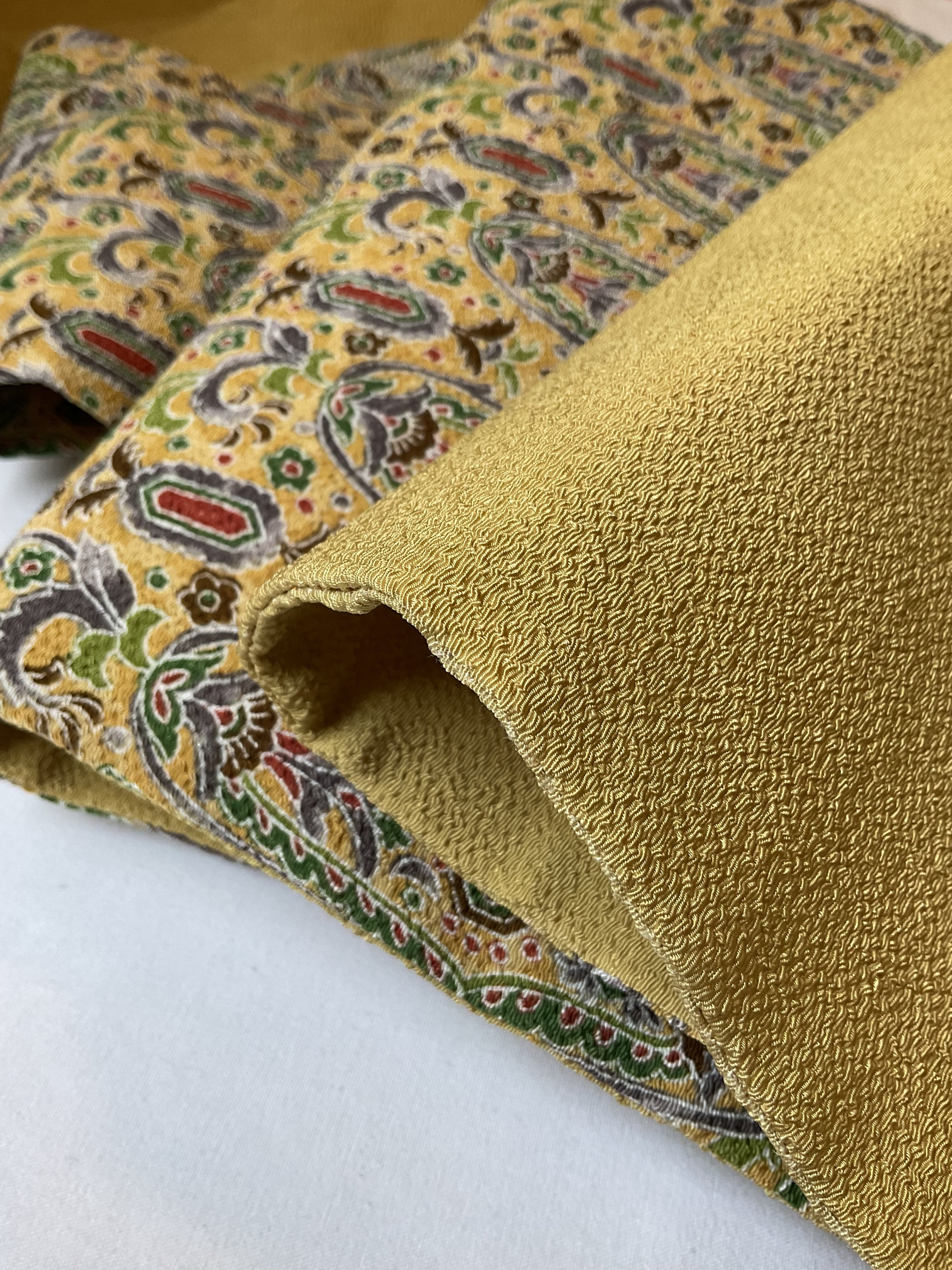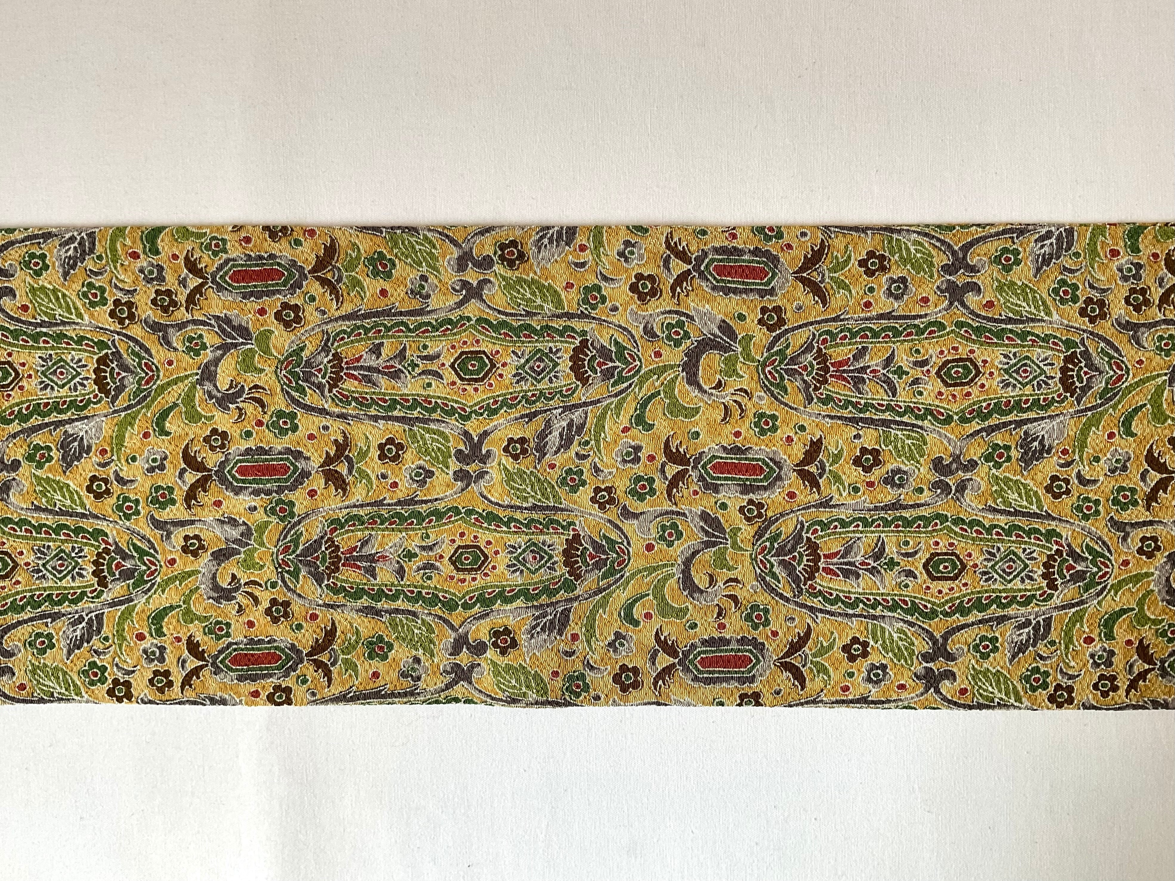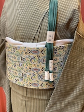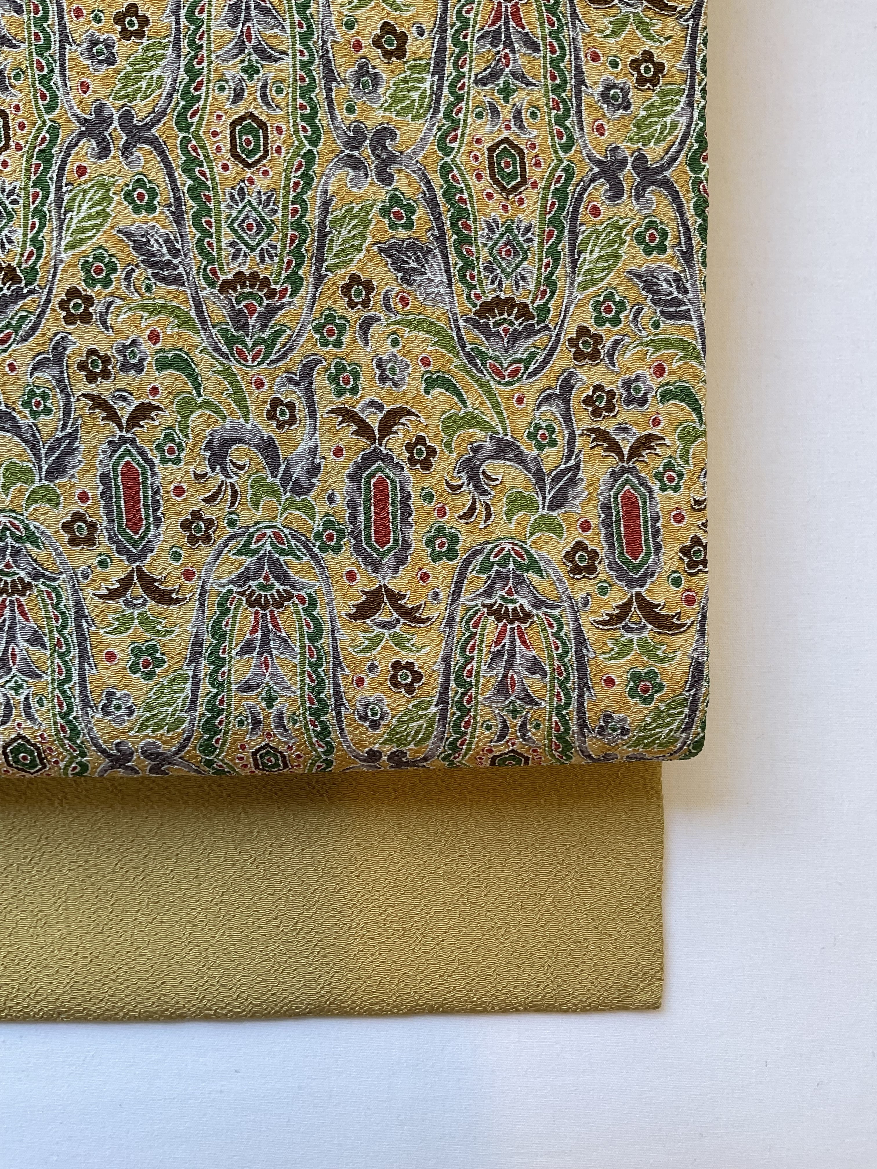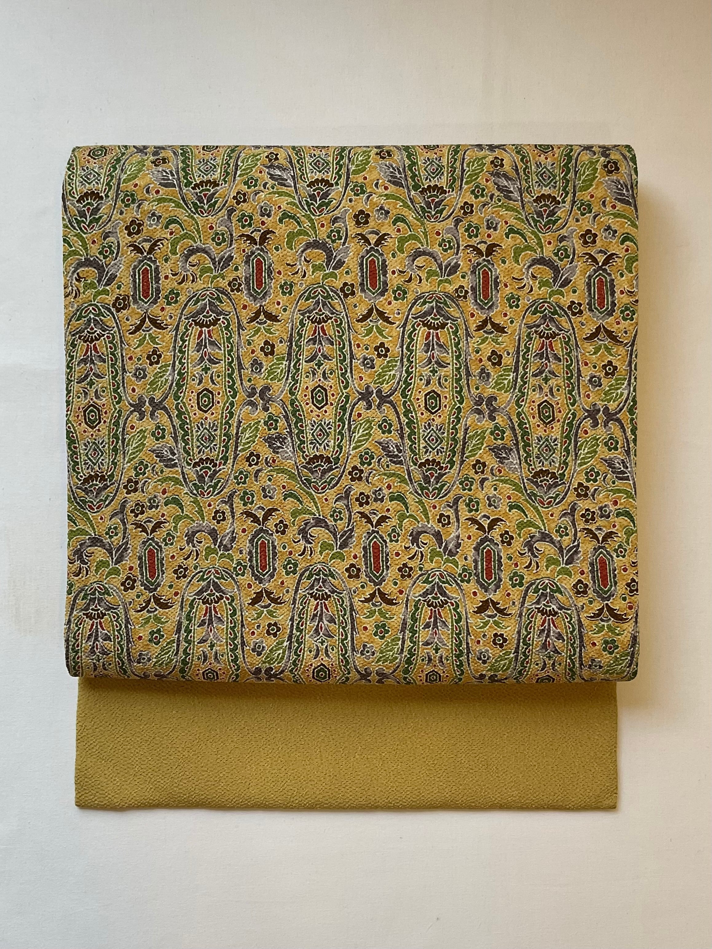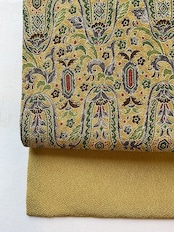 軽い色味の芥子色縮緬地に細やかな更紗文様が描かれた九寸なごや帯です。