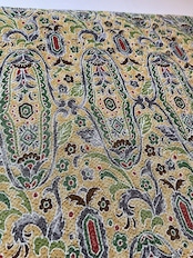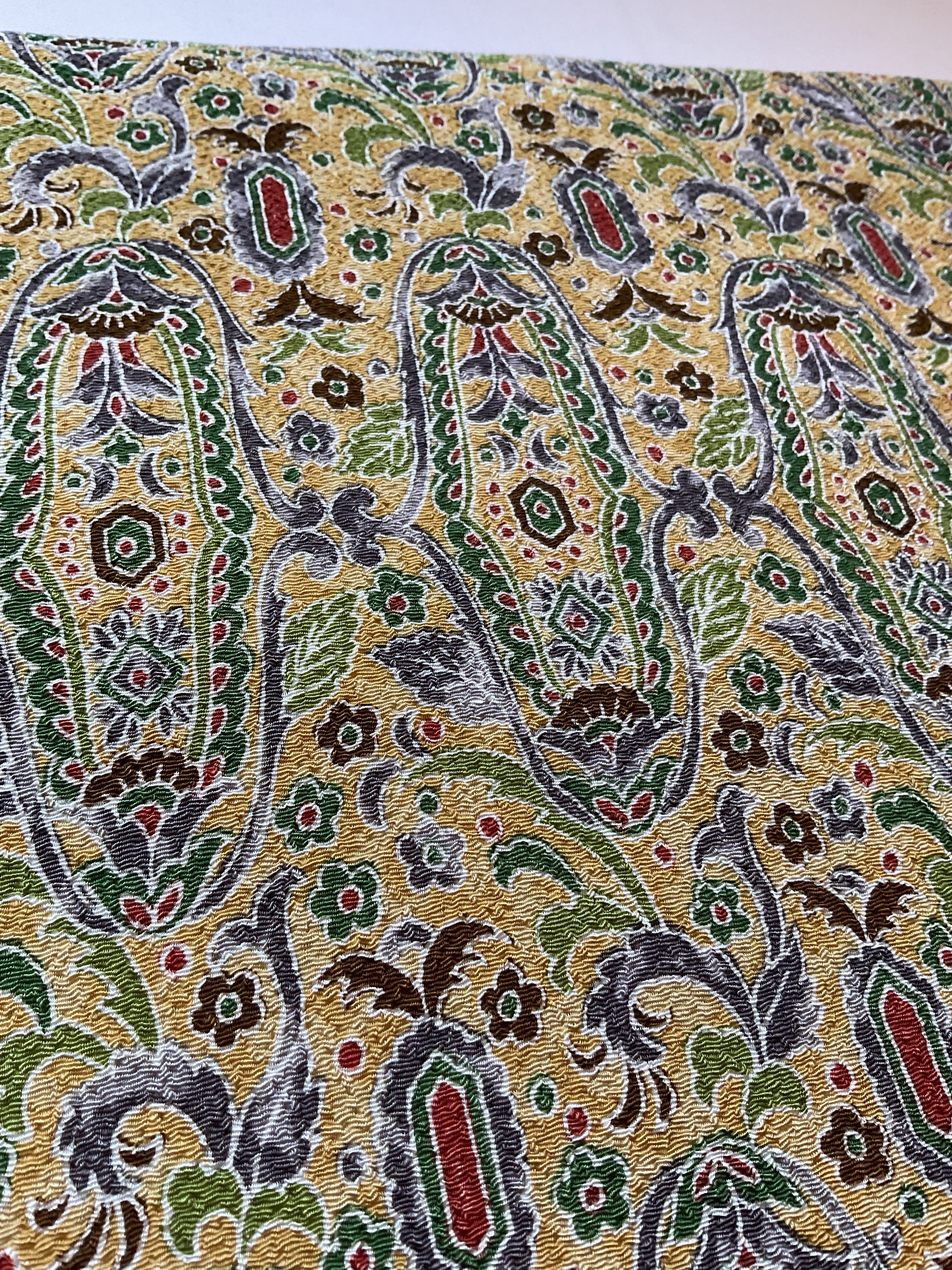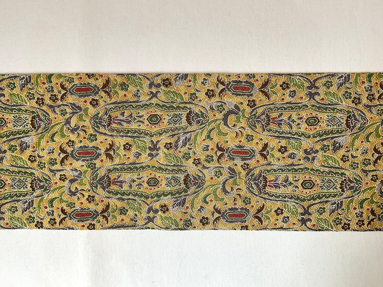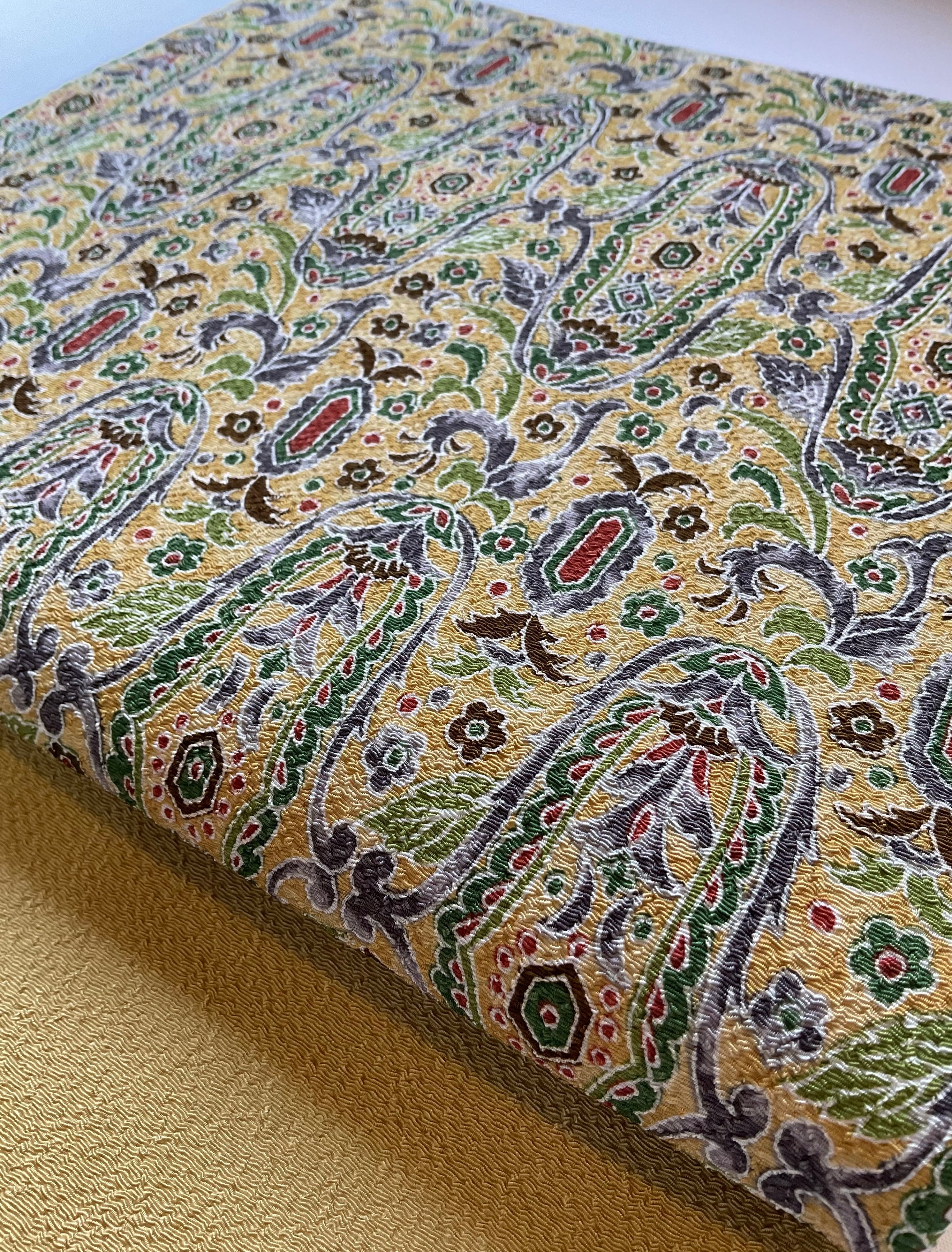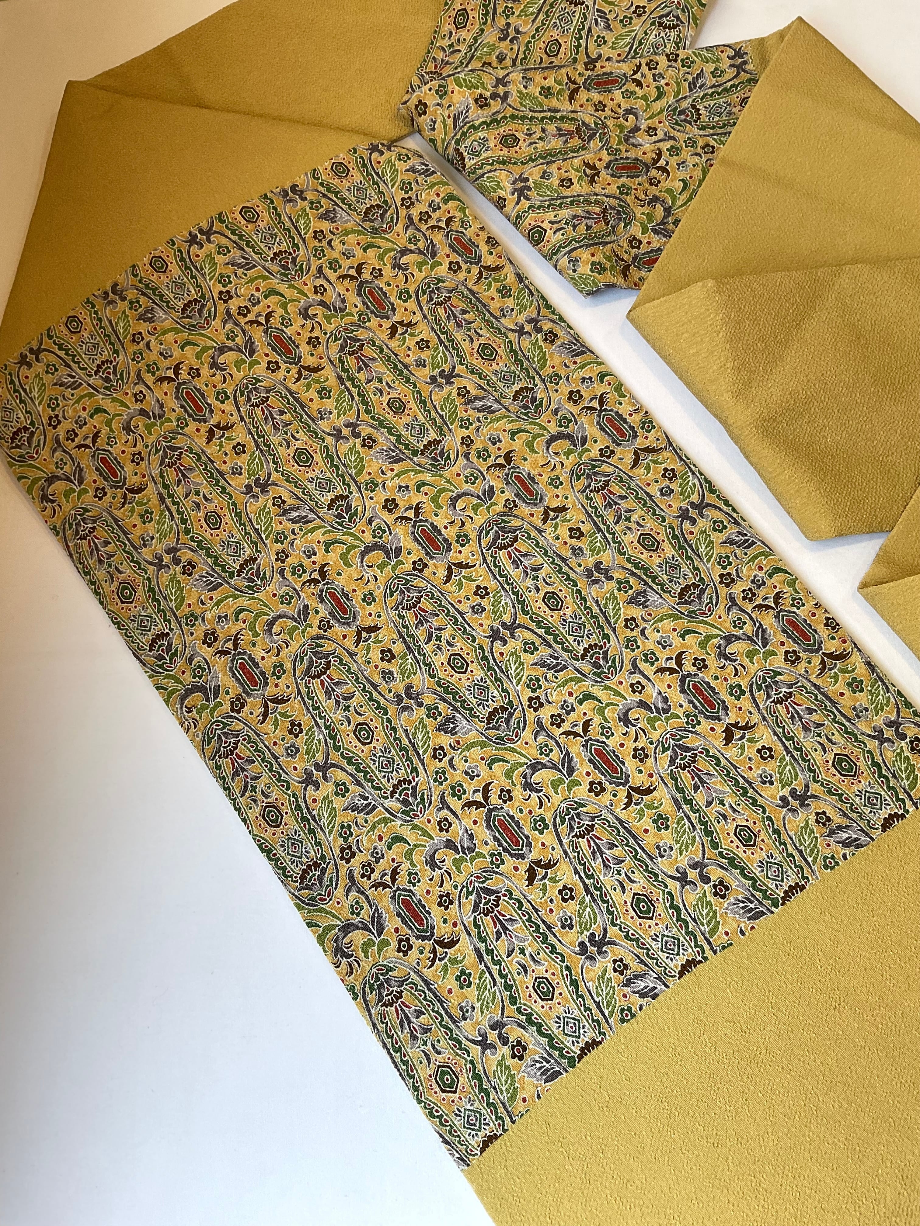 軽い色味の芥子色縮緬地に細やかな更紗文様が描かれた九寸なごや帯です。