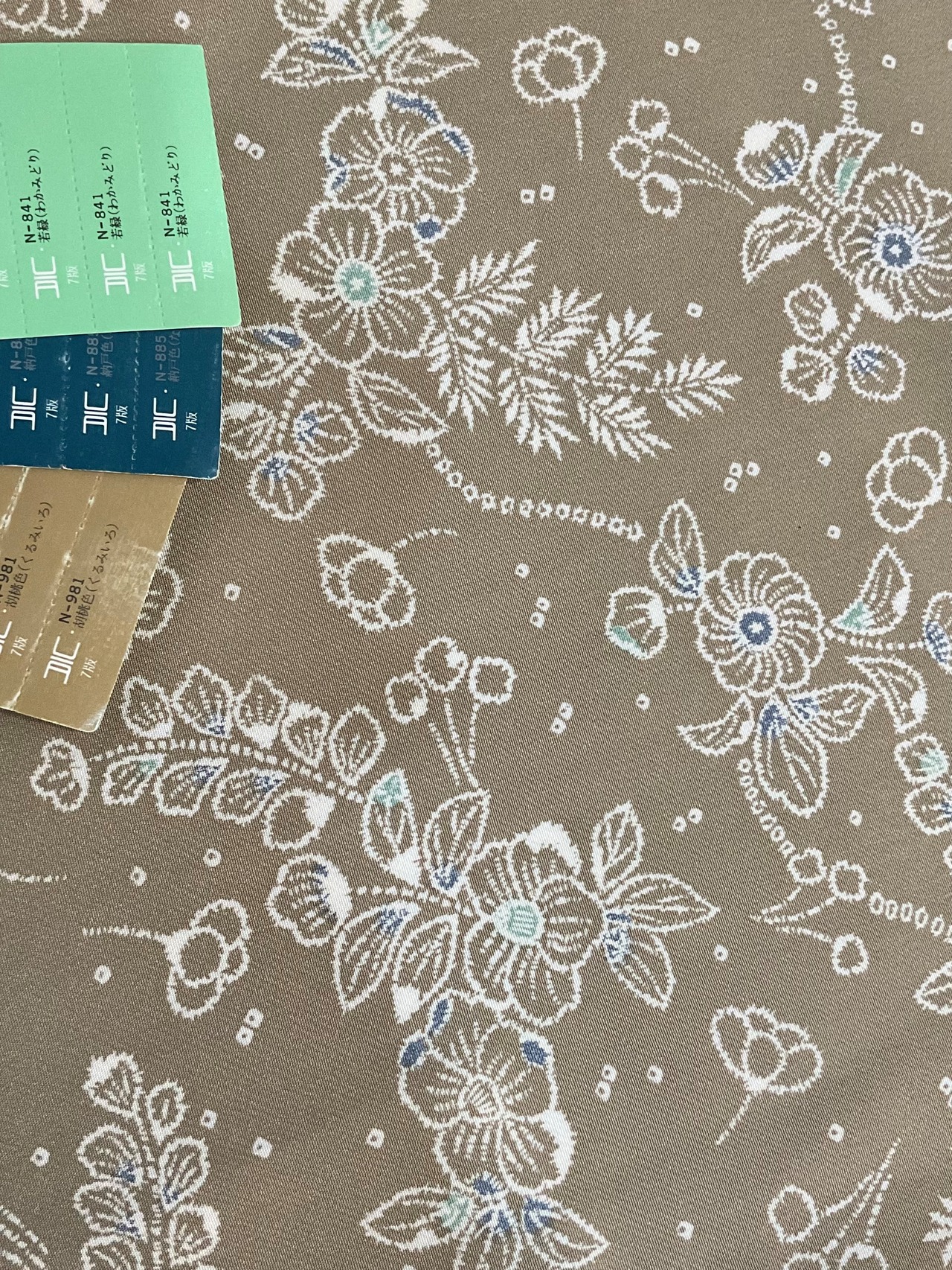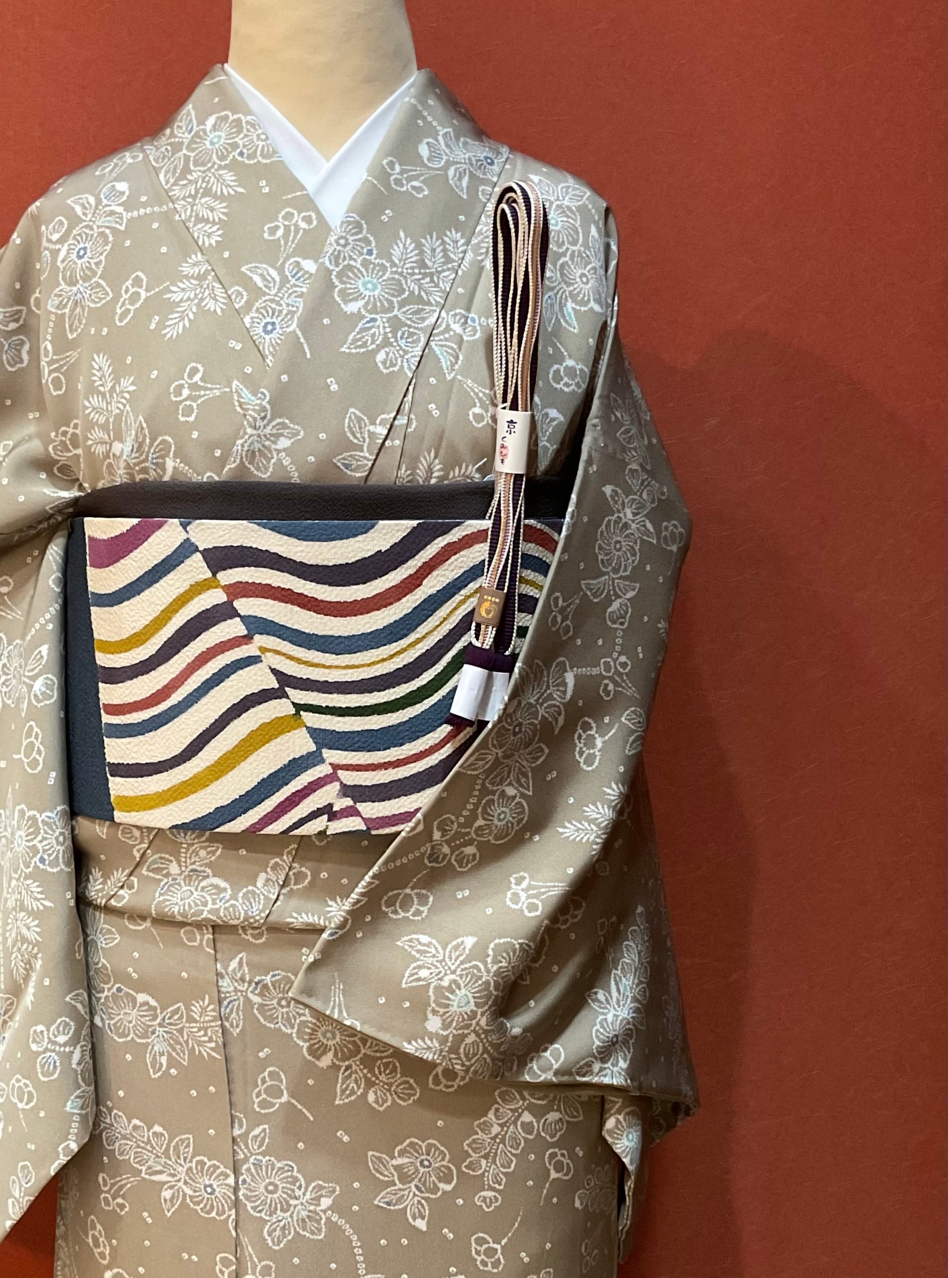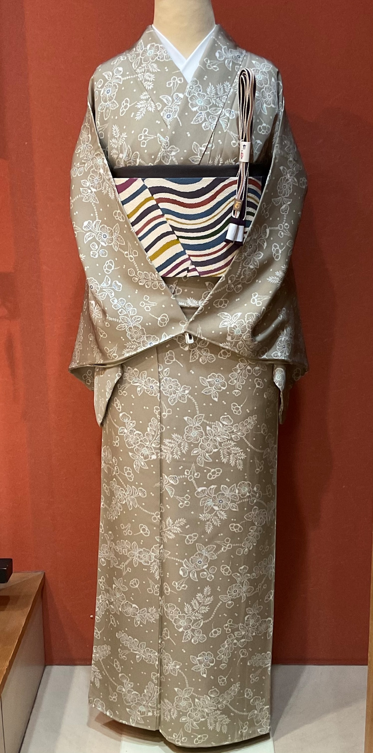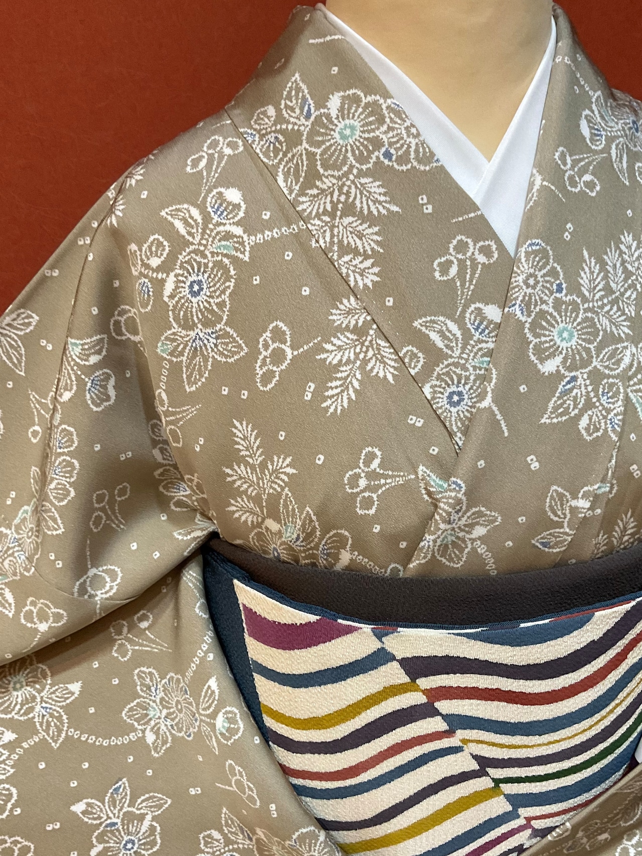 落ち着いた胡桃色地を背景にチラチラと雪舞う中に椿や桜、梅の花の風景でしょうか、様々な花が繋がるように飛び交うように配された小紋きものです。所々に入れた差し色の青、緑が効いています。程よく色味を抑えたシンプルシックな現代的な小紋です。