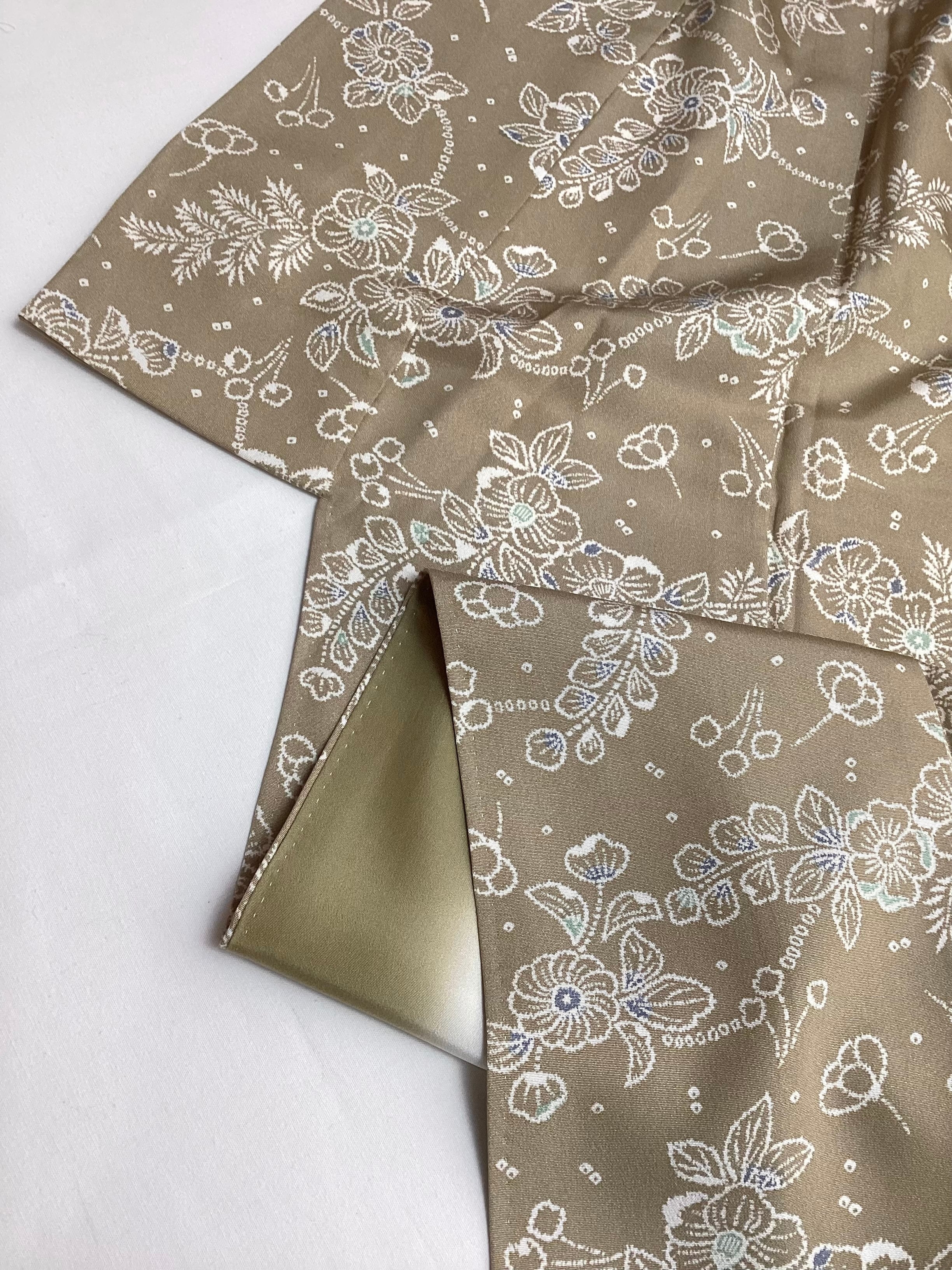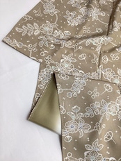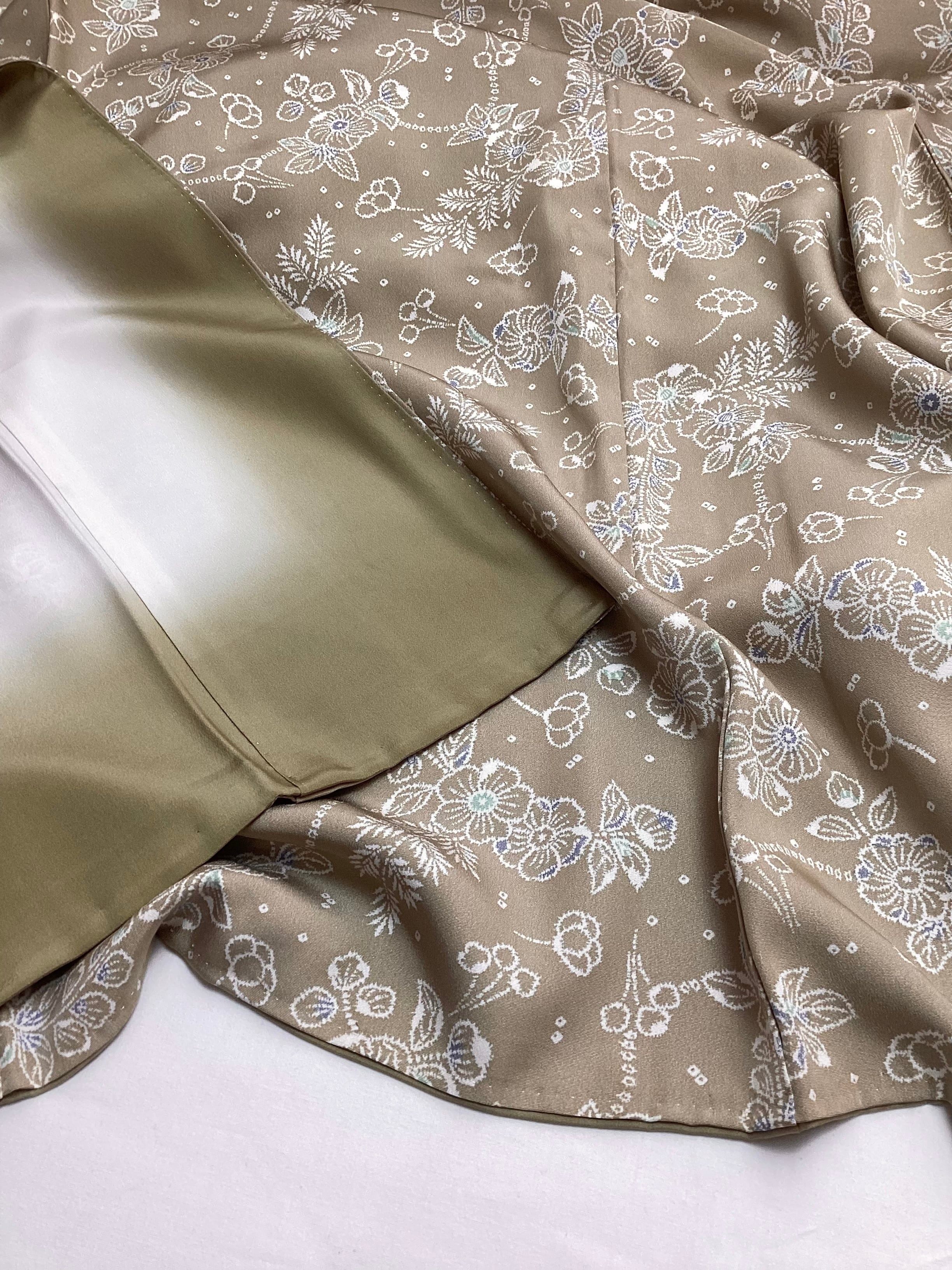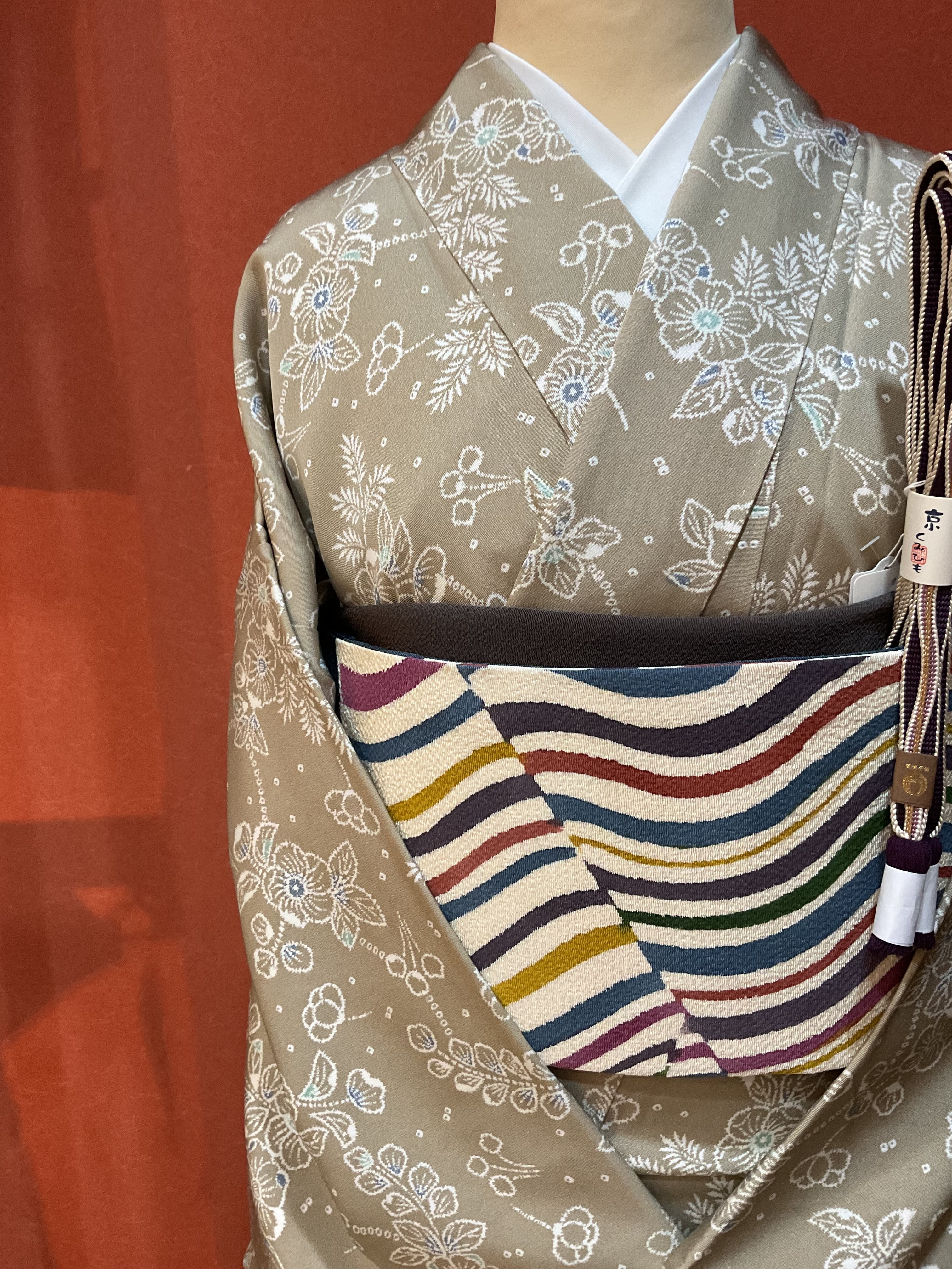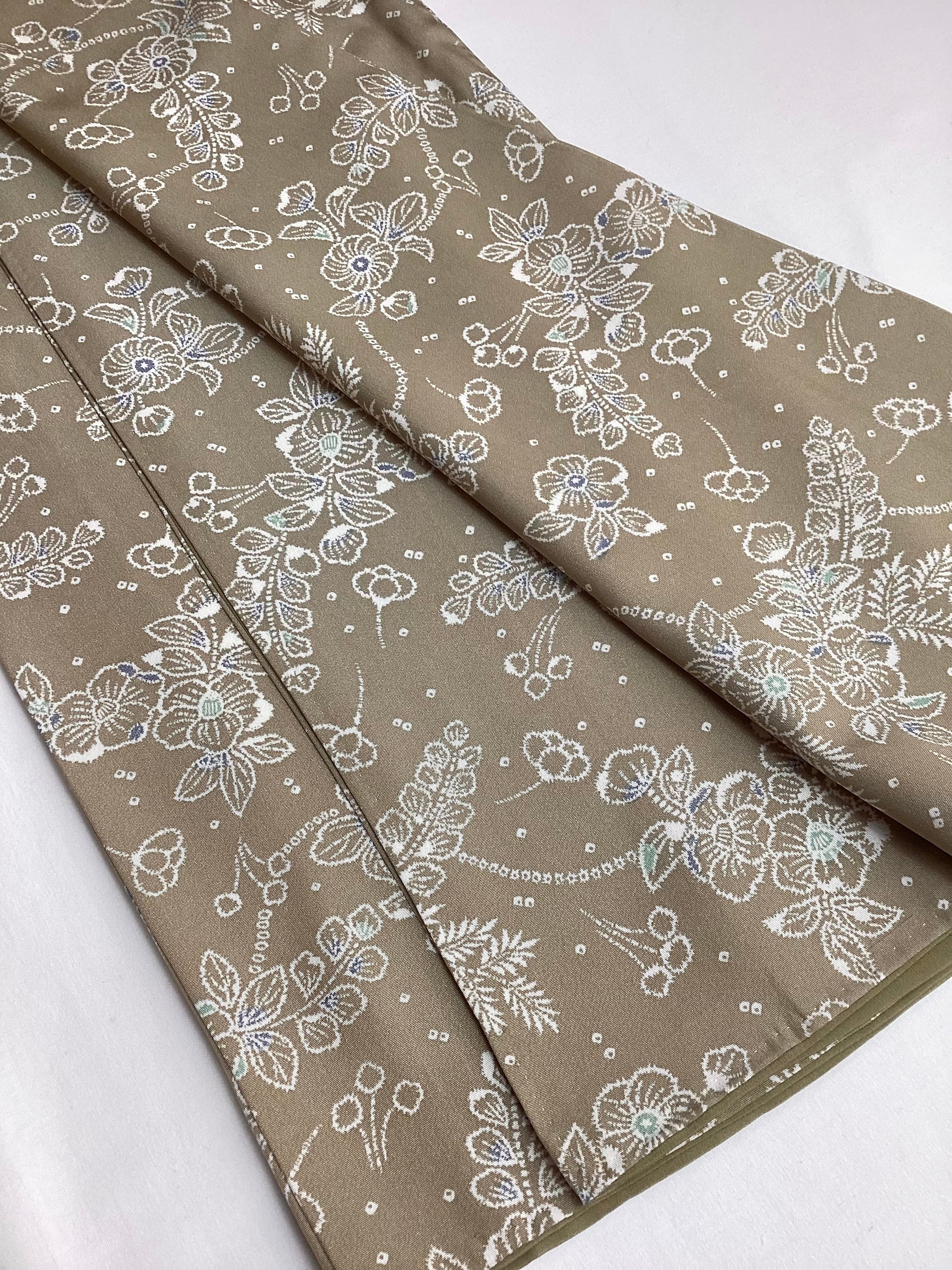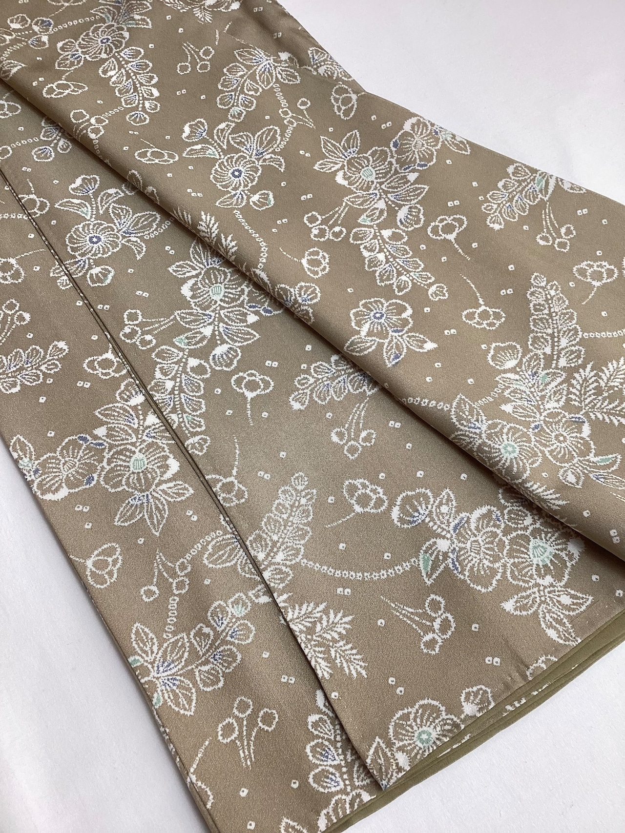 落ち着いた胡桃色地を背景にチラチラと雪舞う中に椿や桜、梅の花の風景でしょうか、様々な花が繋がるように飛び交うように配された小紋きものです。所々に入れた差し色の青、緑が効いています。程よく色味を抑えたシンプルシックな現代的な小紋です。