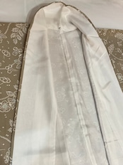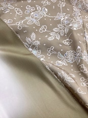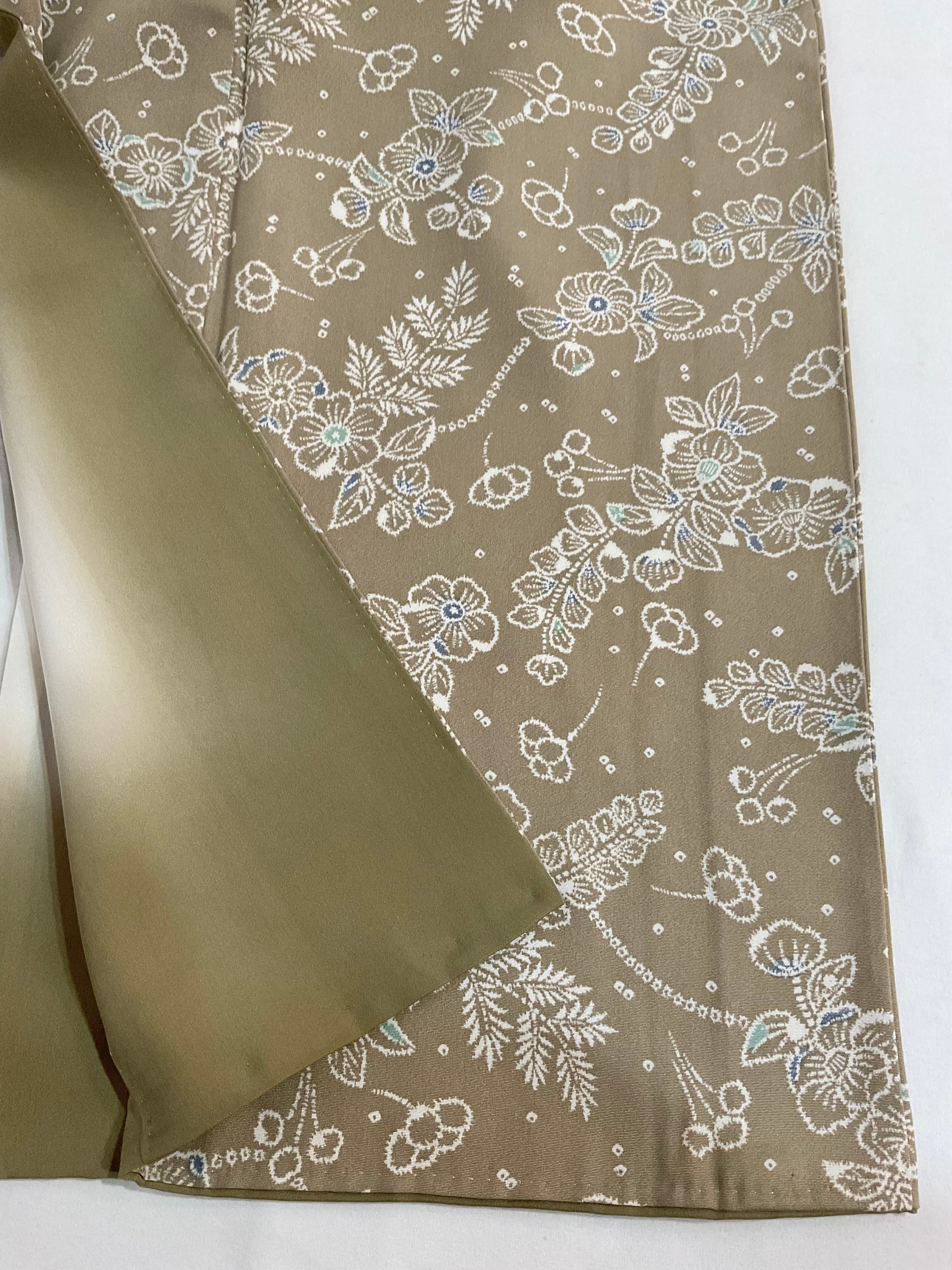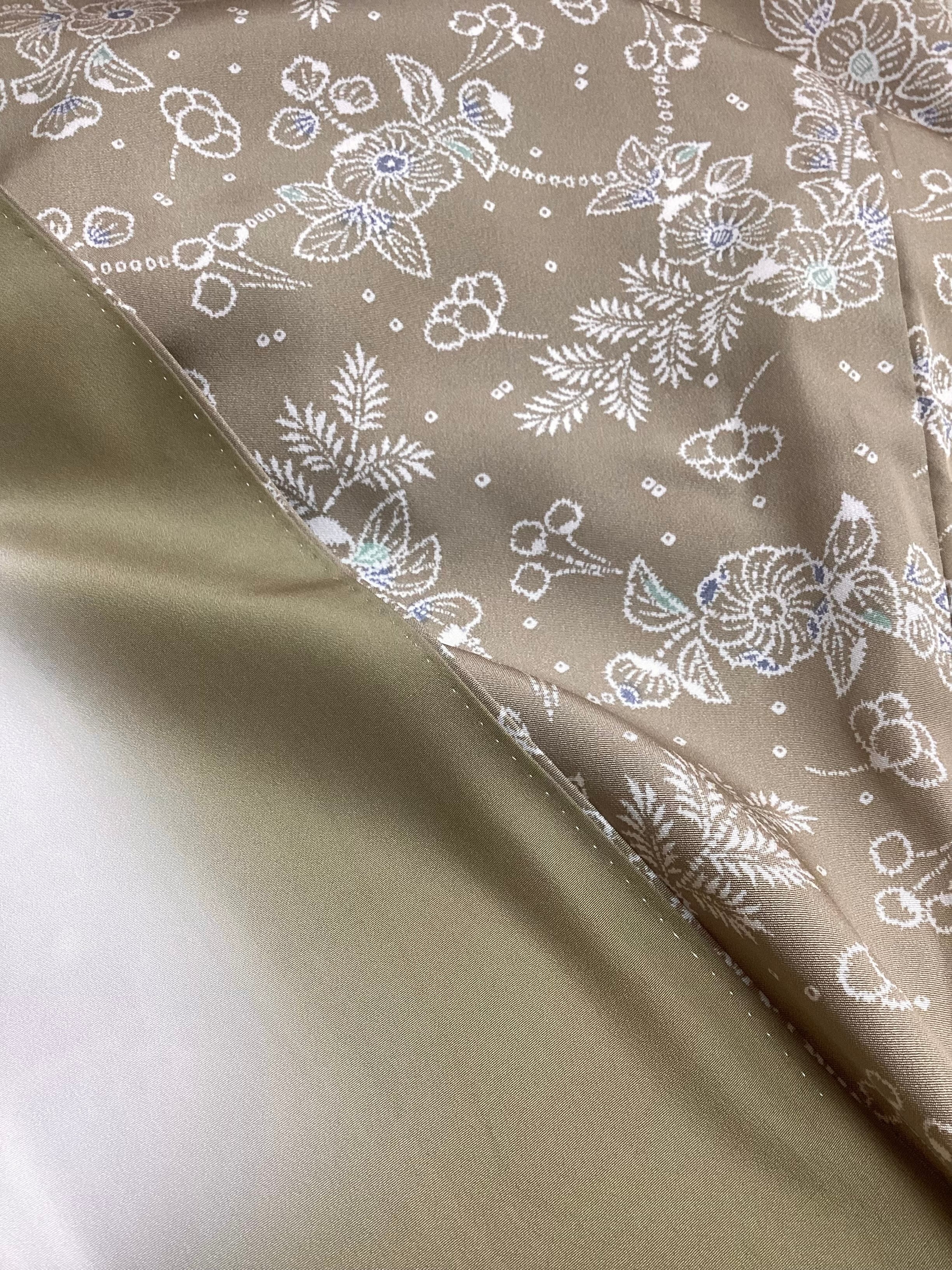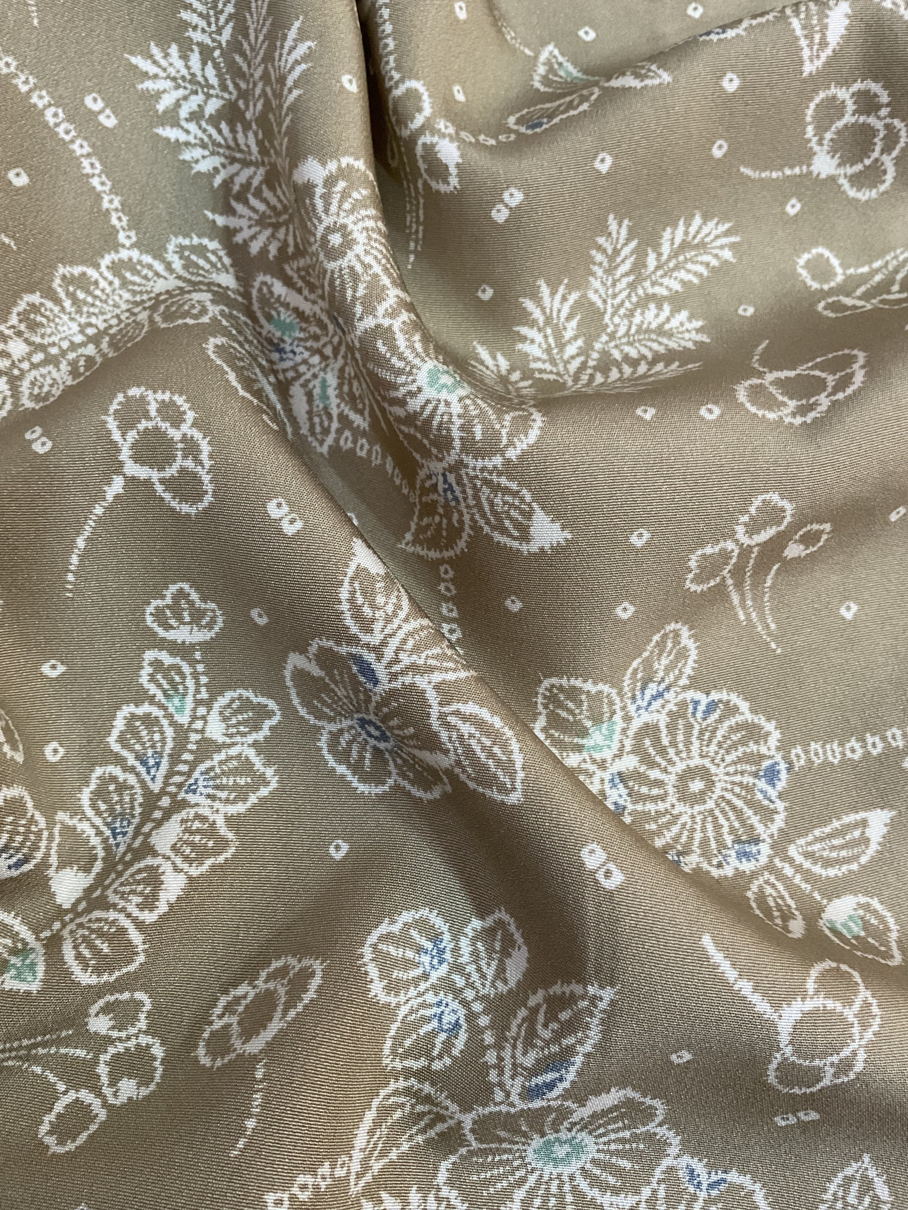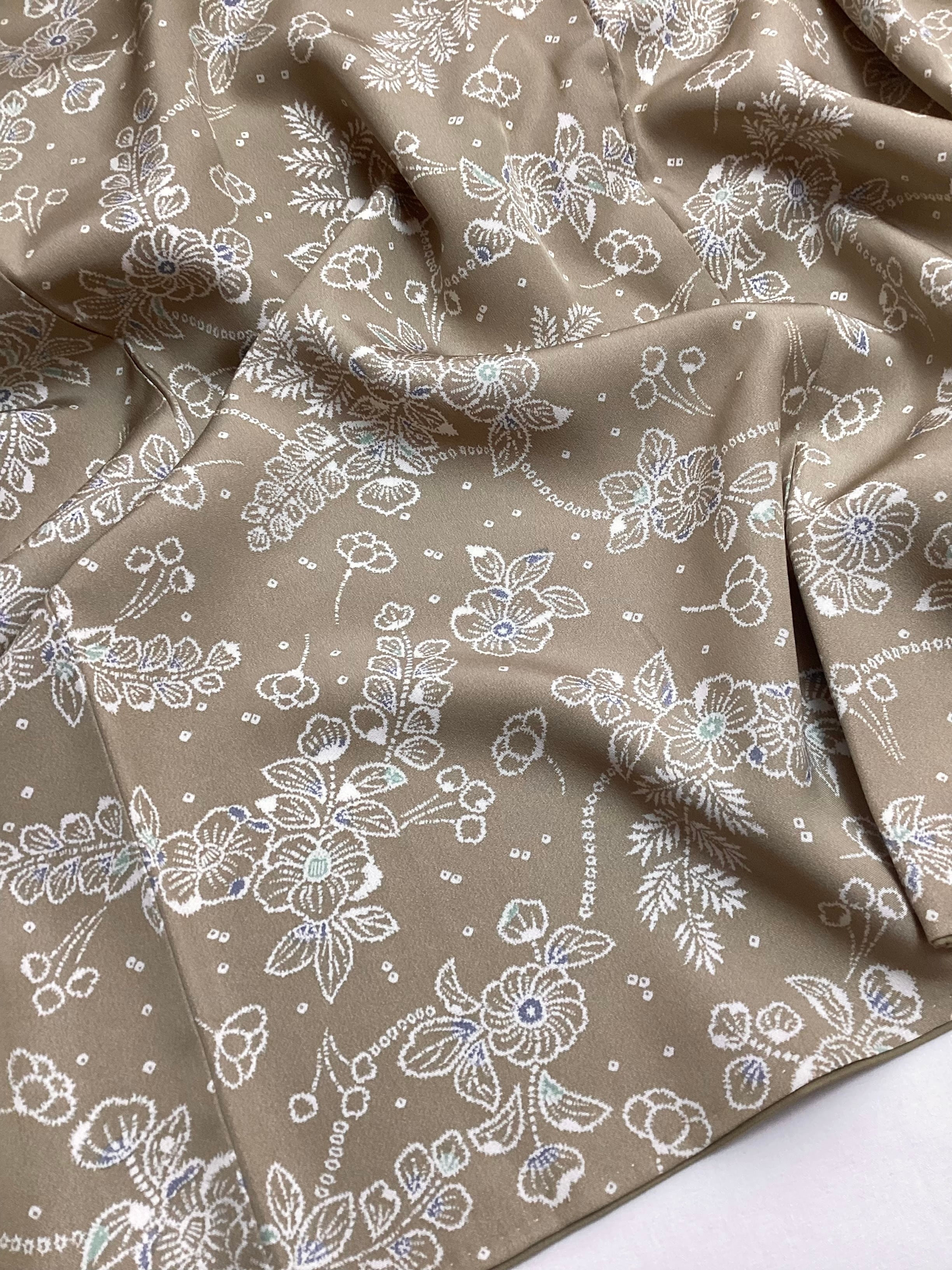 落ち着いた胡桃色地を背景にチラチラと雪舞う中に椿や桜、梅の花の風景でしょうか、様々な花が繋がるように飛び交うように配された小紋きものです。所々に入れた差し色の青、緑が効いています。程よく色味を抑えたシンプルシックな現代的な小紋です。