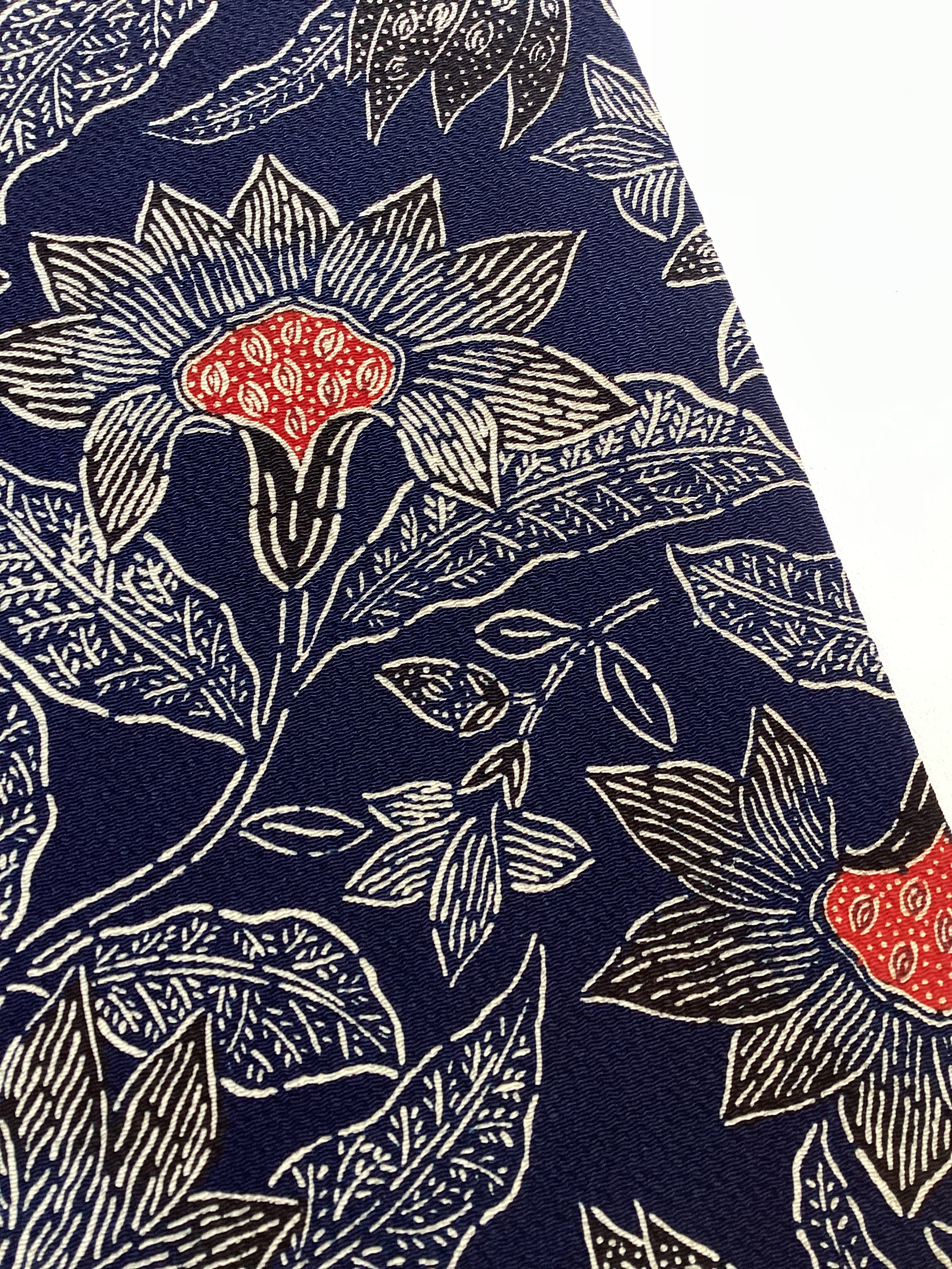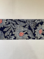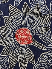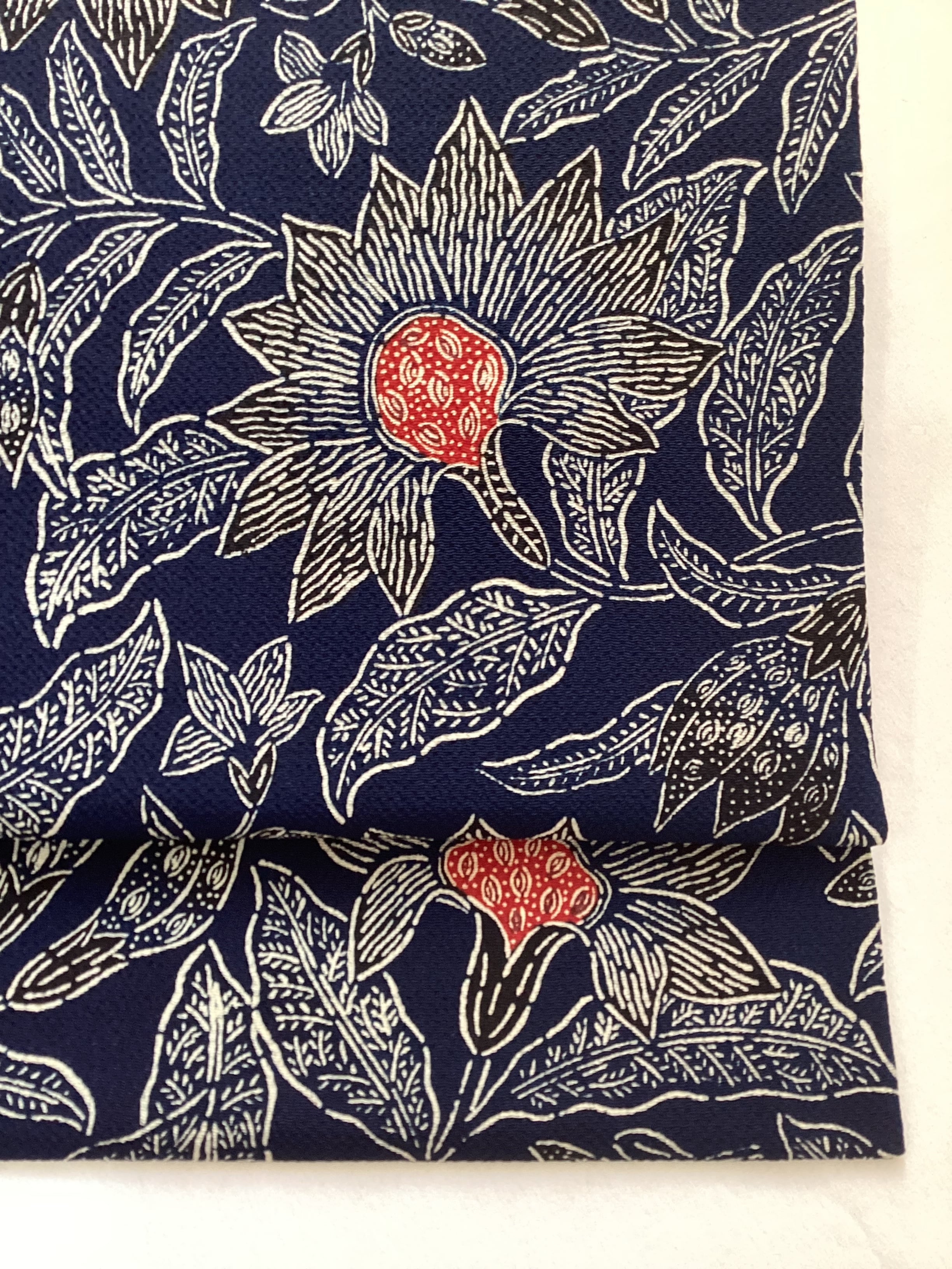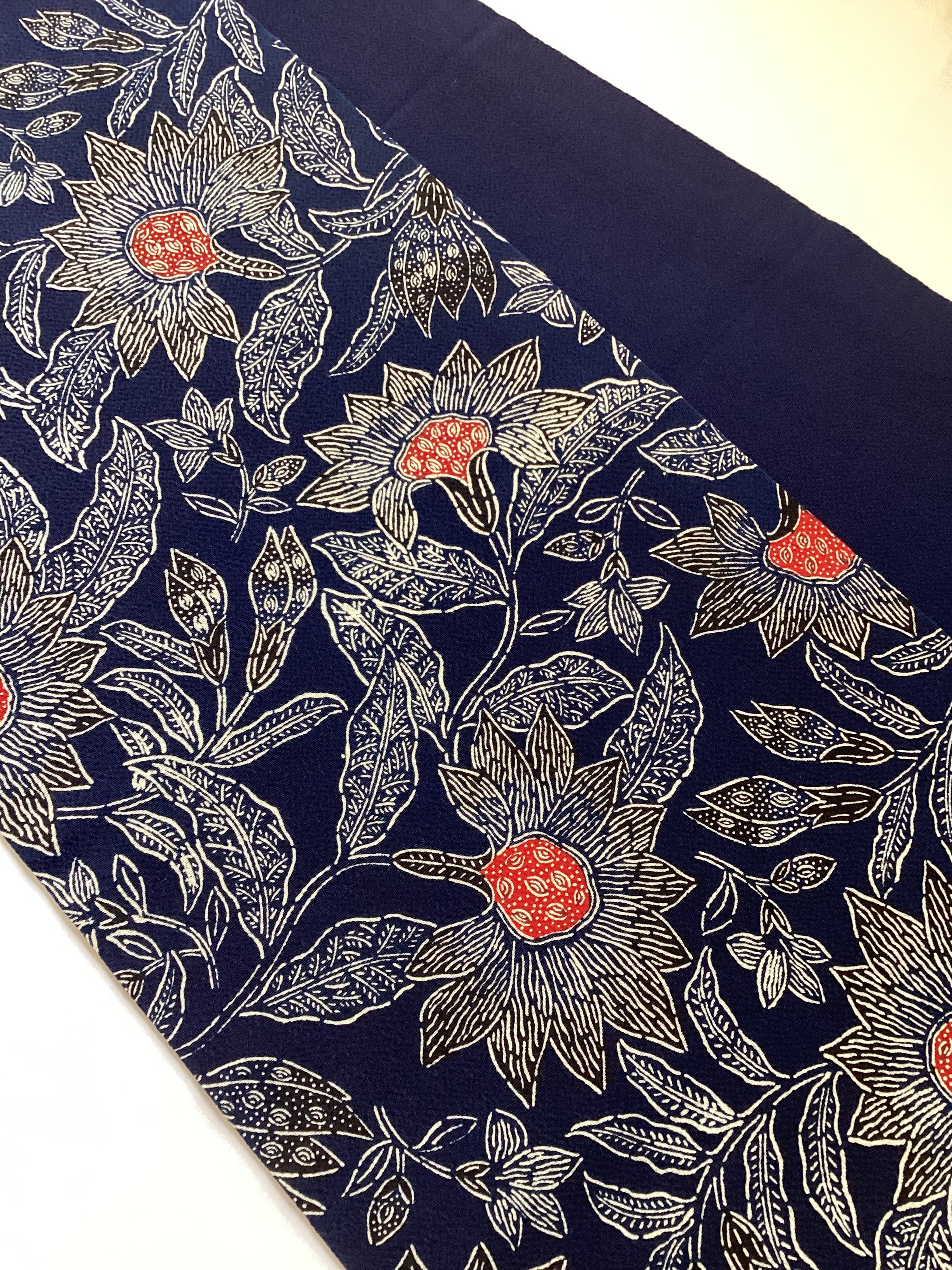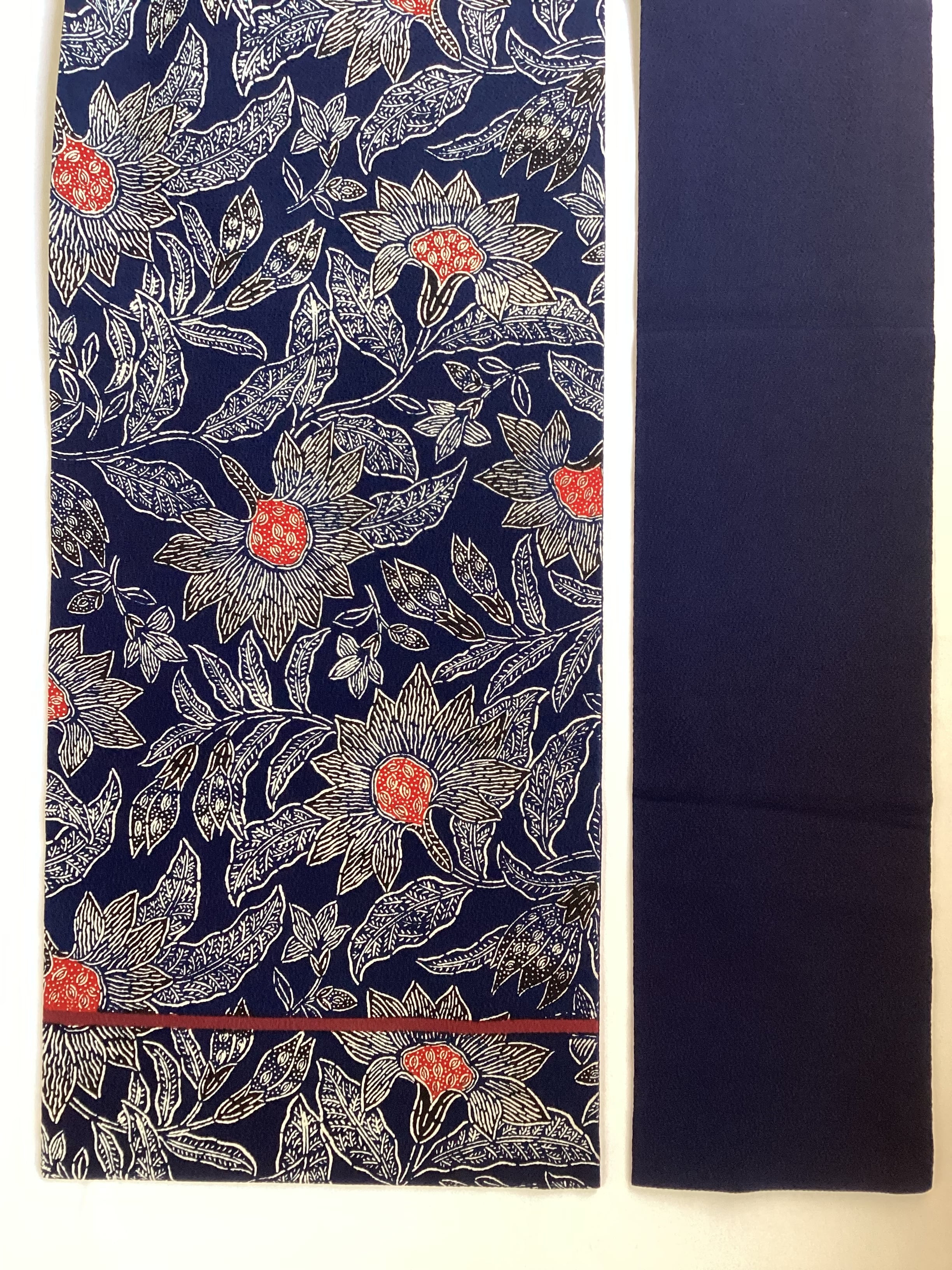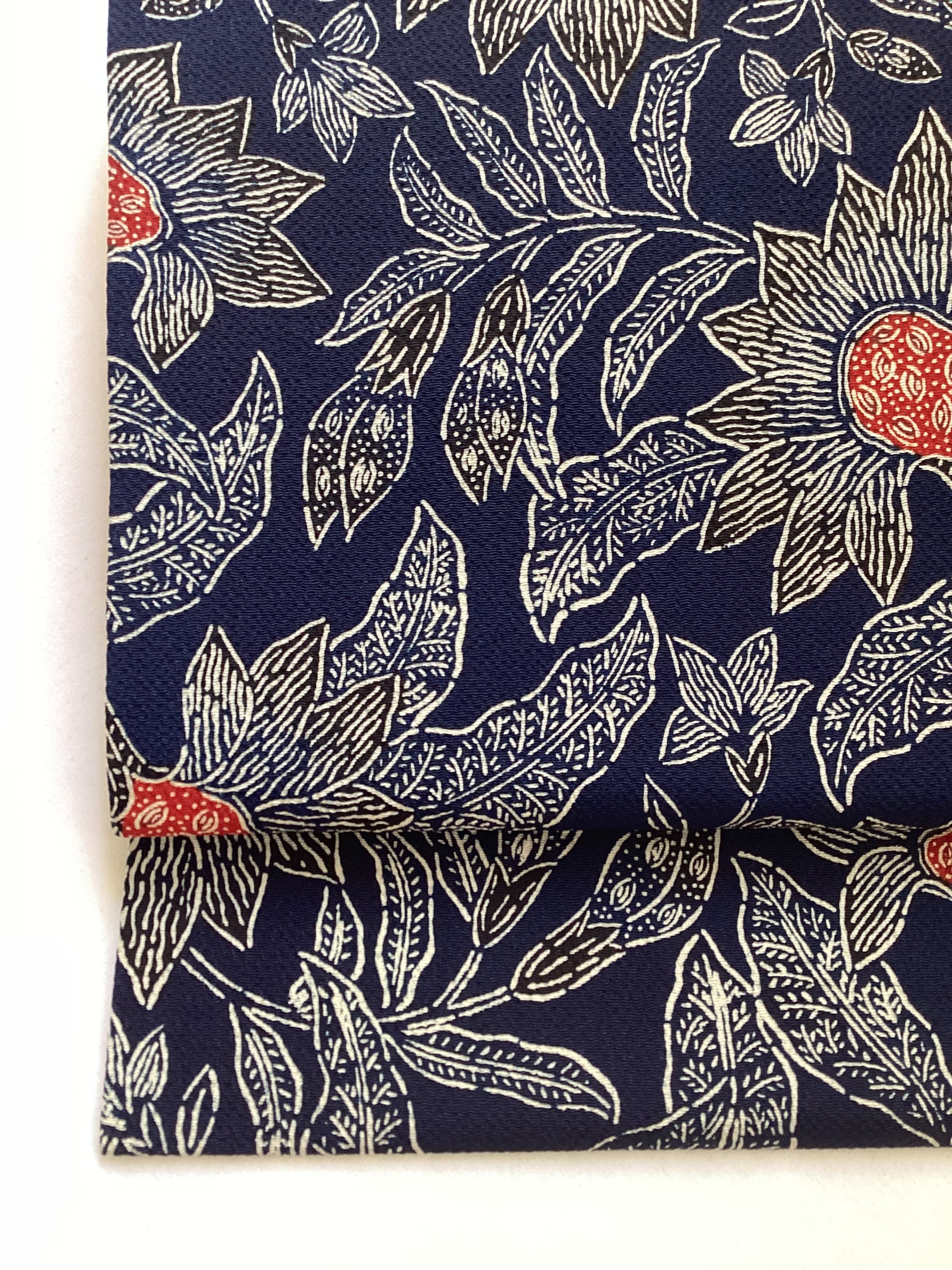 昭和を代表する工芸染色家【浦野理一】の縮緬地の型染めの九寸なごや帯です。深みのある濃い藍色と、迫力ある唐花の白い線のタッチ、アクセントとなる赤い花芯、その独特の風合いや世界観を持つ昨品に目を奪われます。現在でも多くの着物ファンを魅了し続ける【浦野理一】の力強い作品です。こだわりの詰まった巨匠の逸品をワードローブに加えて、着物生活を更に楽しみませんか?