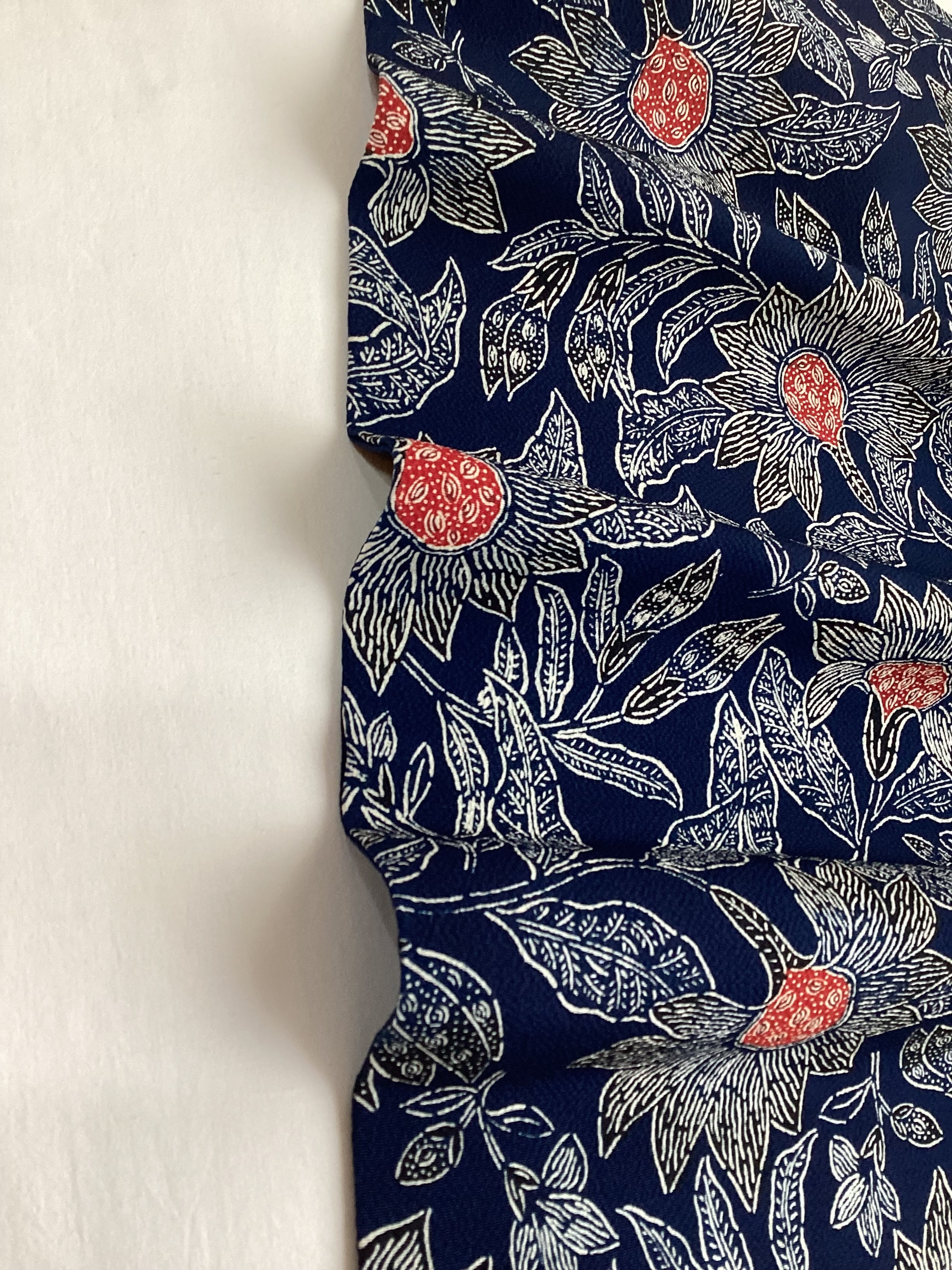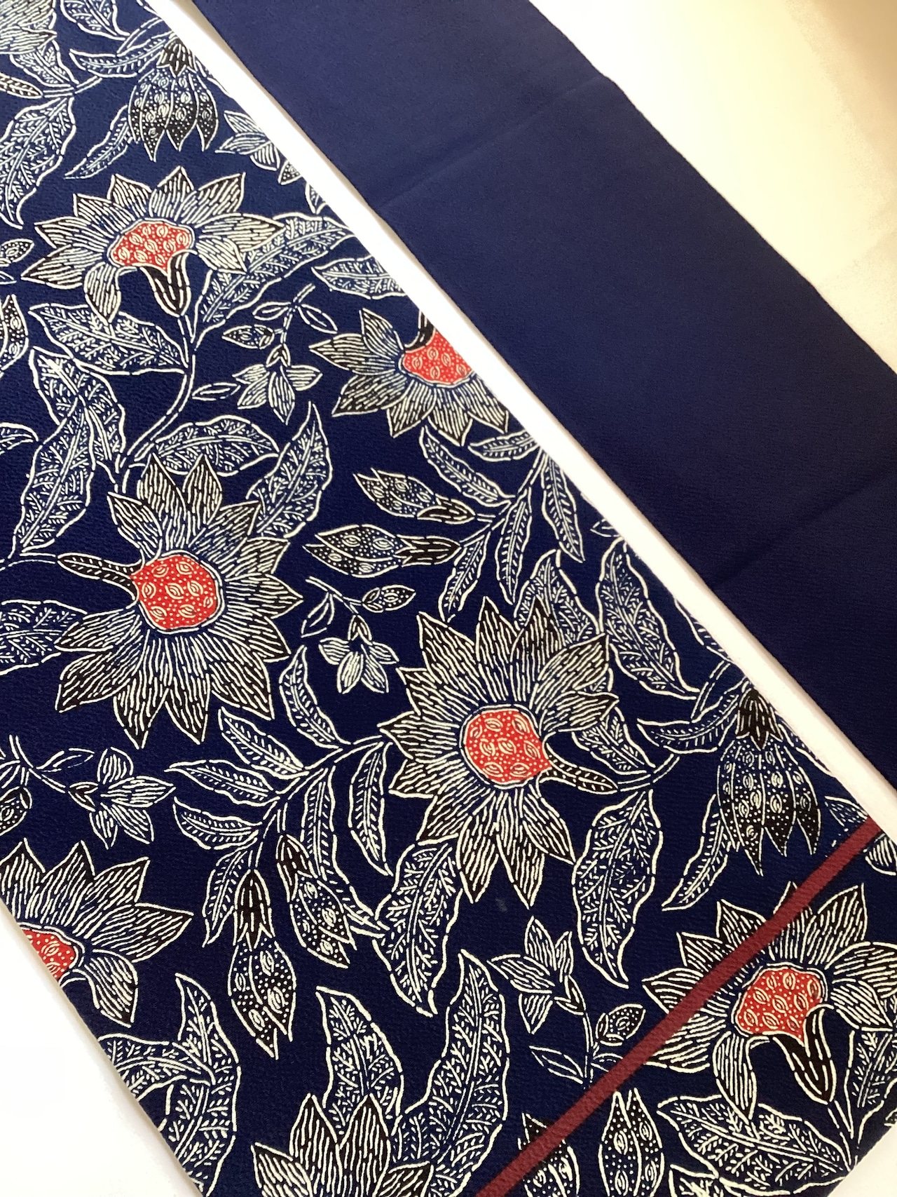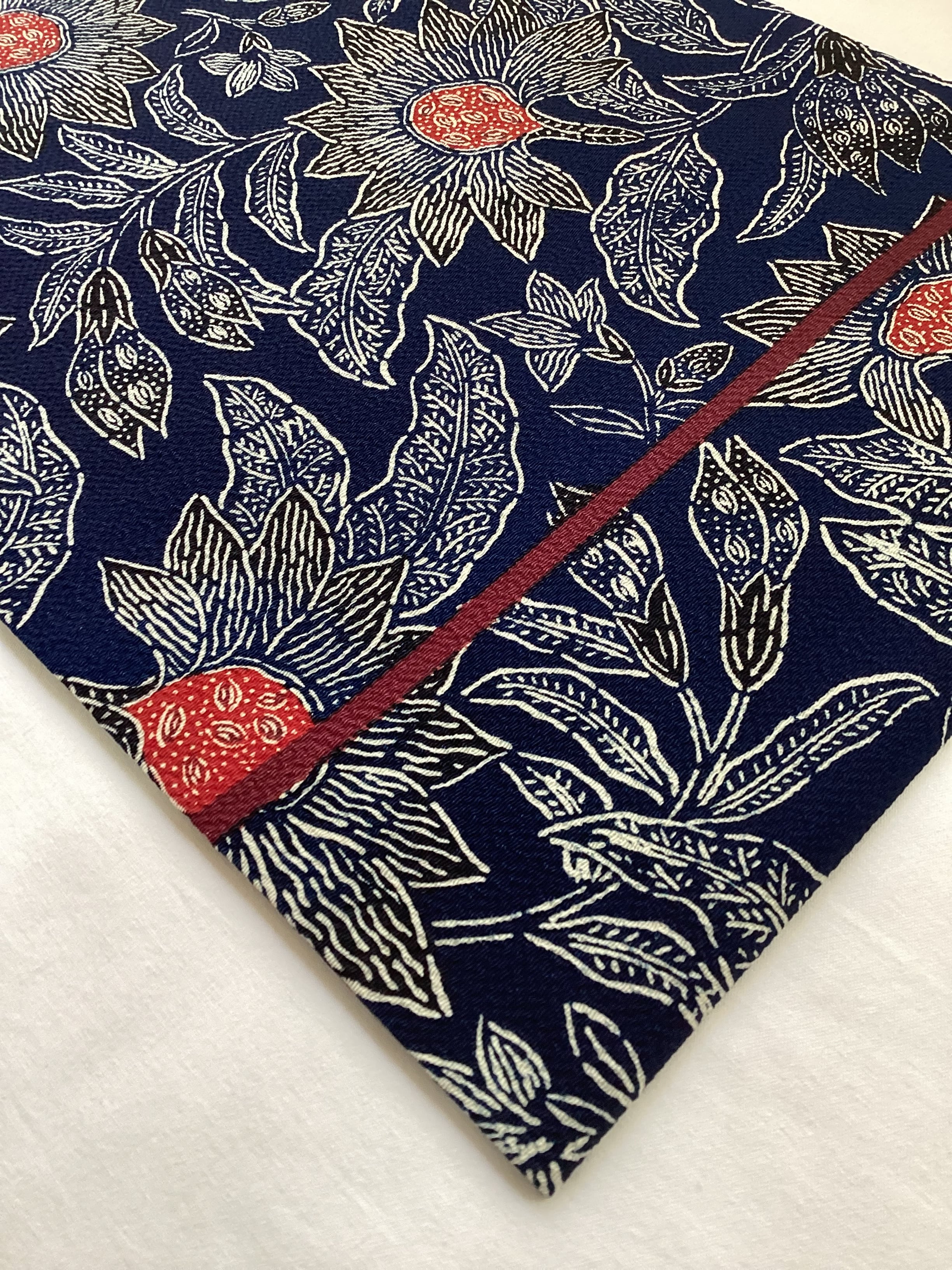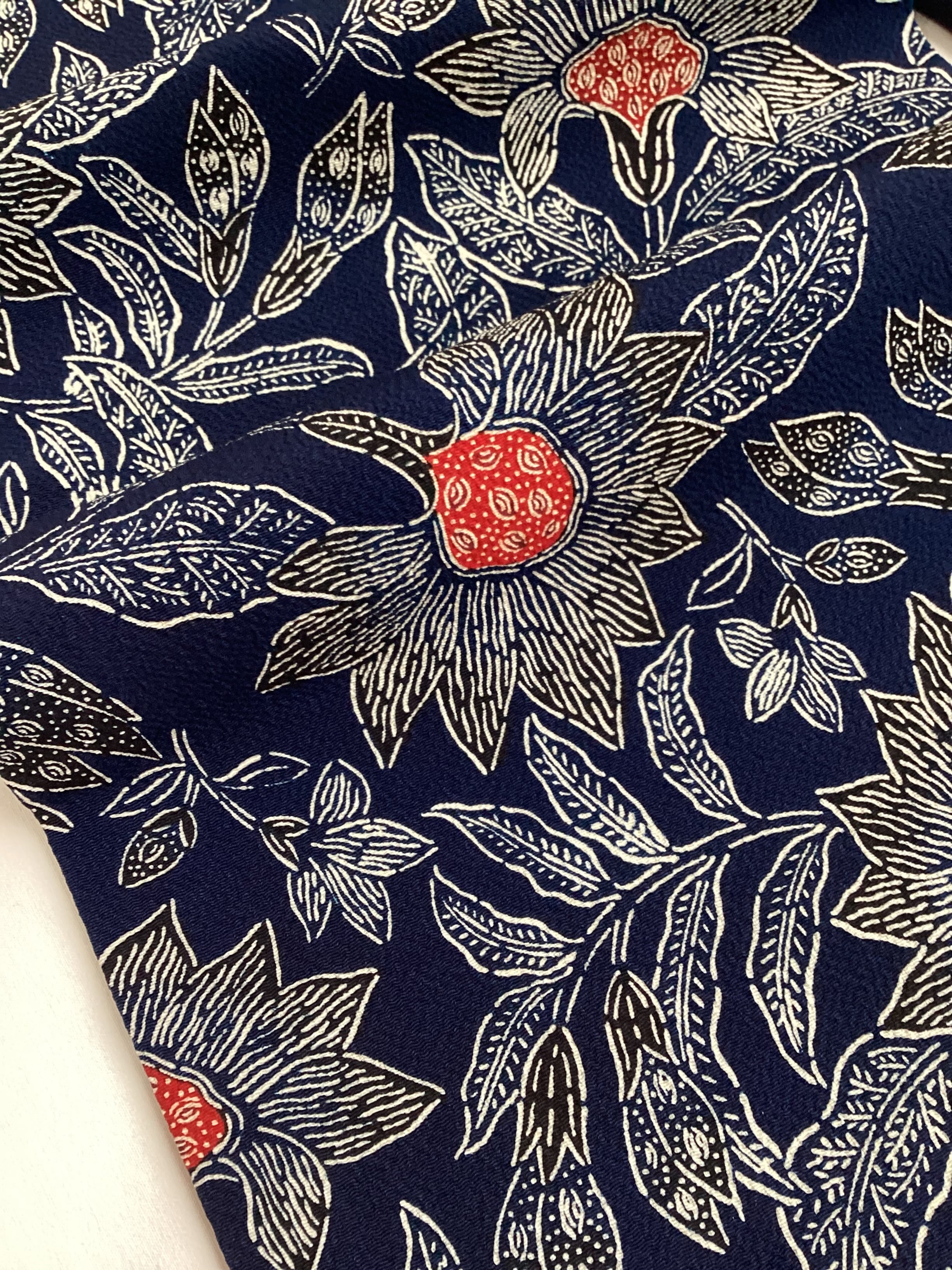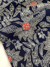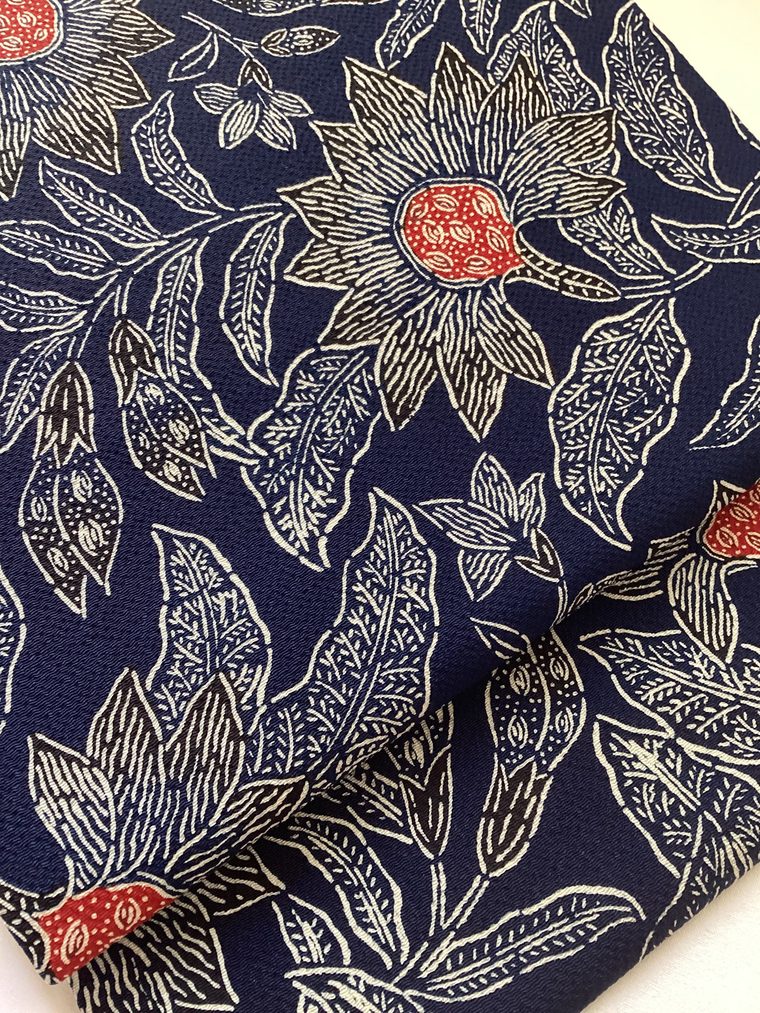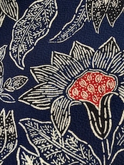 昭和を代表する工芸染色家【浦野理一】の縮緬地の型染めの九寸なごや帯です。深みのある濃い藍色と、迫力ある唐花の白い線のタッチ、アクセントとなる赤い花芯、その独特の風合いや世界観を持つ昨品に目を奪われます。現在でも多くの着物ファンを魅了し続ける【浦野理一】の力強い作品です。こだわりの詰まった巨匠の逸品をワードローブに加えて、着物生活を更に楽しみませんか?