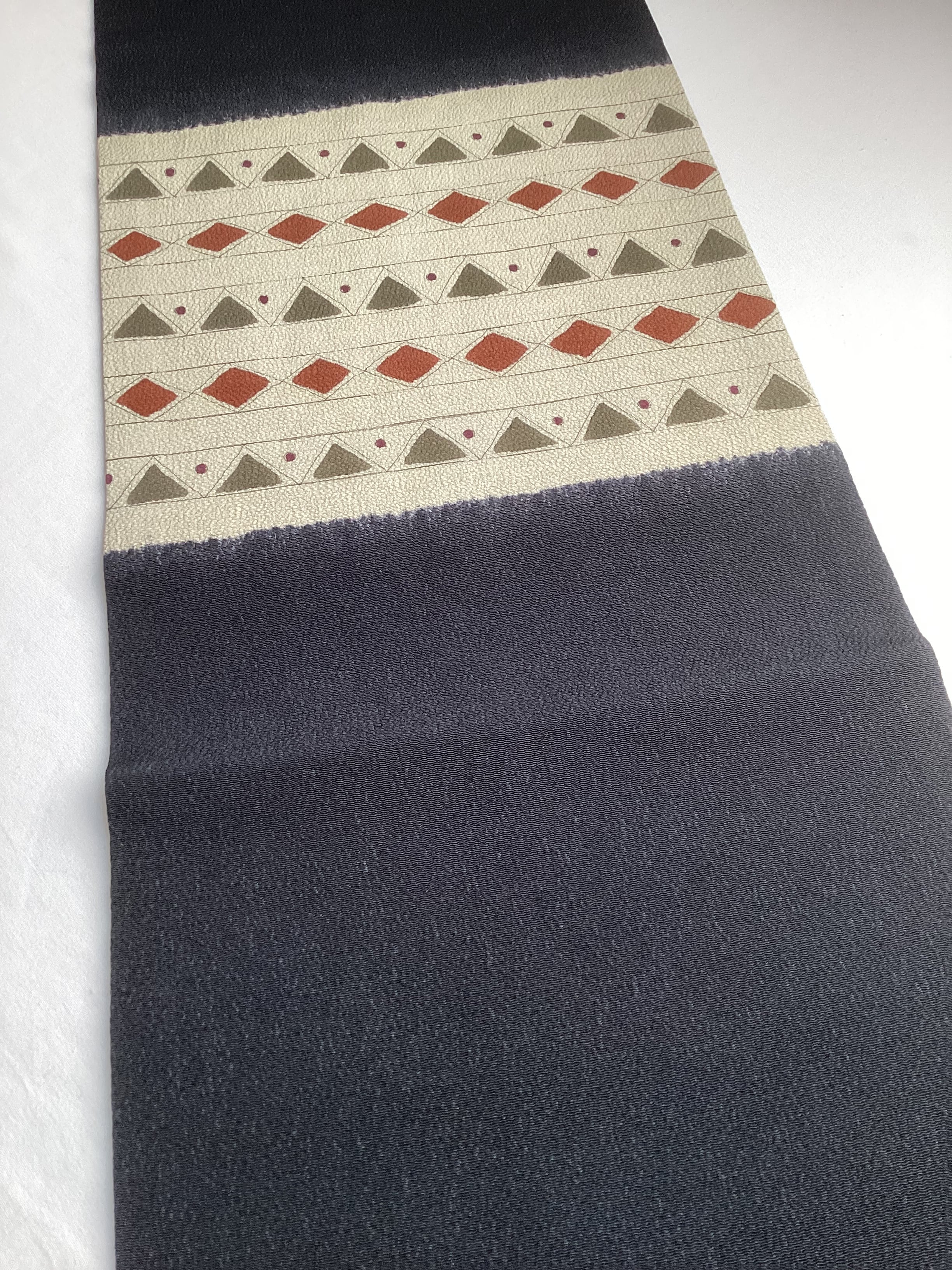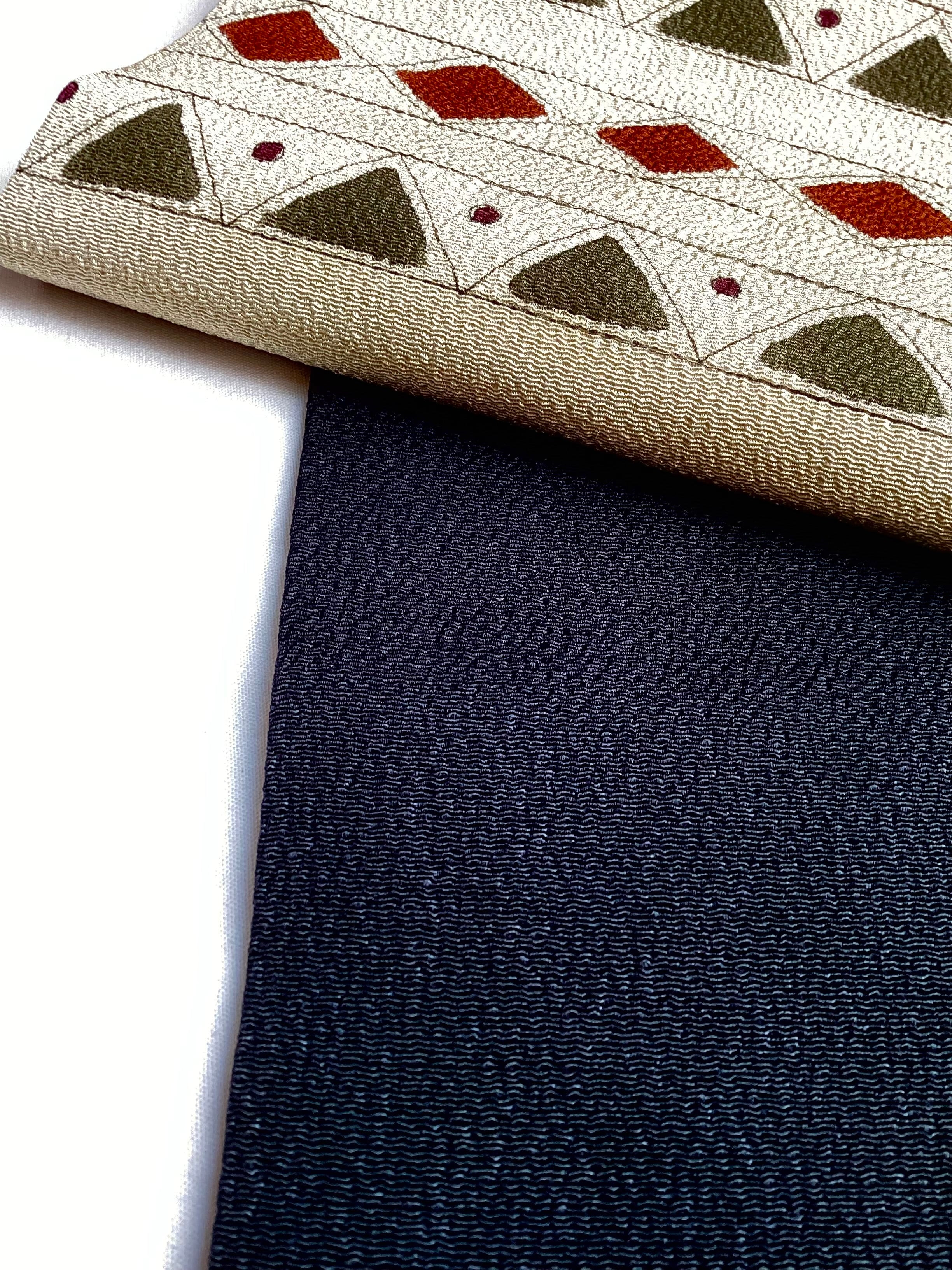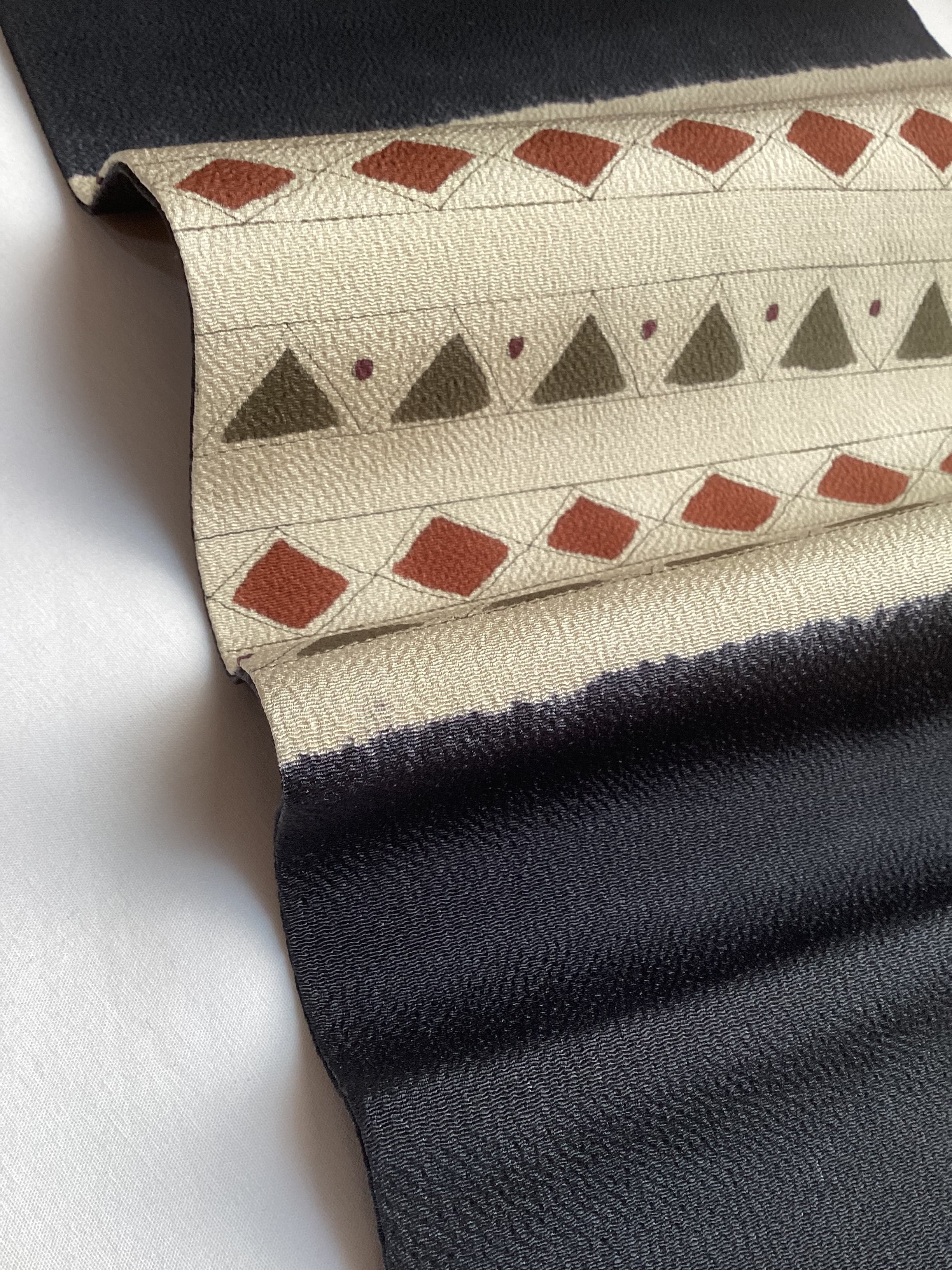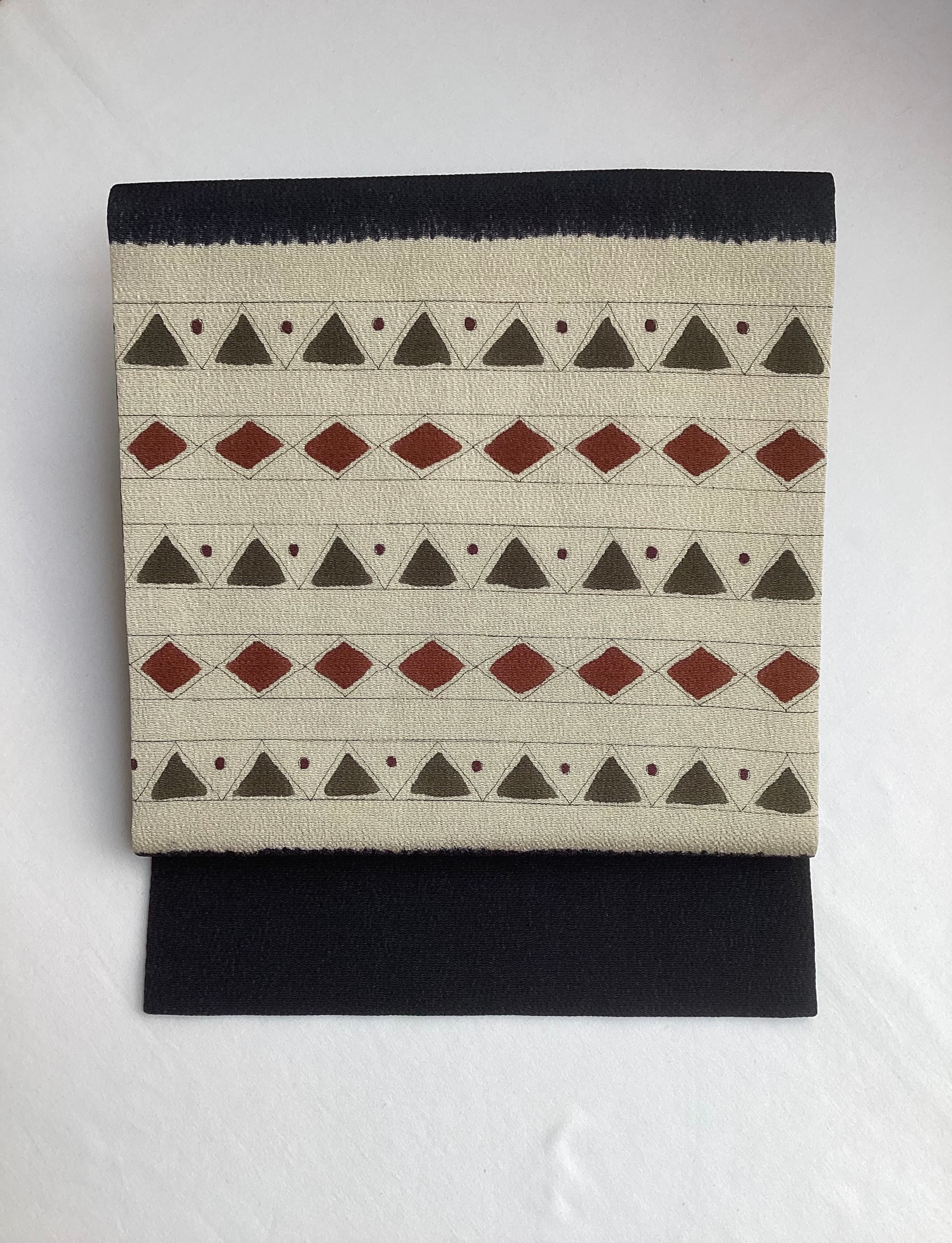 ふっくらとシボ立った縮緬地の染め帯です。着姿を引き締めてくれる黒地にポイント柄として菱や三角の幾何学文様が並んでいます。主張し過ぎない計算された配色なので着回しが効き、抽象的なモチーフなので季節に縛られずに袷のきものに気軽にコーディネートしていただけます。大人のカジュアルに丁度良い一本です。