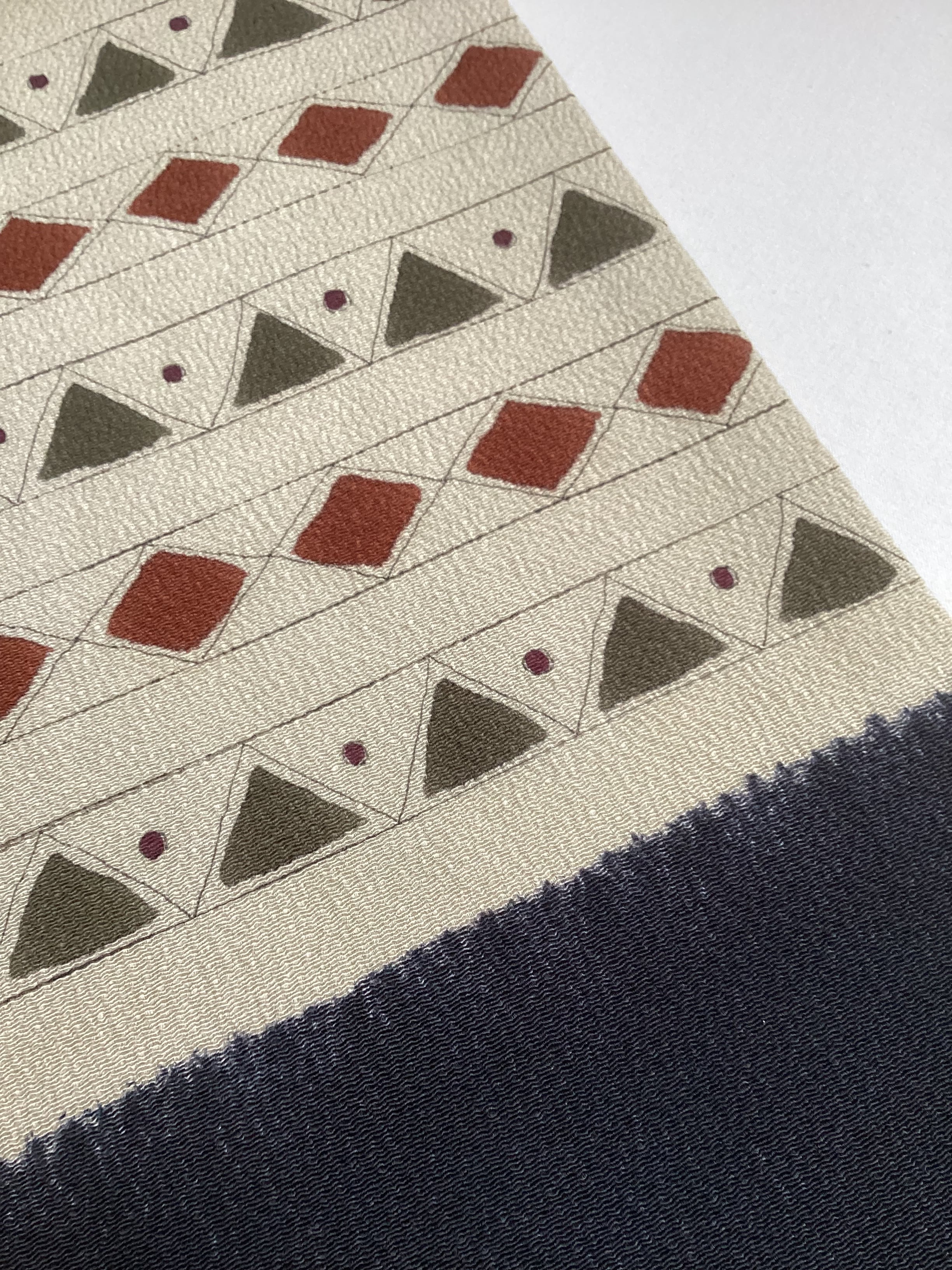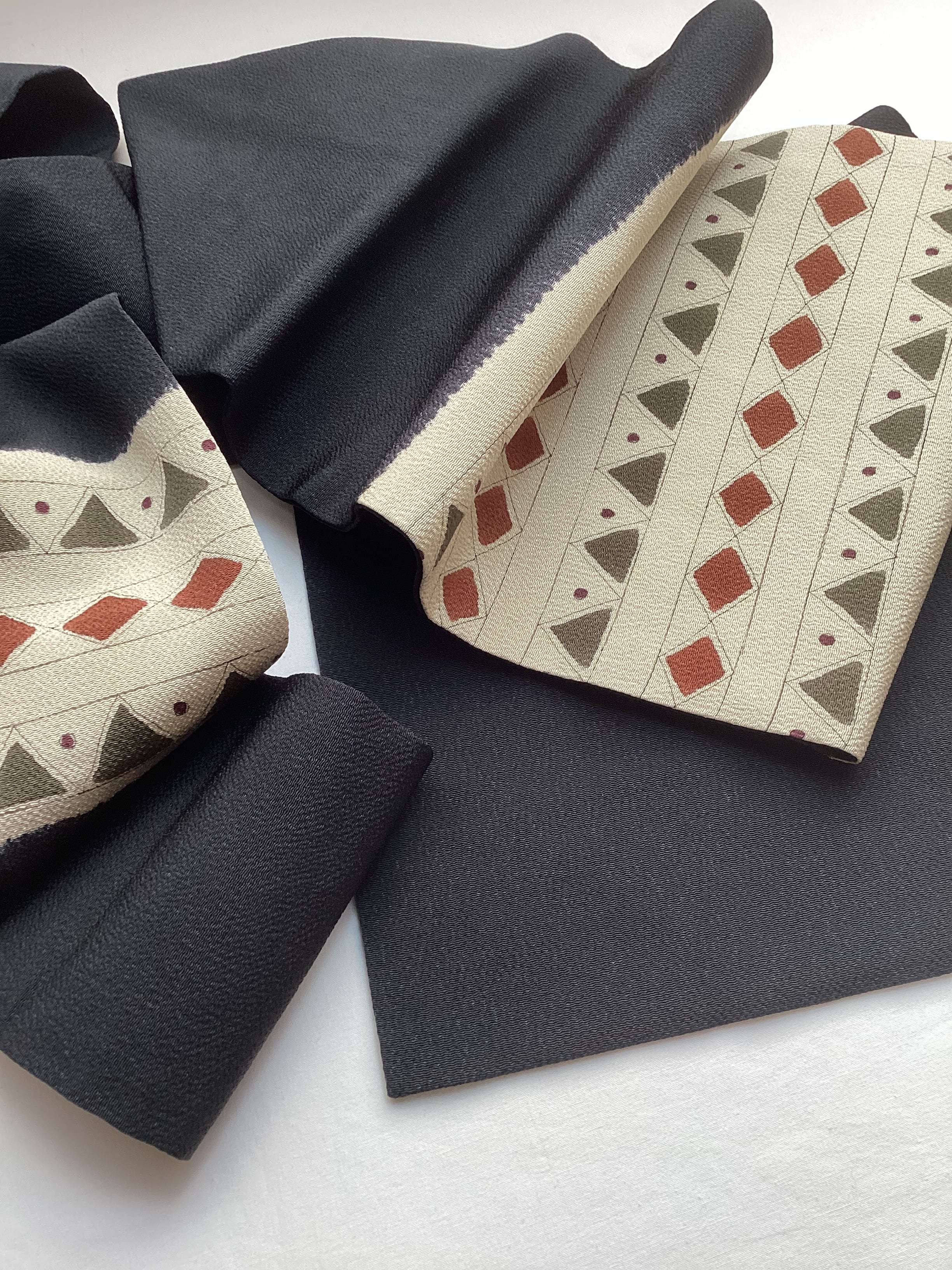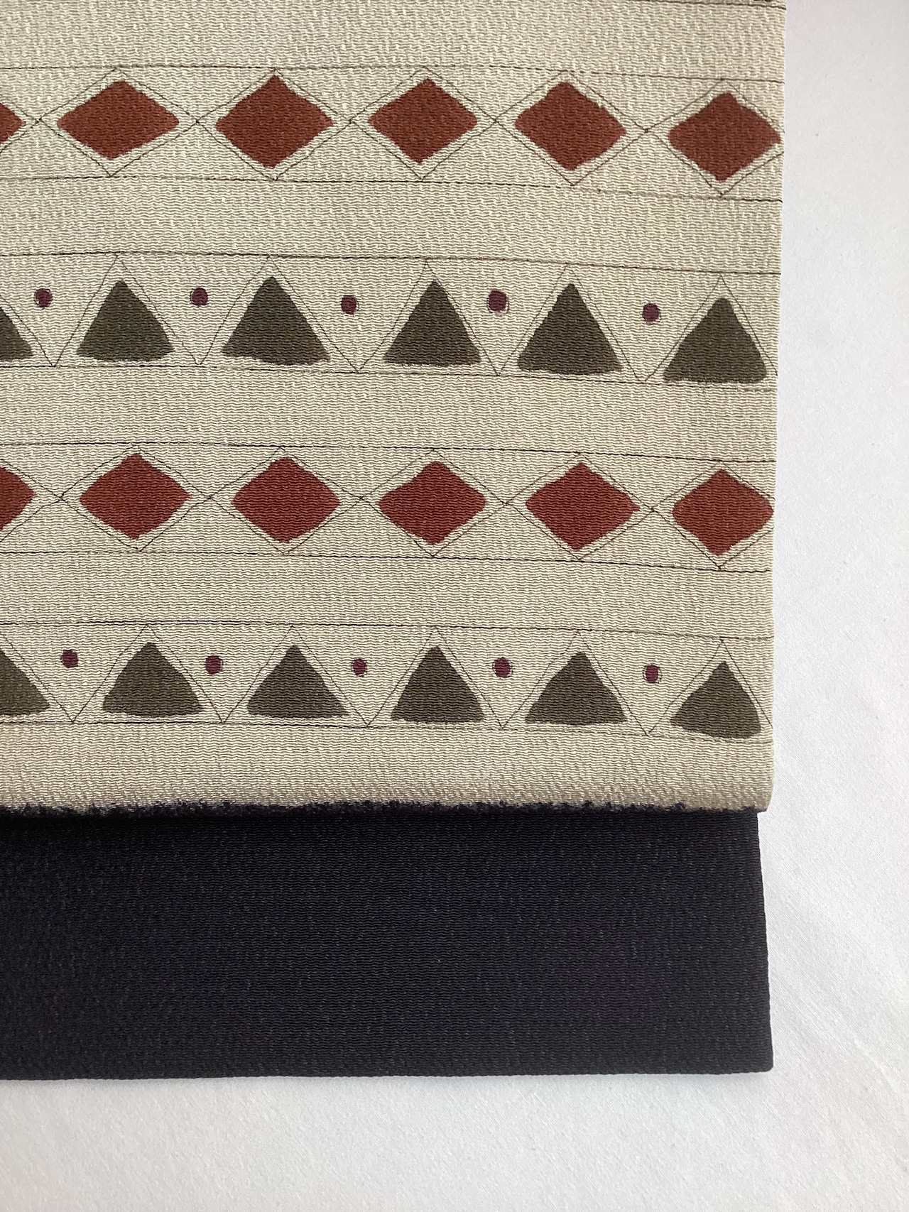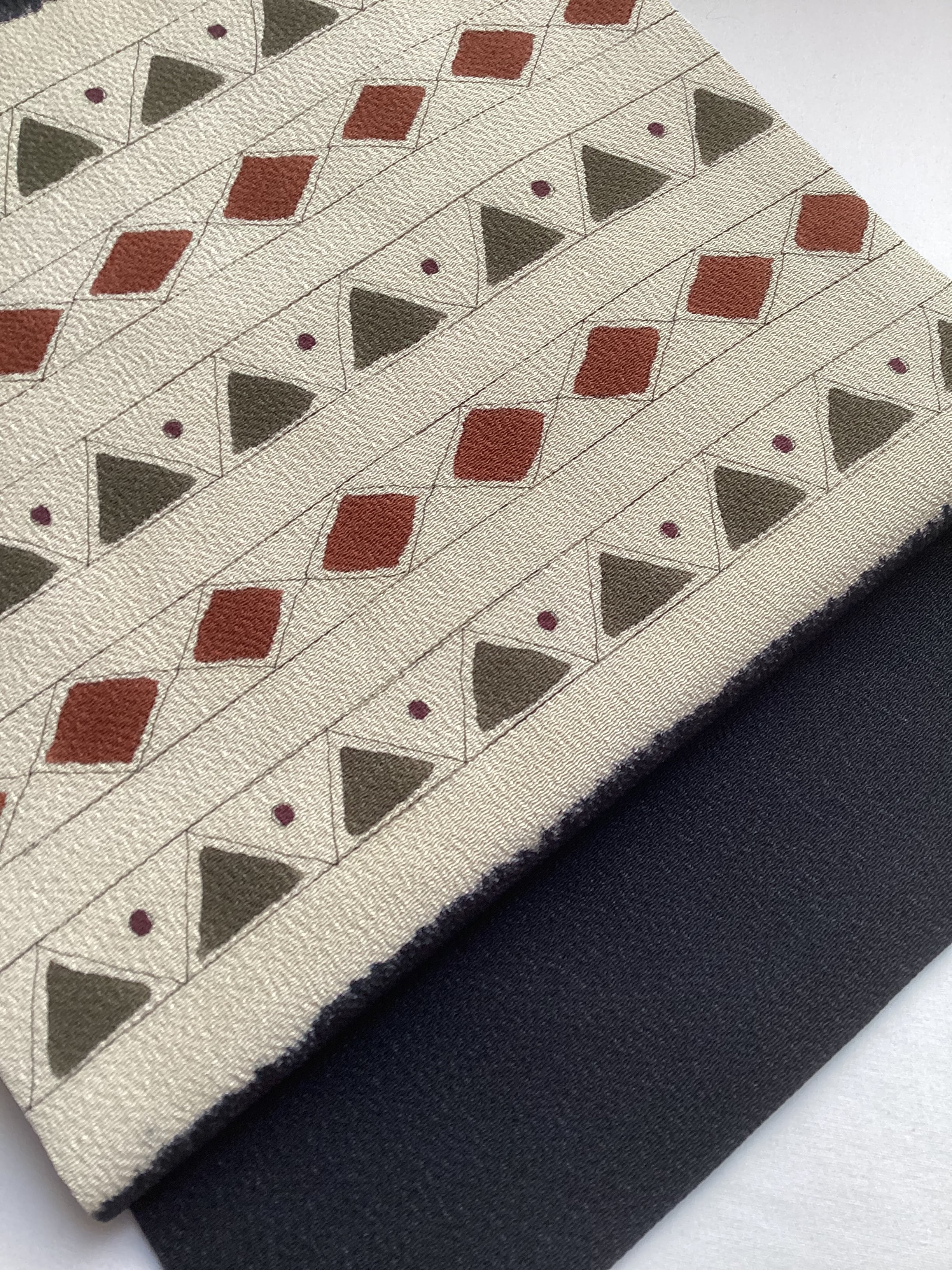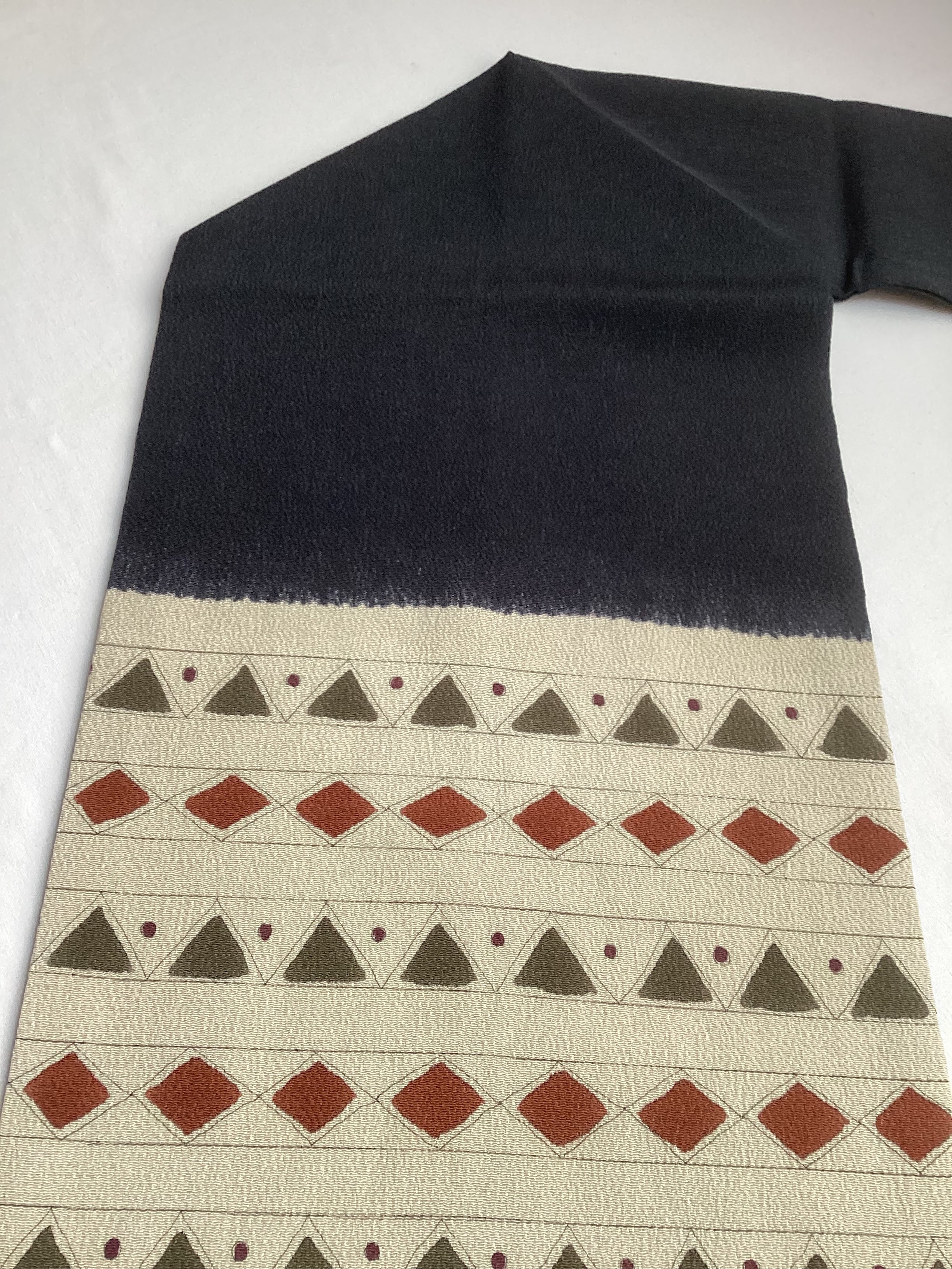 ふっくらとシボ立った縮緬地の染め帯です。着姿を引き締めてくれる黒地にポイント柄として菱や三角の幾何学文様が並んでいます。主張し過ぎない計算された配色なので着回しが効き、抽象的なモチーフなので季節に縛られずに袷のきものに気軽にコーディネートしていただけます。大人のカジュアルに丁度良い一本です。