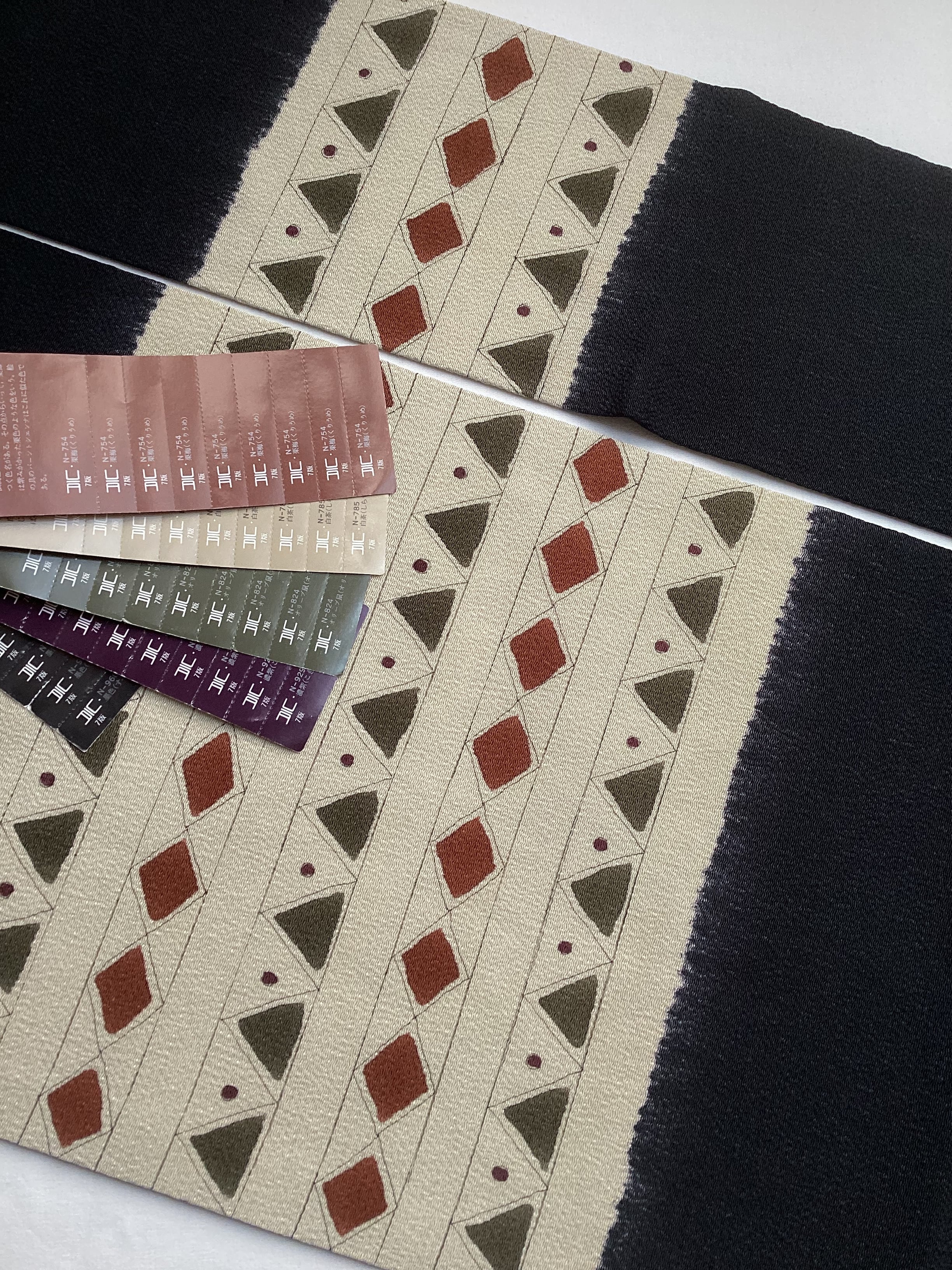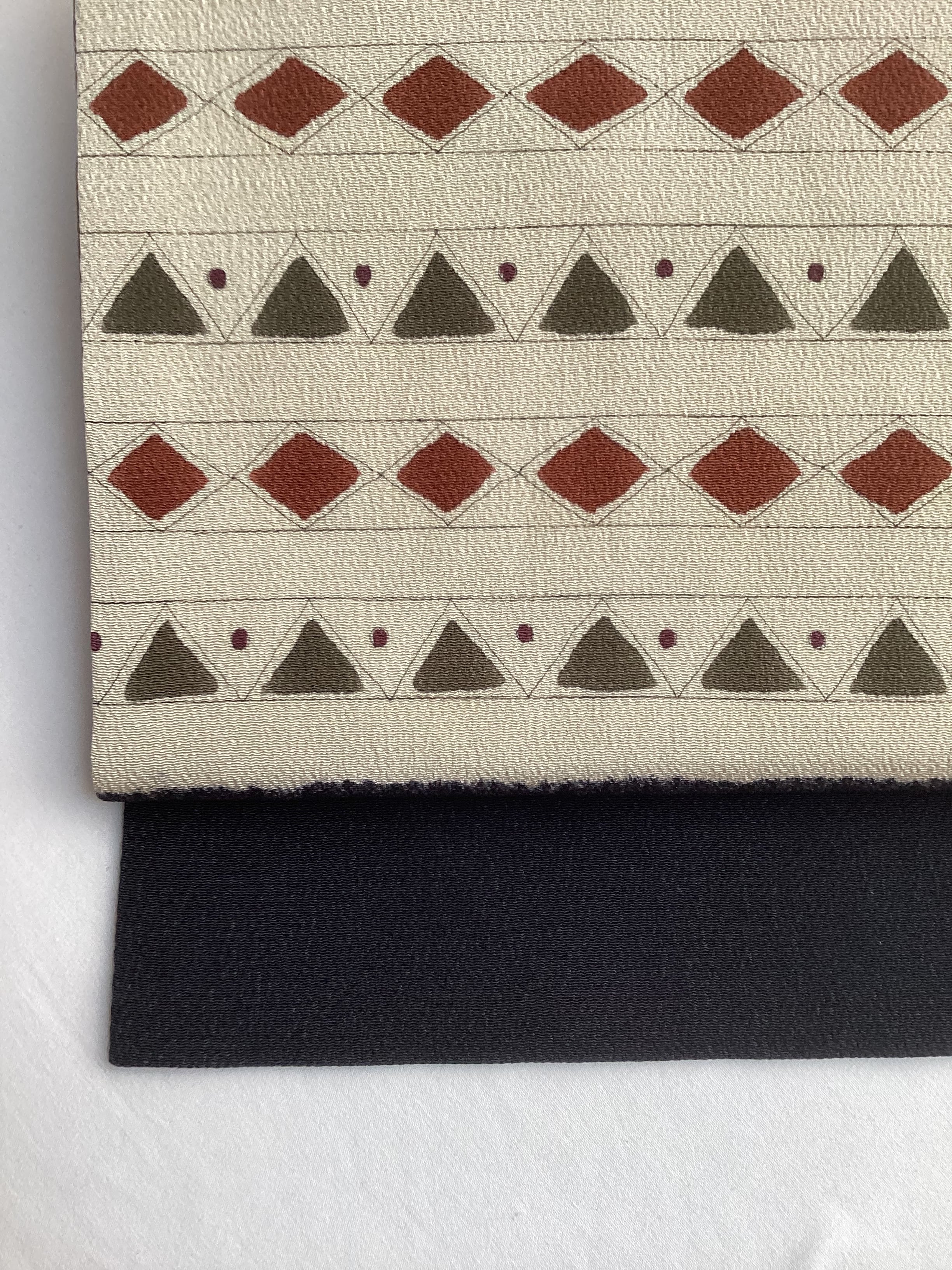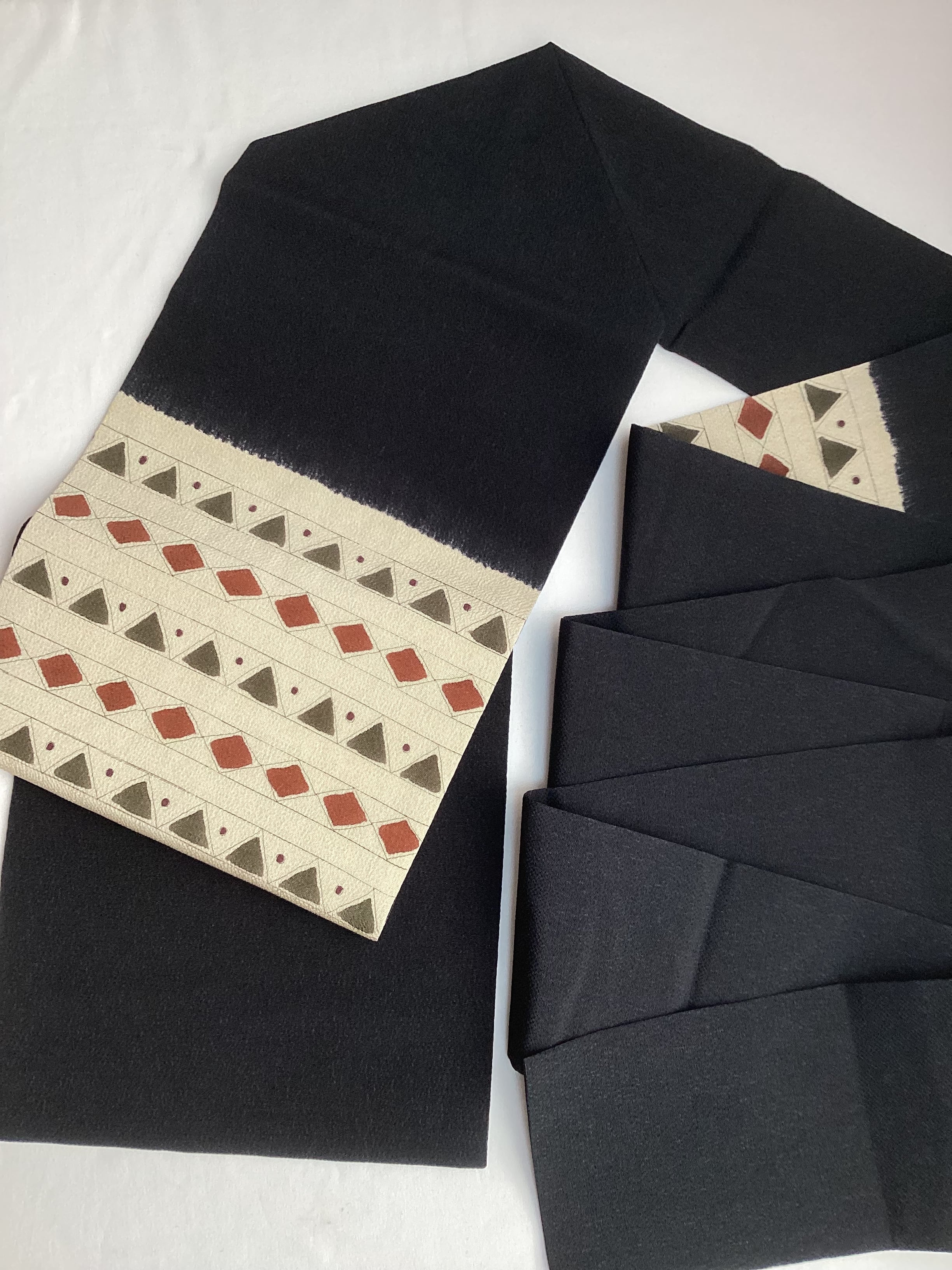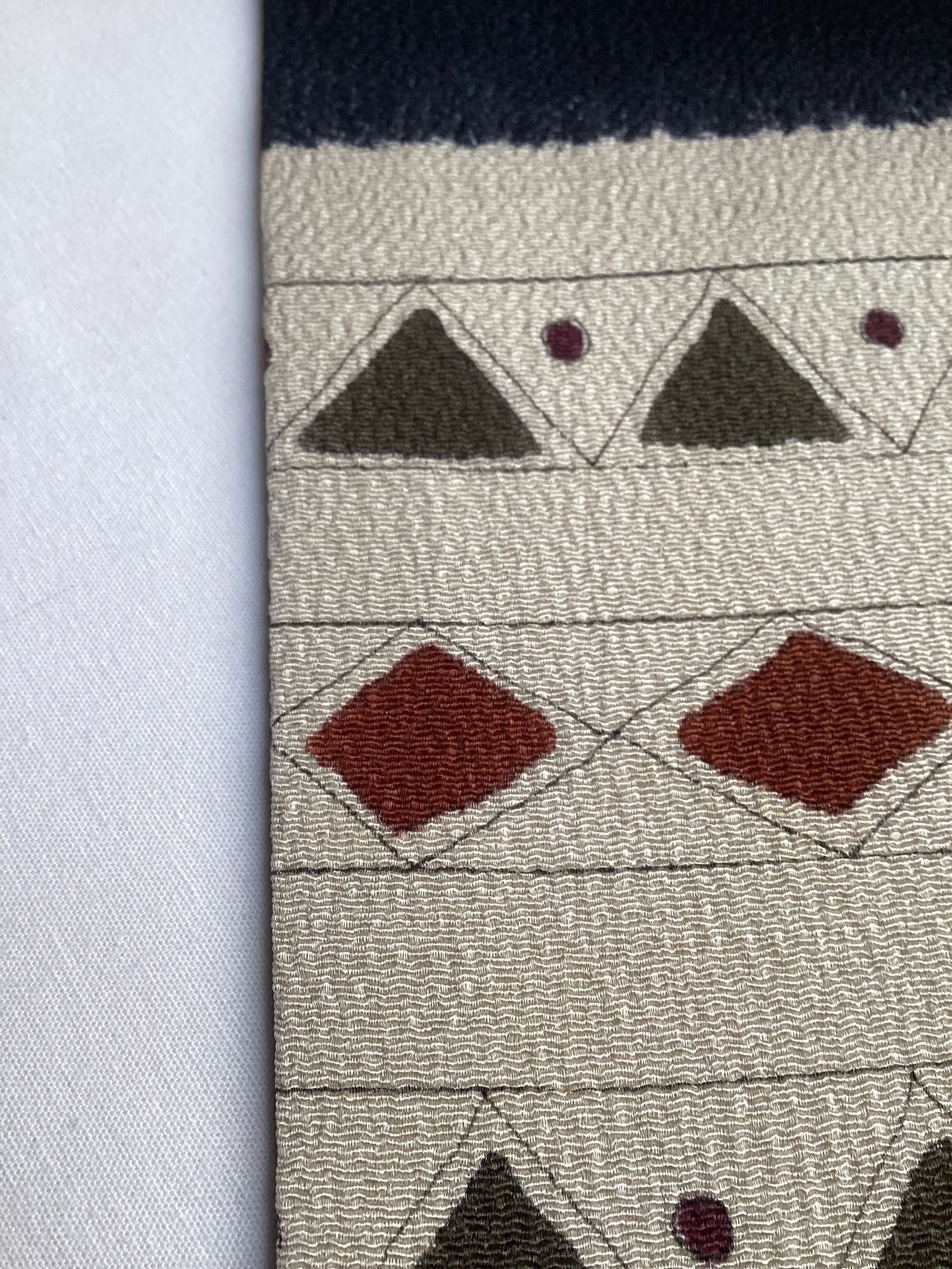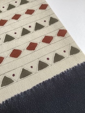 ふっくらとシボ立った縮緬地の染め帯です。着姿を引き締めてくれる黒地にポイント柄として菱や三角の幾何学文様が並んでいます。主張し過ぎない計算された配色なので着回しが効き、抽象的なモチーフなので季節に縛られずに袷のきものに気軽にコーディネートしていただけます。大人のカジュアルに丁度良い一本です。