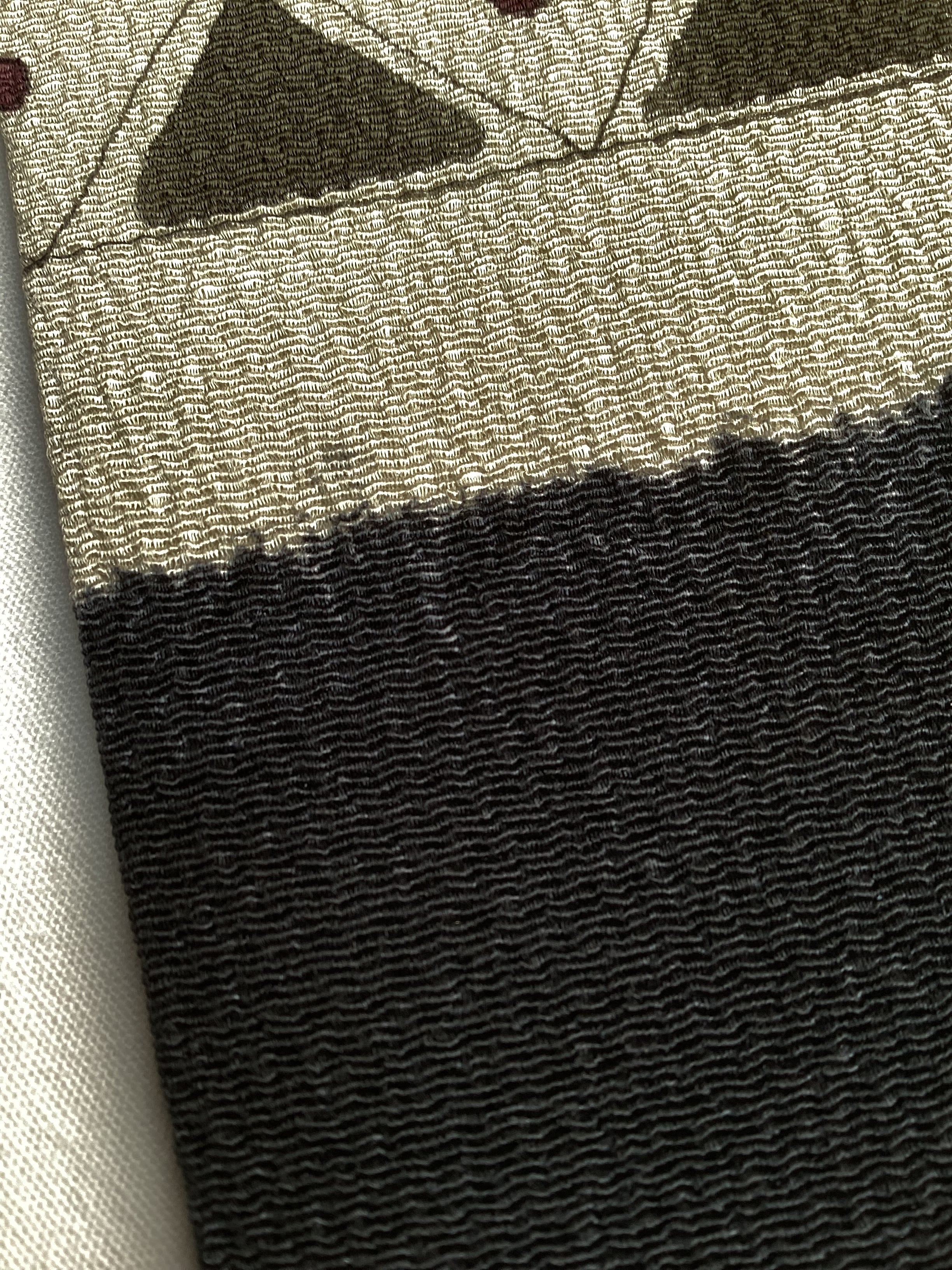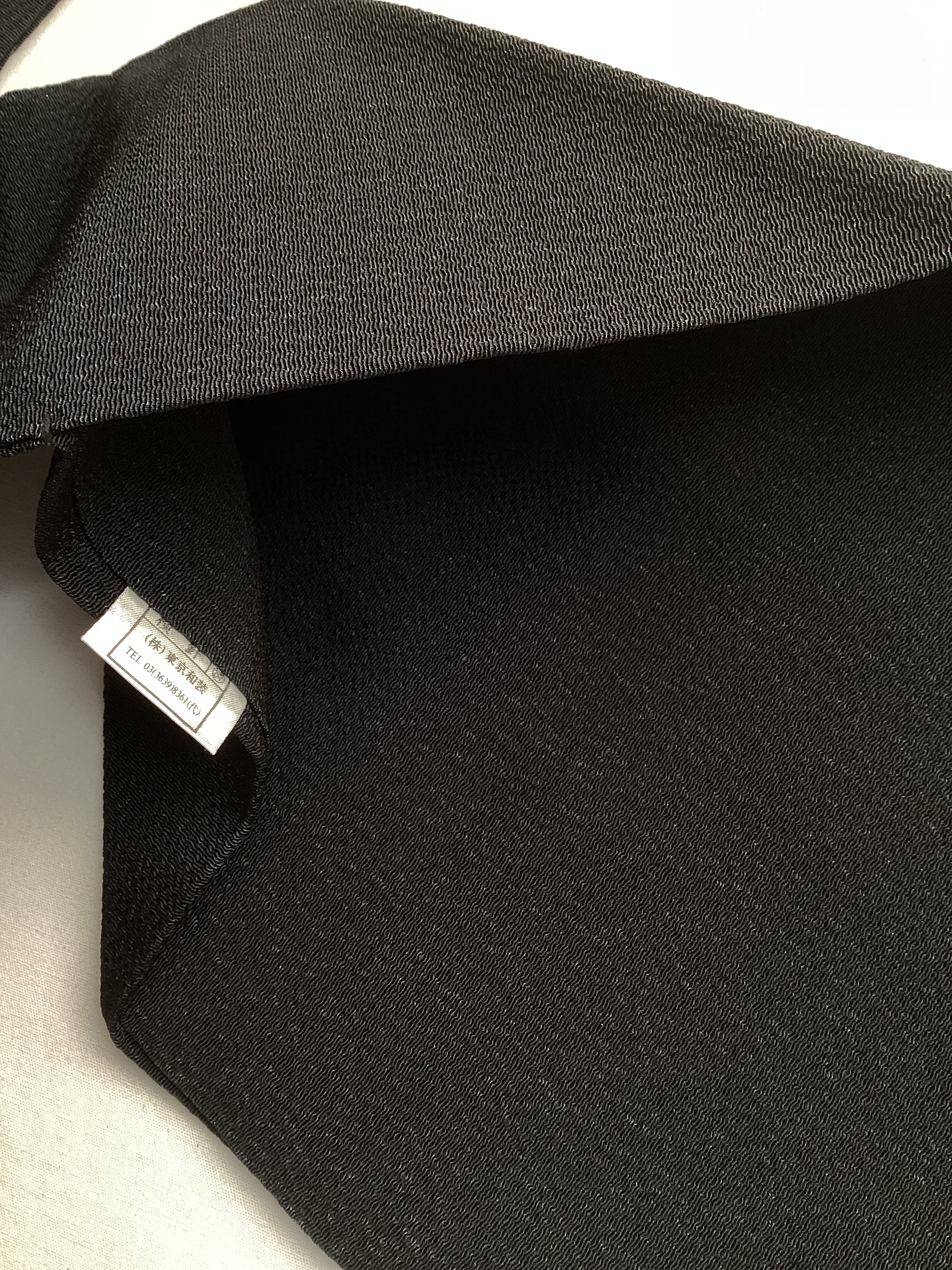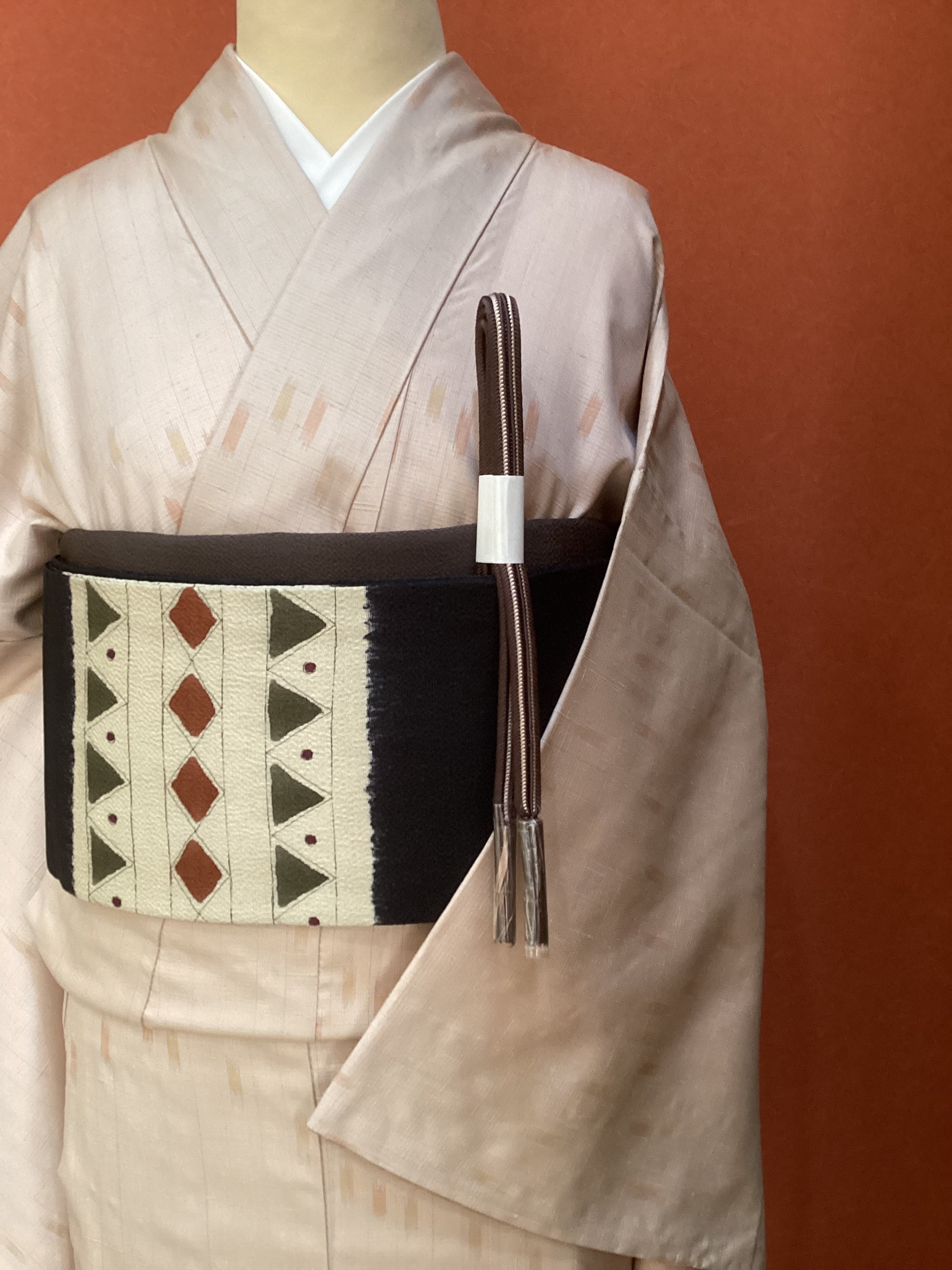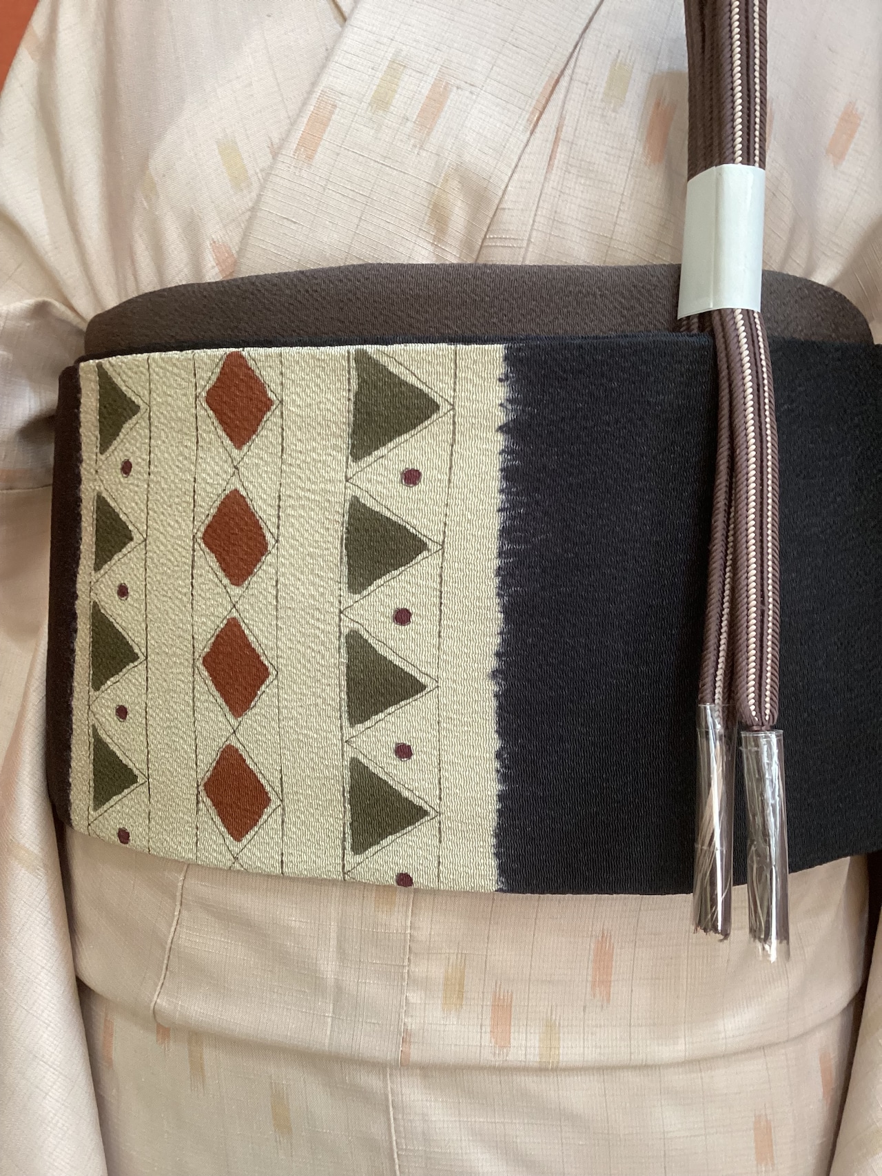 ふっくらとシボ立った縮緬地の染め帯です。着姿を引き締めてくれる黒地にポイント柄として菱や三角の幾何学文様が並んでいます。主張し過ぎない計算された配色なので着回しが効き、抽象的なモチーフなので季節に縛られずに袷のきものに気軽にコーディネートしていただけます。大人のカジュアルに丁度良い一本です。