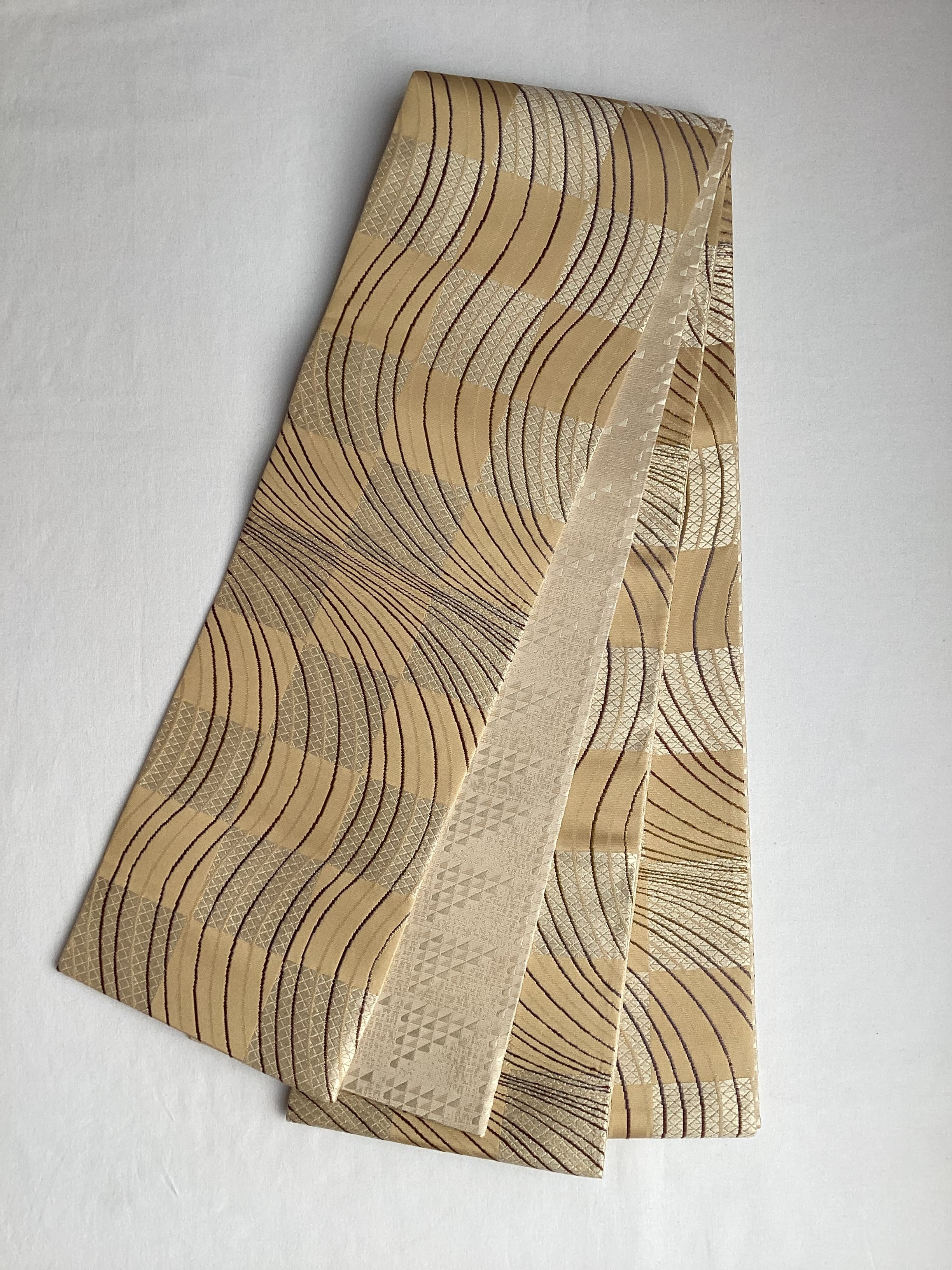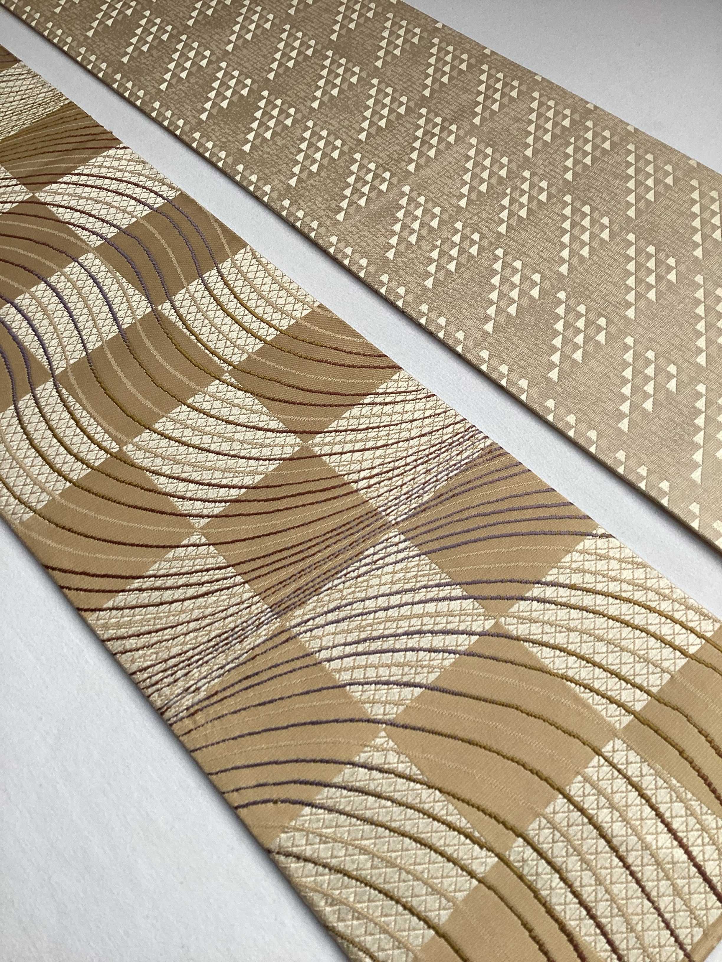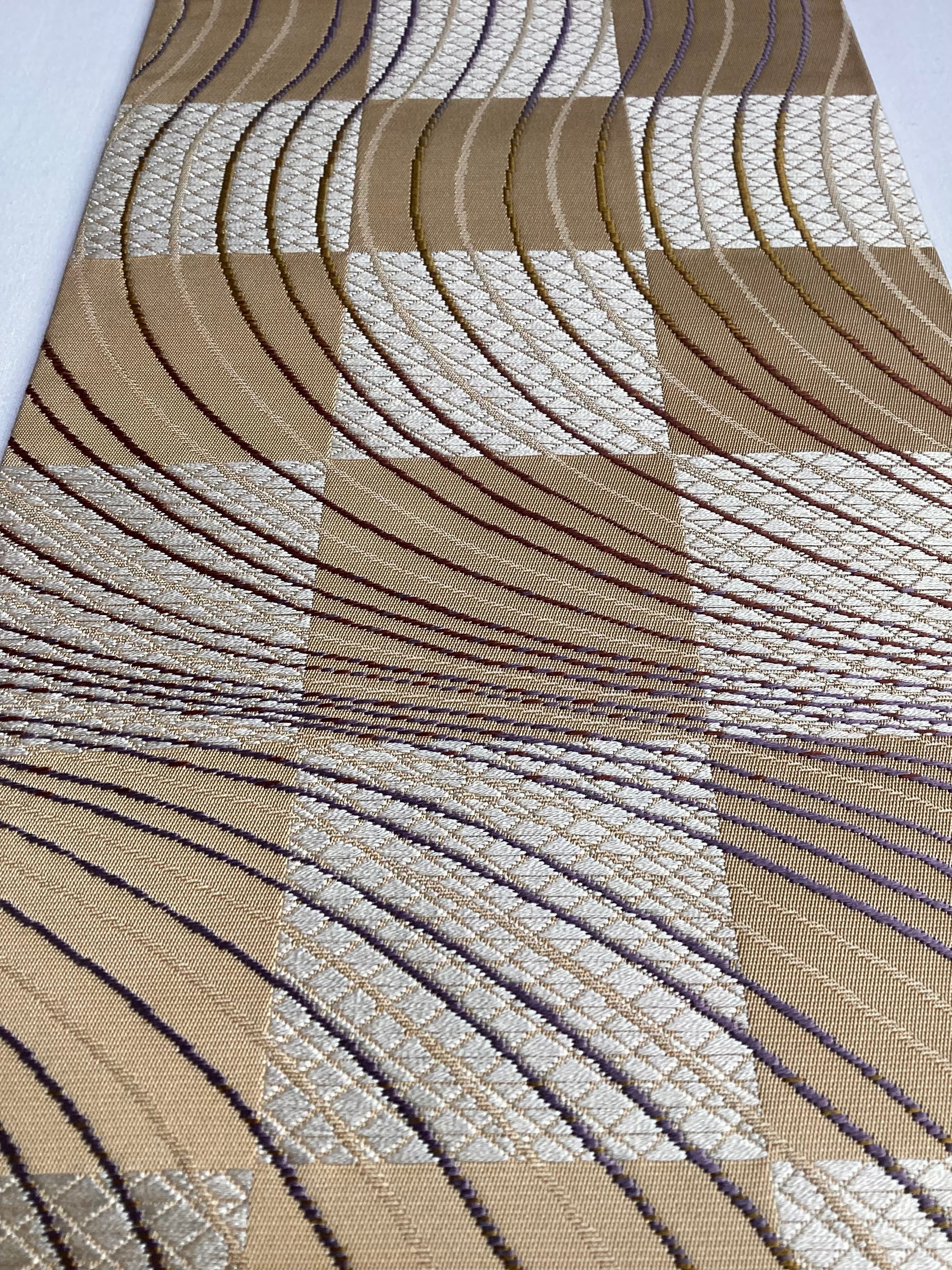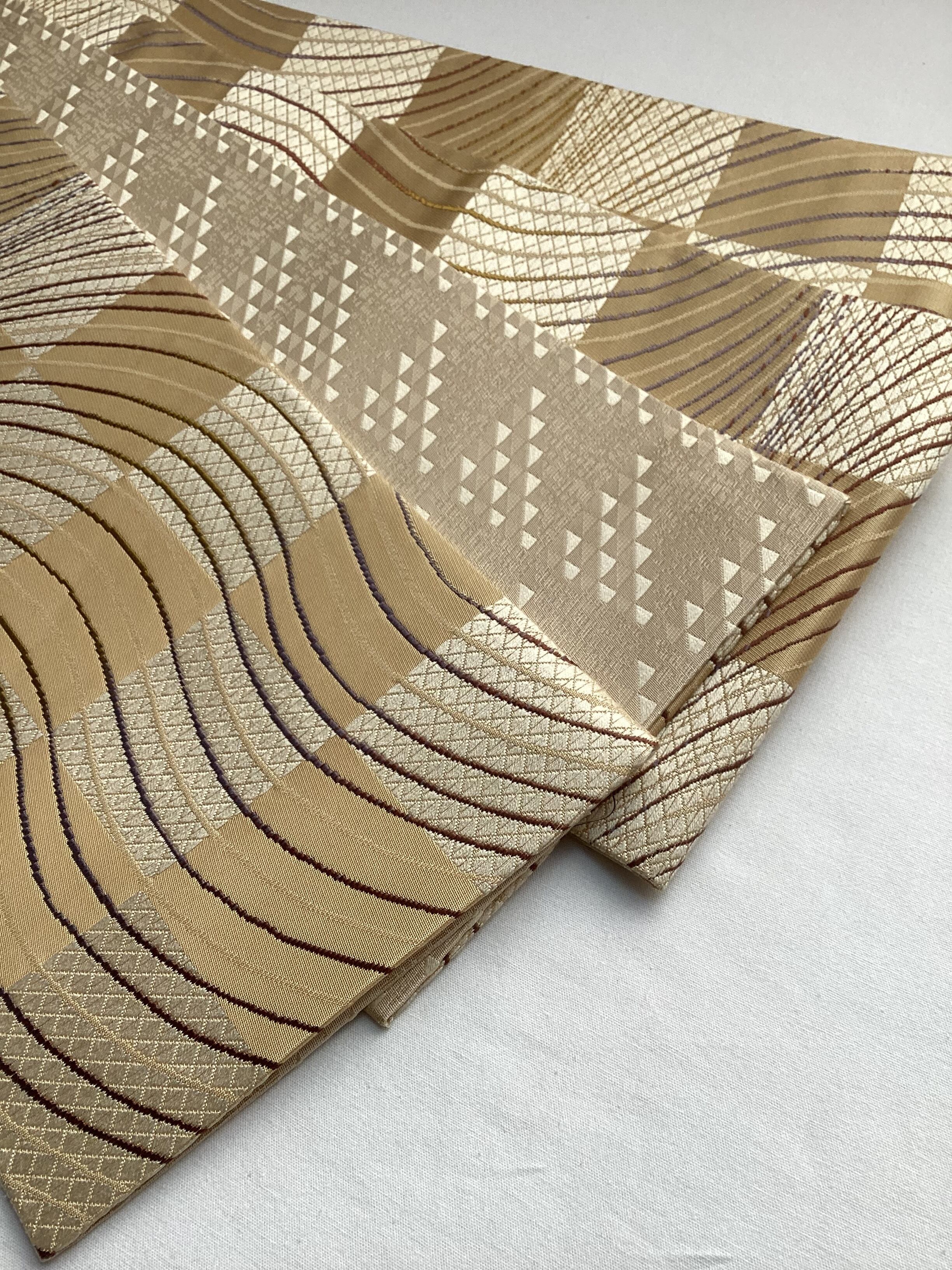 丁子色地市松によろけ縞文×鱗文両面半巾帯 260205-2