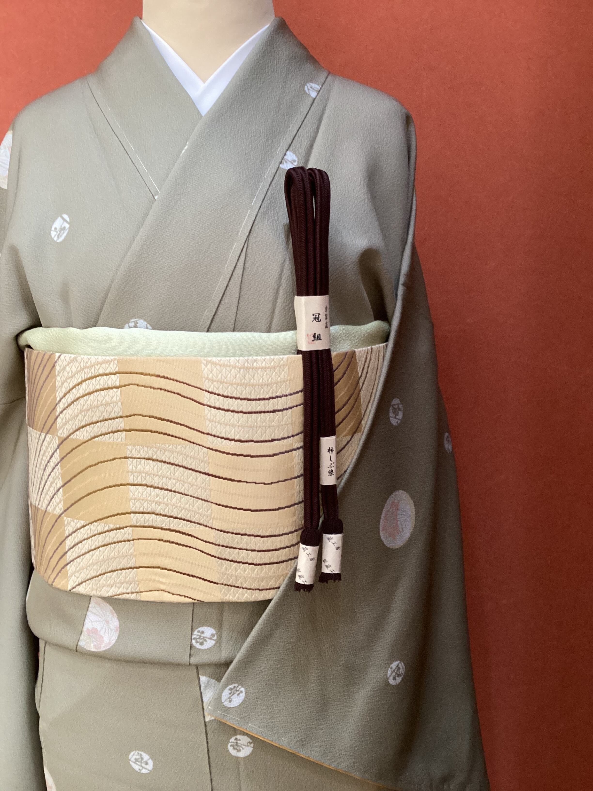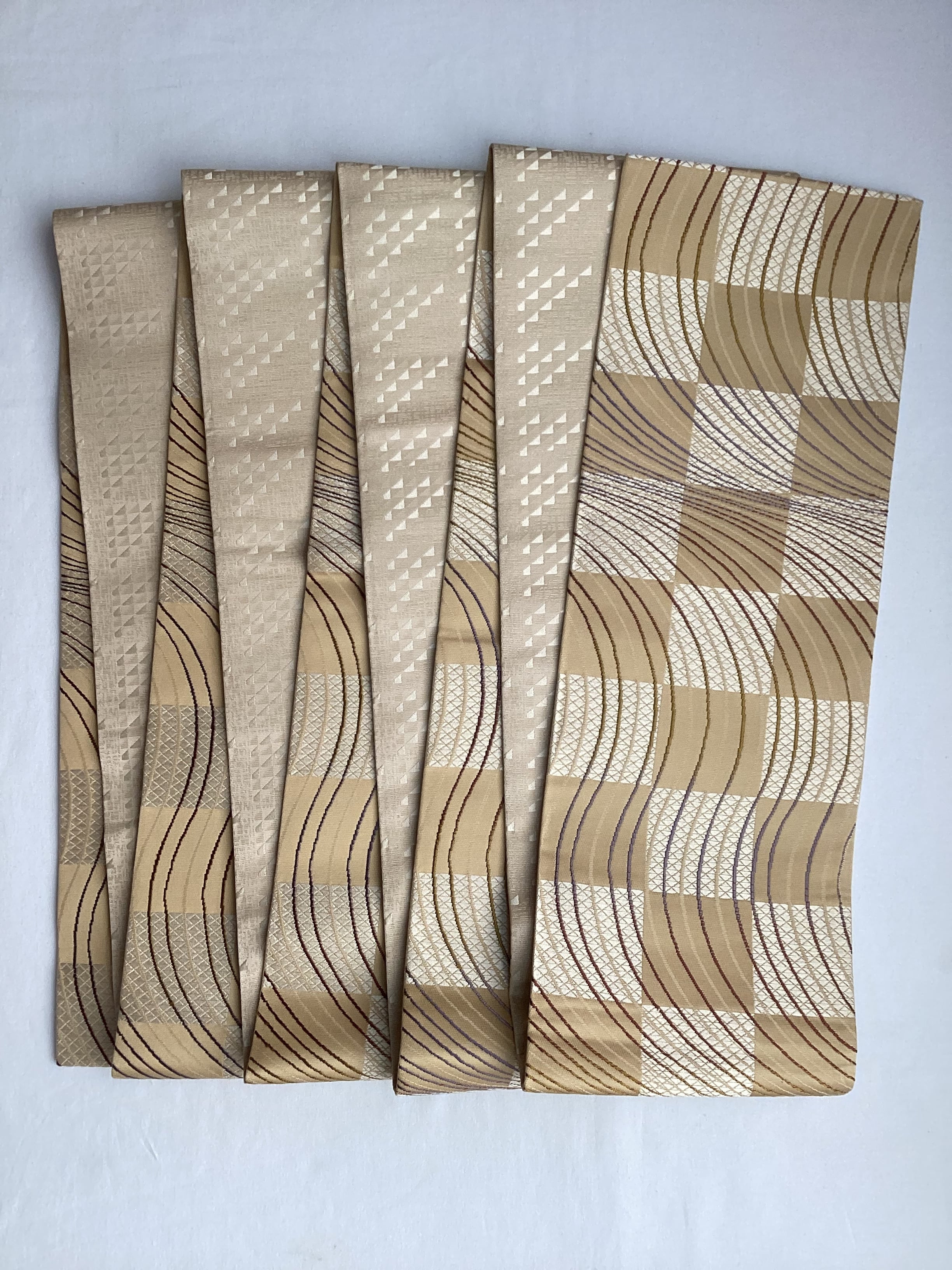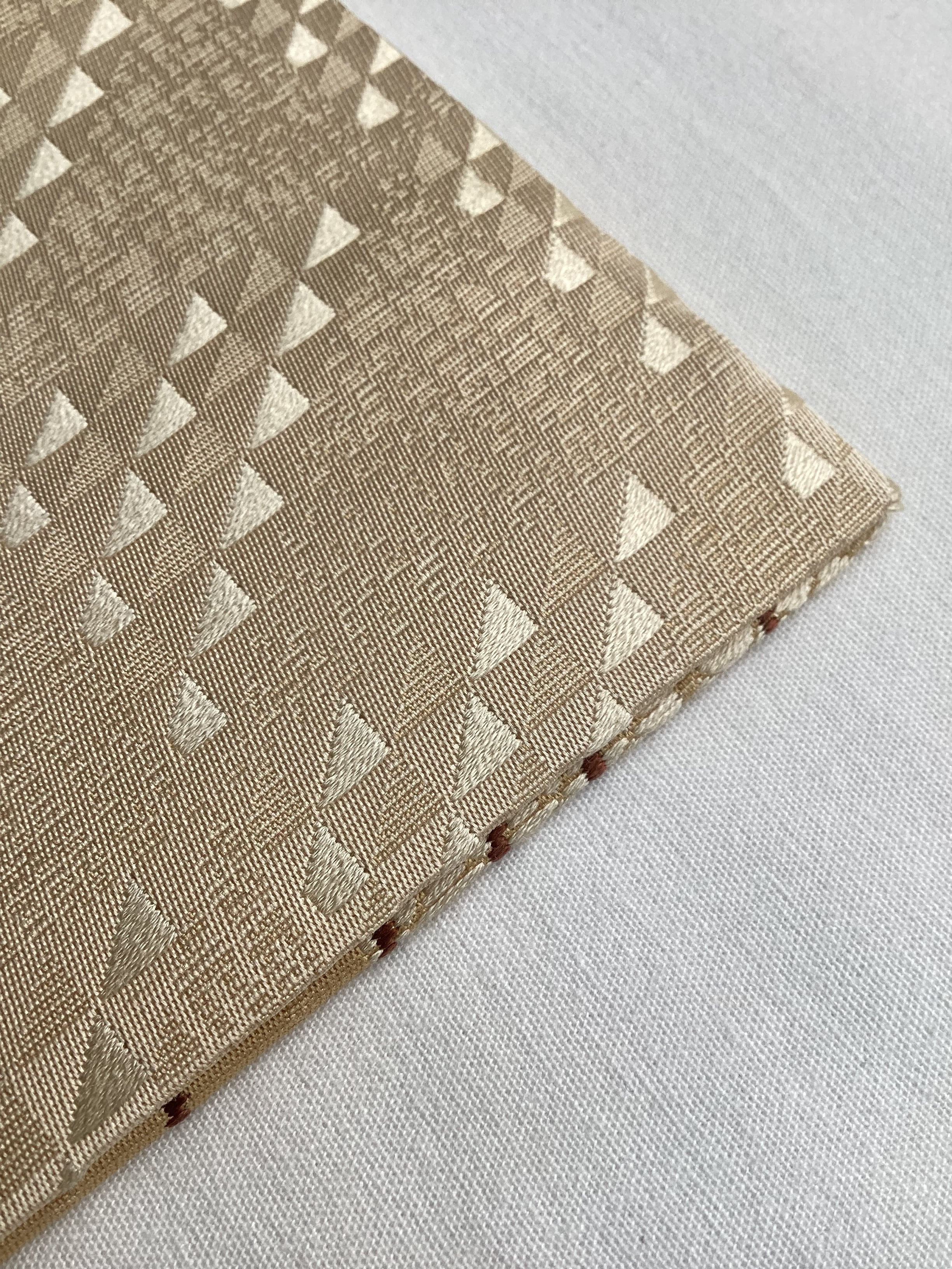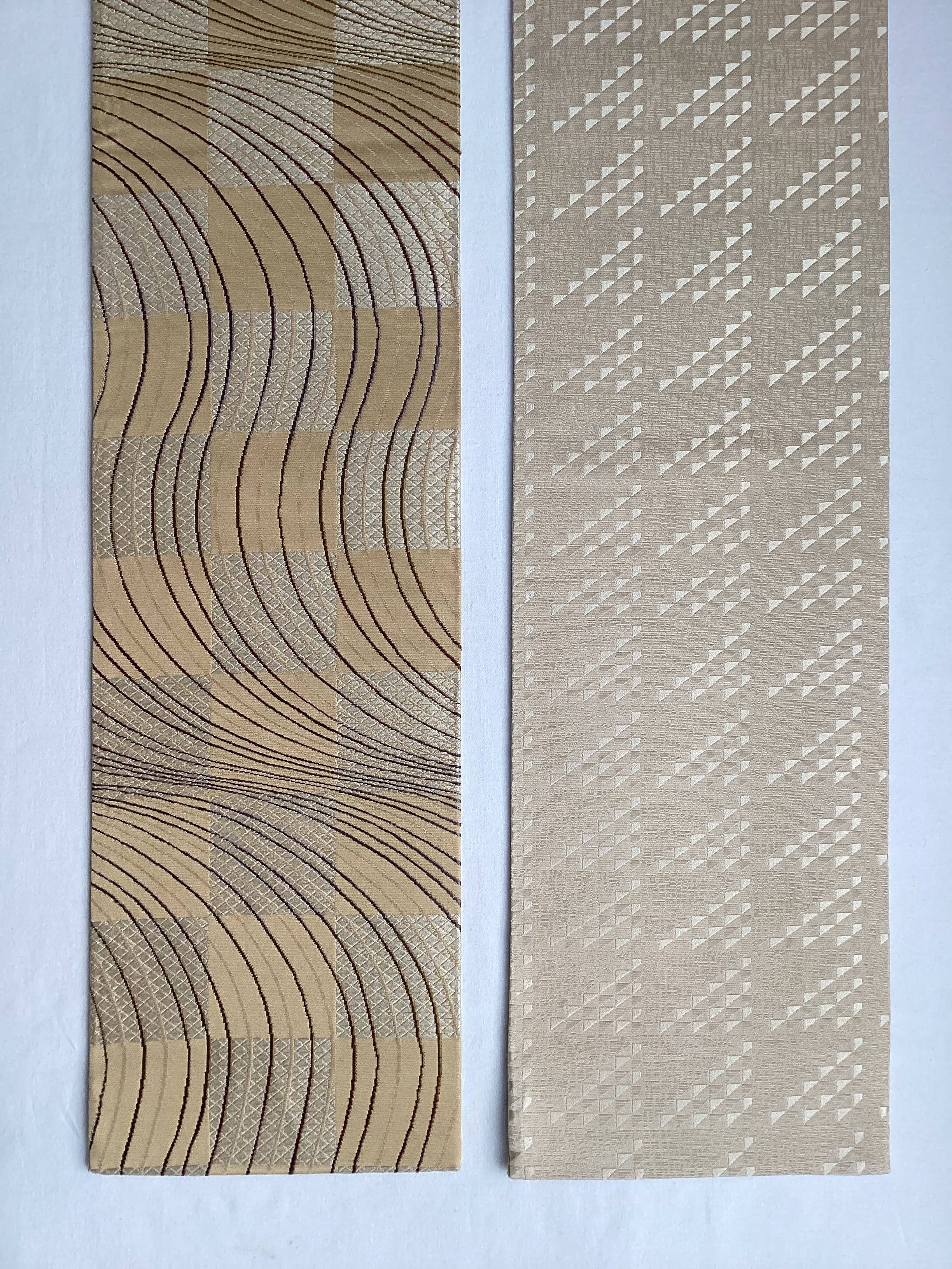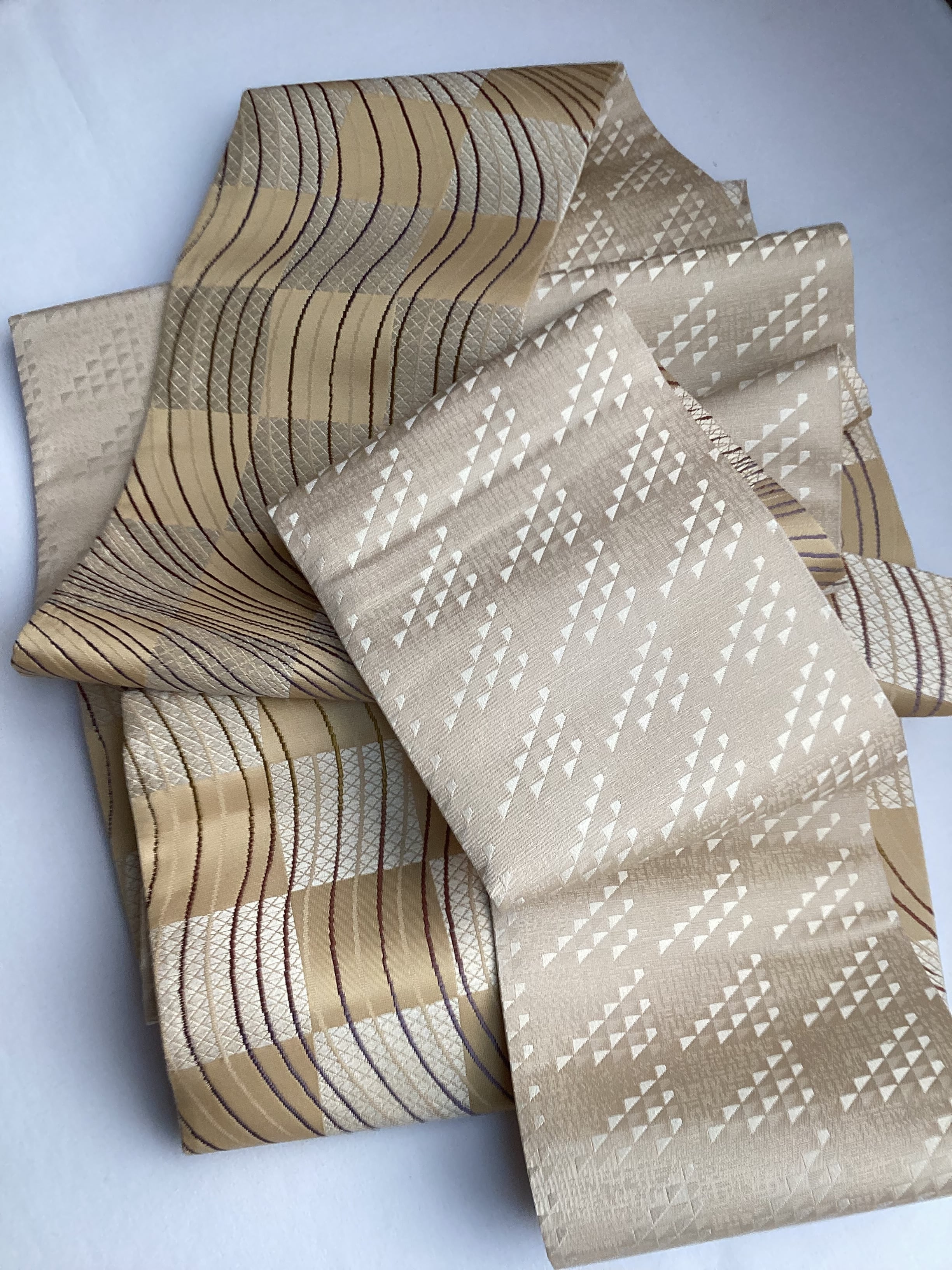 丁子色地市松によろけ縞文×鱗文両面半巾帯 260205-2